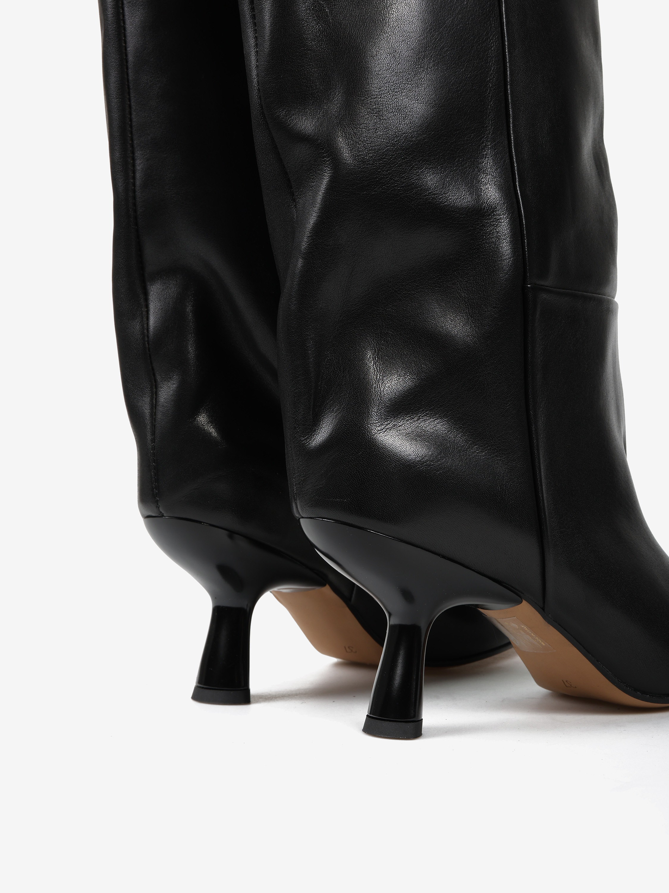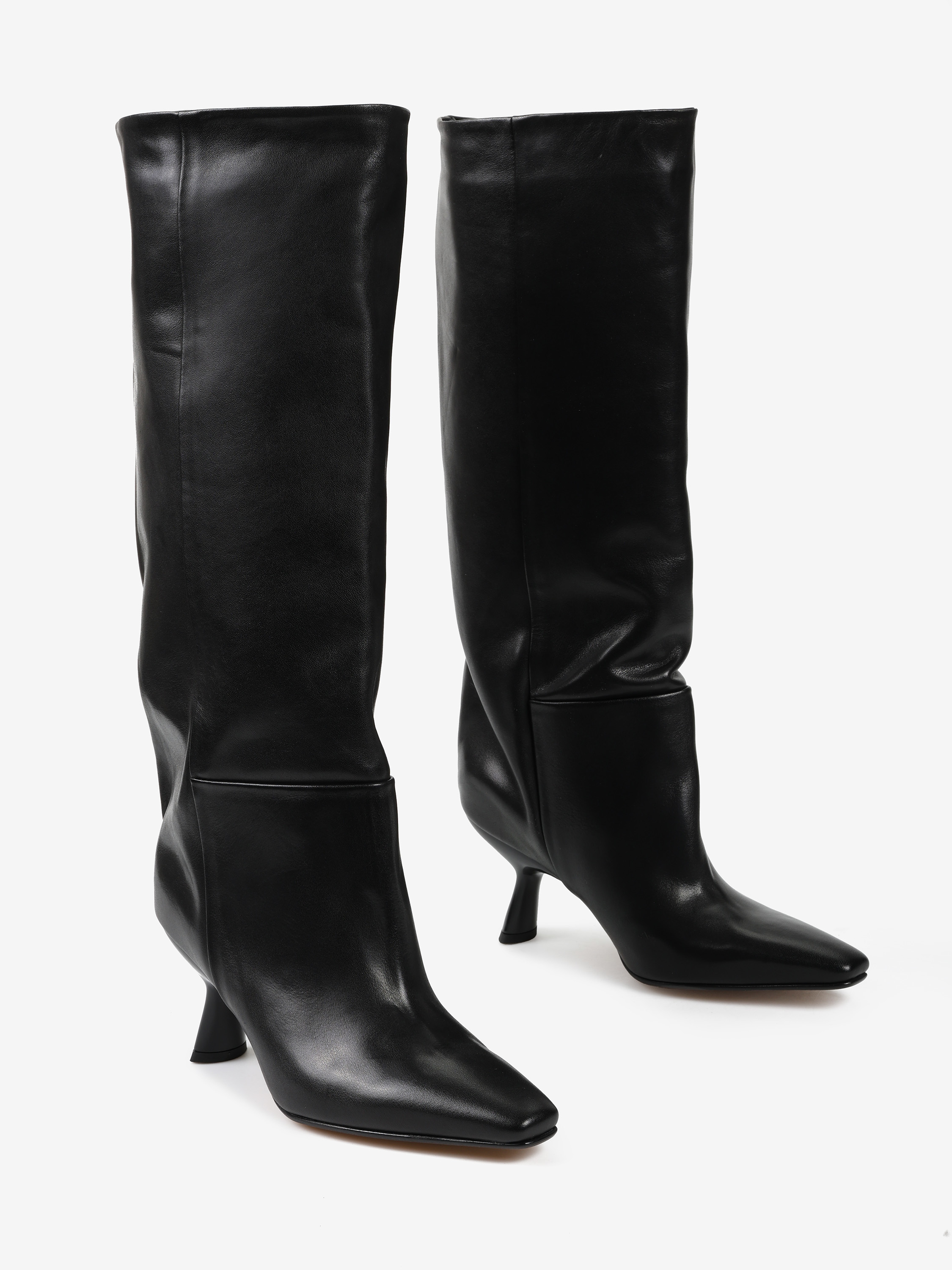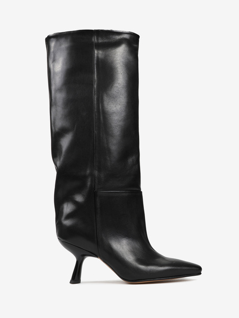 Wsuwane kozaki z szeroką cholewką. Wydłużone noski i profilowane szpilki.