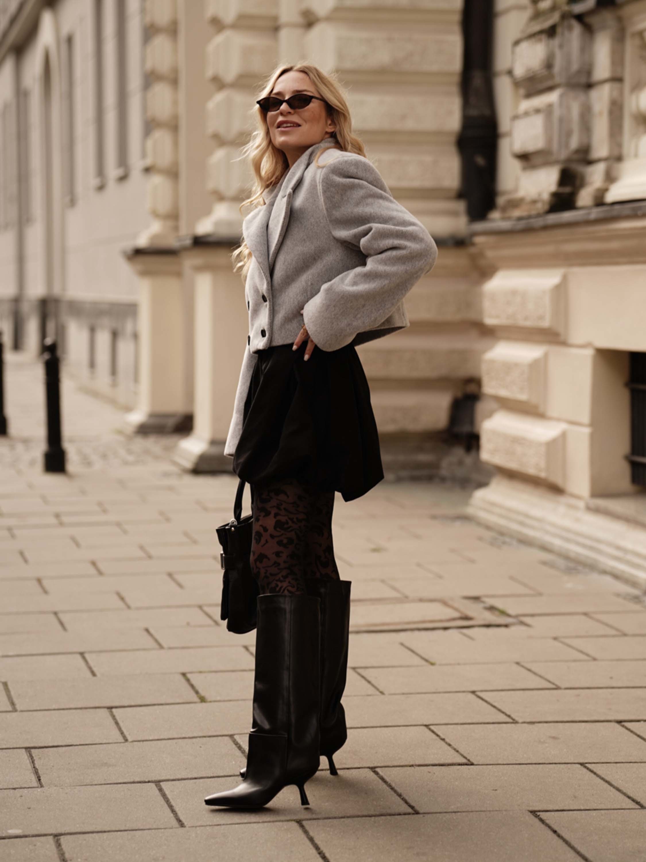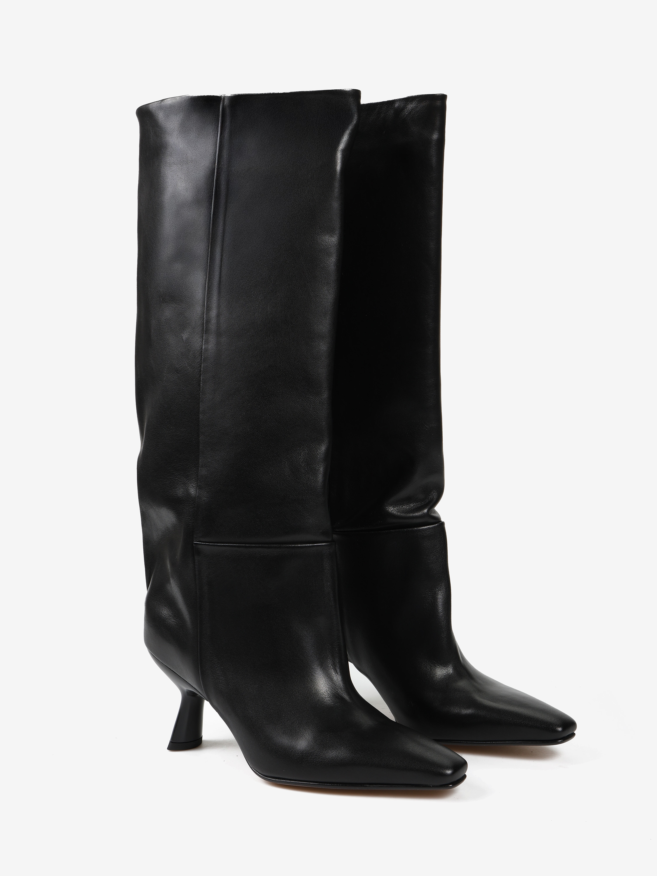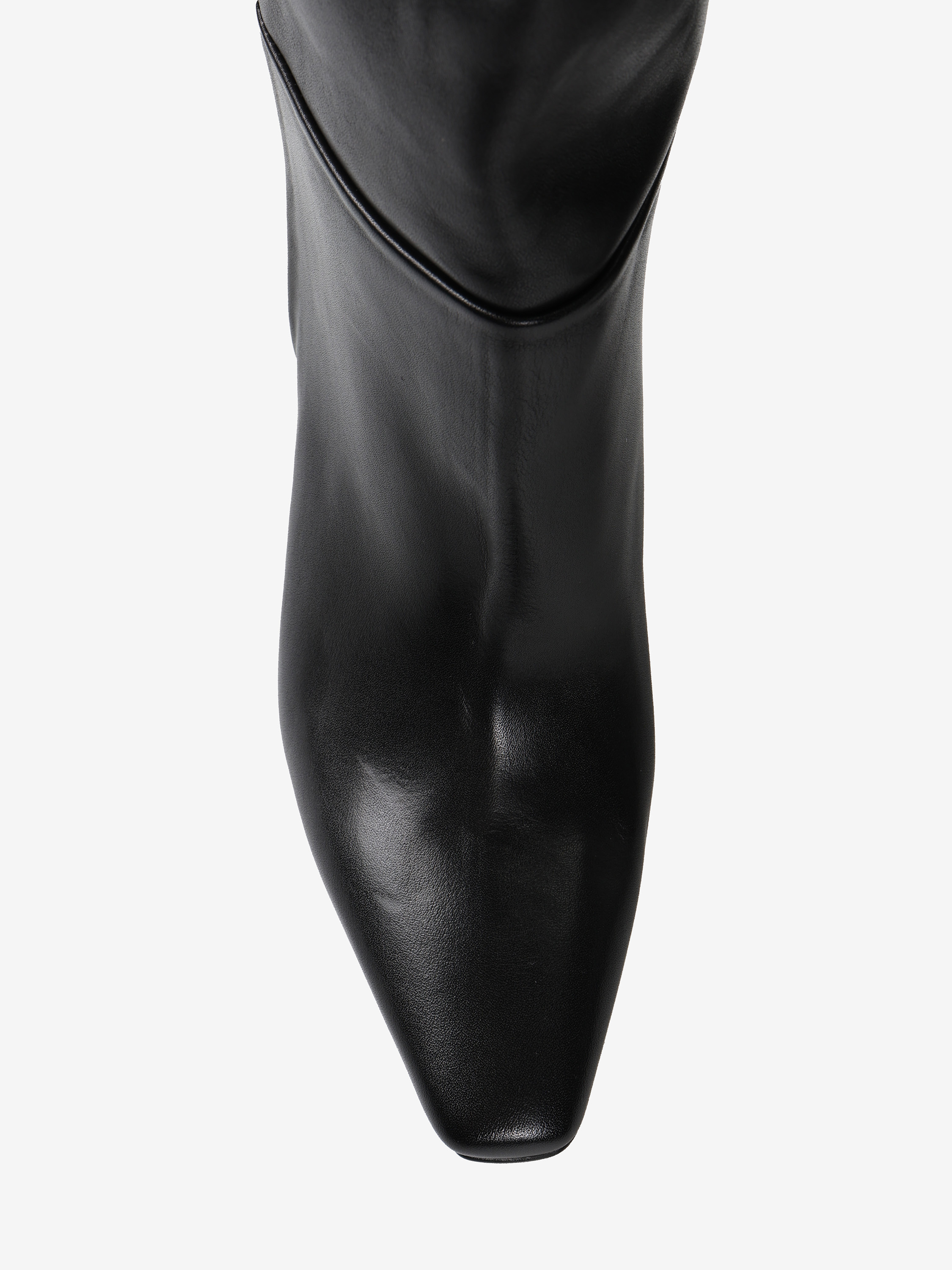 Wsuwane kozaki z szeroką cholewką. Wydłużone noski i profilowane szpilki.