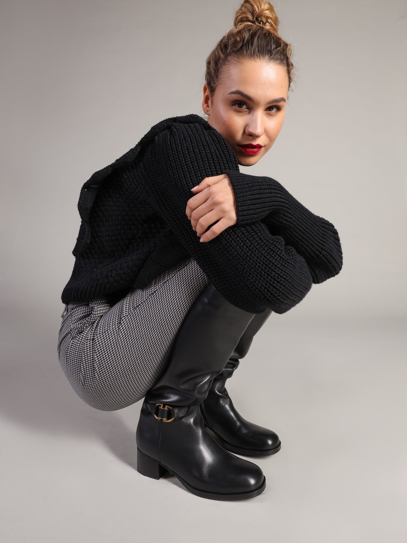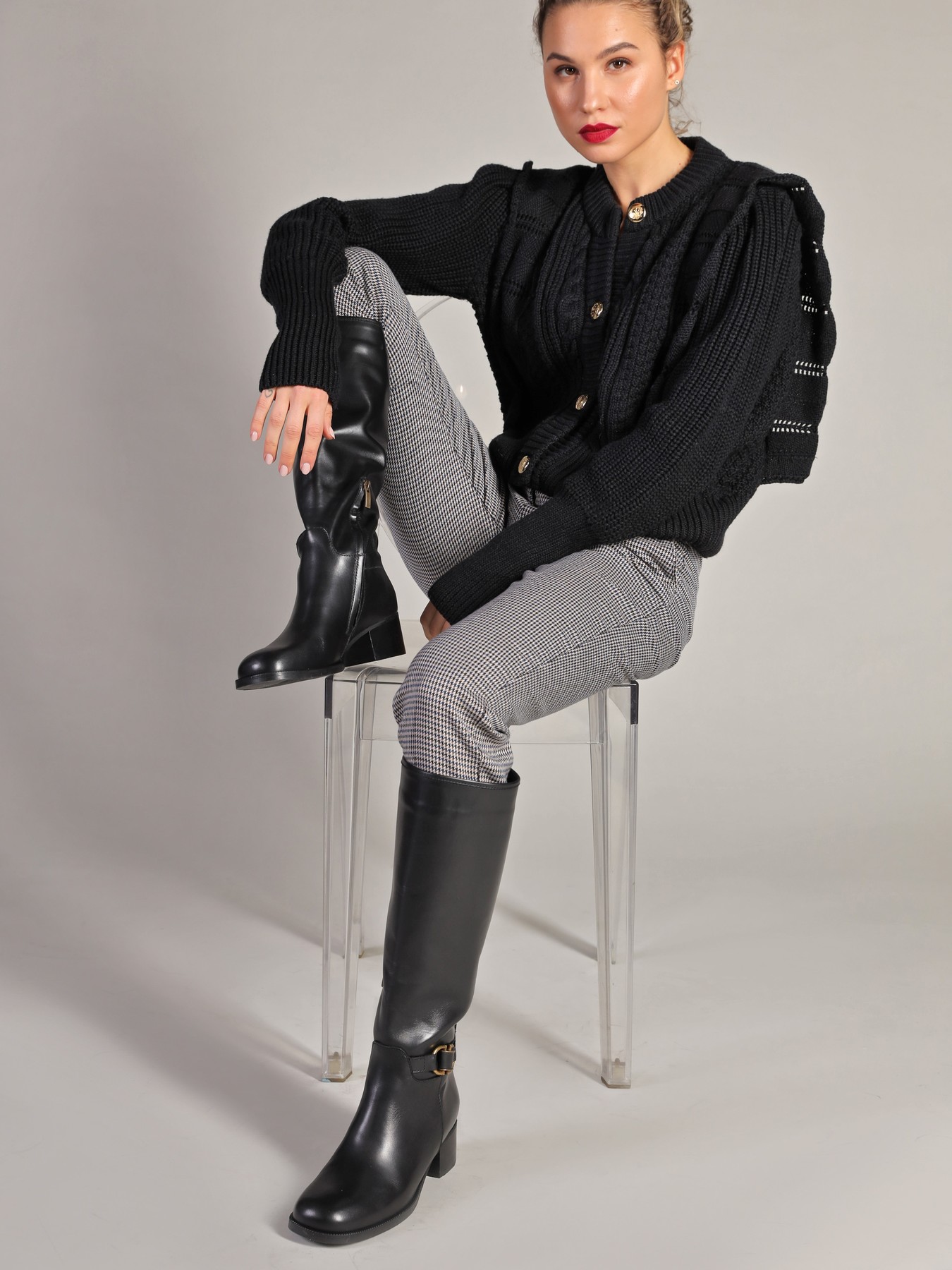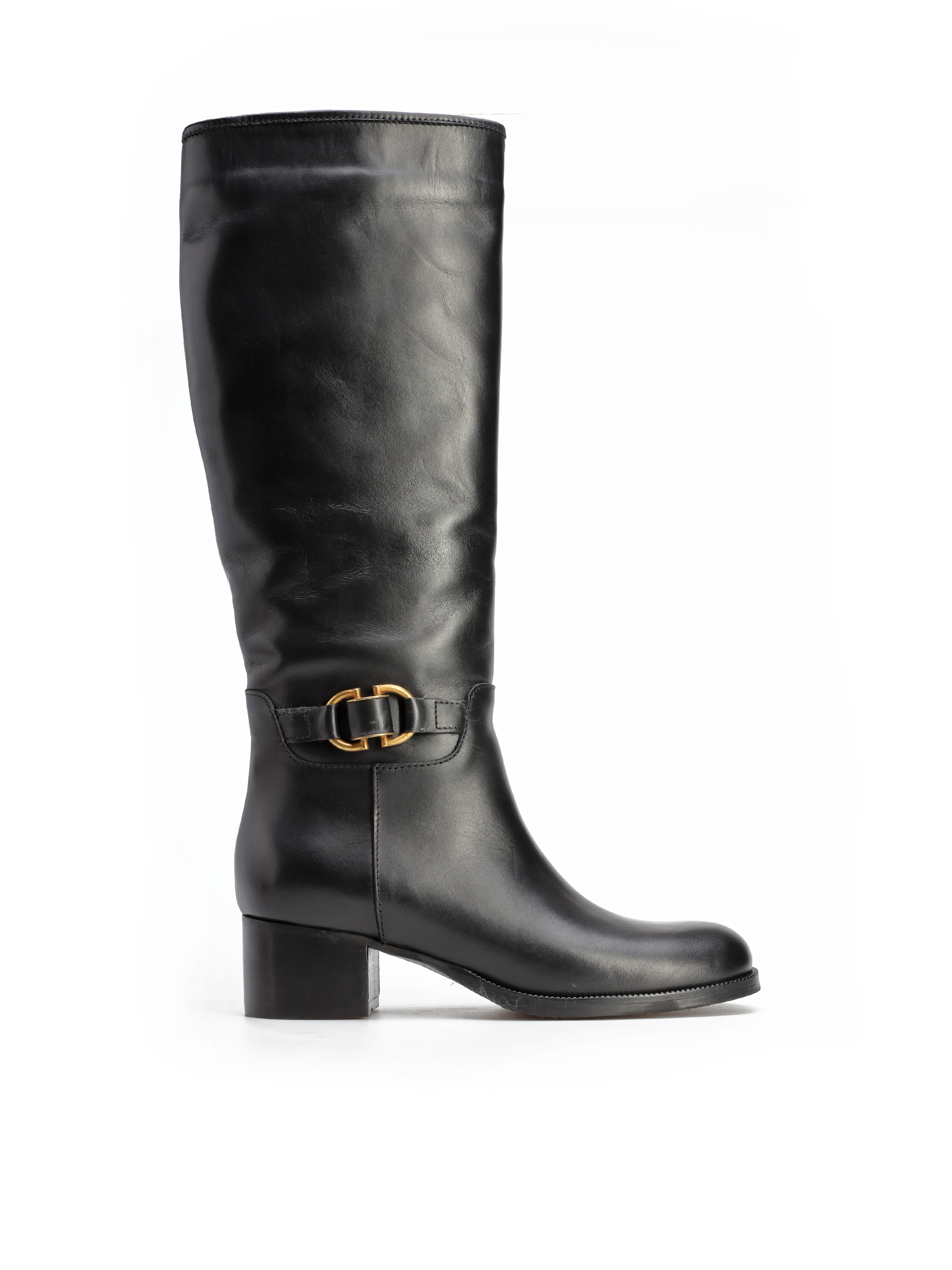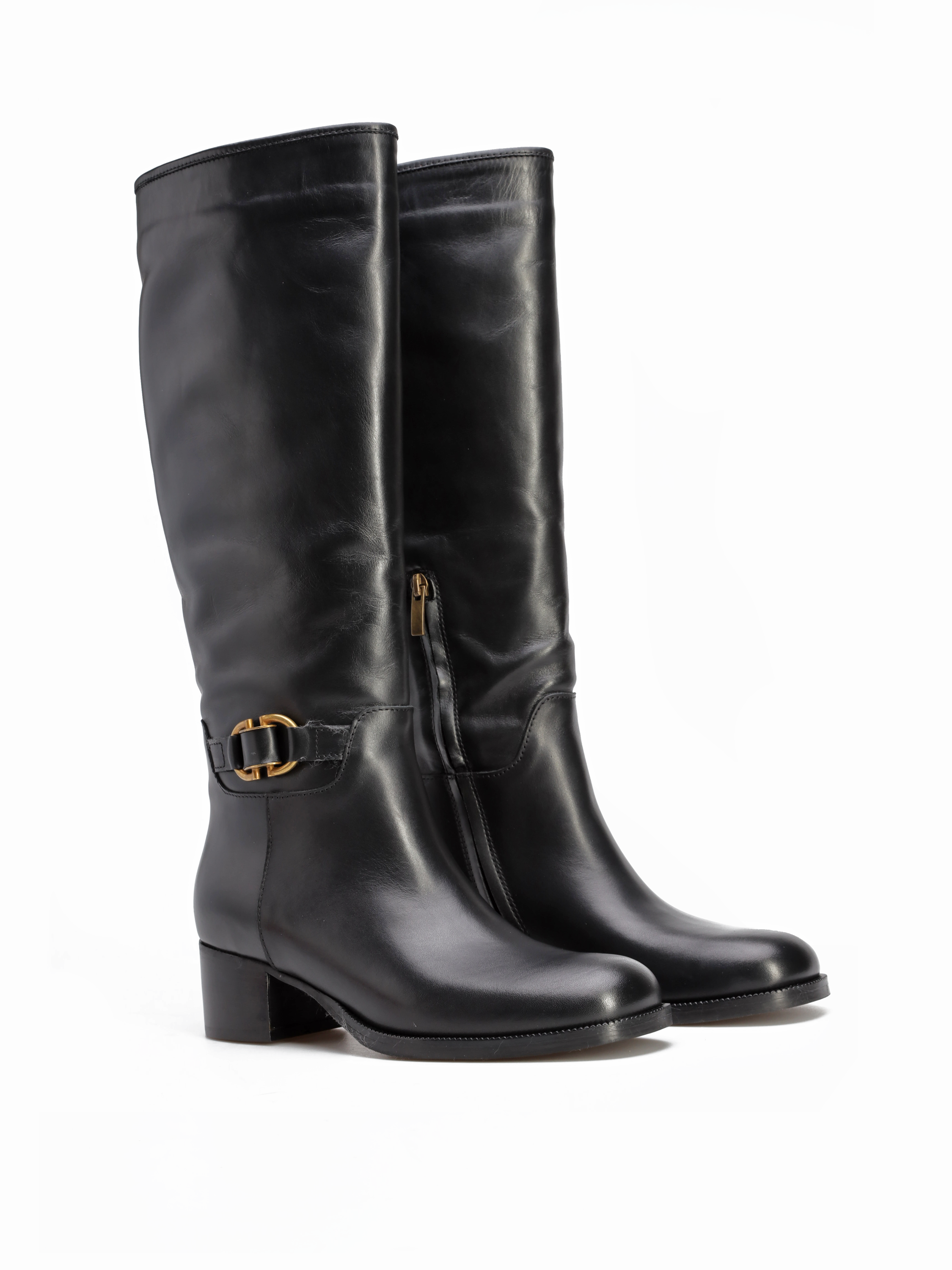 Kozaki na niskim obcasie wykonane są z naturalnej skóry. Cholewka w czarnym kolorze posiada zamek błyskawiczny. Ozdobiona została minimalistycznym paskiem ze złotą sprzączką. Model na wygodnym obcasie na słupku.