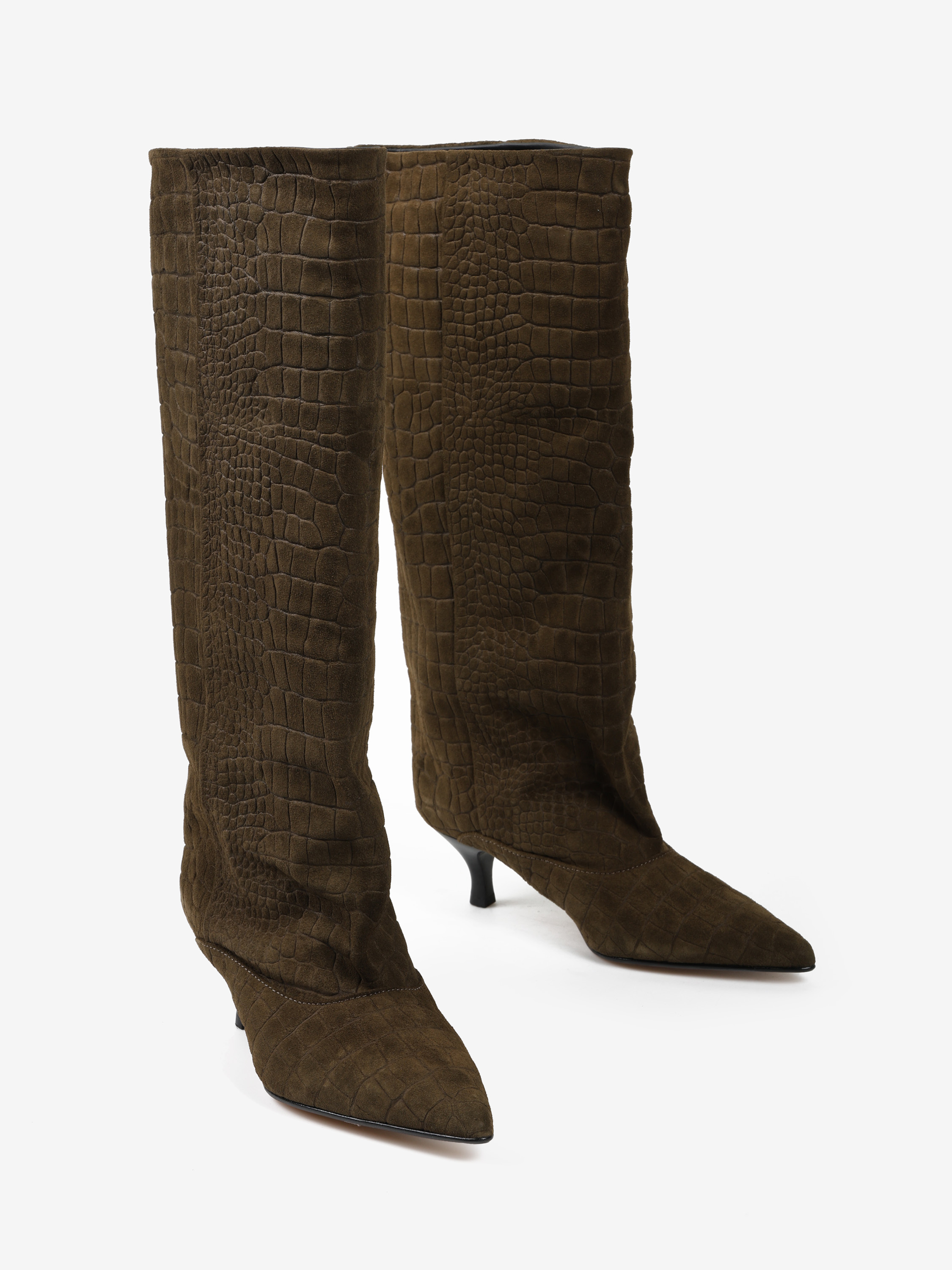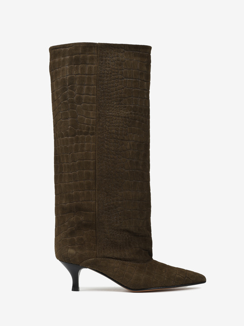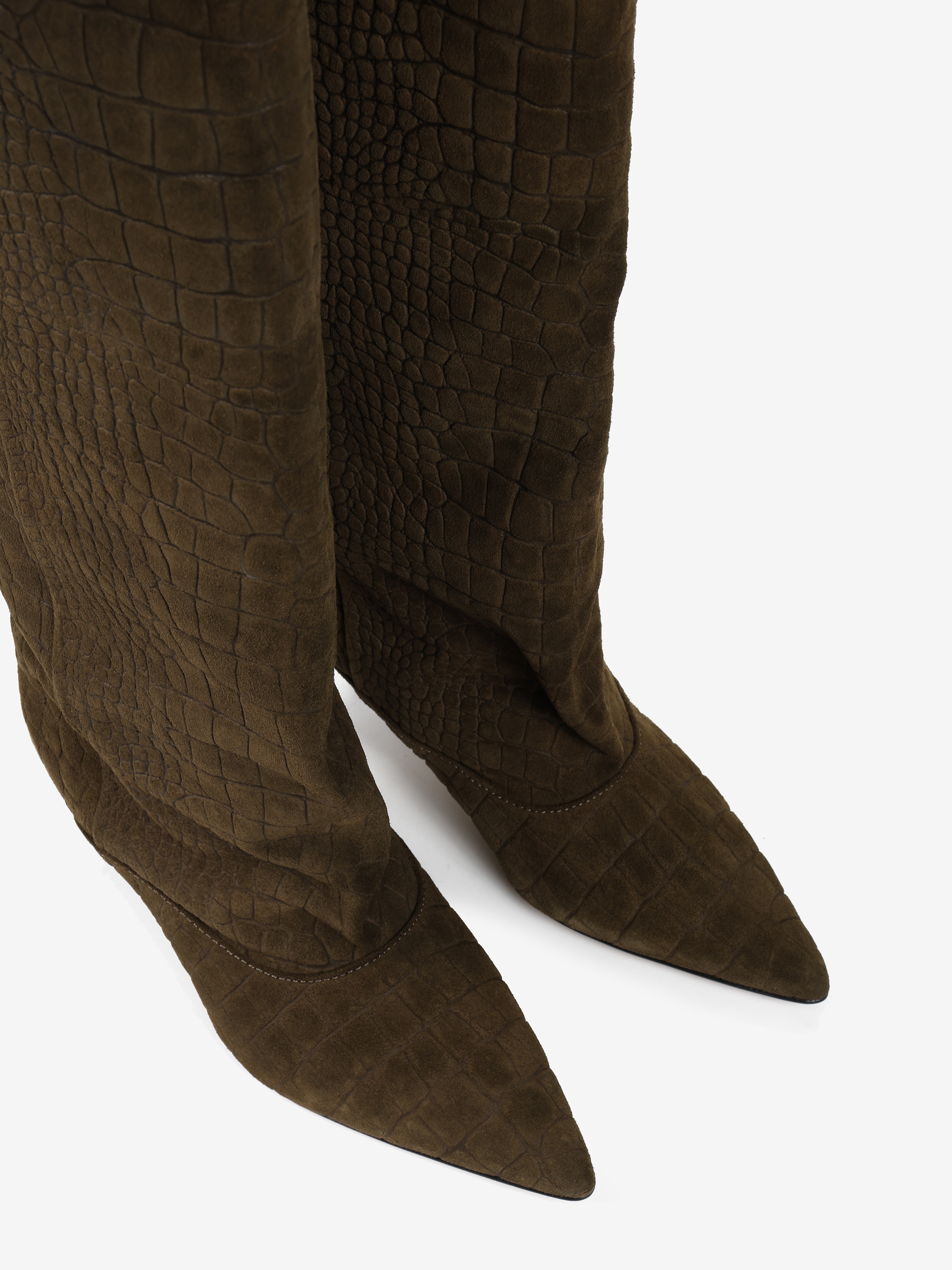 Kozaki na szpilce wykonane z zamszu tłoczonego w krokodyli wzór. Szeroka cholewka i noski w szpic.