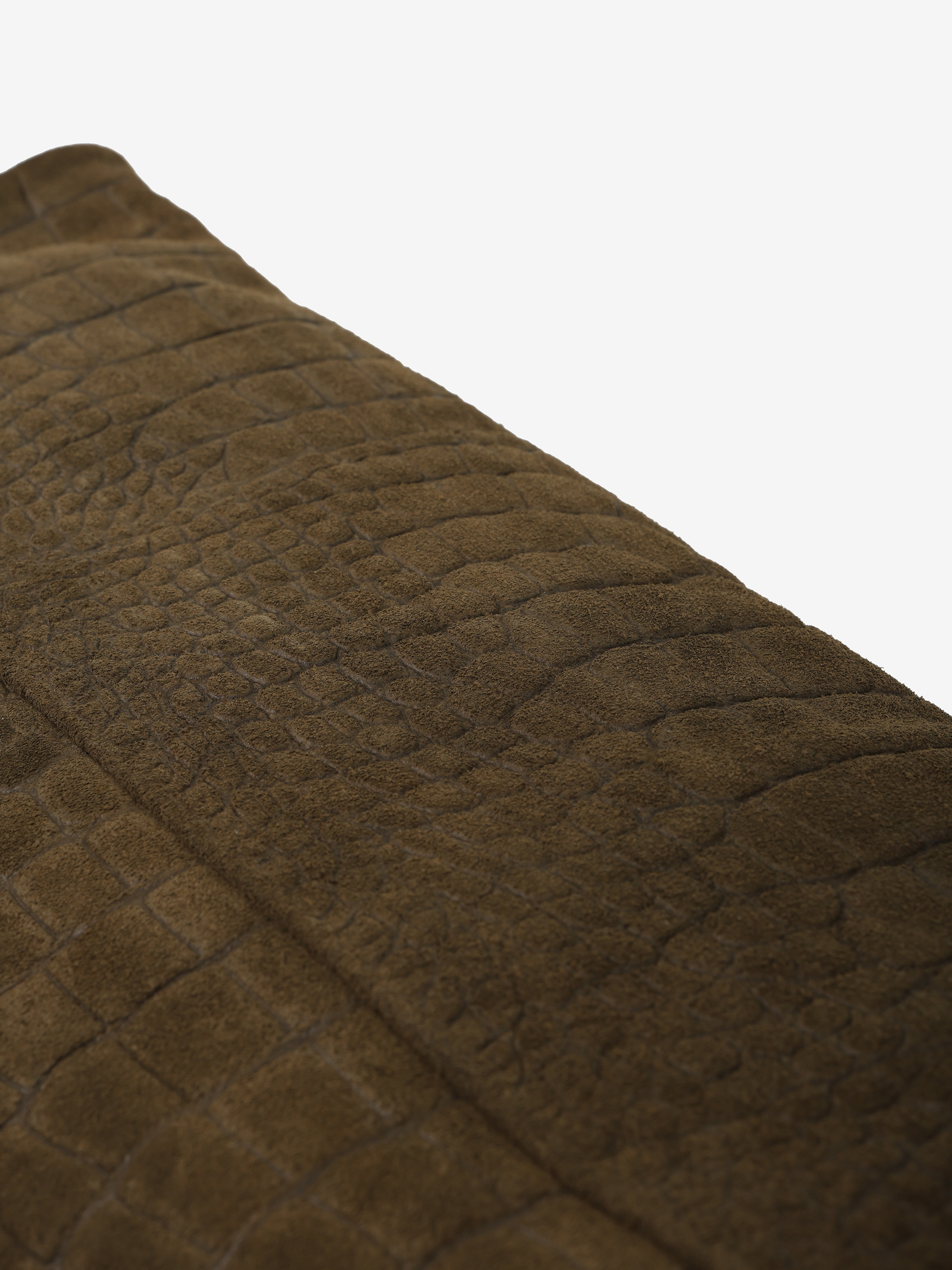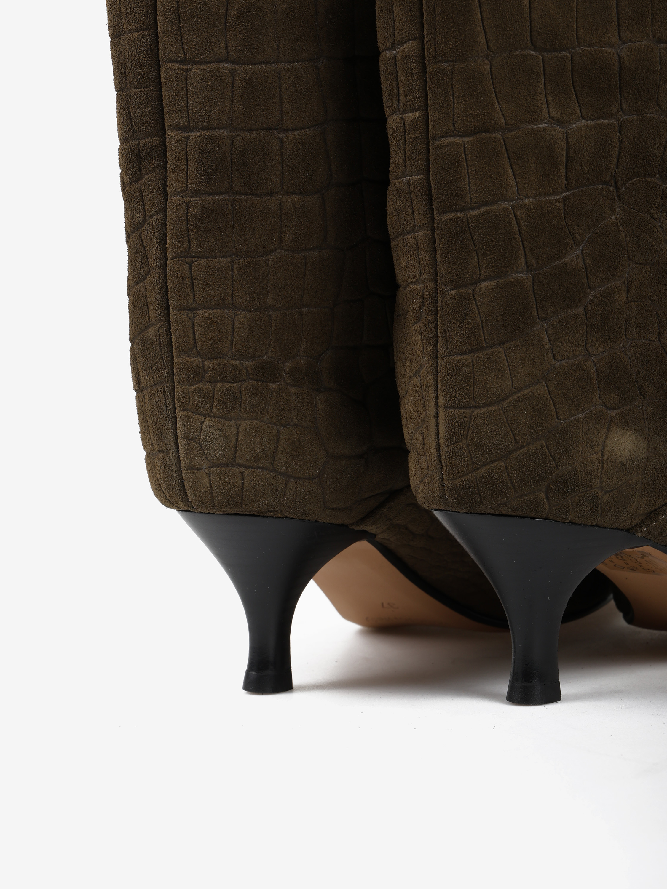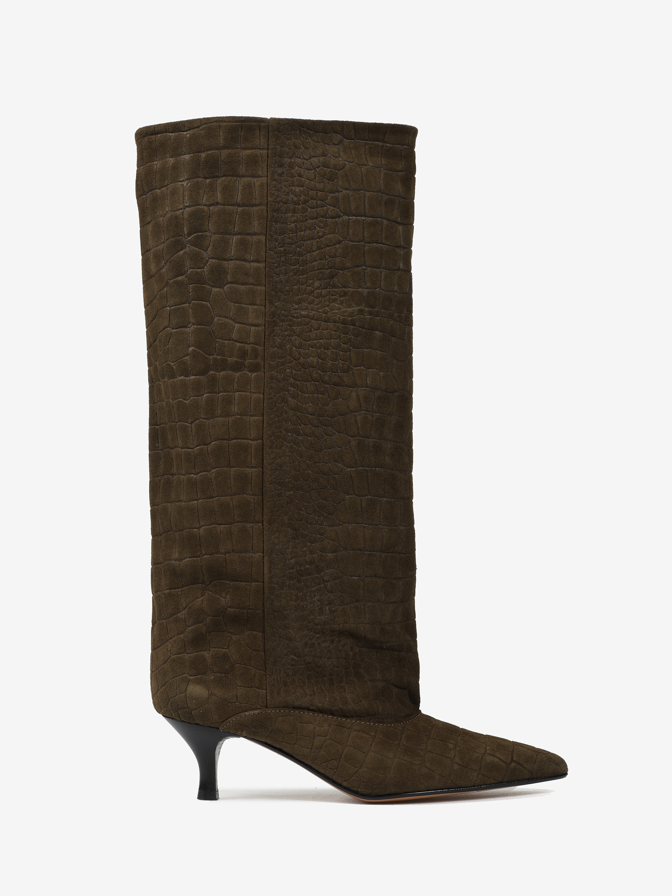 Kozaki na szpilce wykonane z zamszu tłoczonego w krokodyli wzór. Szeroka cholewka i noski w szpic.