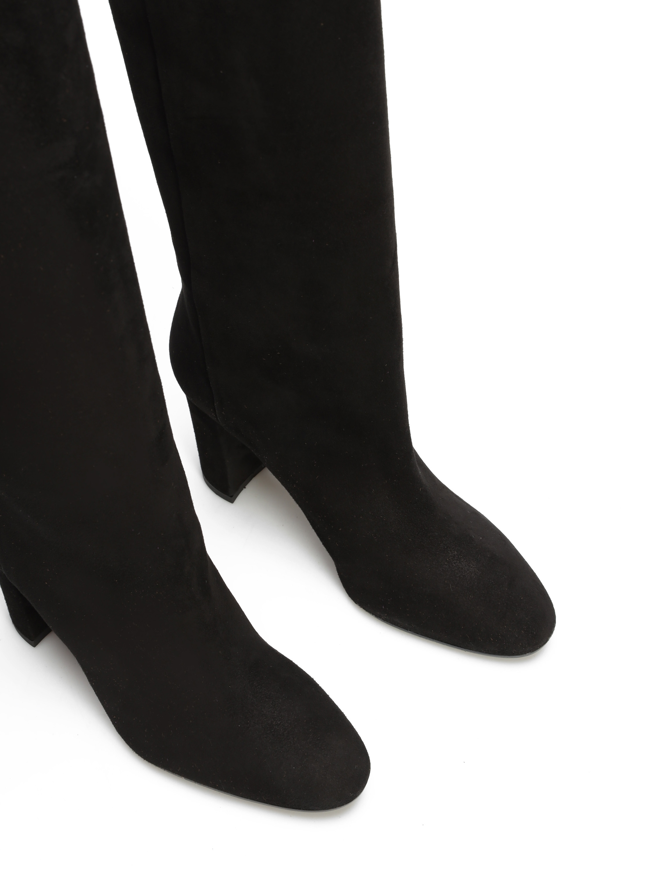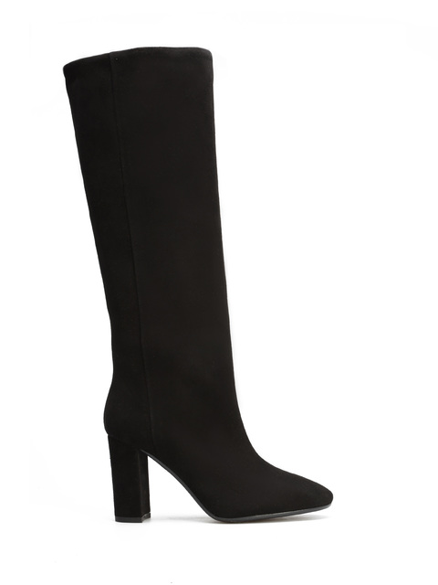 Wysokie kozaki to must have sezonu. Wsuwana cholewka w klasycznym, czarnym kolorze wykonana jest z zamszowej skóry. Prosty, ponadczasowy fason osadzony został na stabilnym obcasie na słupku.