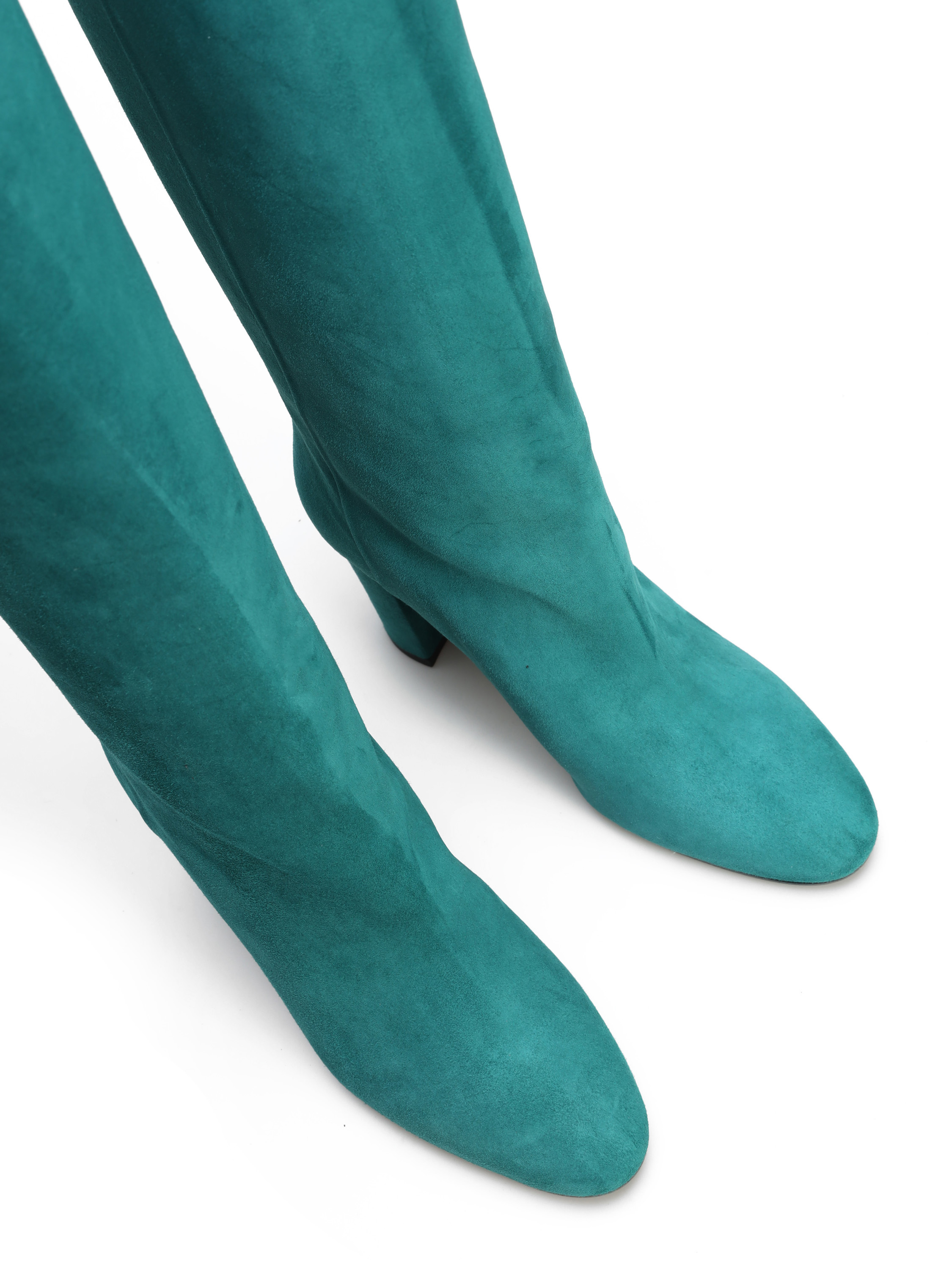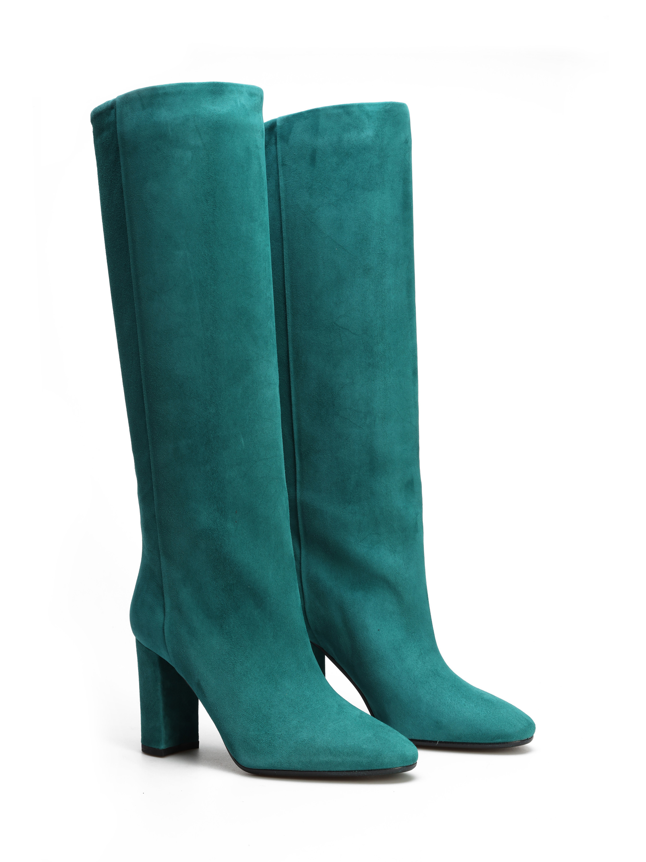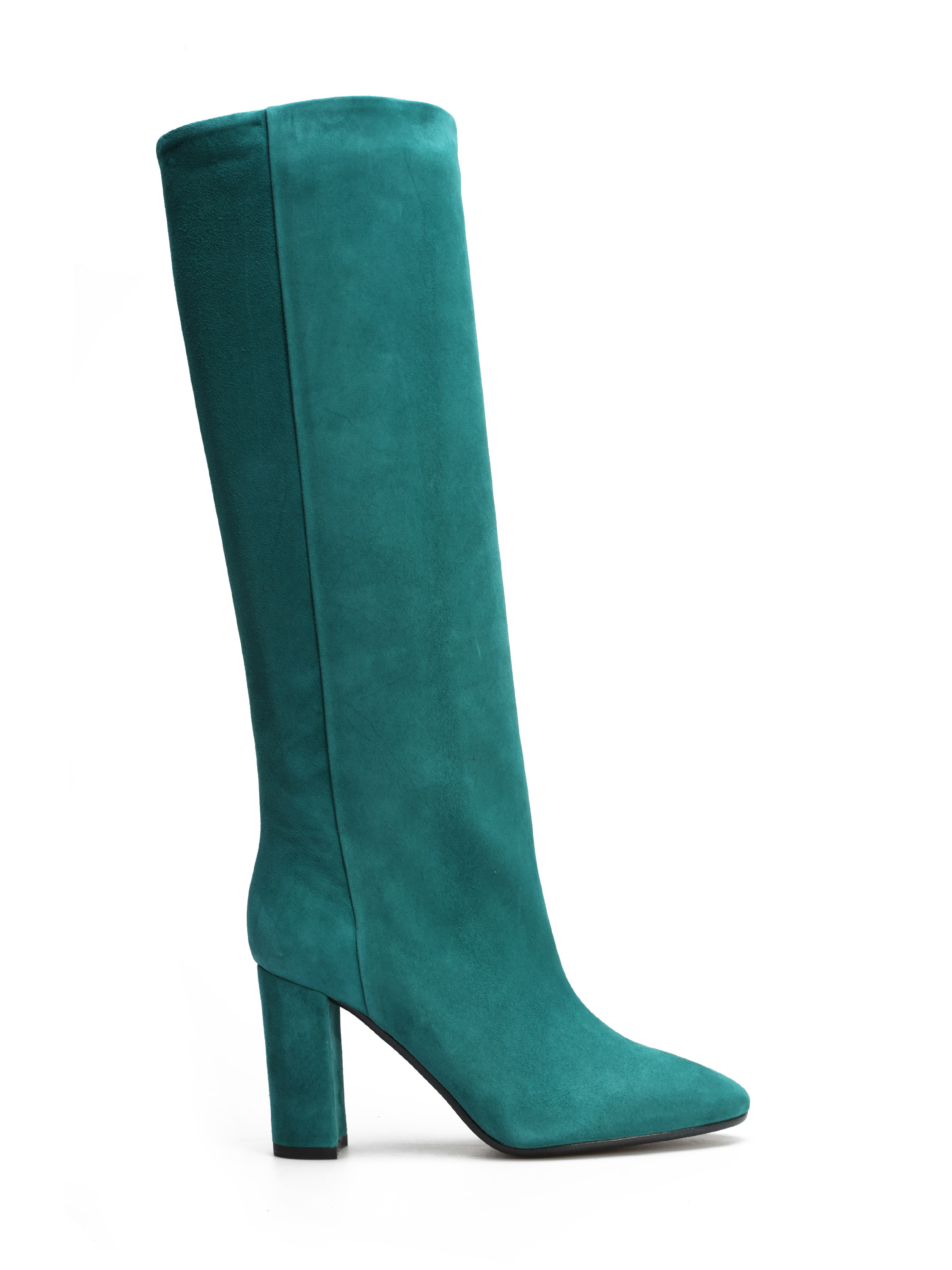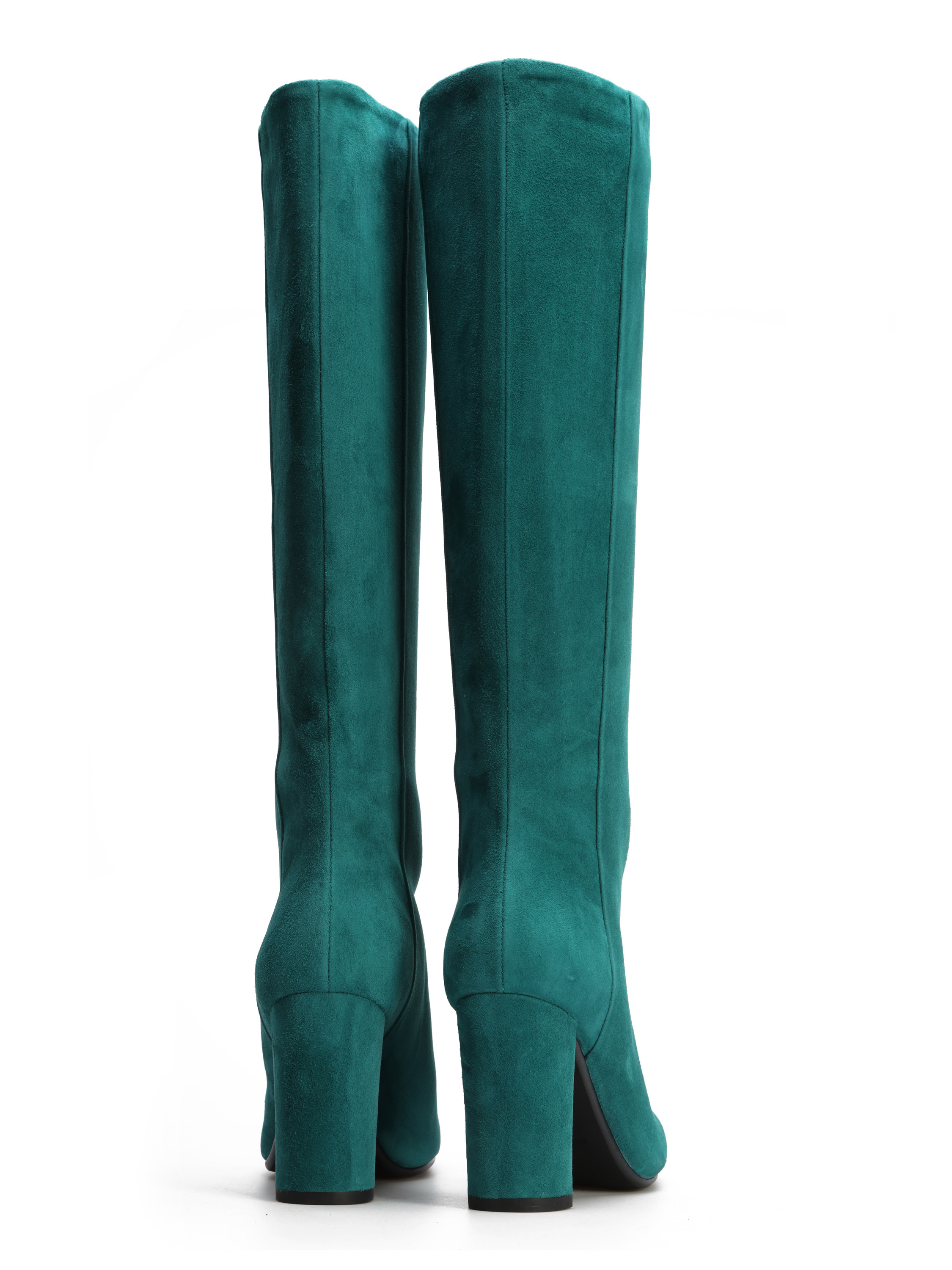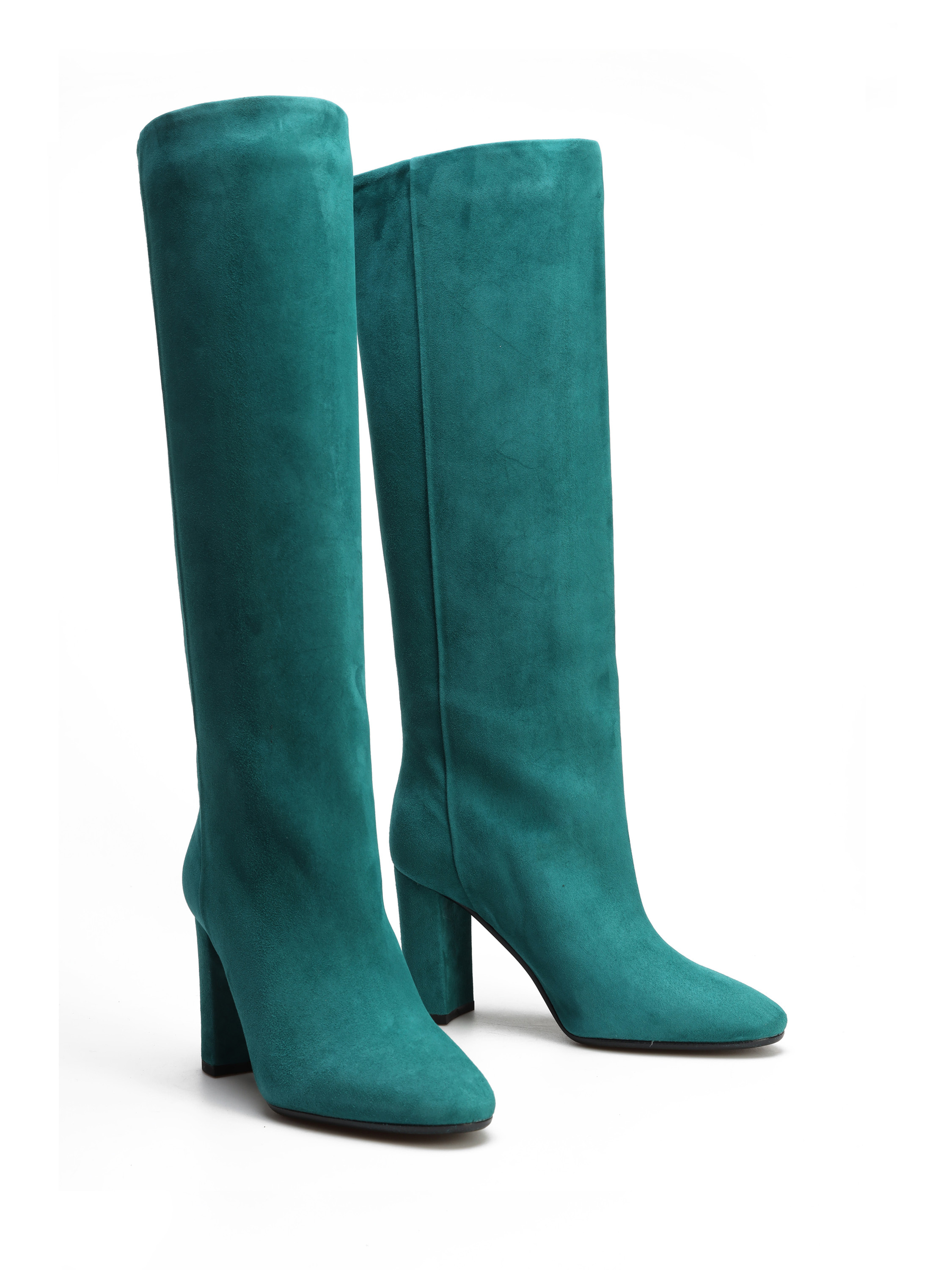 Wysokie kozaki to must have sezonu. Wsuwana cholewka w modnym kolorze wykonana jest z zamszowej skóry. Prosty, ponadczasowy fason osadzony został na stabilnym obcasie na słupku.