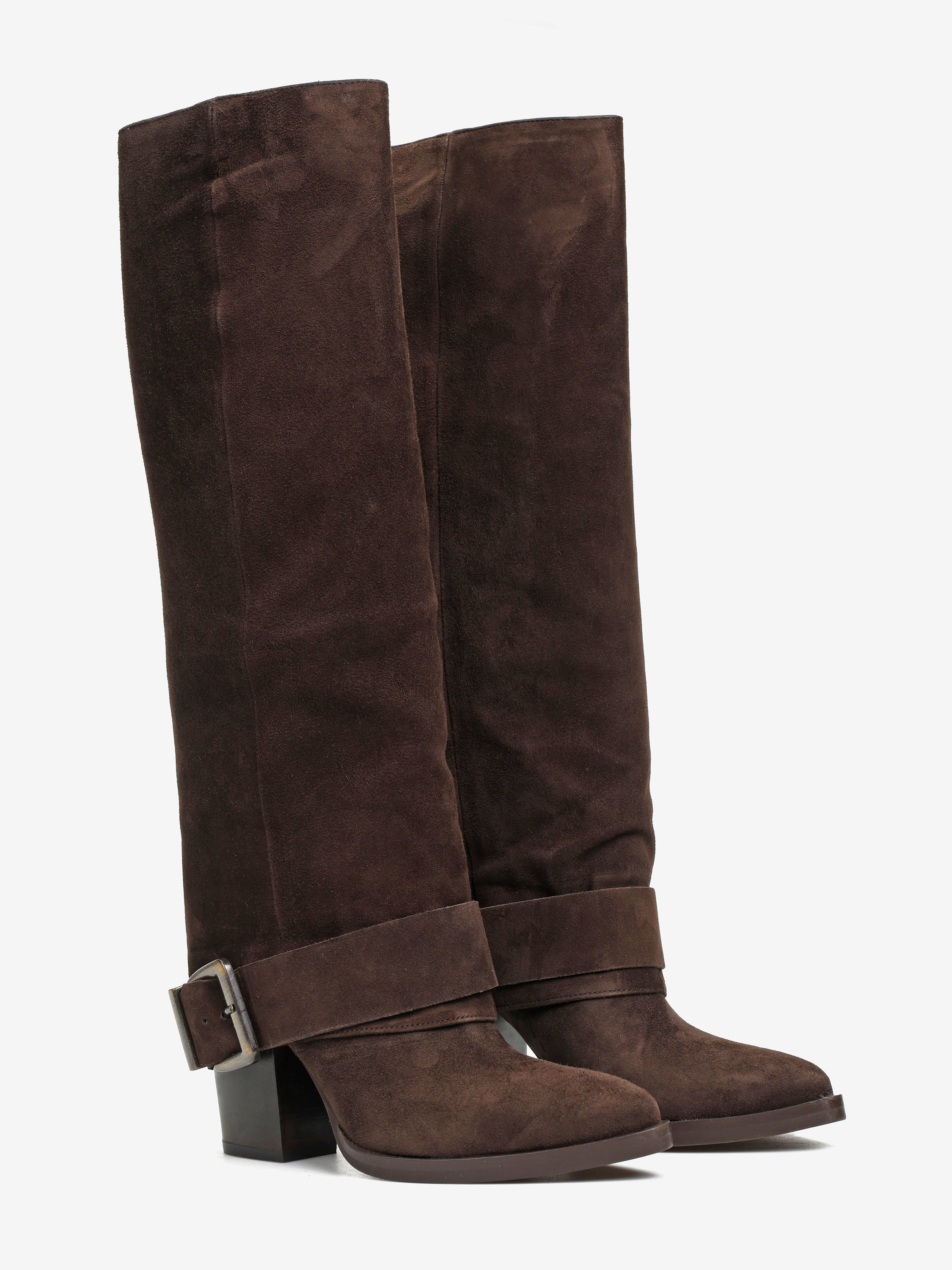 Wsuwane kozaki na stabilnym słupku. Szeroka cholewa z ozdobnym paskiem z klamrą.