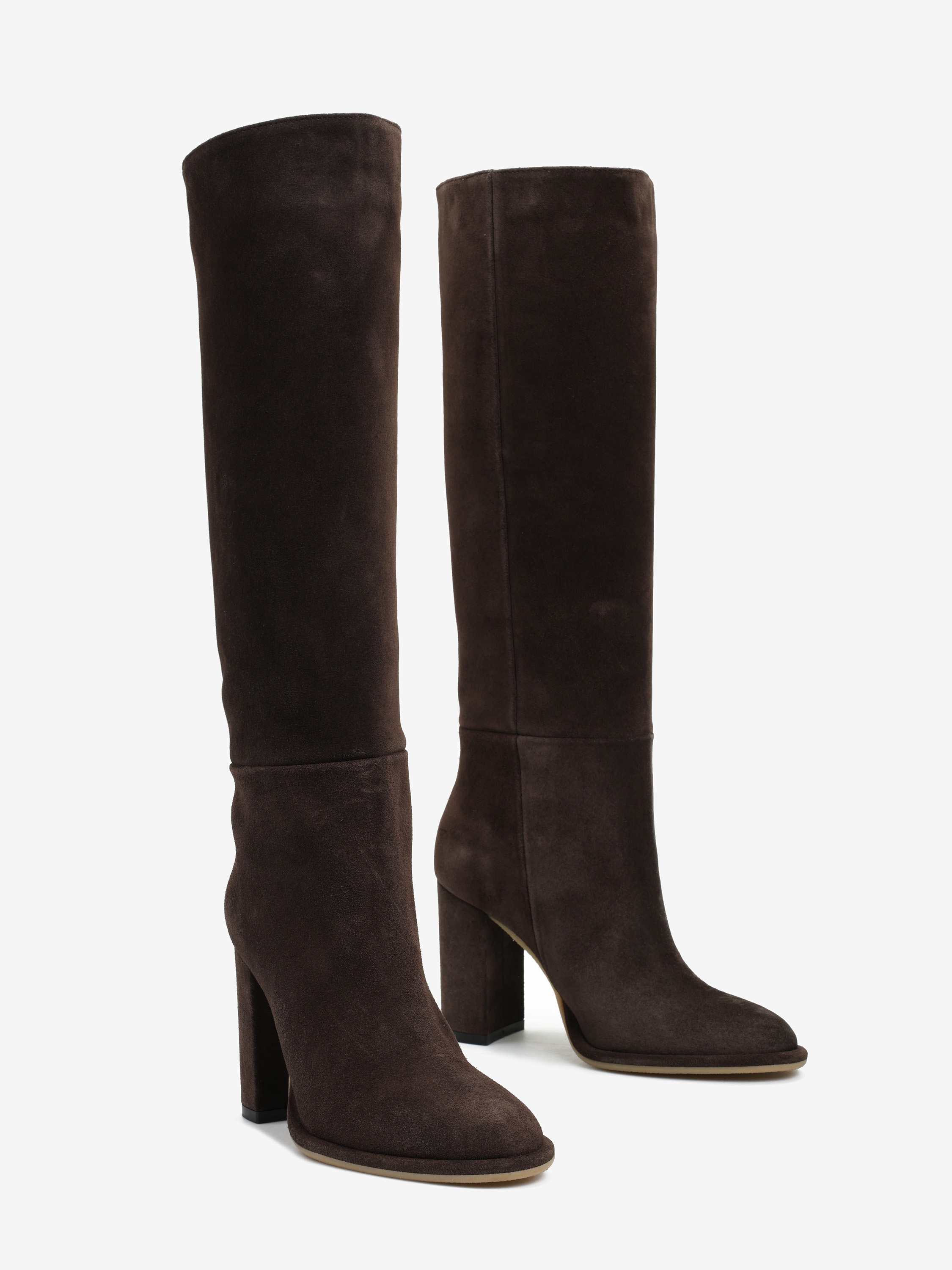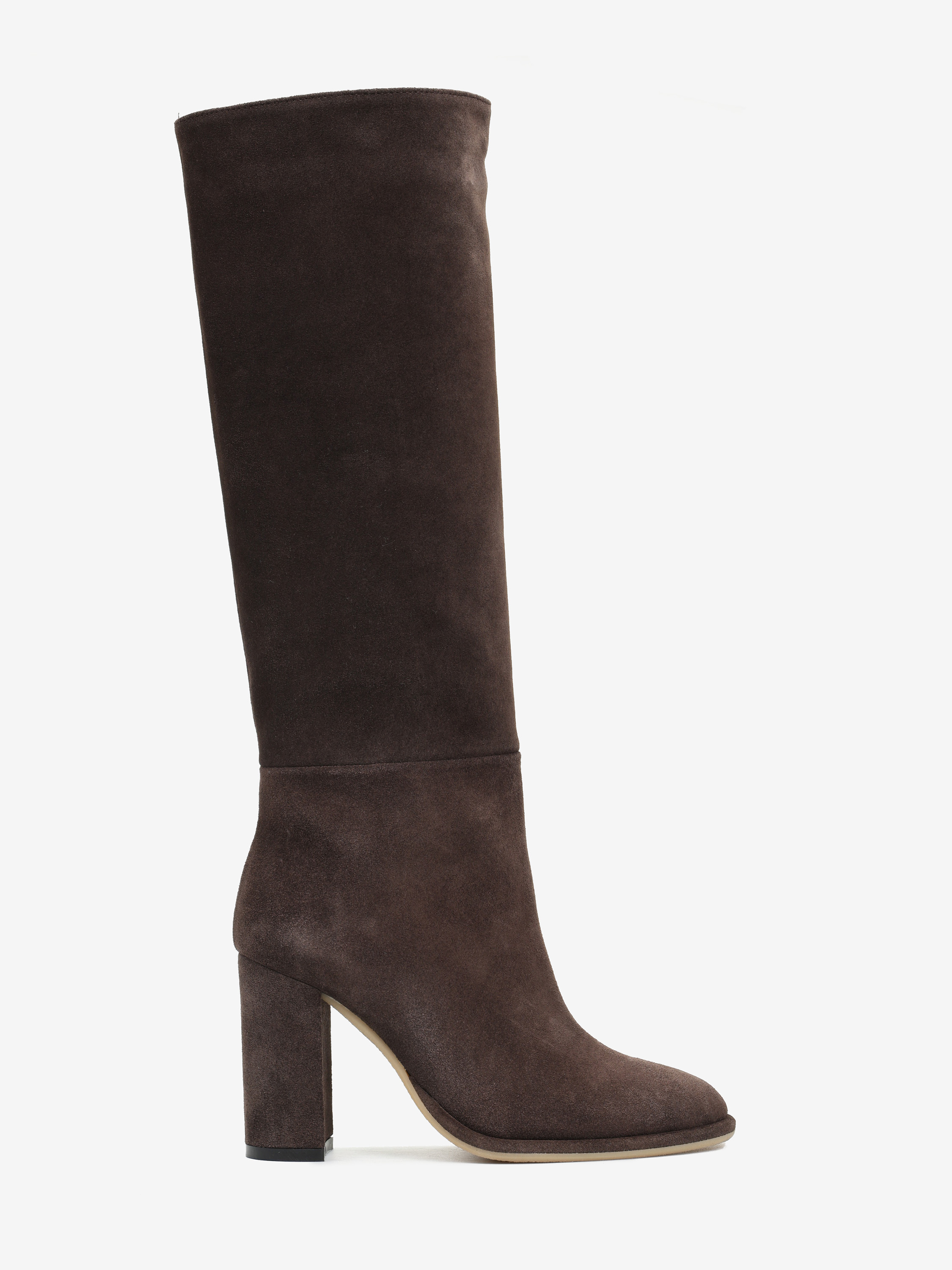 Proste, wsuwane kozaki na słupku z okrągłymi noskami.