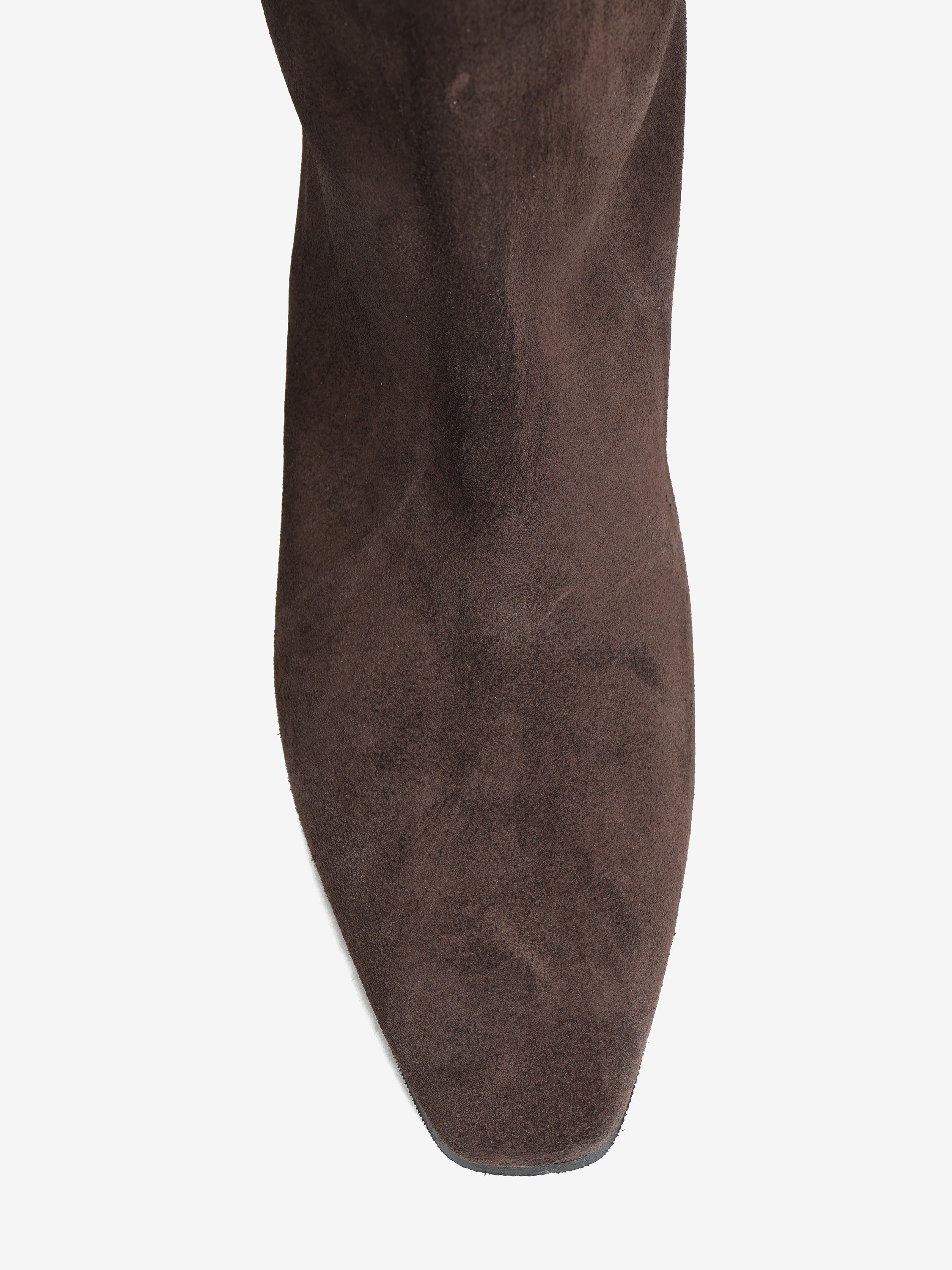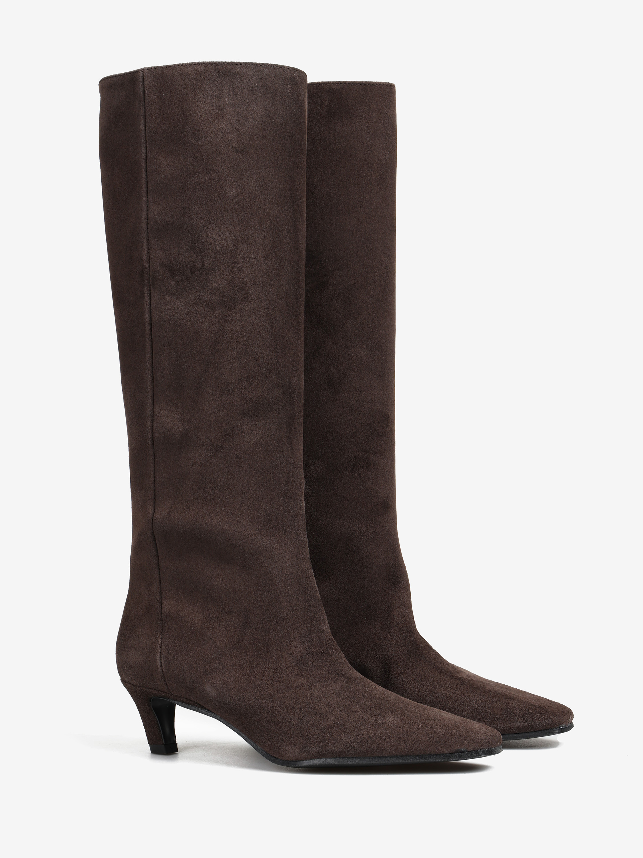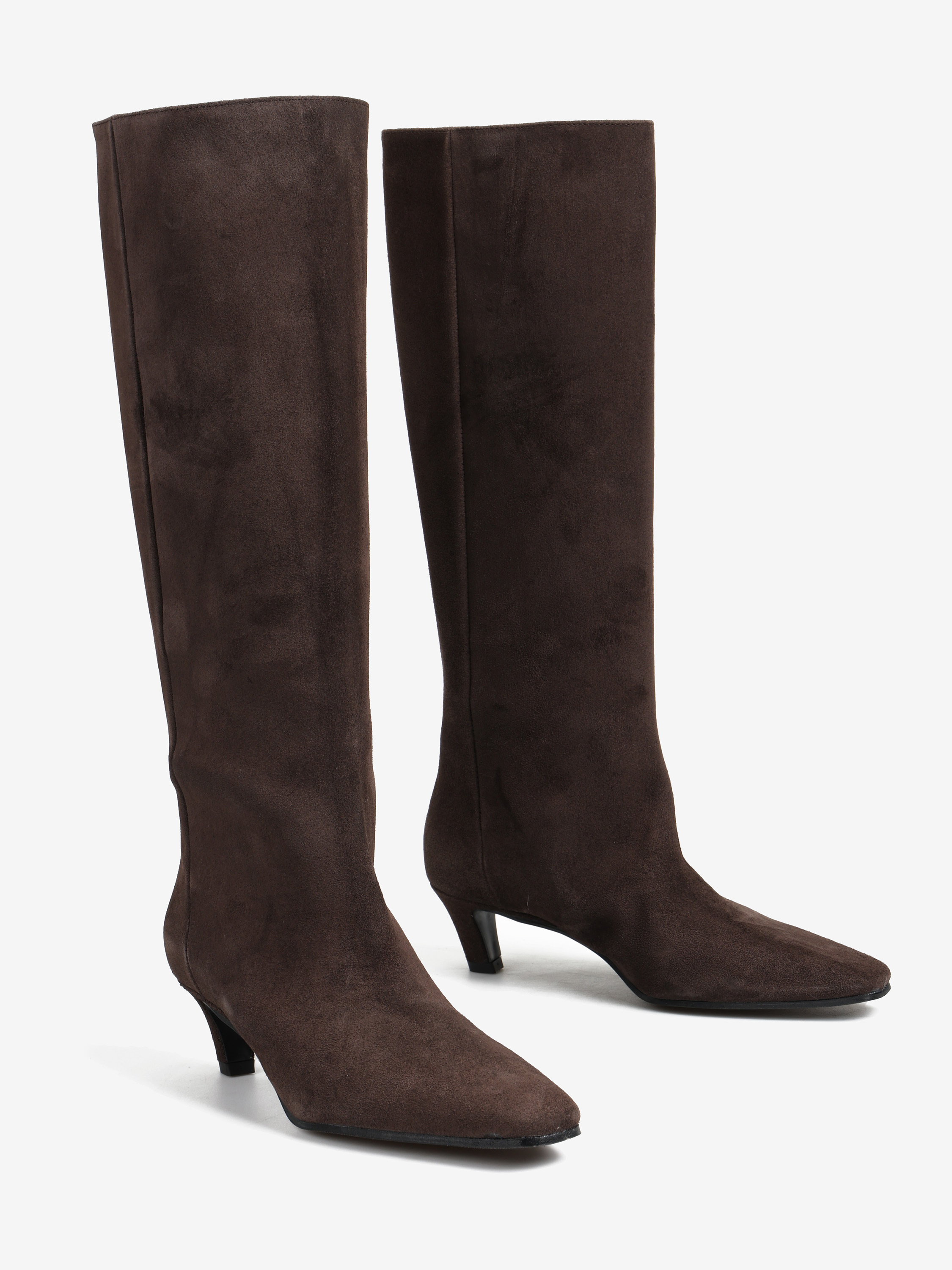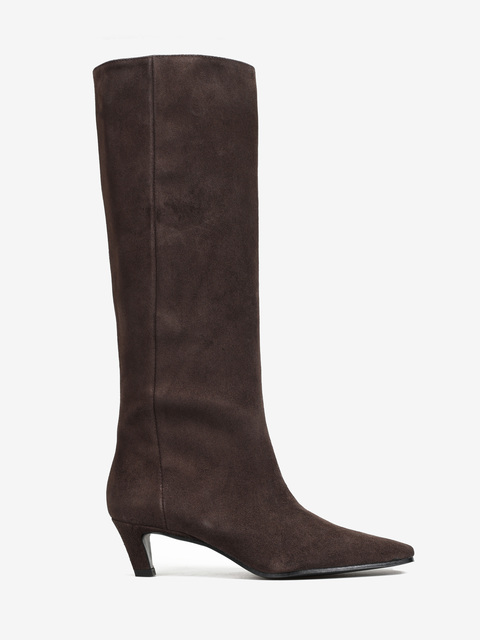 Wsuwane kozaki na niskiej szpilce z wydłużonymi, kwadratowymi noskami.