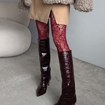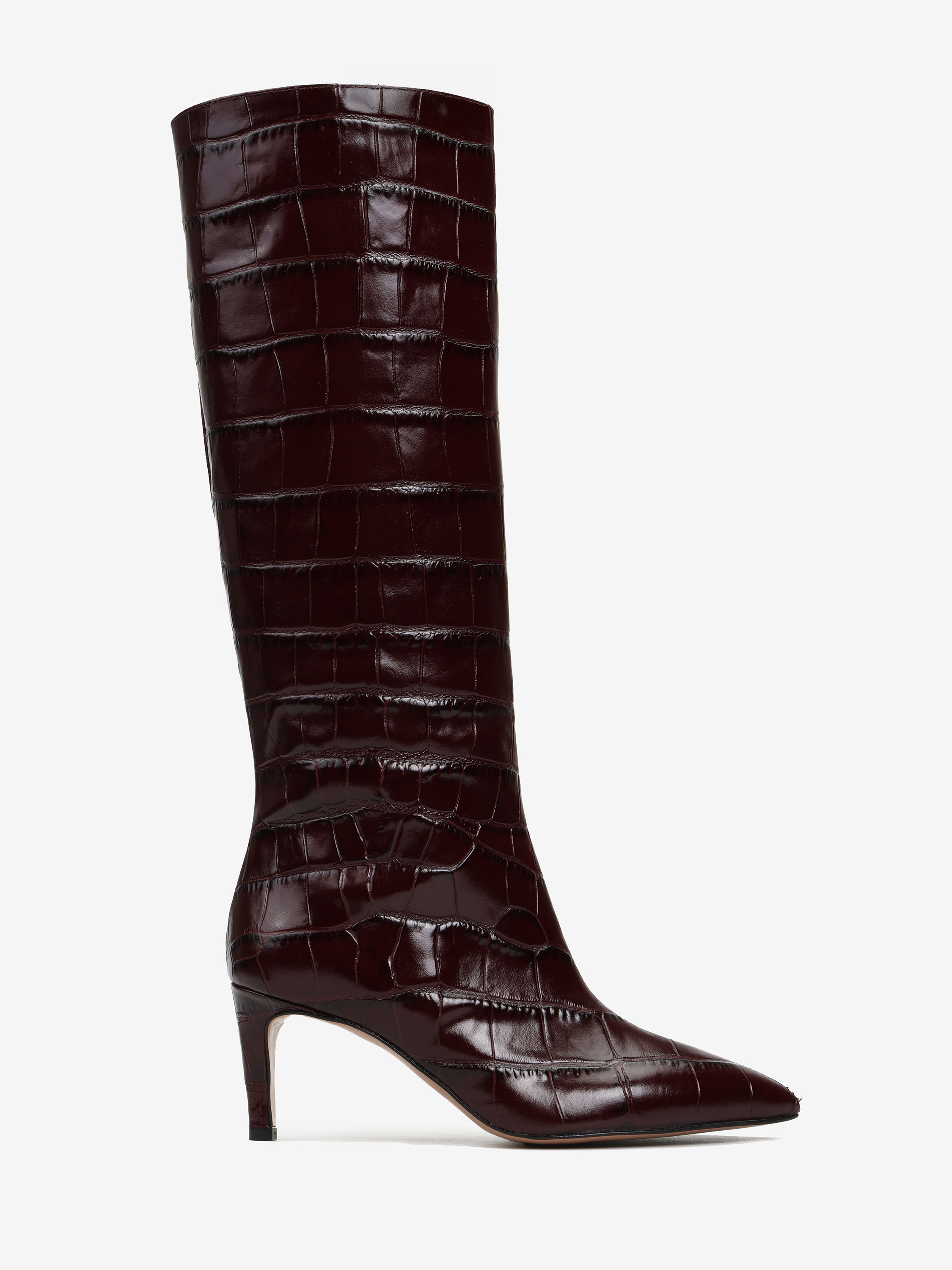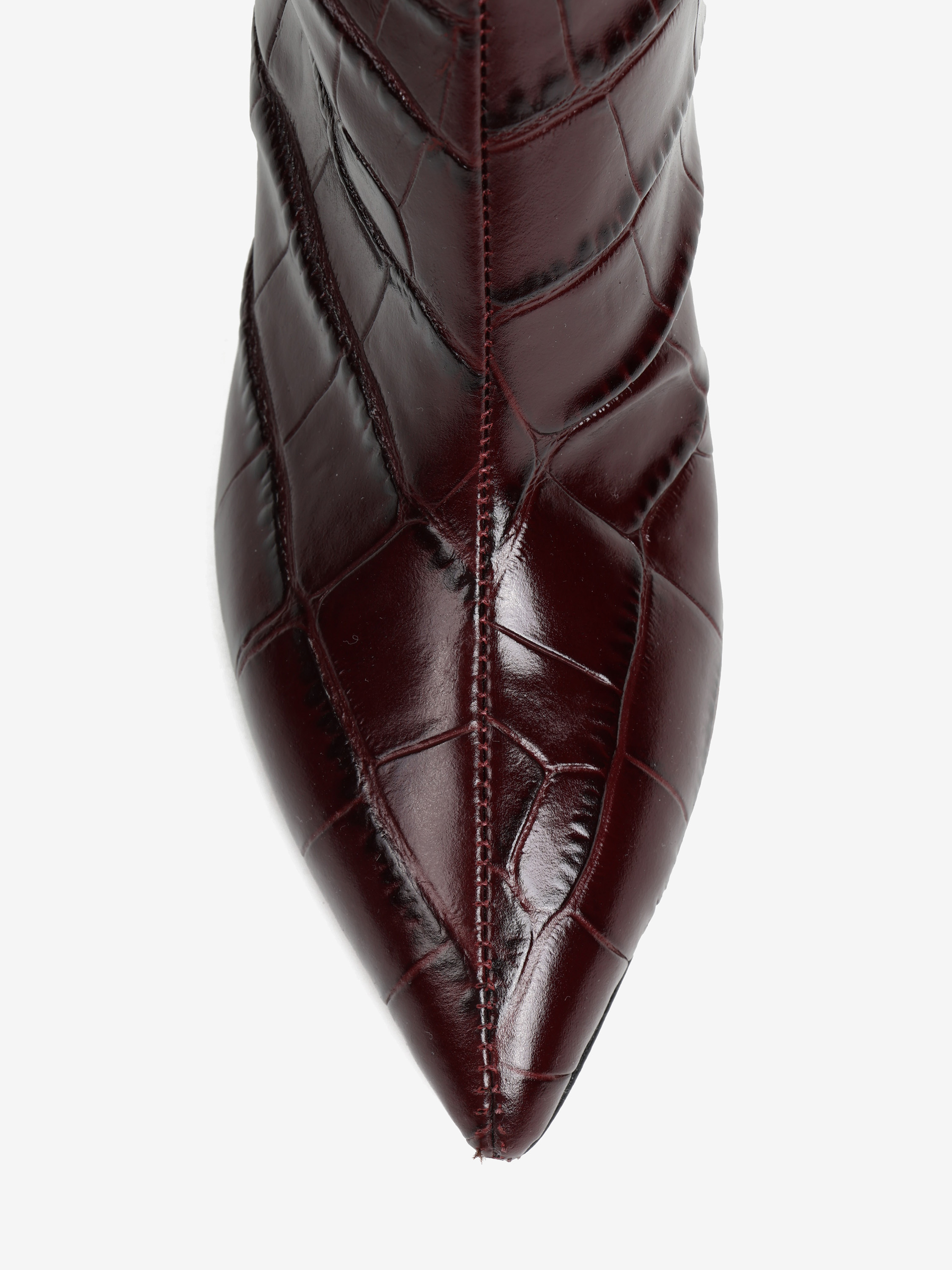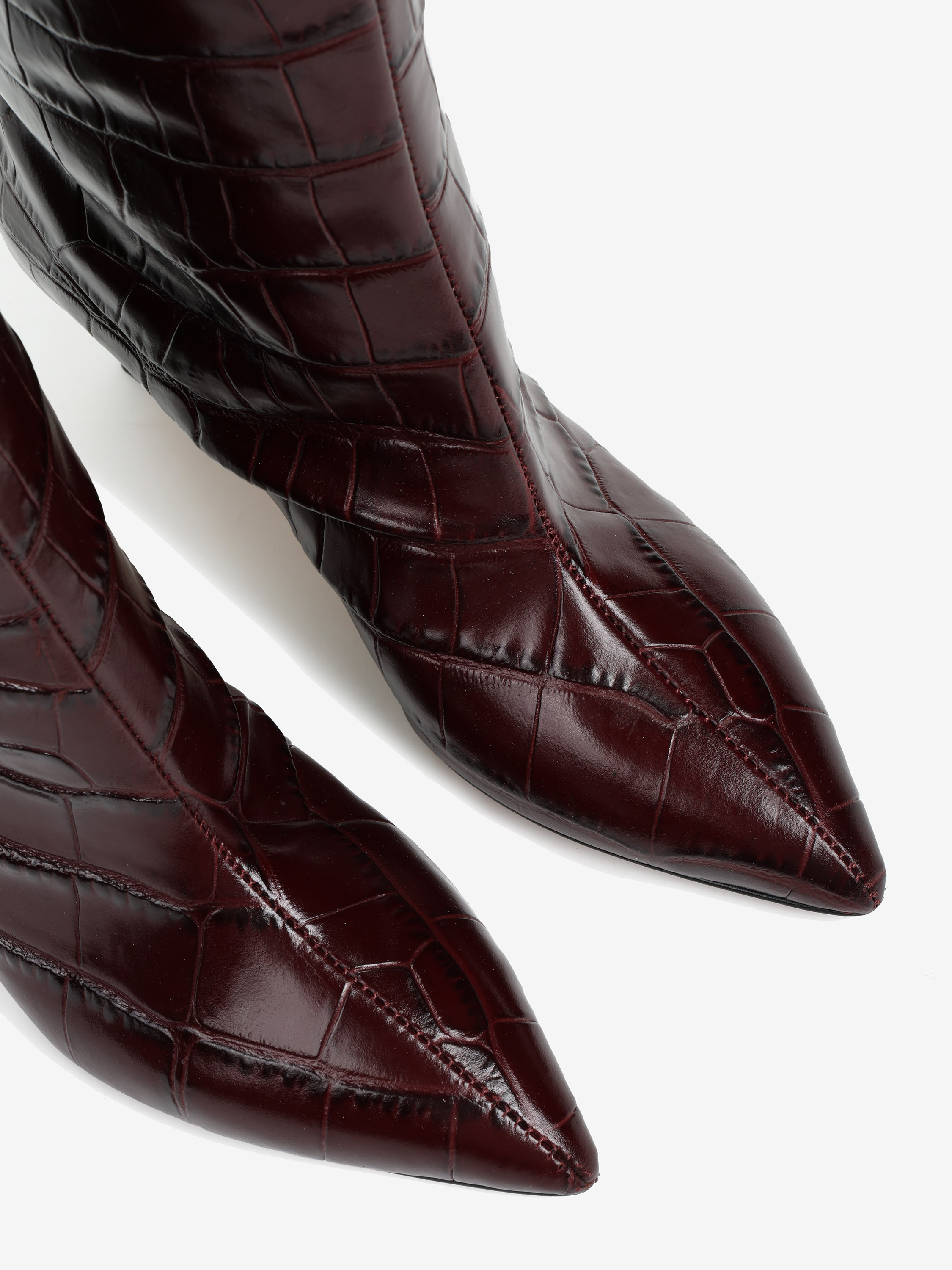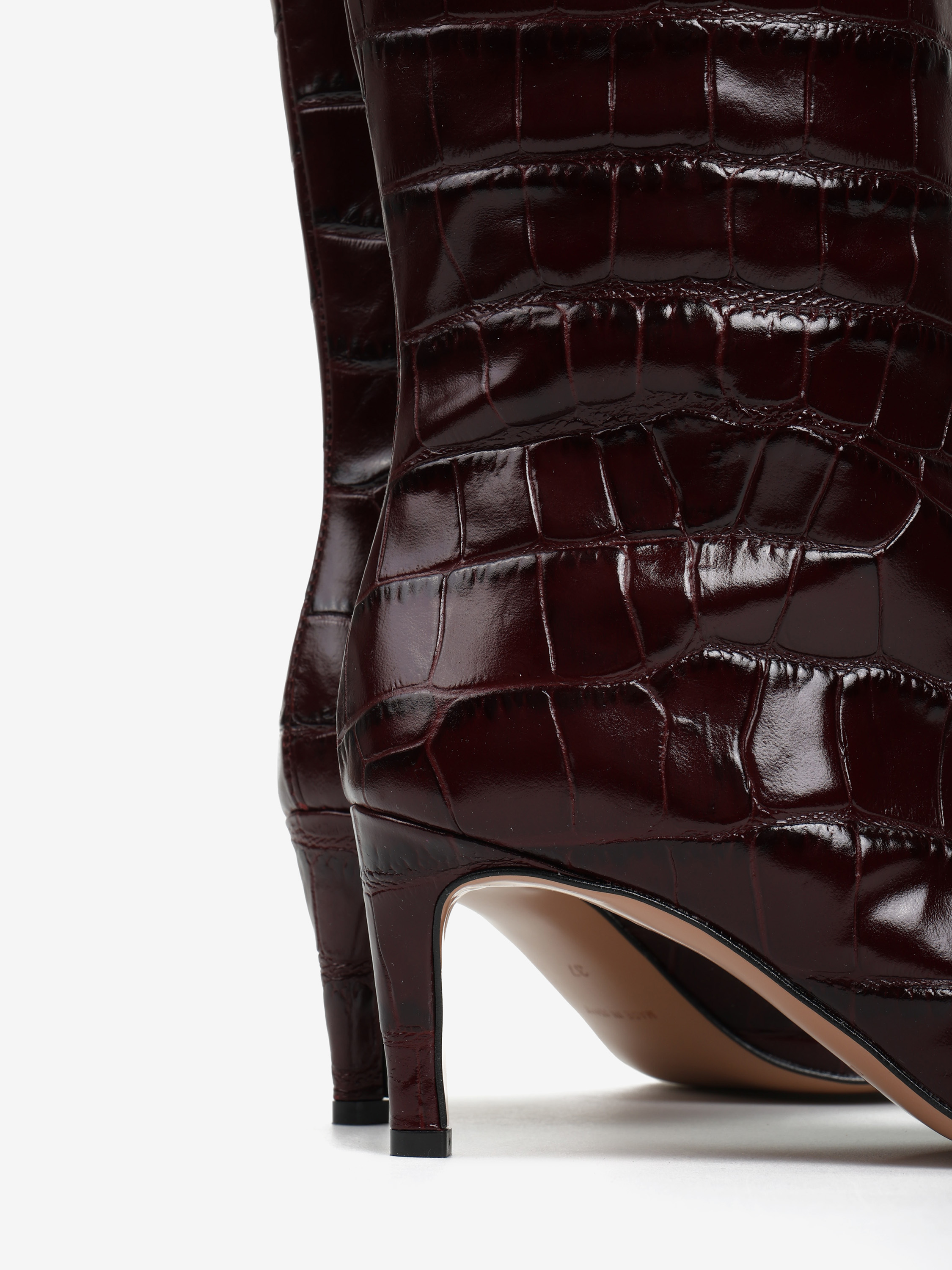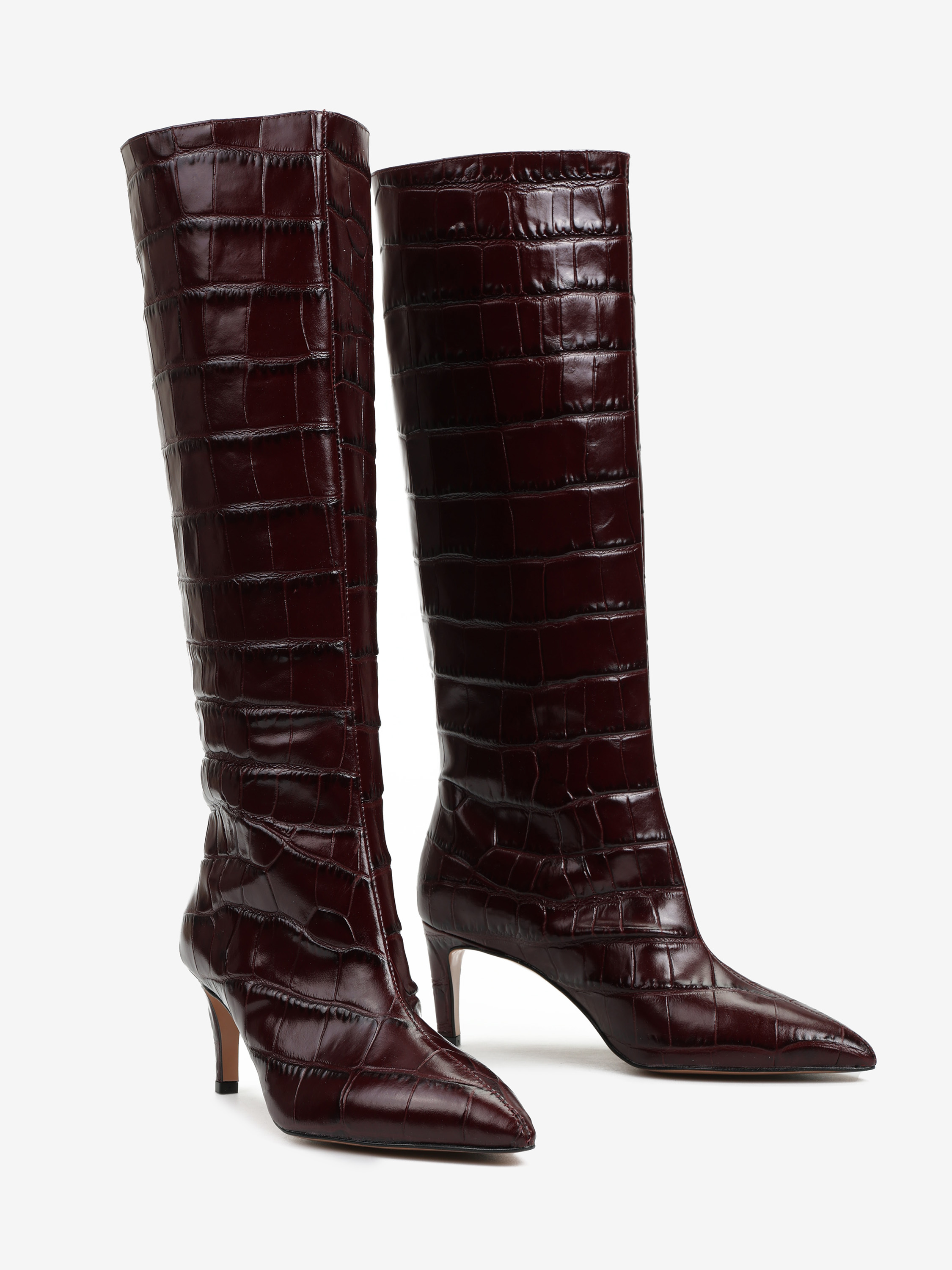 Wsuwane kozaki na szpilce wykonane z wysoko polerowanej skóry tłoczonej w krokodyli wzór. Noski w szpic.
