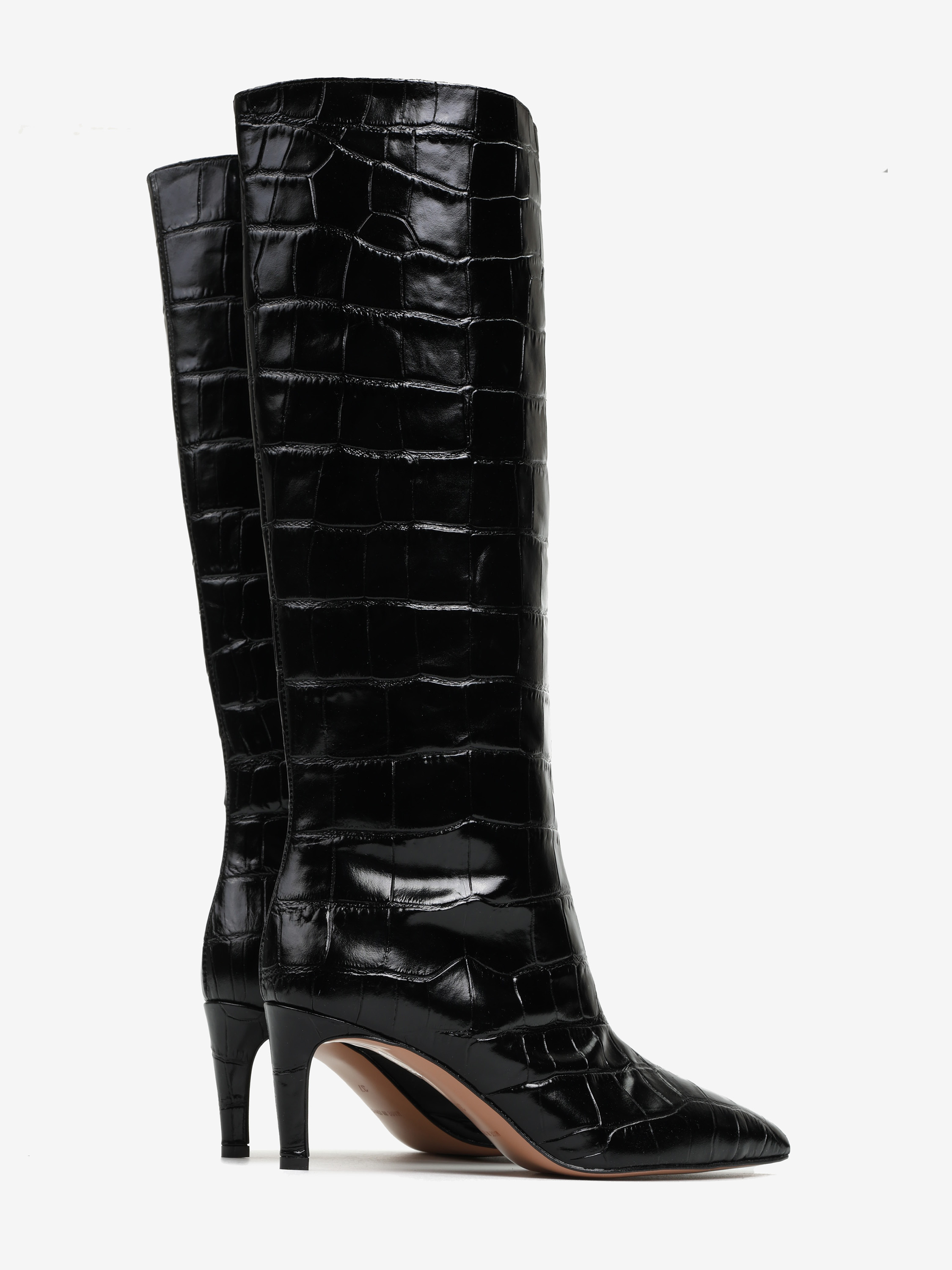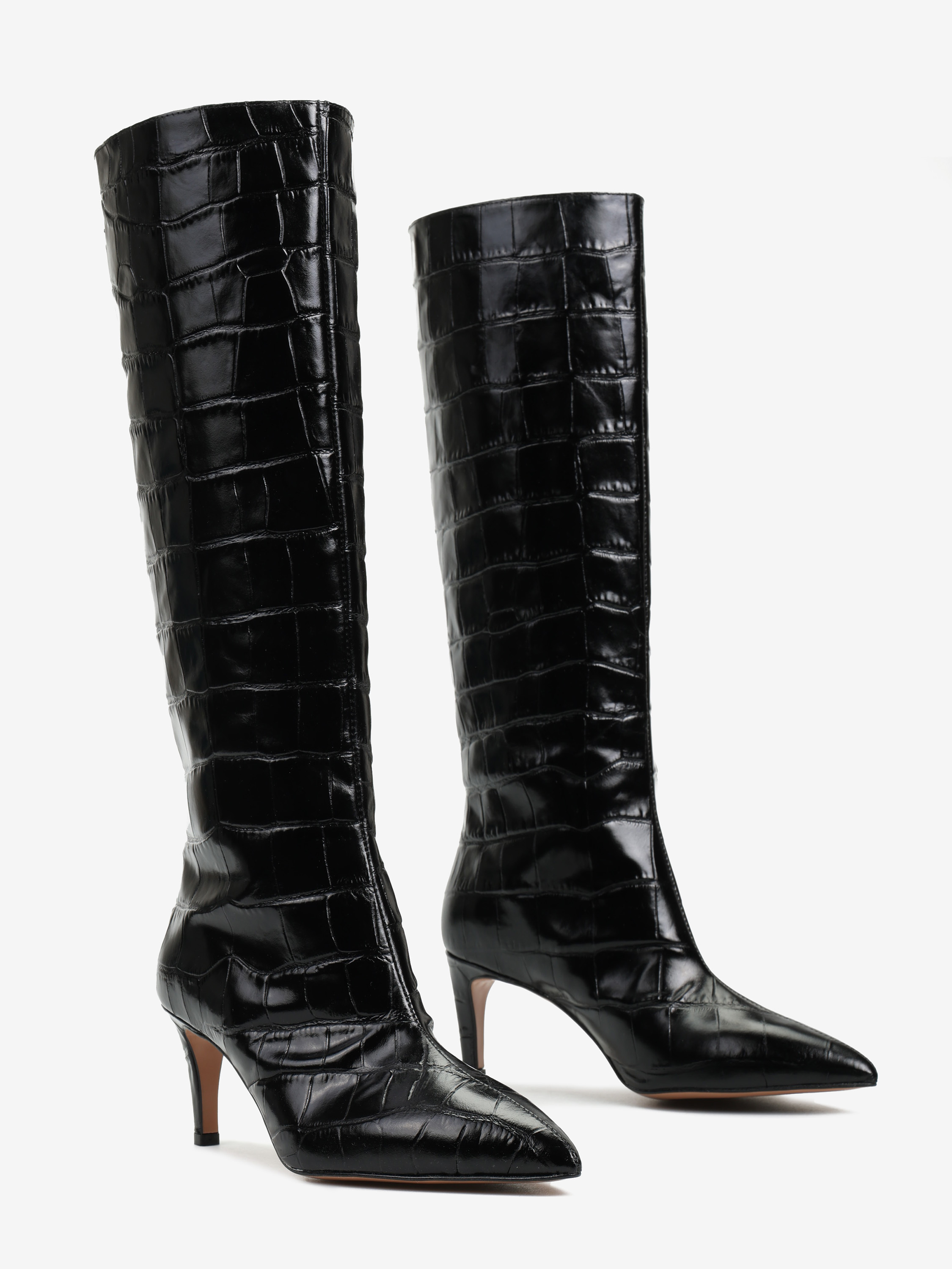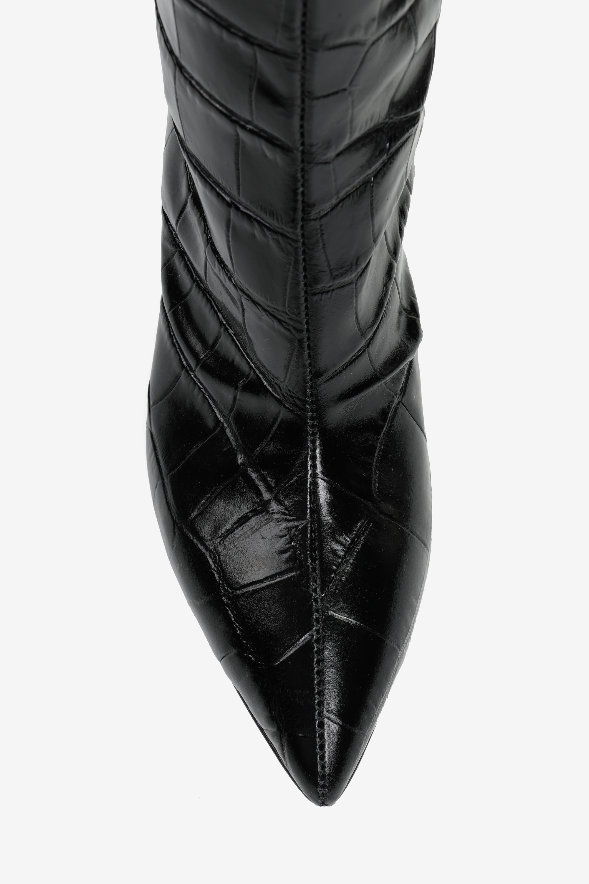 Wsuwane kozaki na szpilce wykonane z wysoko polerowanej skóry tłoczonej w krokodyli wzór. Noski w szpic.