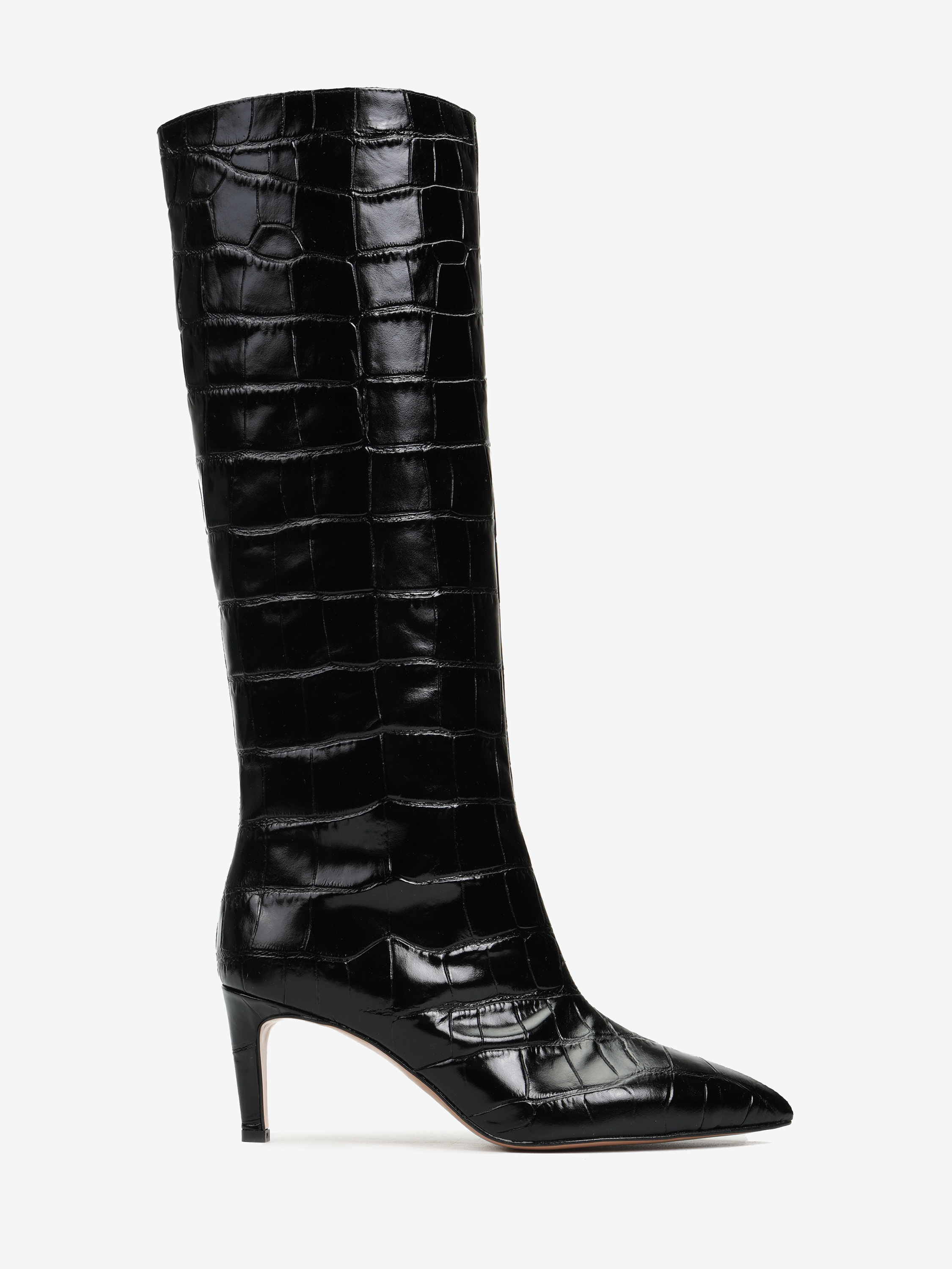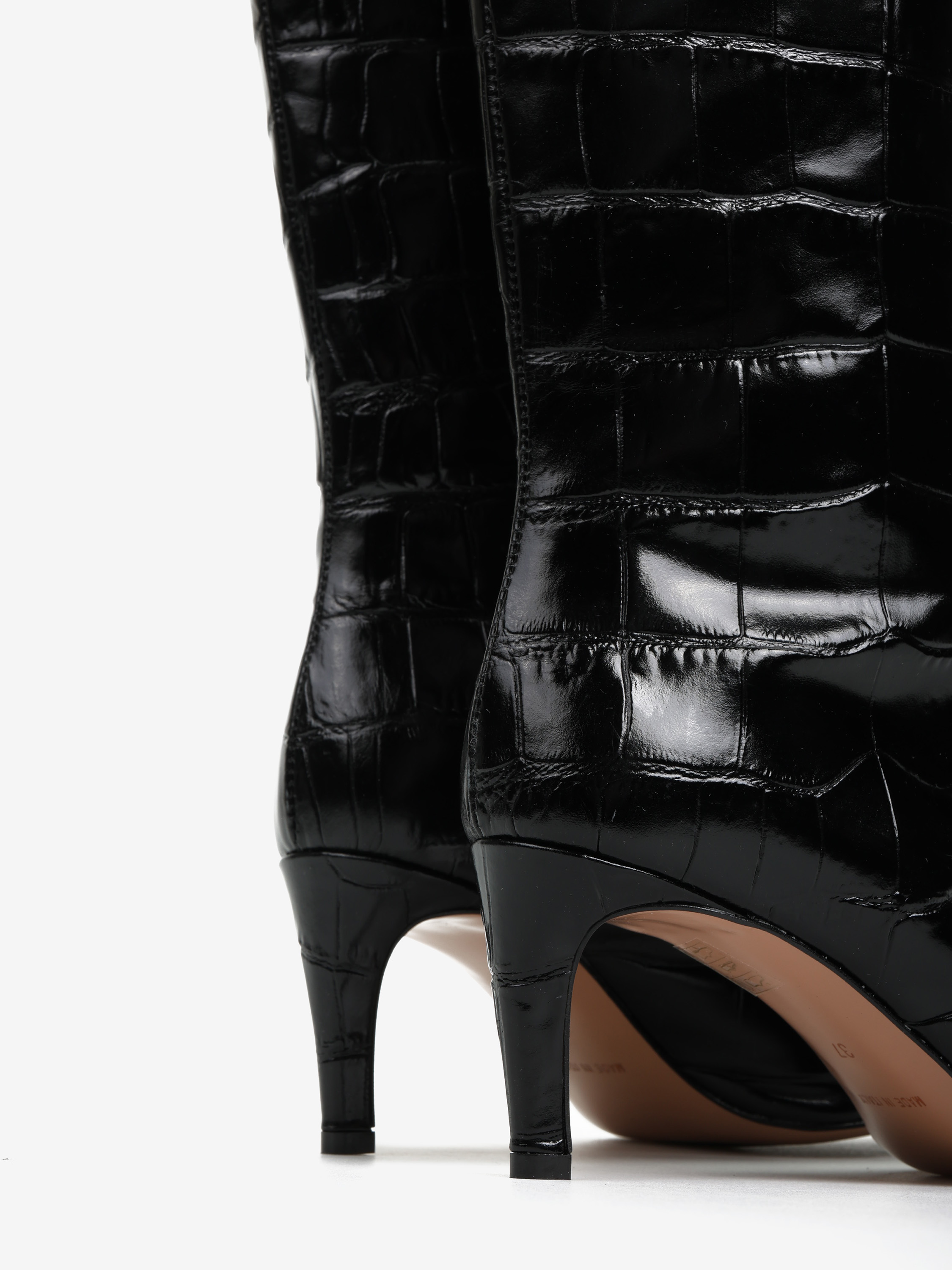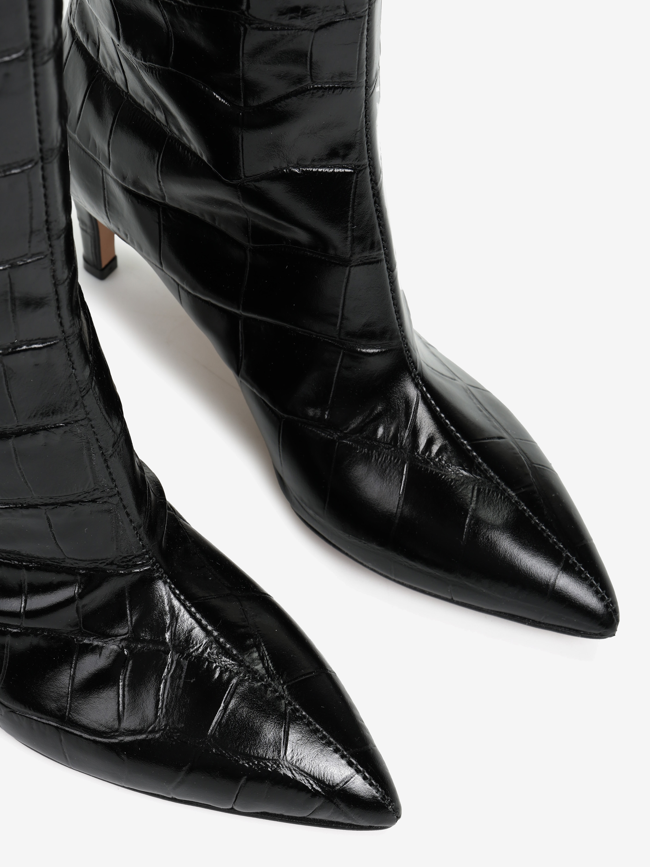 Wsuwane kozaki na szpilce wykonane z wysoko polerowanej skóry tłoczonej w krokodyli wzór. Noski w szpic.