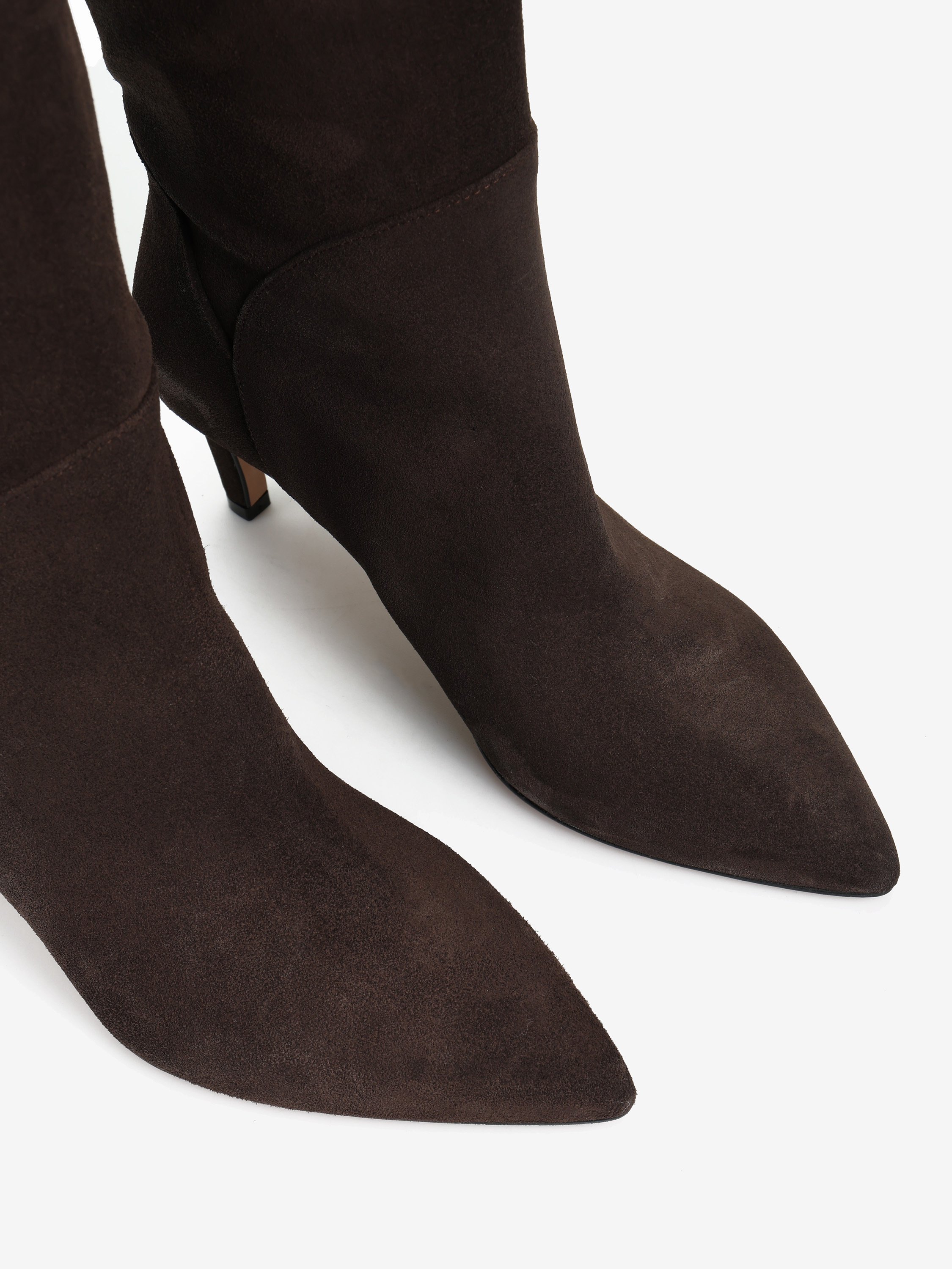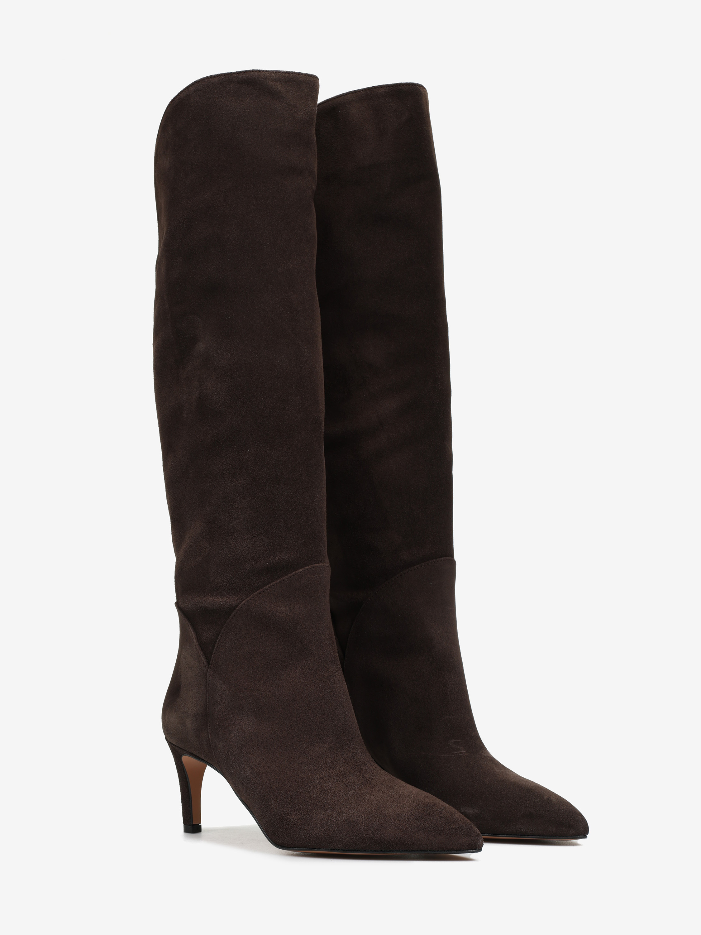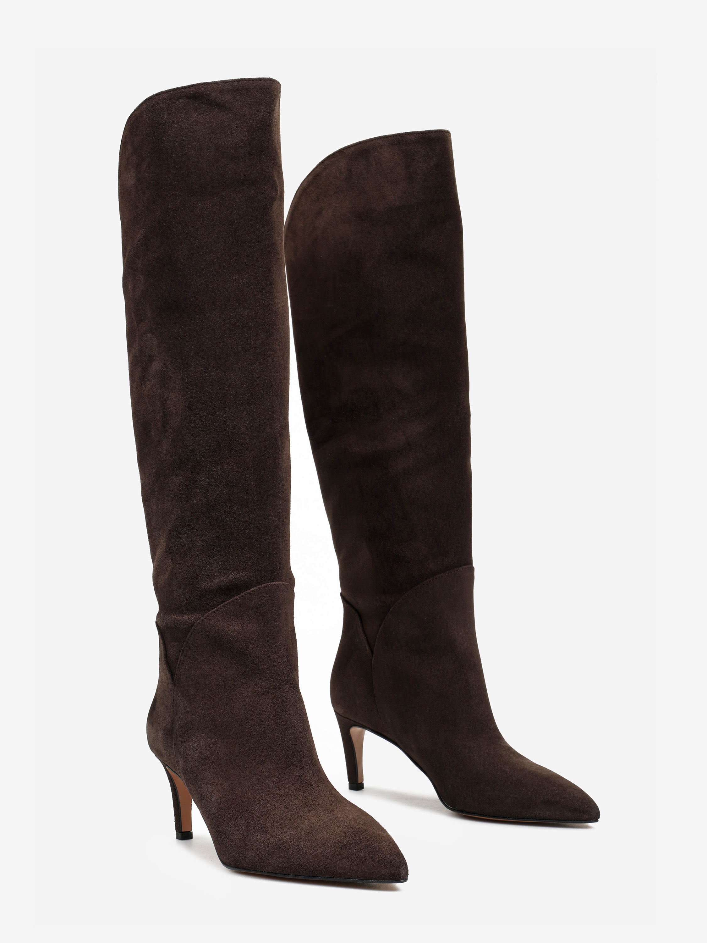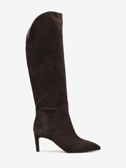 Zamszowe, wsuwane kozaki na szpilce w stylu muszkieterek. Noski w szpic i asymetryczna cholewka z ozdobnymi przeszyciami.