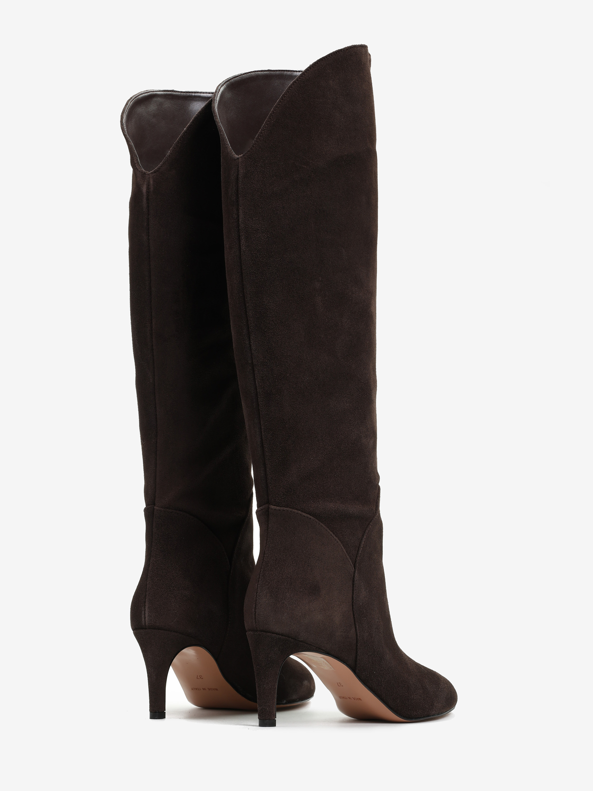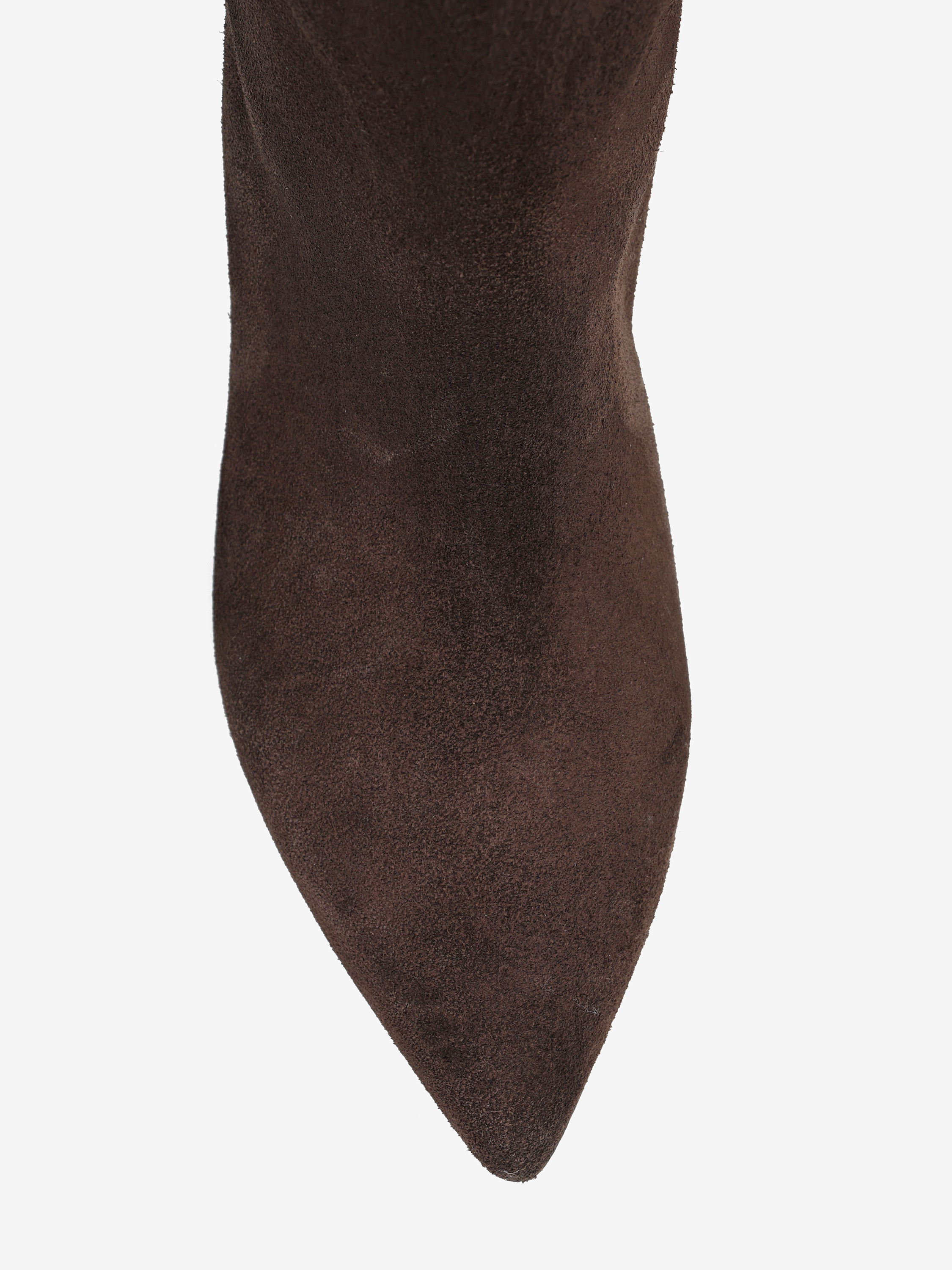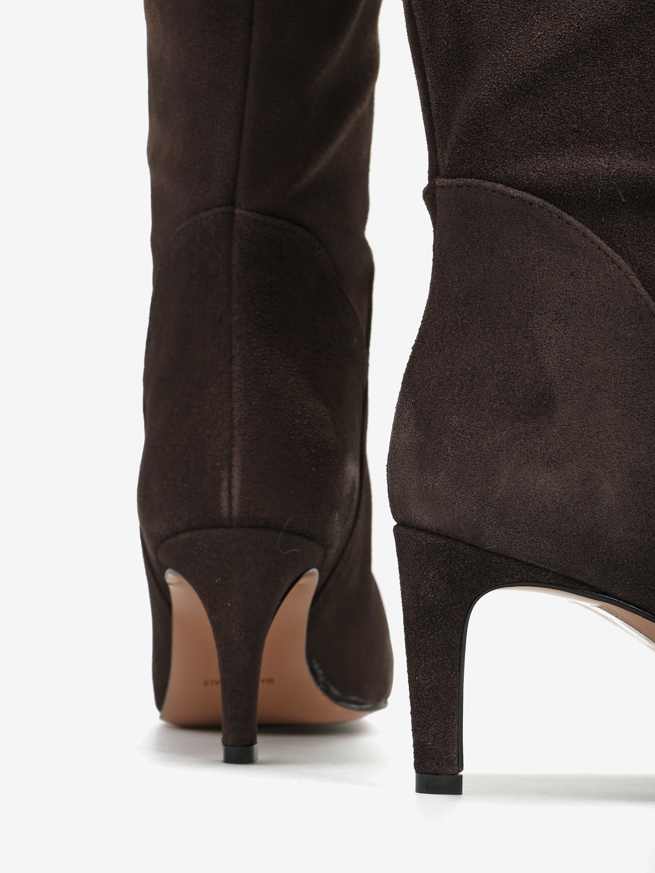 Zamszowe, wsuwane kozaki na szpilce w stylu muszkieterek. Noski w szpic i asymetryczna cholewka z ozdobnymi przeszyciami.