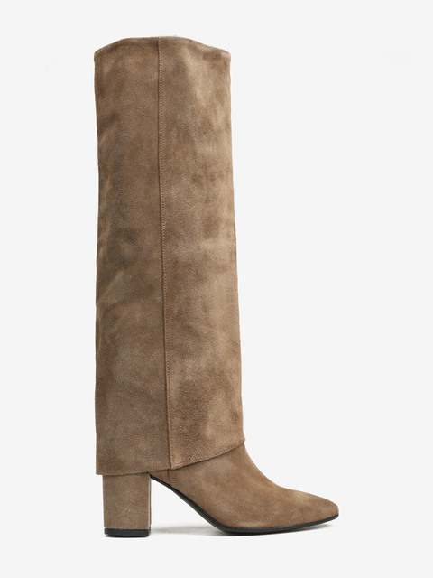 Zamszowe, wsuwane kozaki na stabilnym słupku. Przedłużona cholewka.