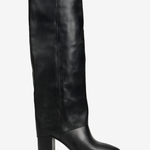 Skórzane, wsuwane kozaki na stabilnym słupku. Przedłużona cholewka.