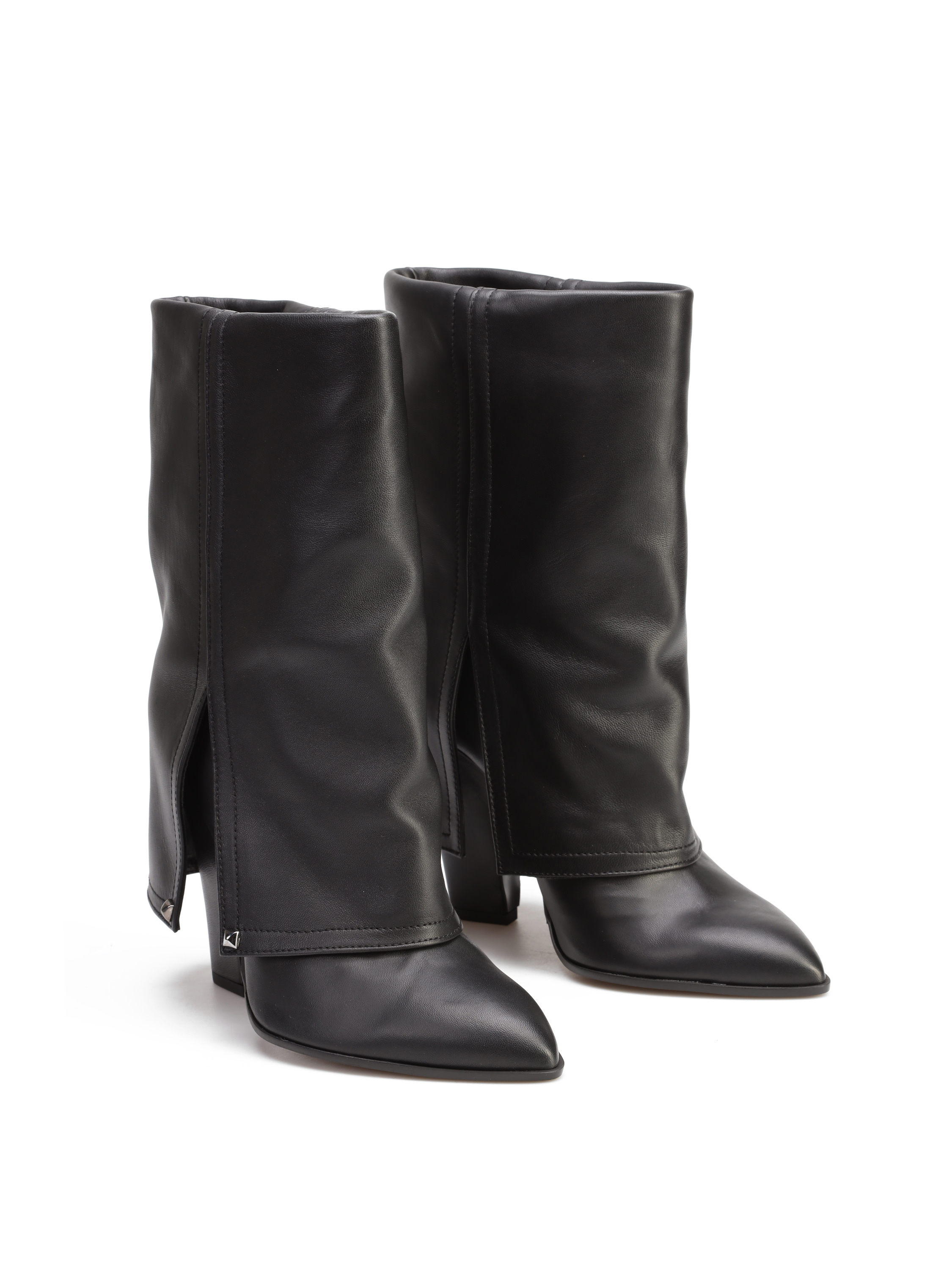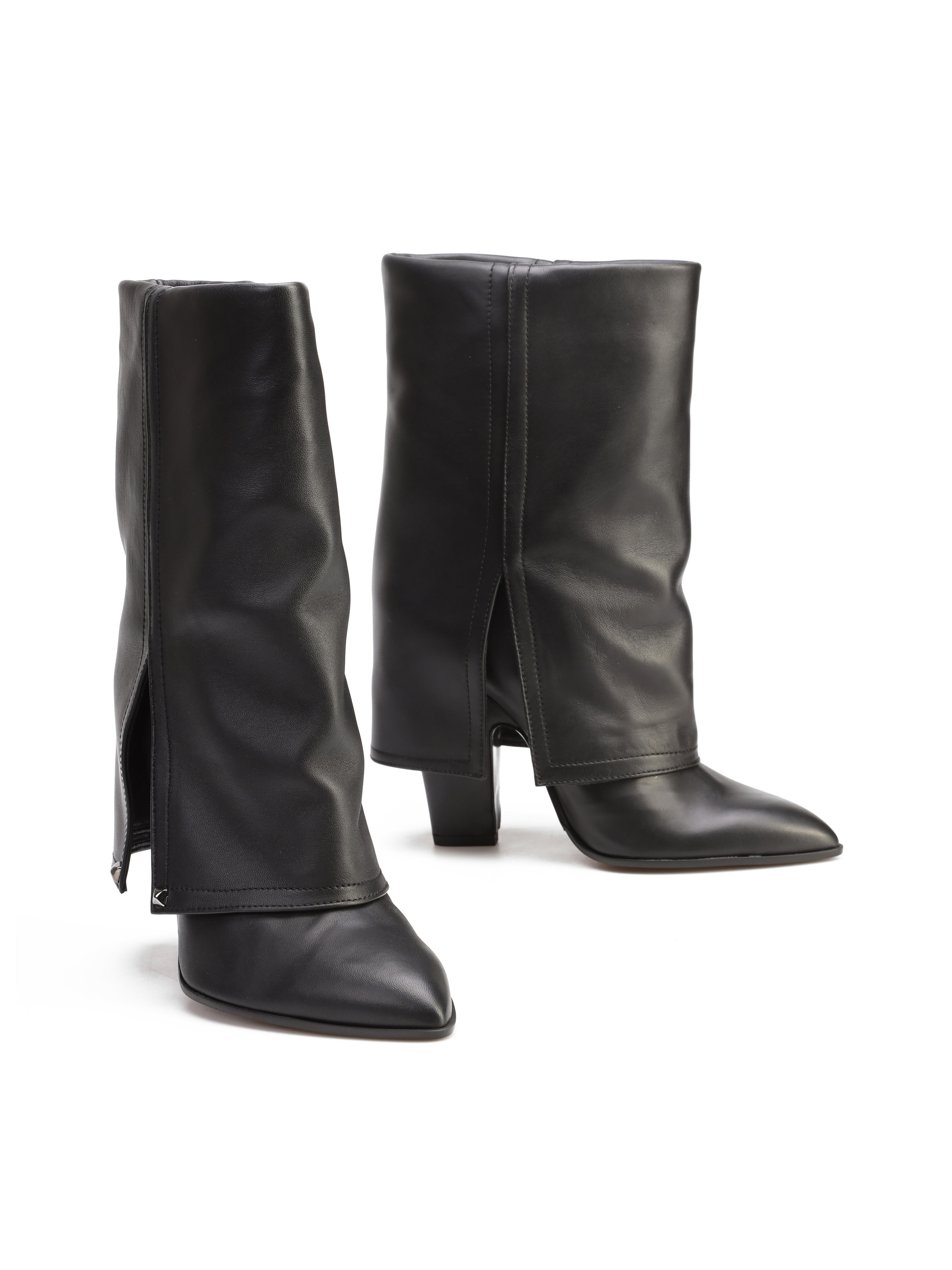 Botki na obcasie to model pasujący do wielu stylizacji. Wsuwana, luźna cholewka w klasycznym, czarnym kolorze wykonana jest z naturalnej skóry. Dodatkowo wywijana, wpisuje się w Trendy sezonu. Model z noskiem w szpic, osadzony na stablinym obcasie na słupku.