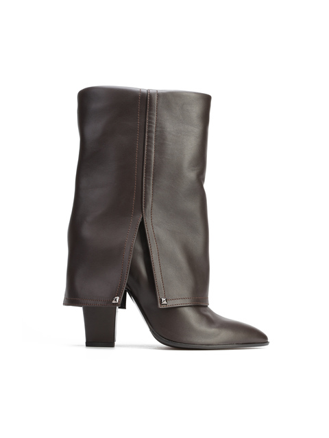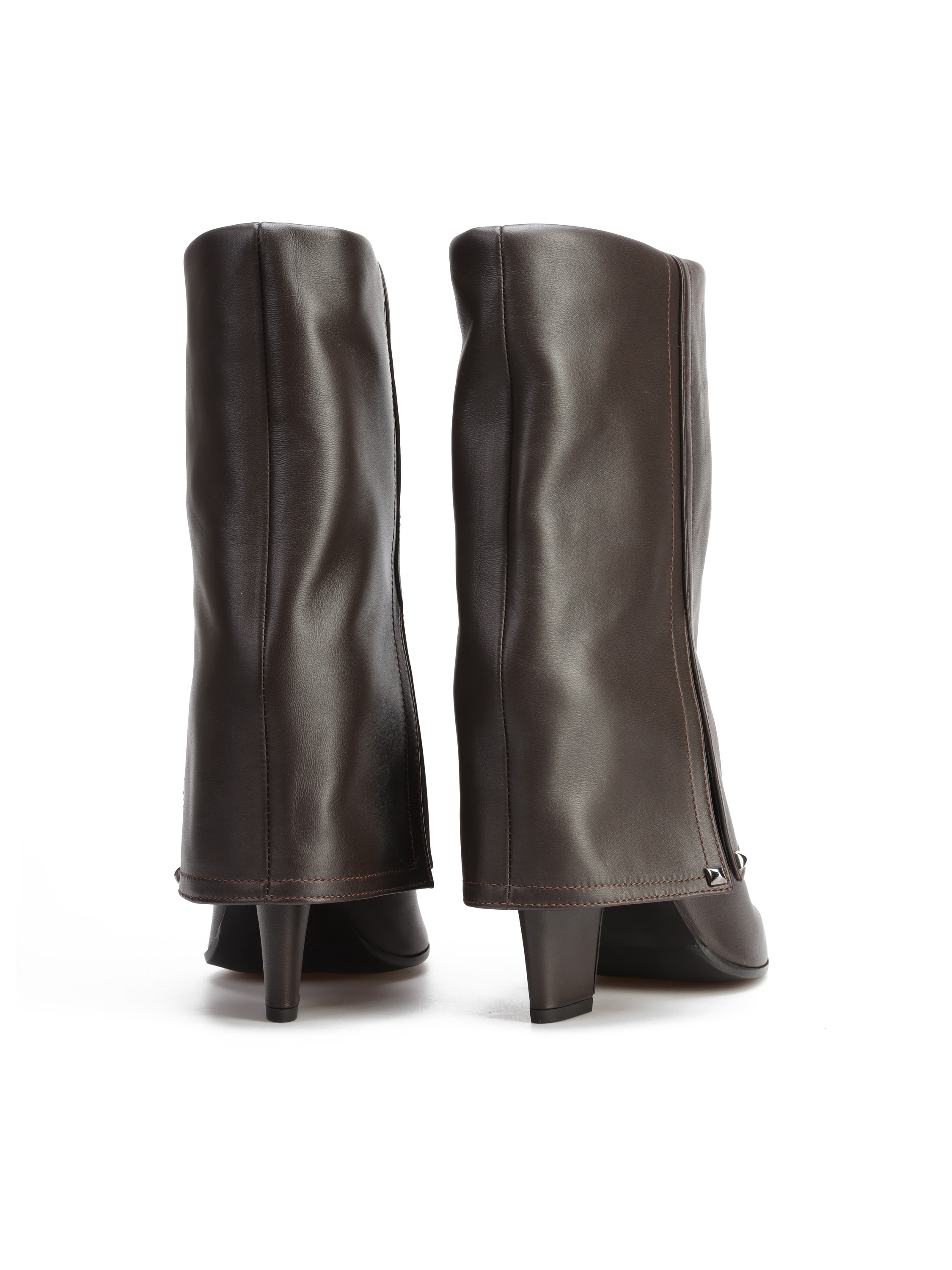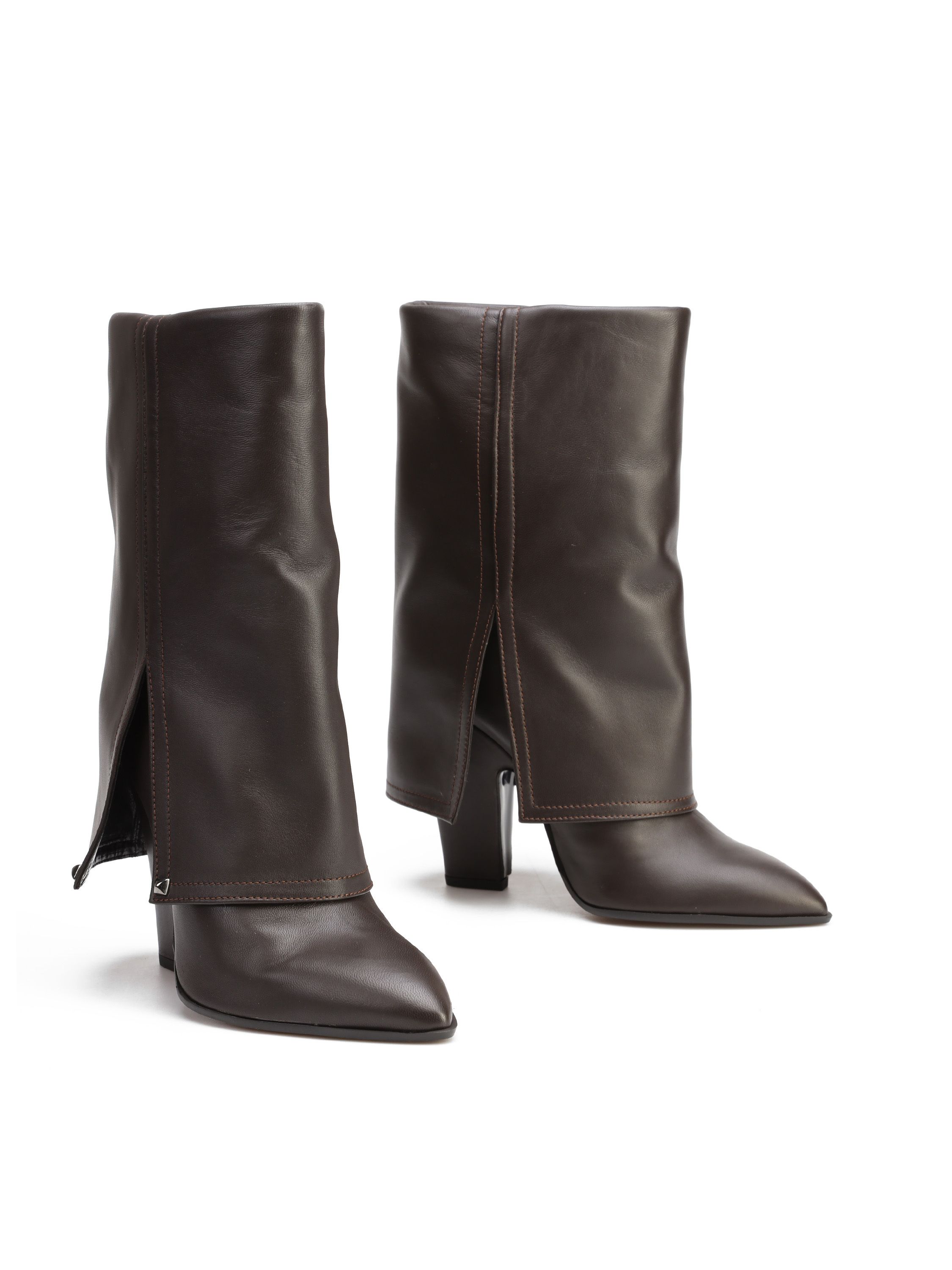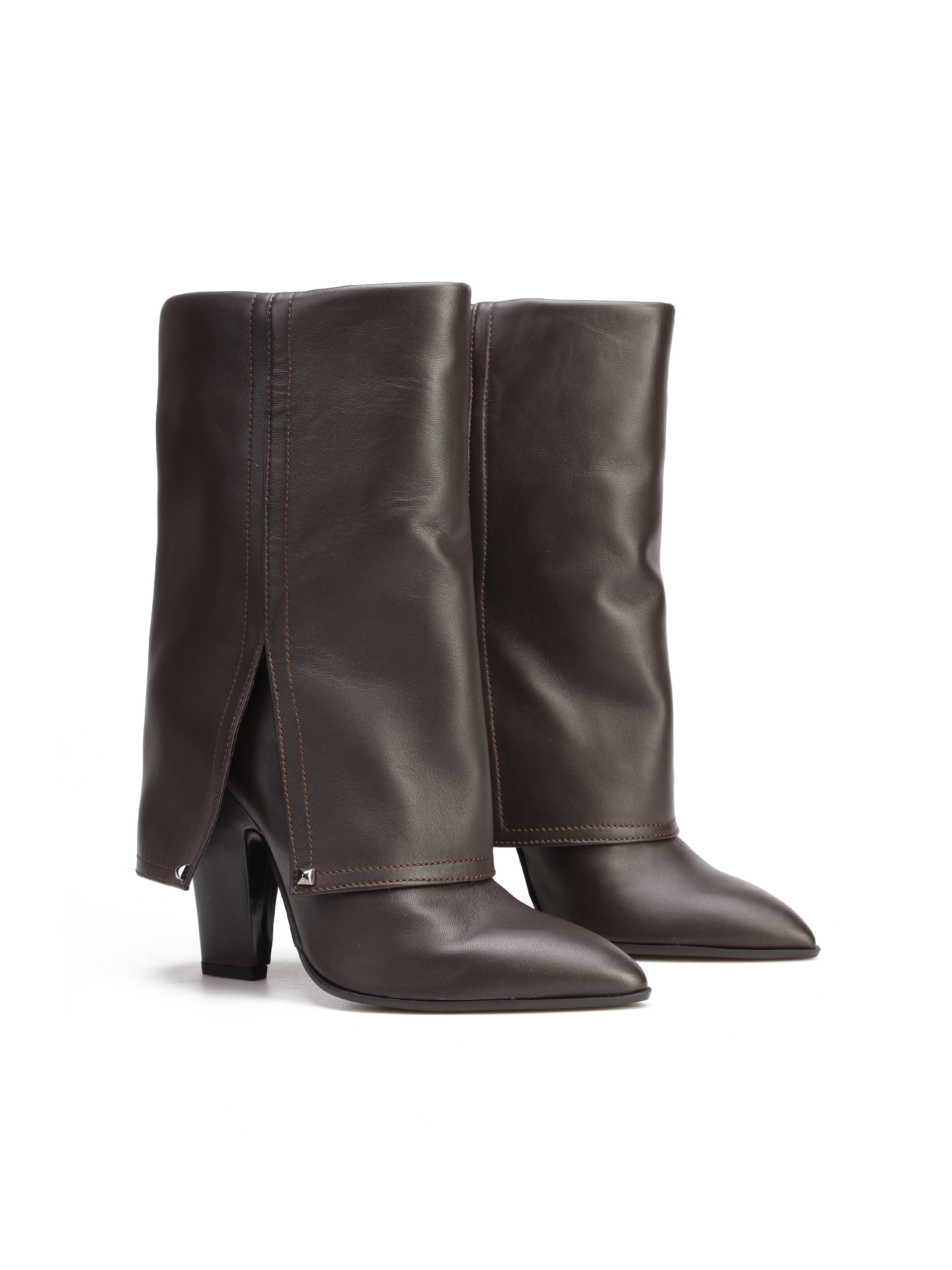 Botki na obcasie to model pasujący do wielu stylizacji.  Wsuwana, luźna cholewka w modnym kolorze wykonana jest z naturalnej skóry. Dodatkowo wywijana, wpisuje się w Trendy sezonu. Model z noskiem w szpic, osadzony na stablinym obcasie na słupku.