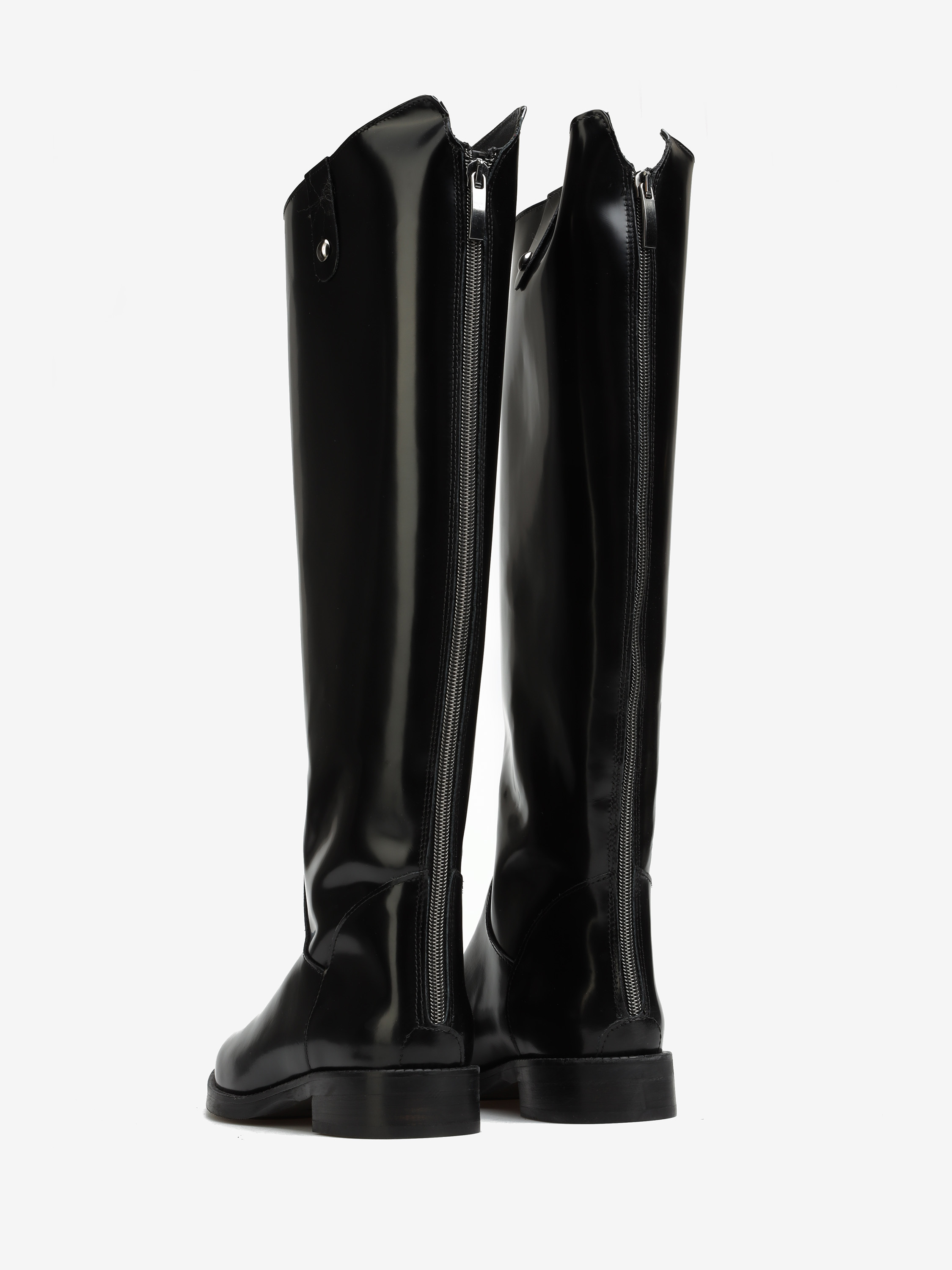 Ponadczasowe oficerki wykonane ze skóry wysokopolerowanej w czarnym kolorze, zapinane na suwak z tyłu.