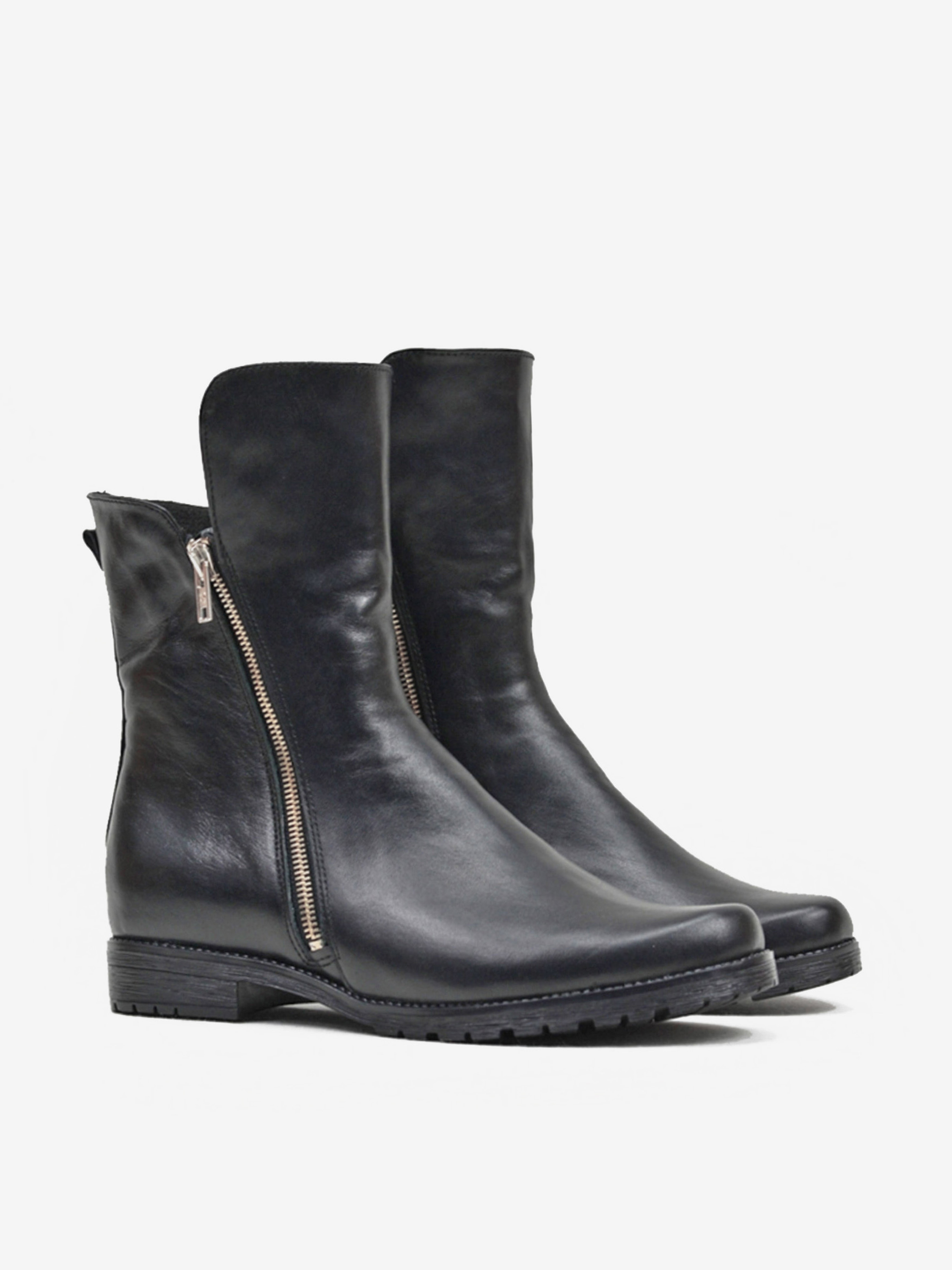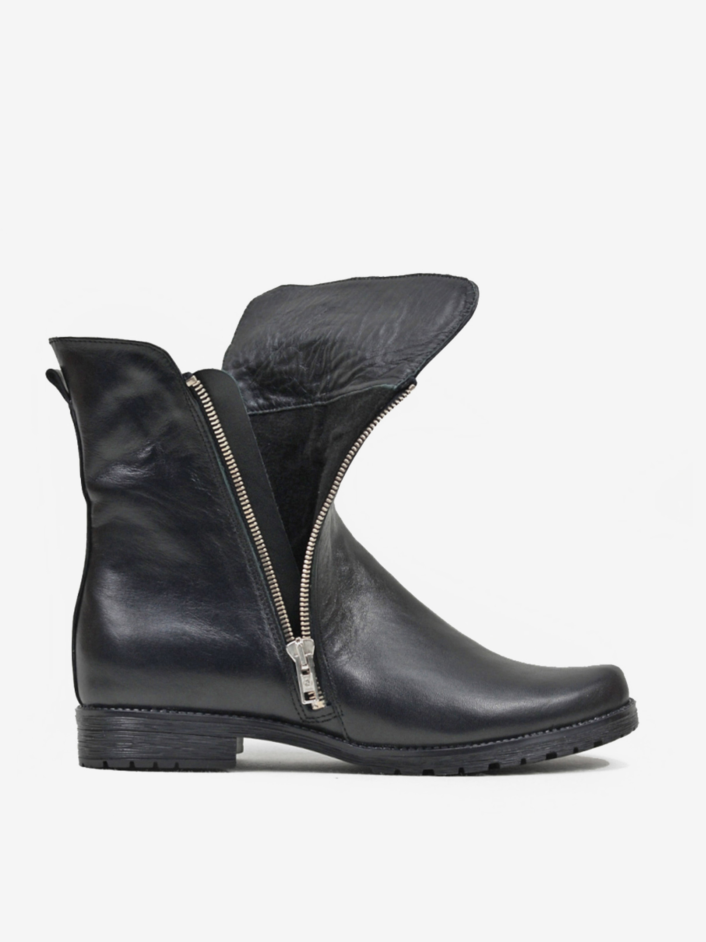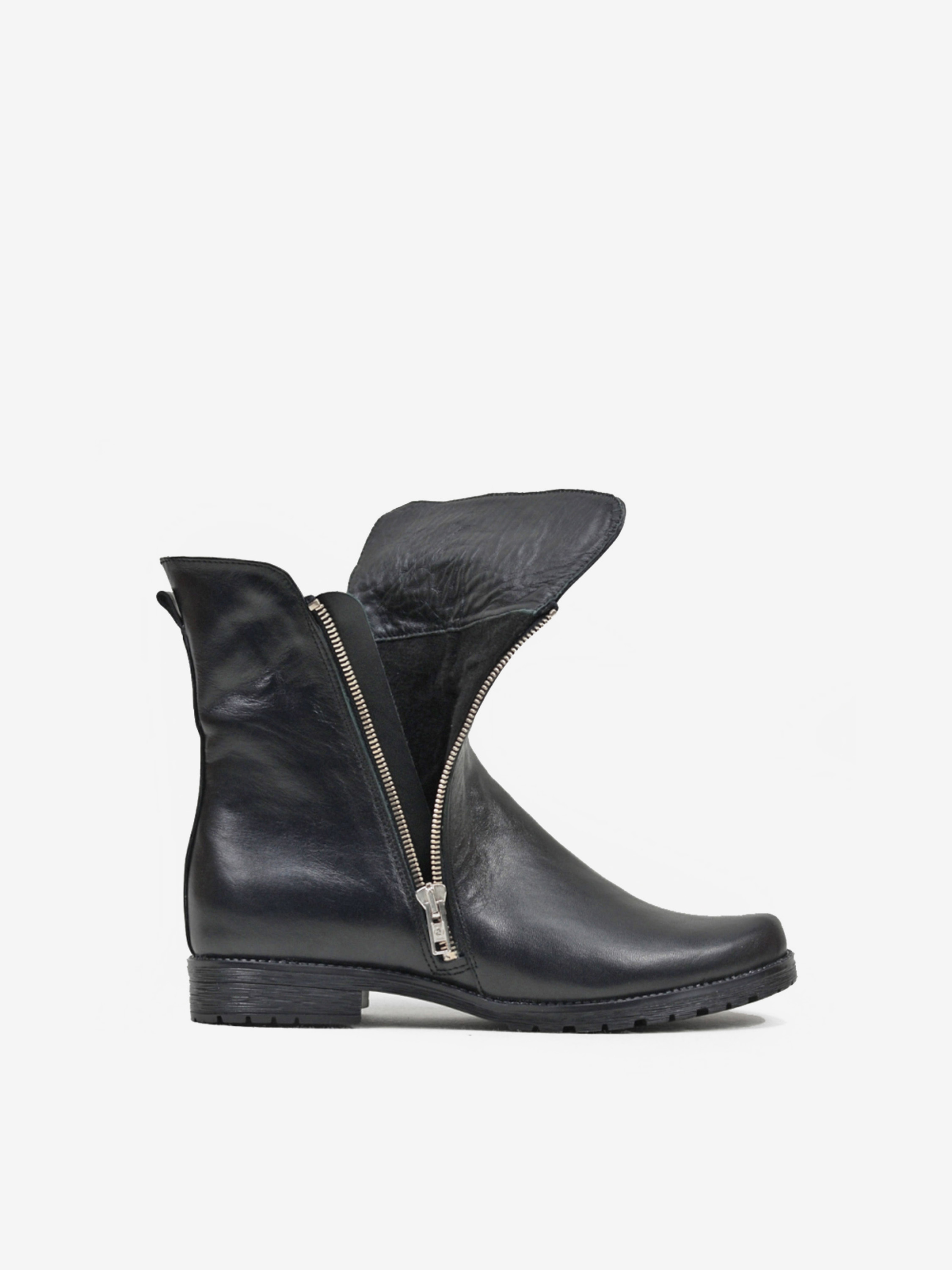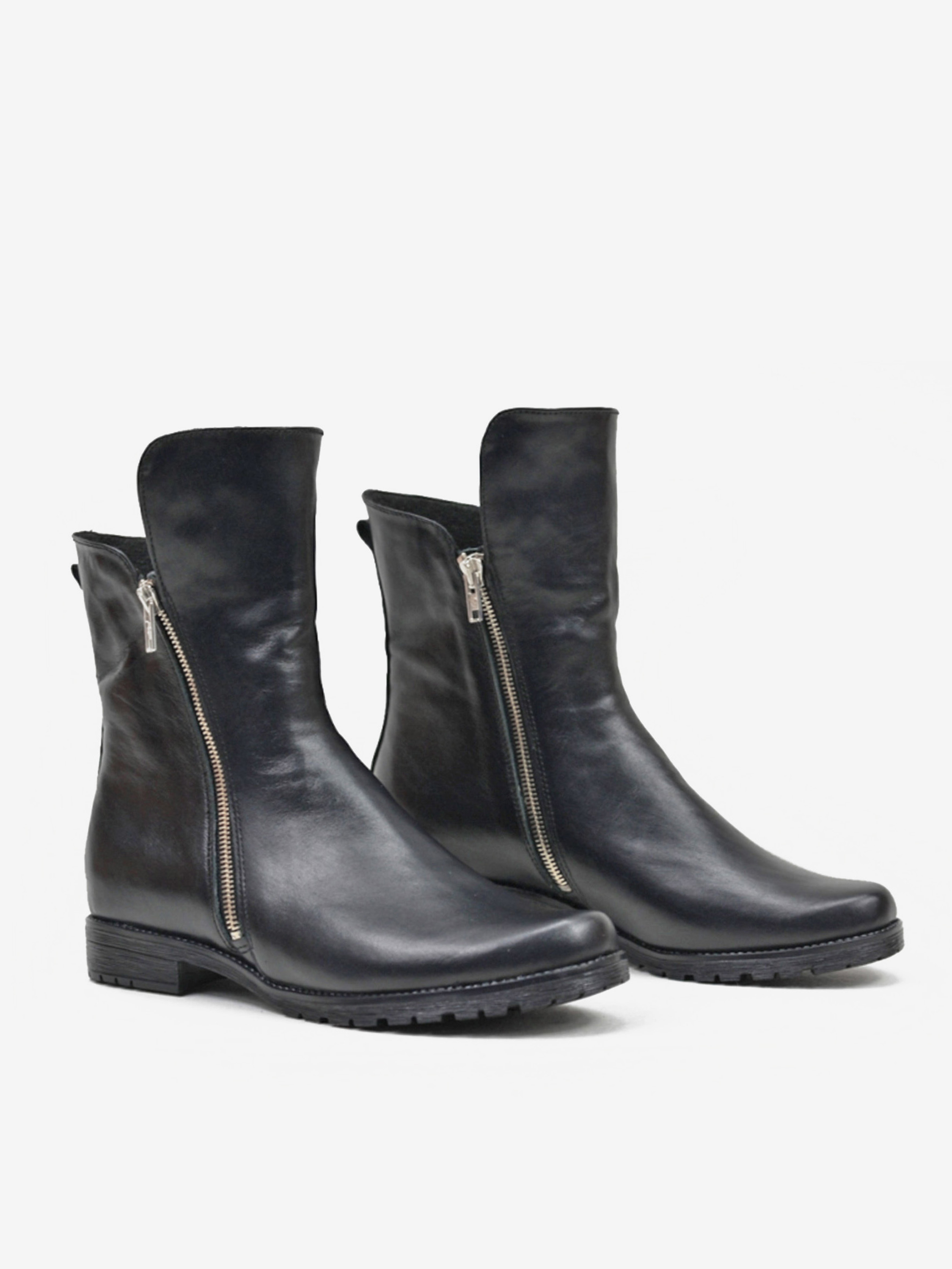 Czarne, ocieplane botki o niecodziennym kroju. Zasuwane na dwa widoczne, srebrne suwaki. Mogą być noszone zasunięte lub lekko rozsunięte. Gruby bieżnik na podeszwie.
