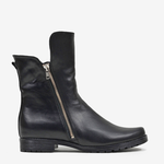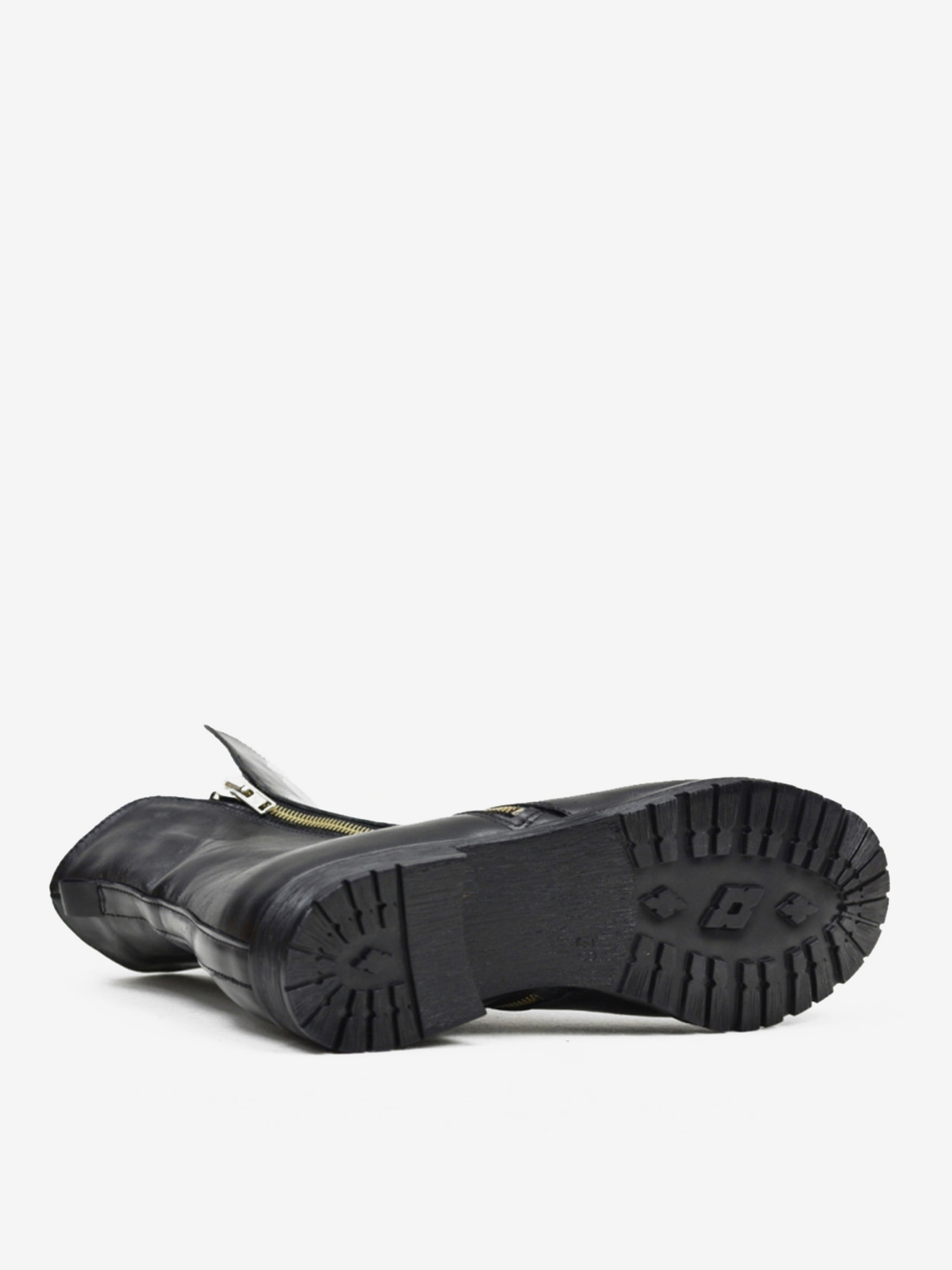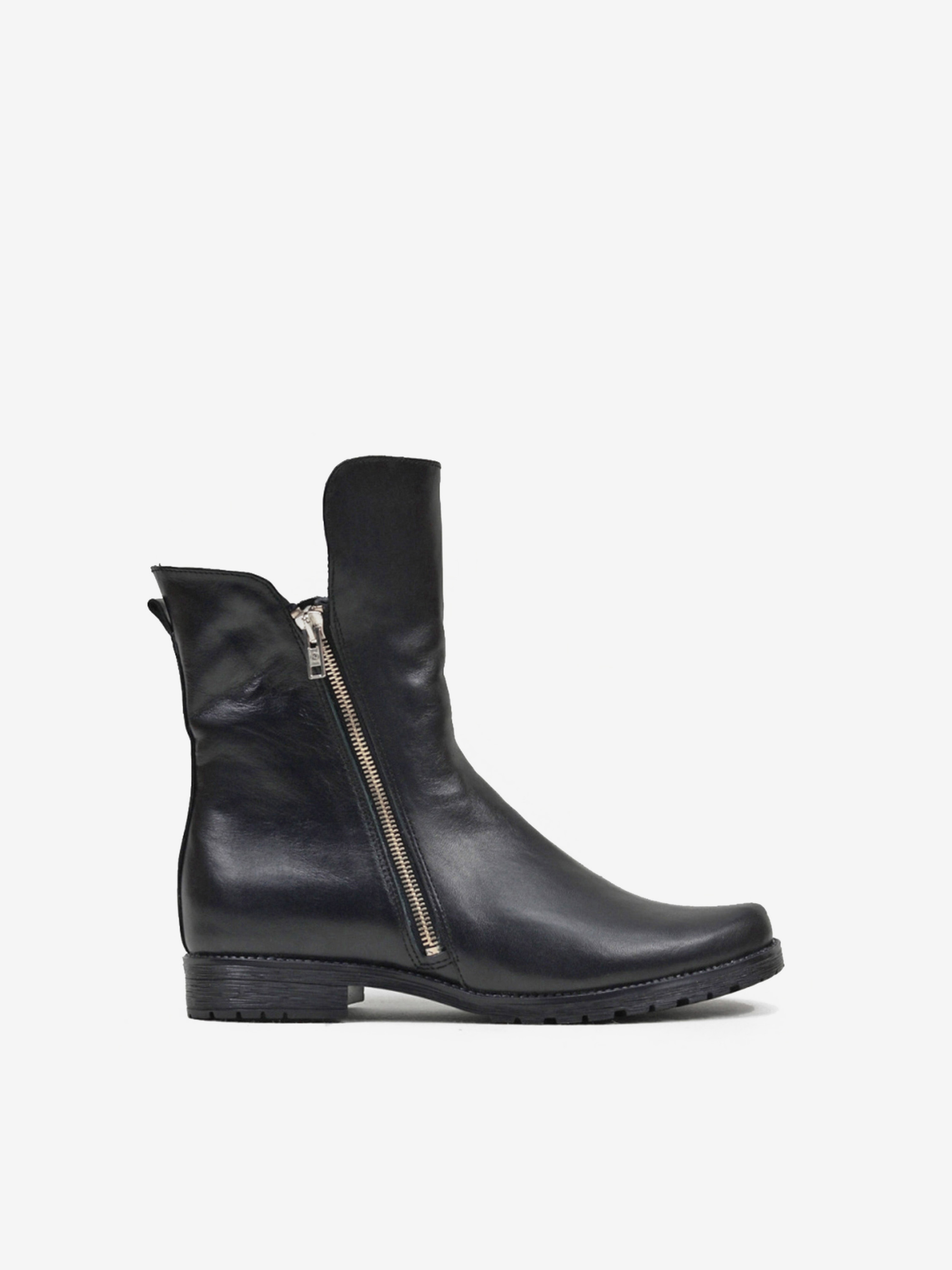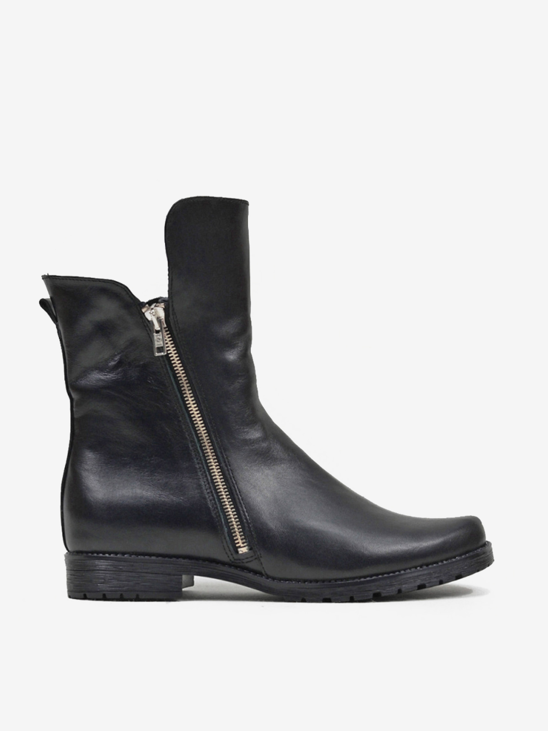 Czarne, ocieplane botki o niecodziennym kroju. Zasuwane na dwa widoczne, srebrne suwaki. Mogą być noszone zasunięte lub lekko rozsunięte. Gruby bieżnik na podeszwie.