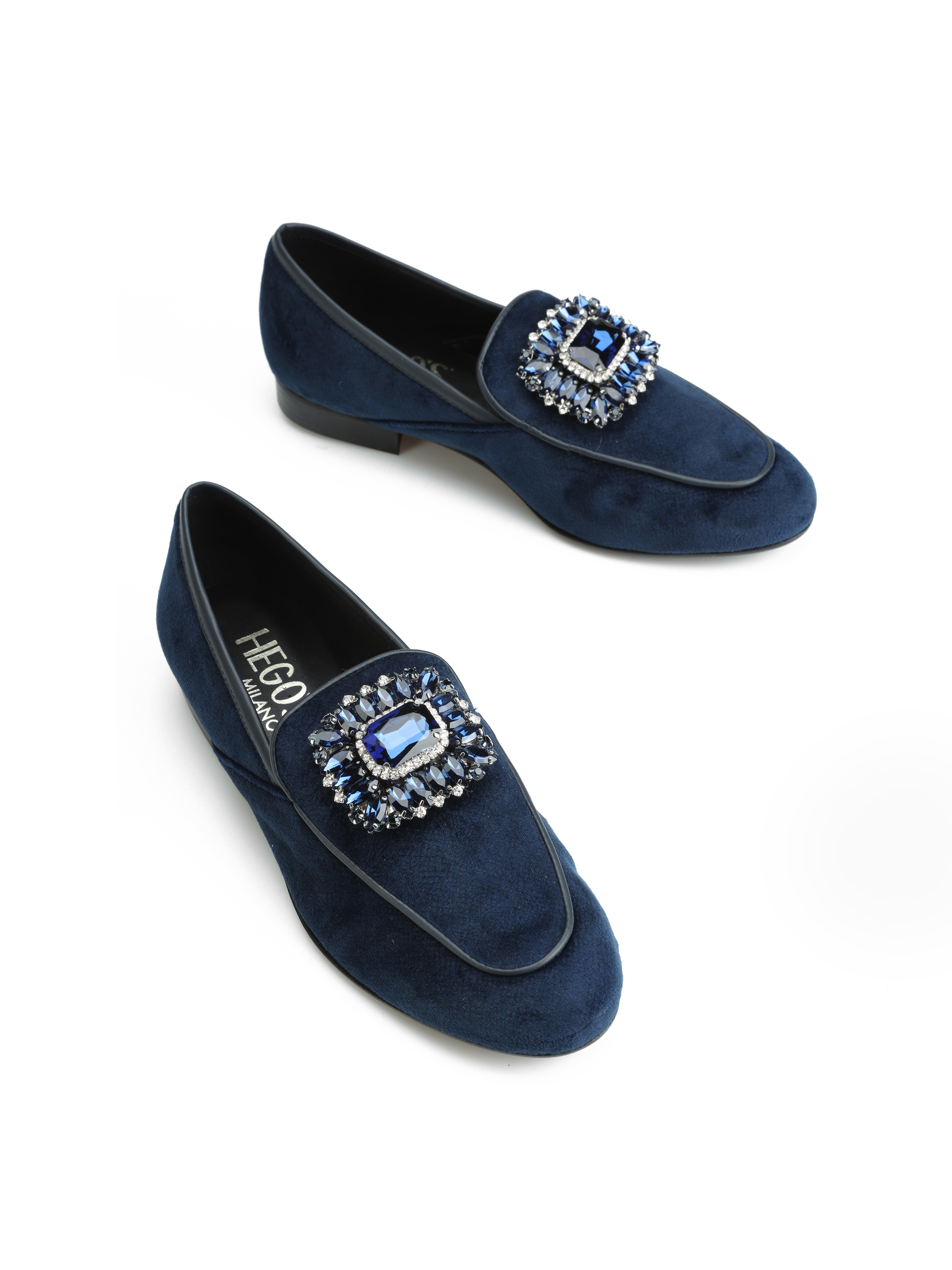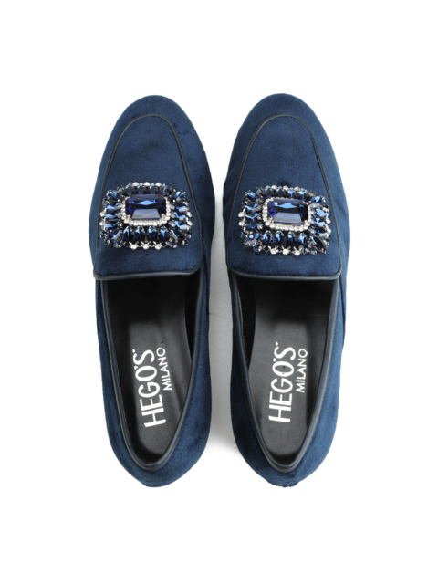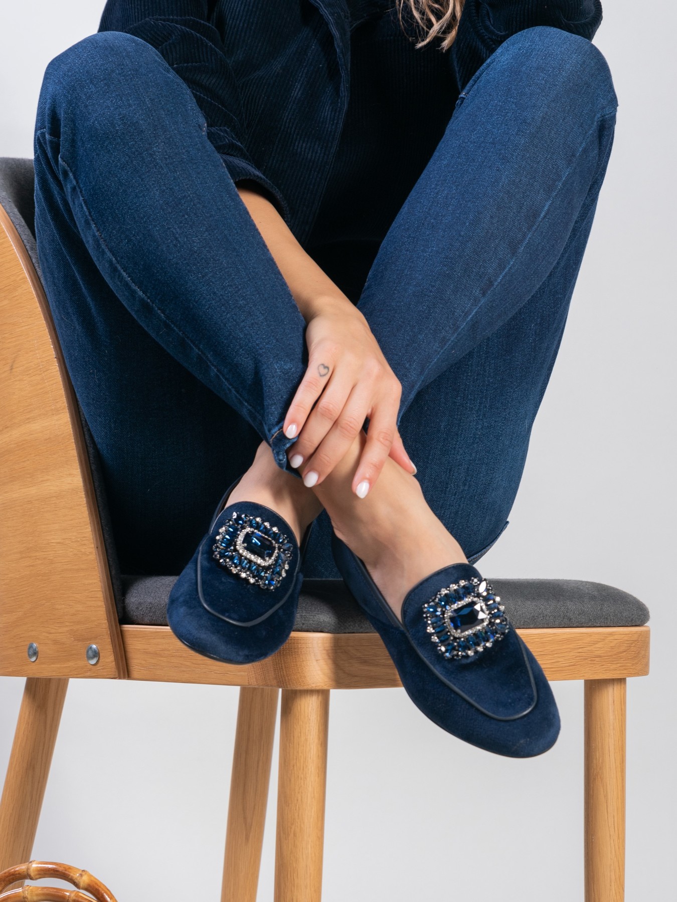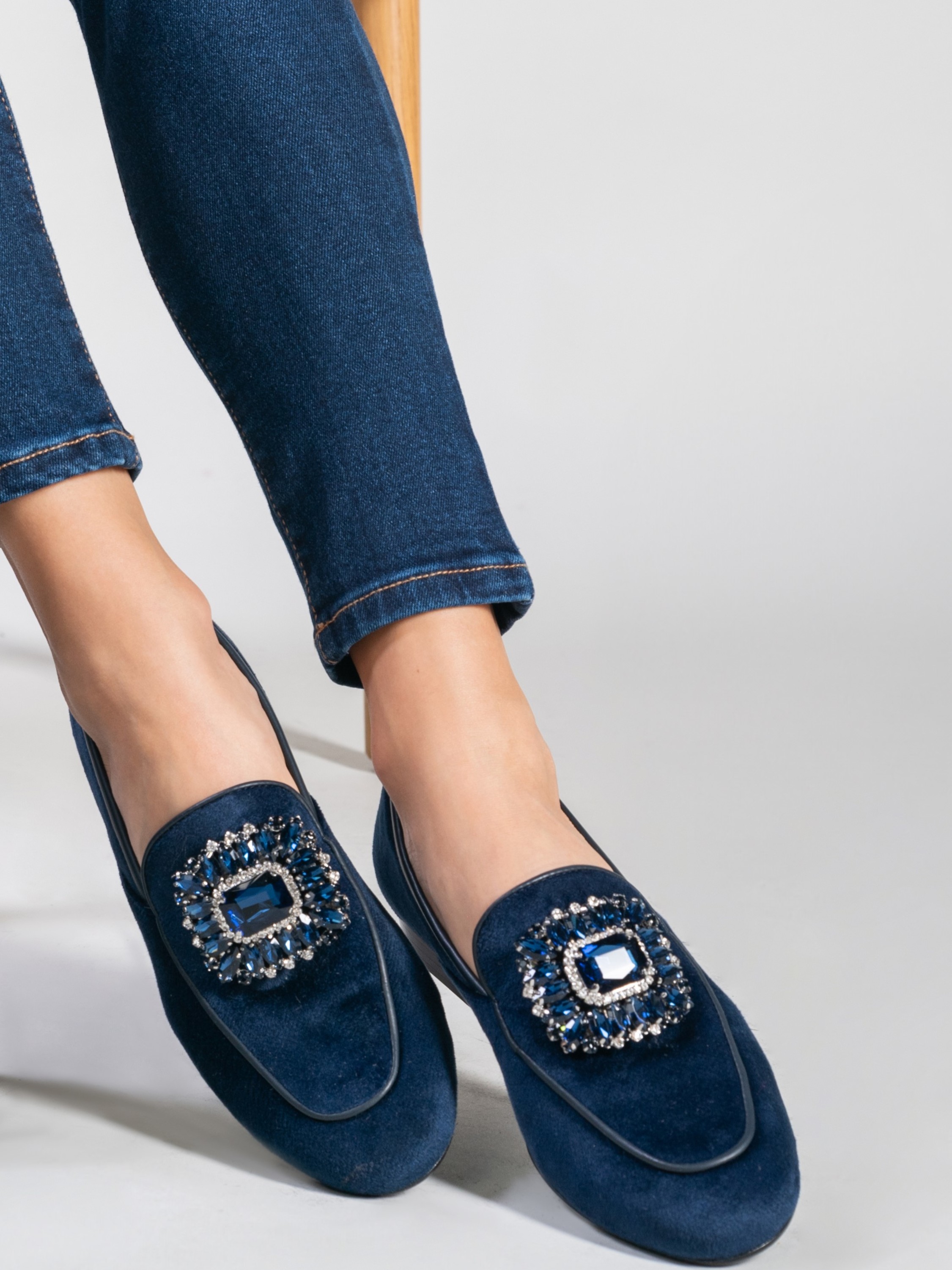 Mokasyny na płaskim obcasie to model, który nigdy nie wychodzi z mody. Miękkie i wygodne. Welurowa cholewka wzbogacona została o biżuteryjną broszkę z kamieni oraz lamówkę w tym samym kolorze. Klasyczny fason w kolorze granatu to prawdziwy Italian Chic.