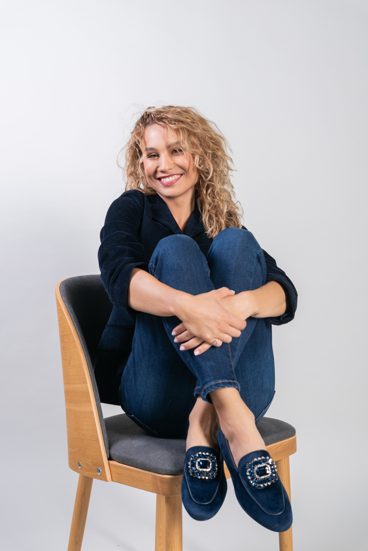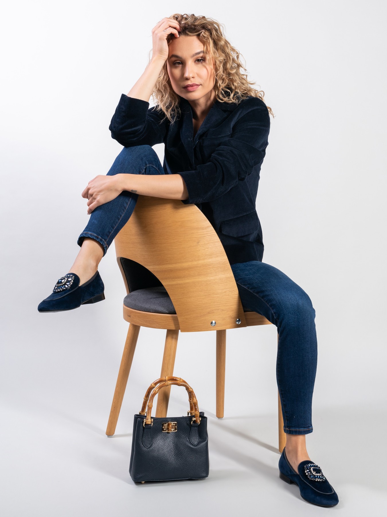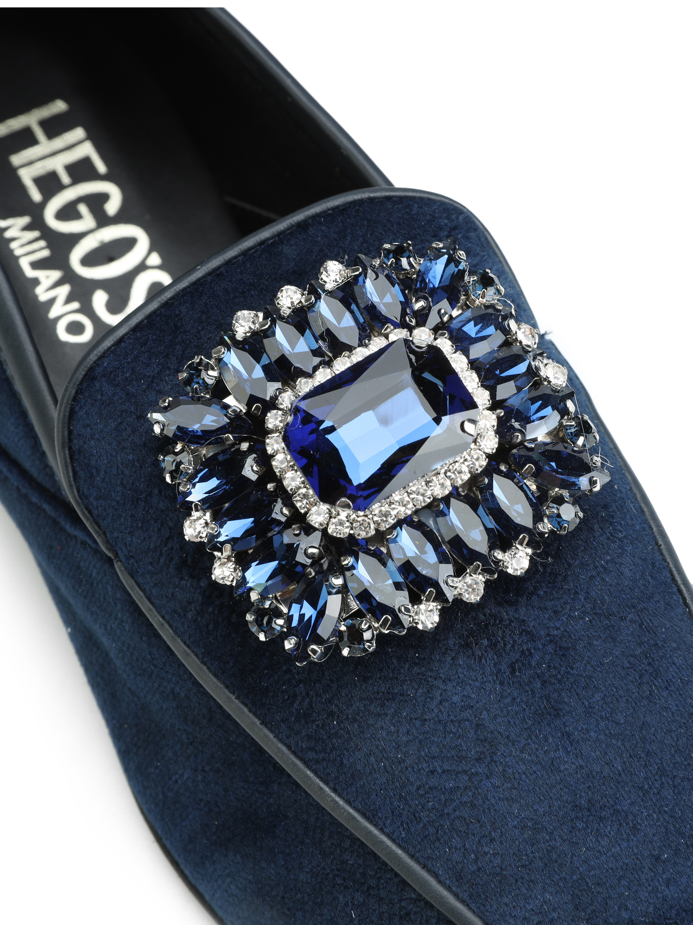 Mokasyny na płaskim obcasie to model, który nigdy nie wychodzi z mody. Miękkie i wygodne. Welurowa cholewka wzbogacona została o biżuteryjną broszkę z kamieni oraz lamówkę w tym samym kolorze. Klasyczny fason w kolorze granatu to prawdziwy Italian Chic.