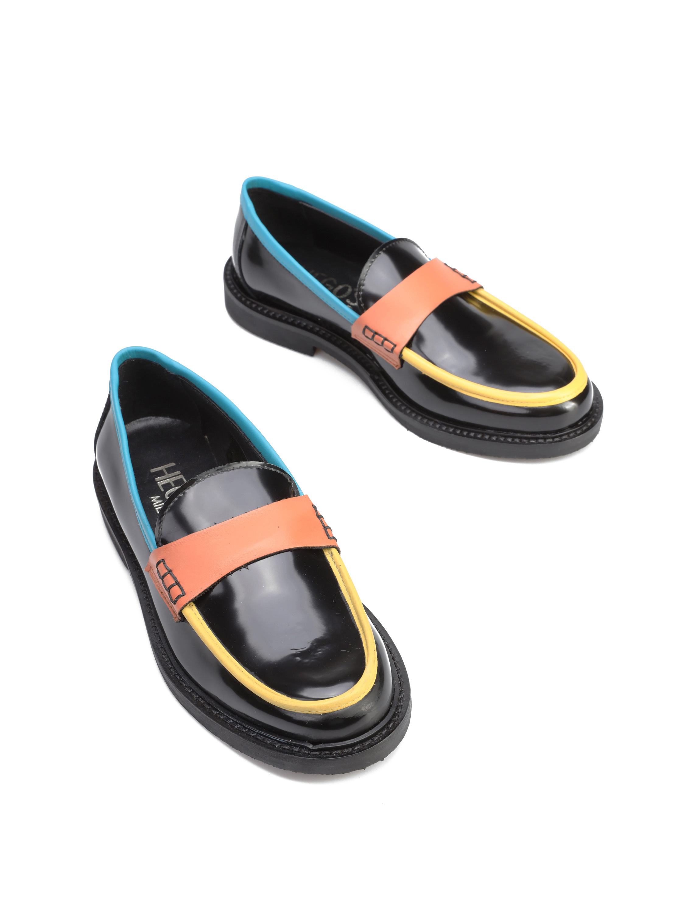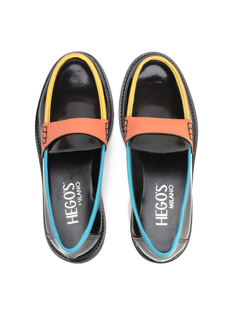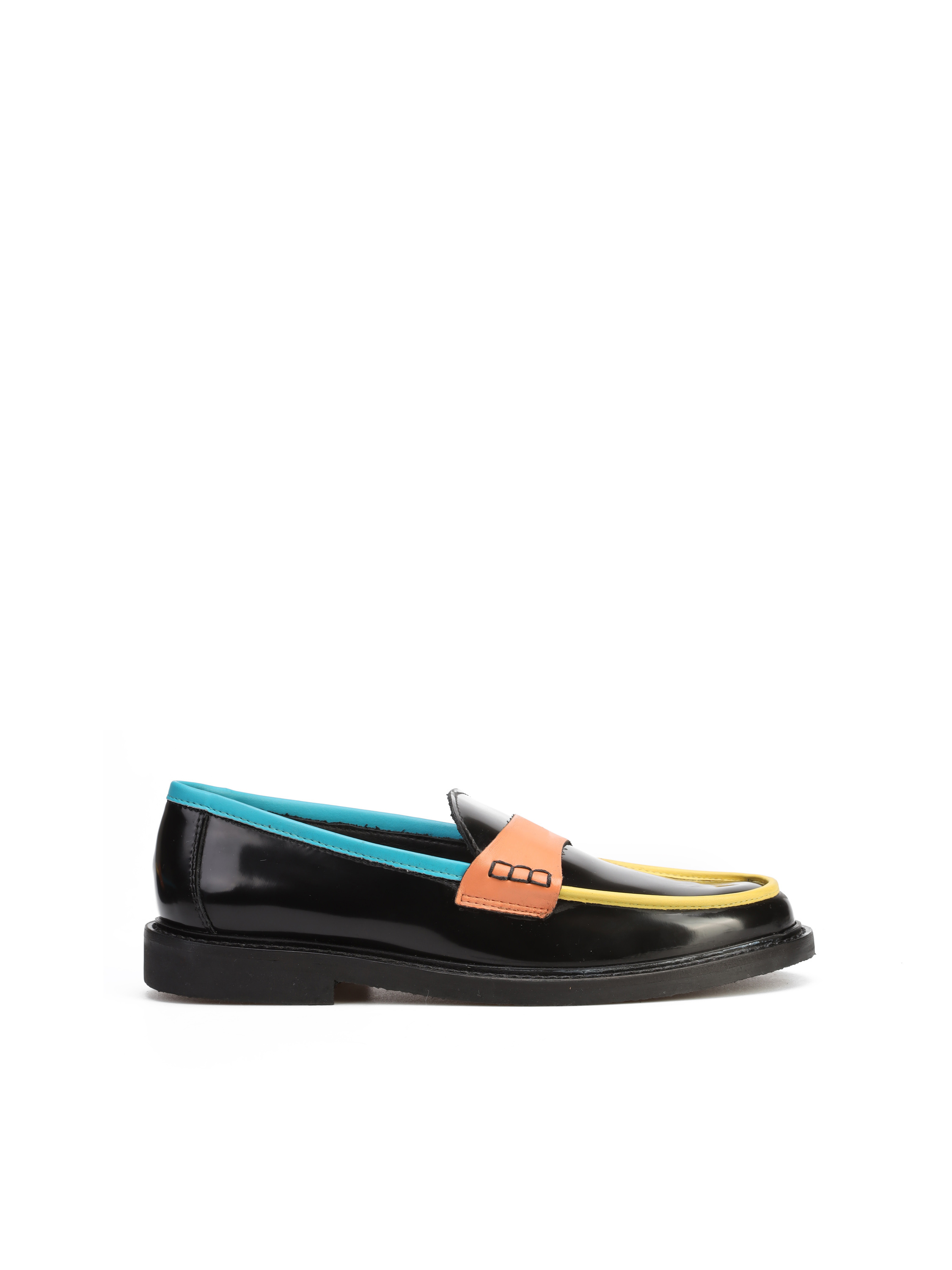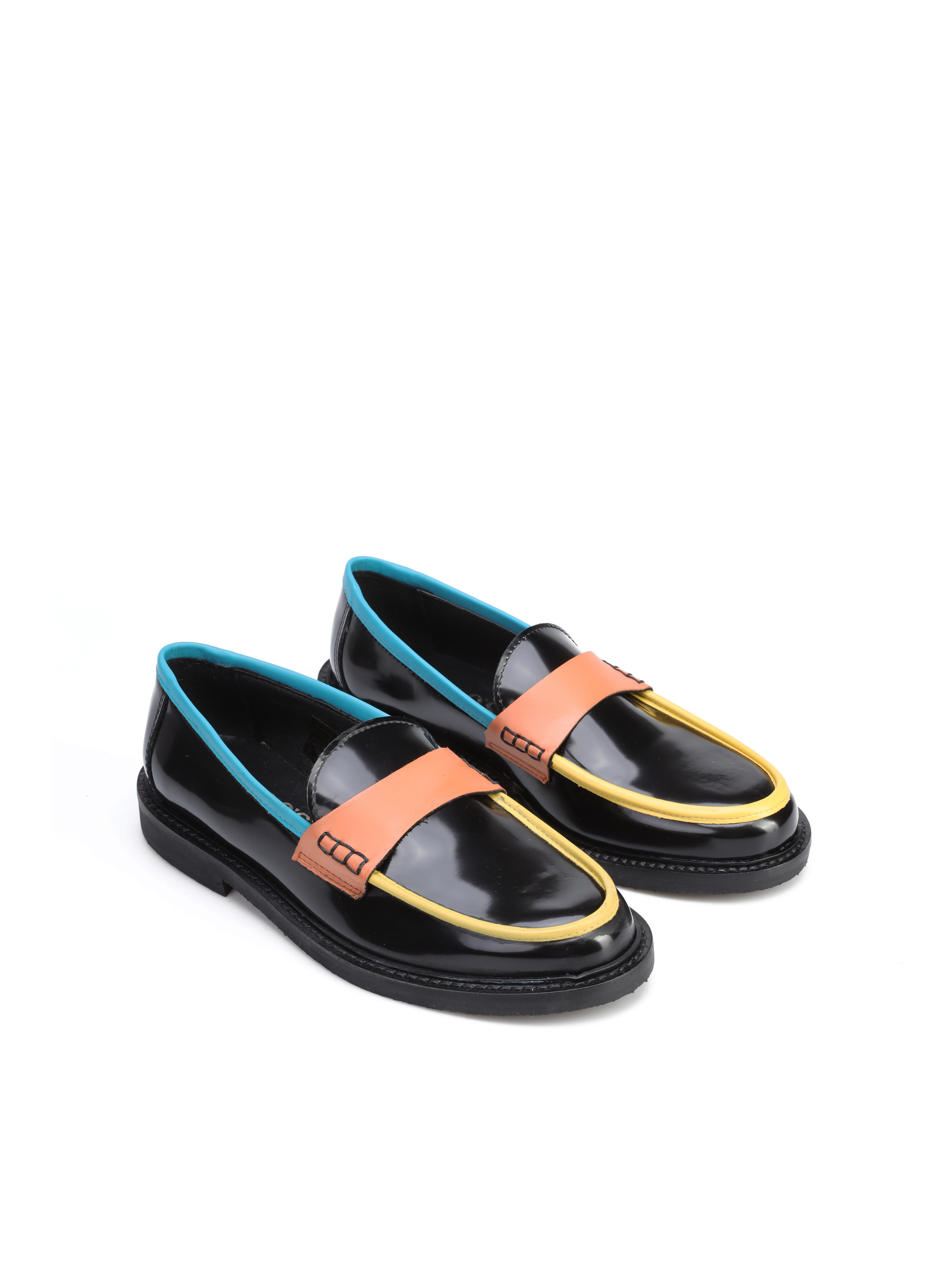 Mokasyny na płaskim obcasie to must have kobiecej garderoby. Wykonane są z włoskiej, naturalnej skóry. Fason w stylu lordsy posiada wysoki język, charakterystyczny dla tego modelu. Modne połączenie kolorystyczne to detal, który je wyróżnia.