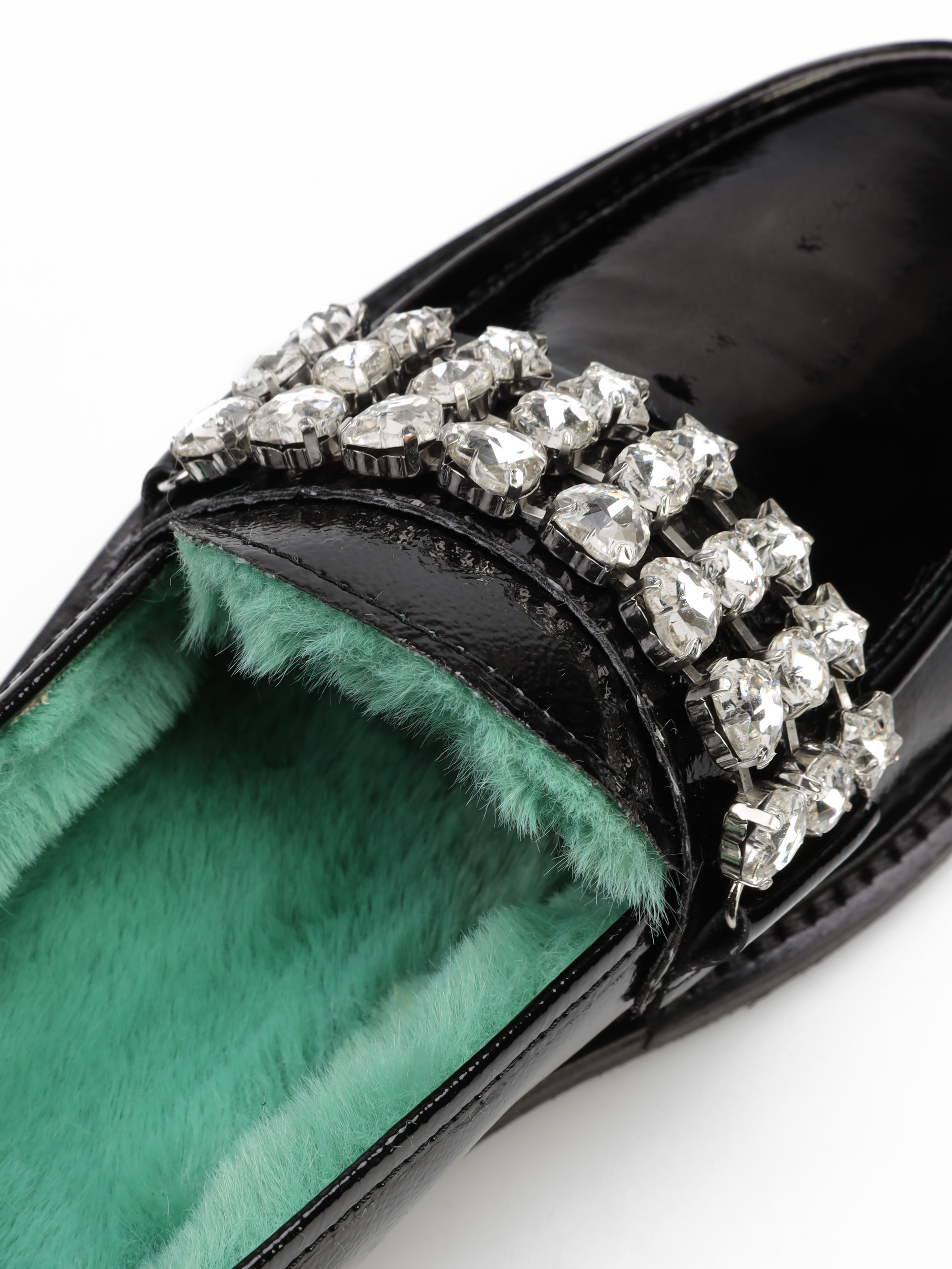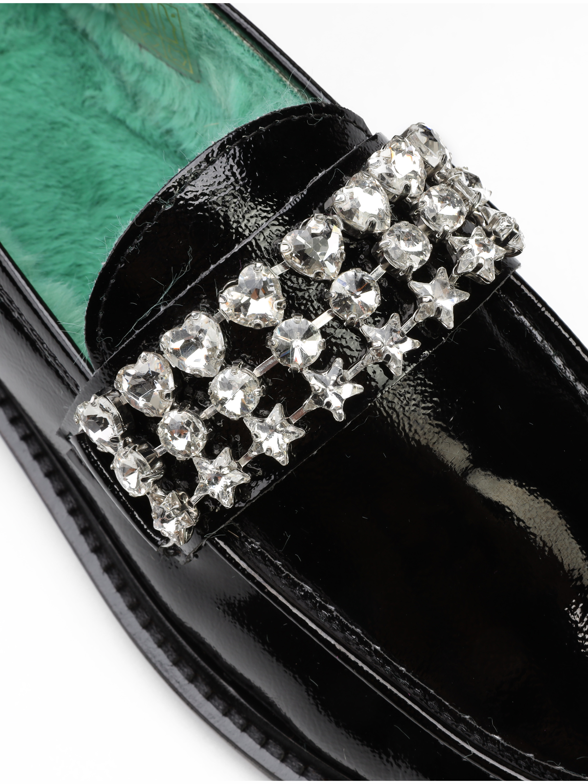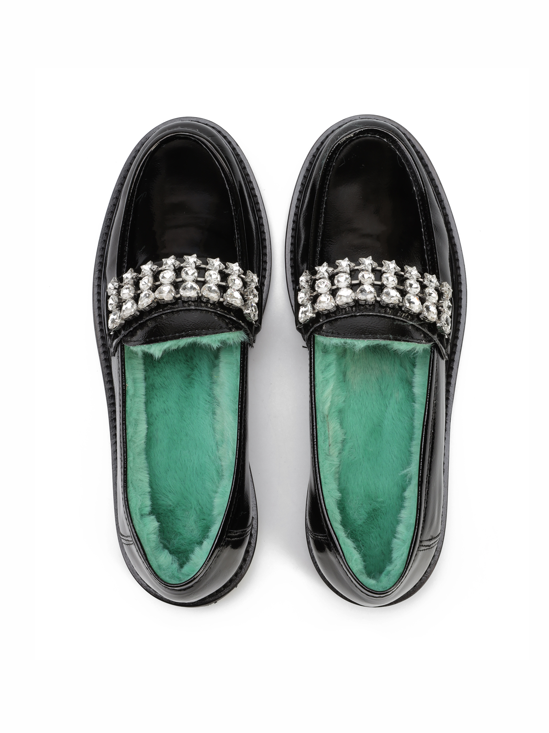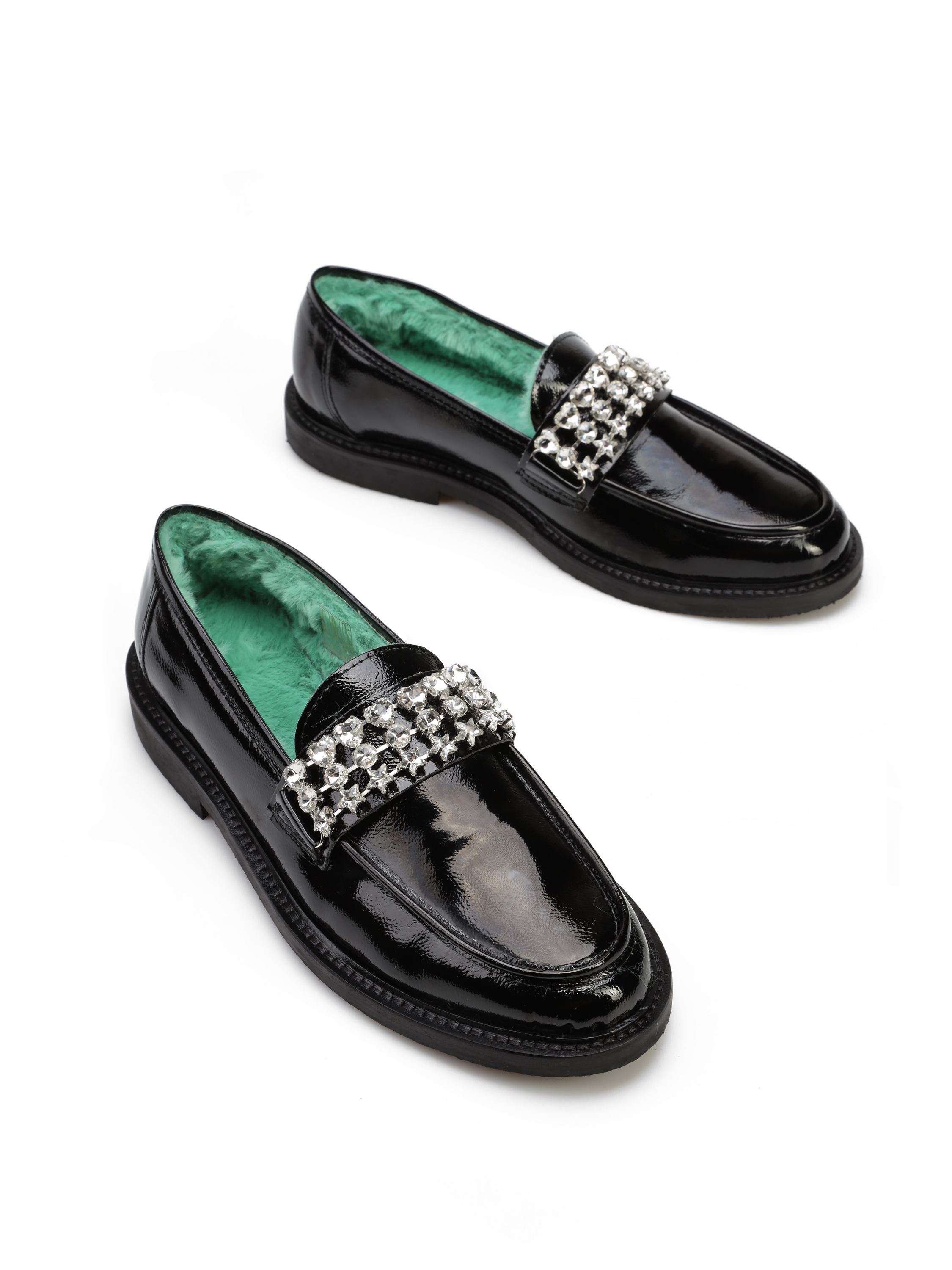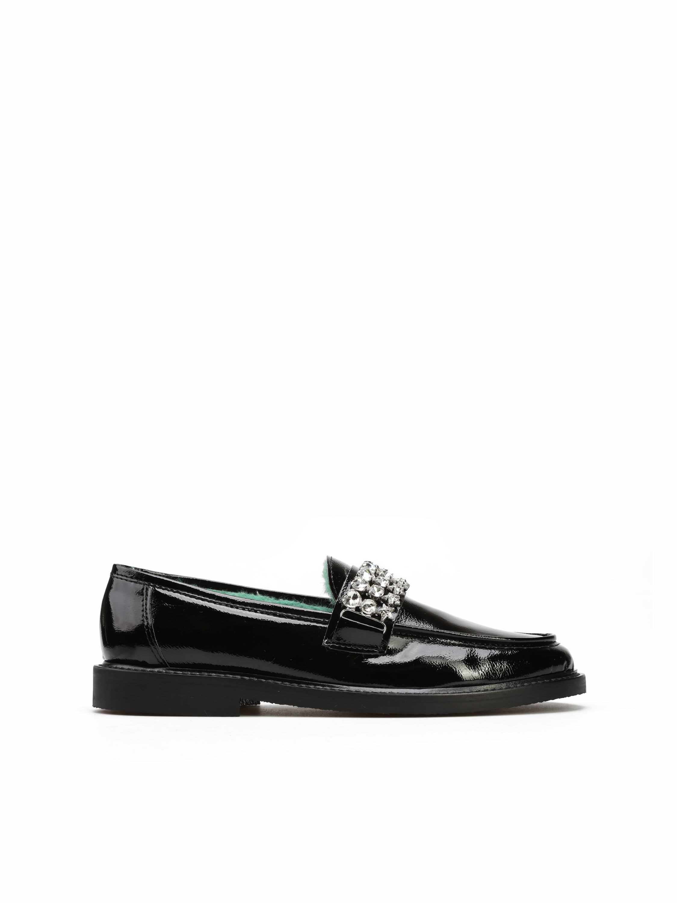 Mokasyny z okrągłym noskiem wykonane zostały z lakierowanej, włoskiej skóry. Model w klasycznym, czarnym kolorze. Cholewka uzupełniona została stylową klamrą z kamieni. Wnętrze zaprojektowane z syntetycznego futra w modowym odcieniu, odpowiada za wygodę i komfort. Model z urodzinowej kolekcji.