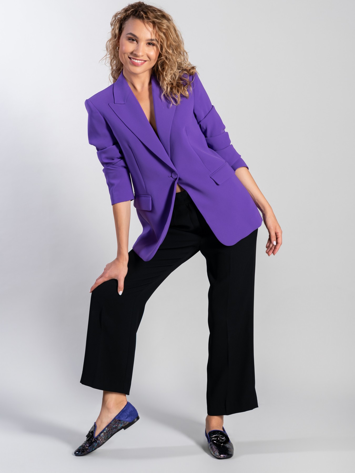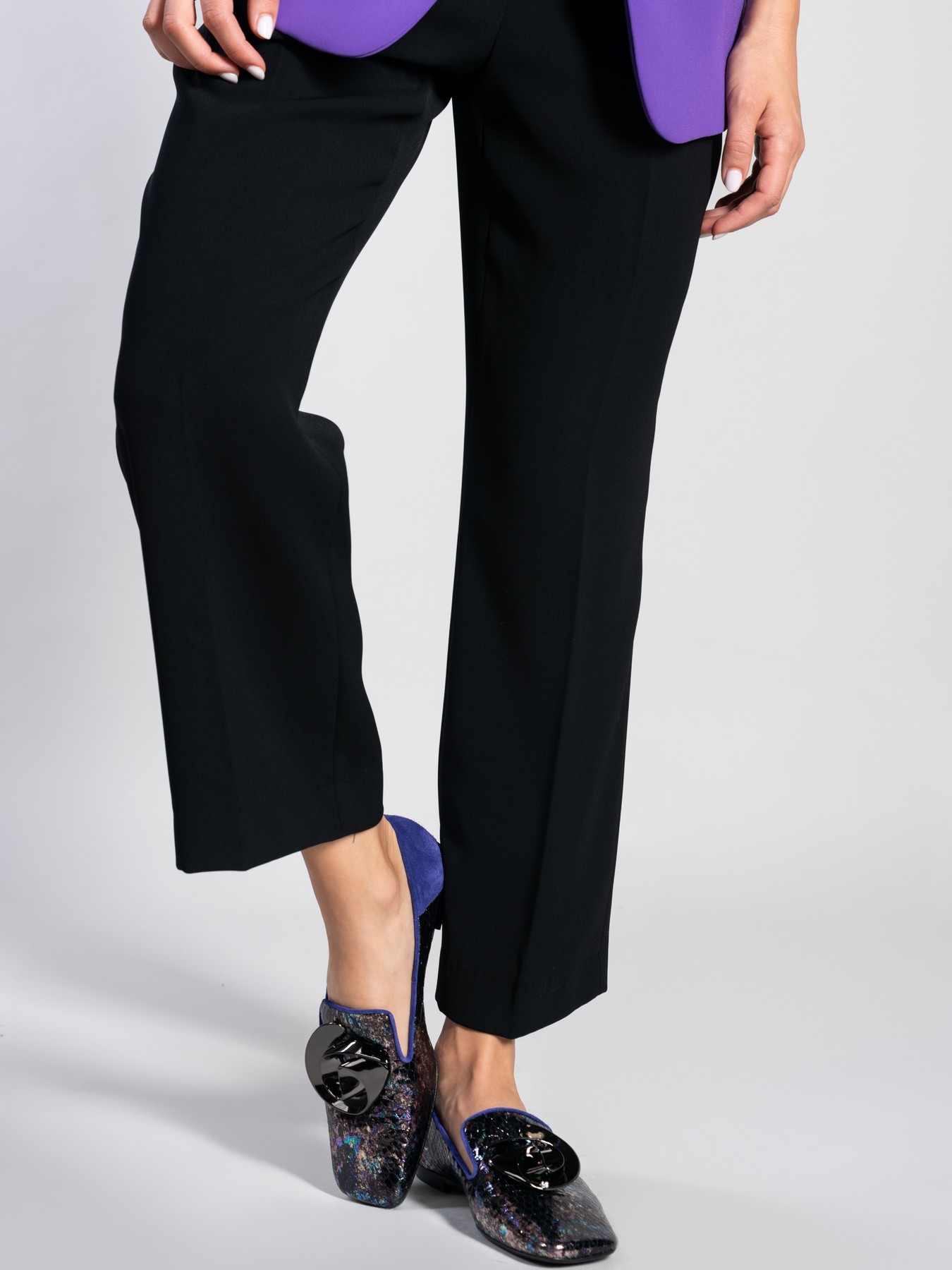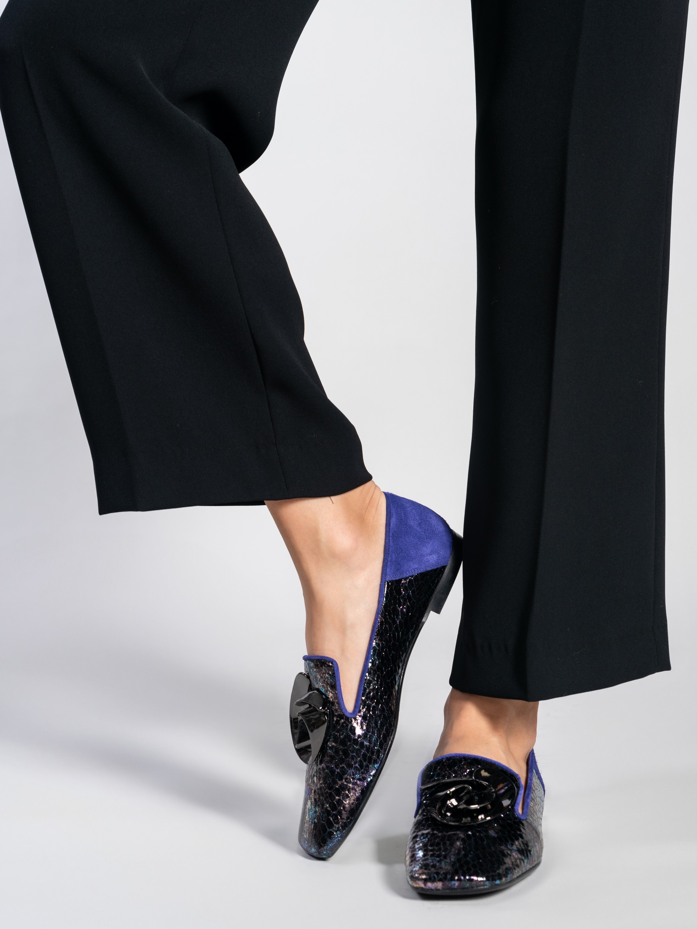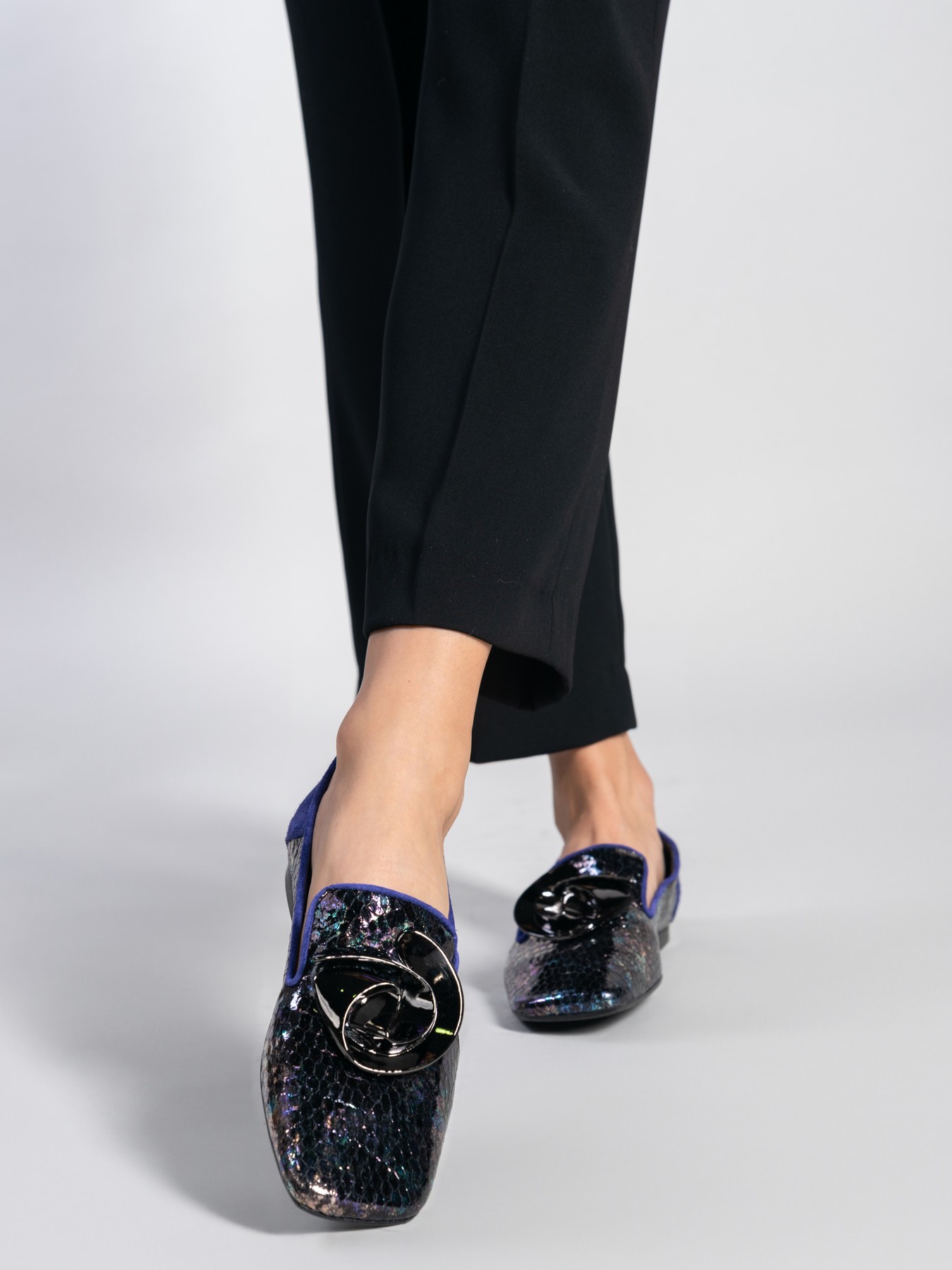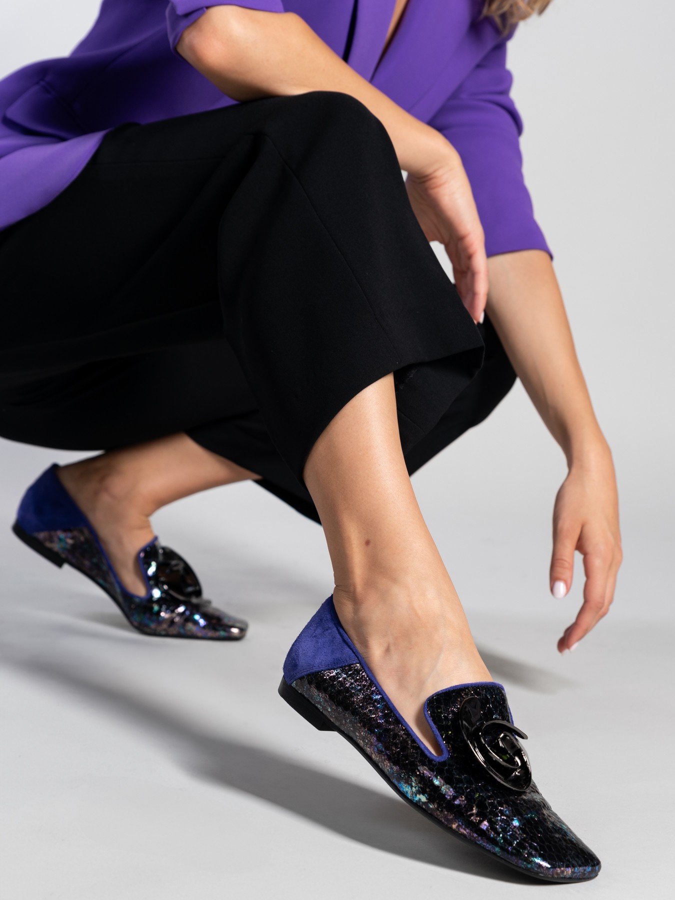 Mokasyny na płaskim obcasie wykonane z metalizowanej oraz zamszowej skóry. Fason w stylu lordsy posiada wysoki język charakterystyczny dla tego modelu. Cholewka w stylowym odcieniu fioletu ozdobiona została czarną broszką.