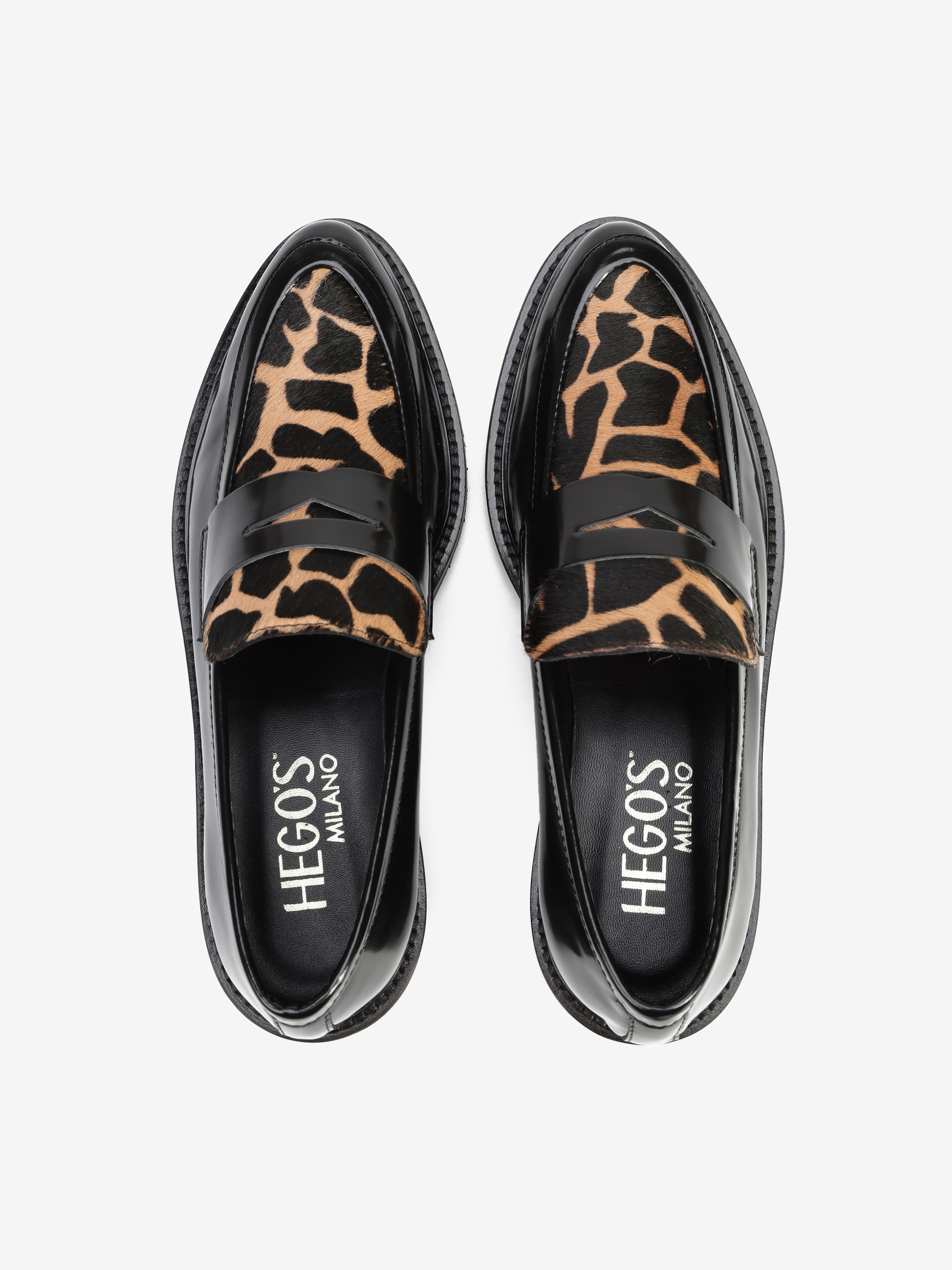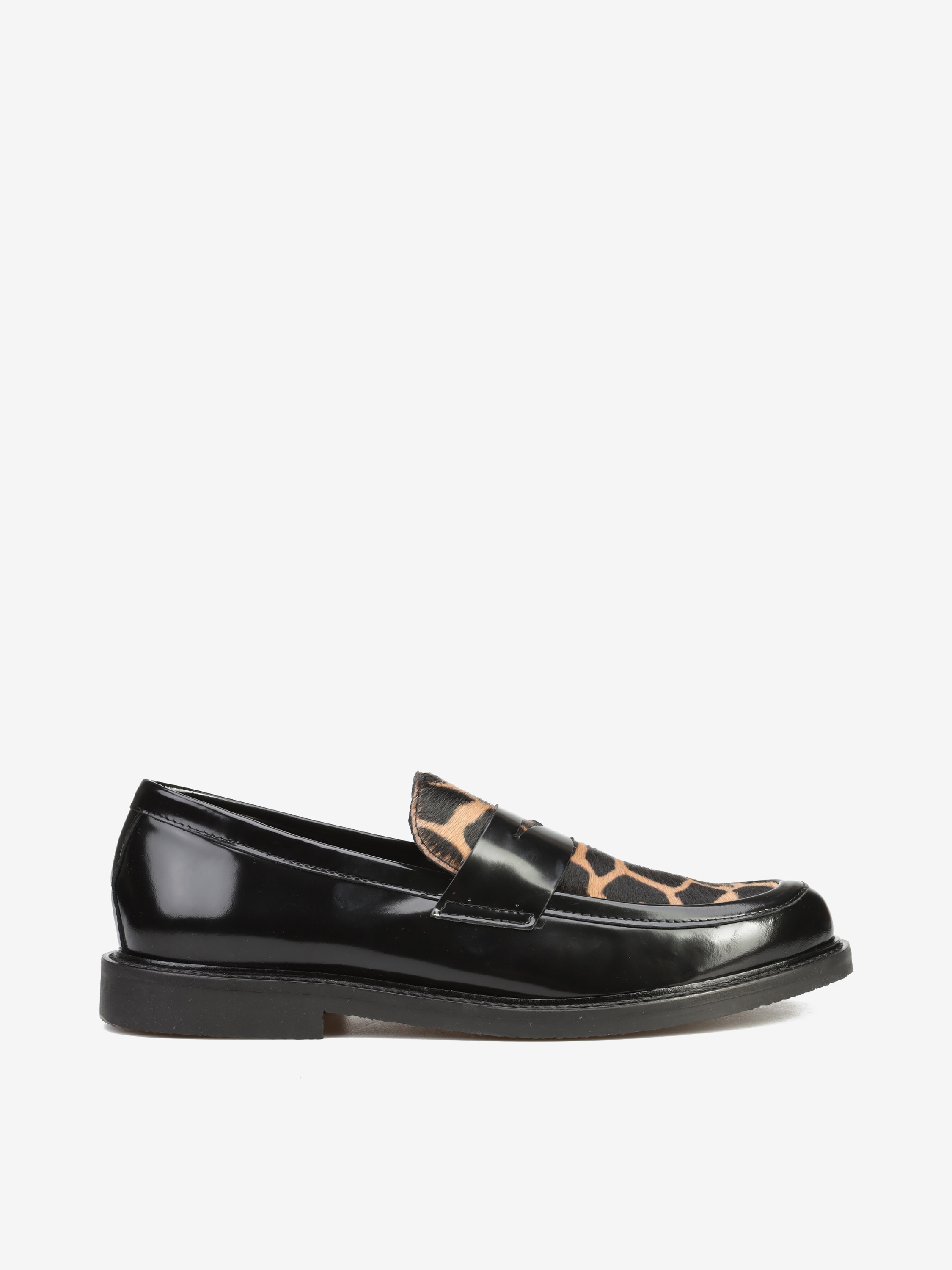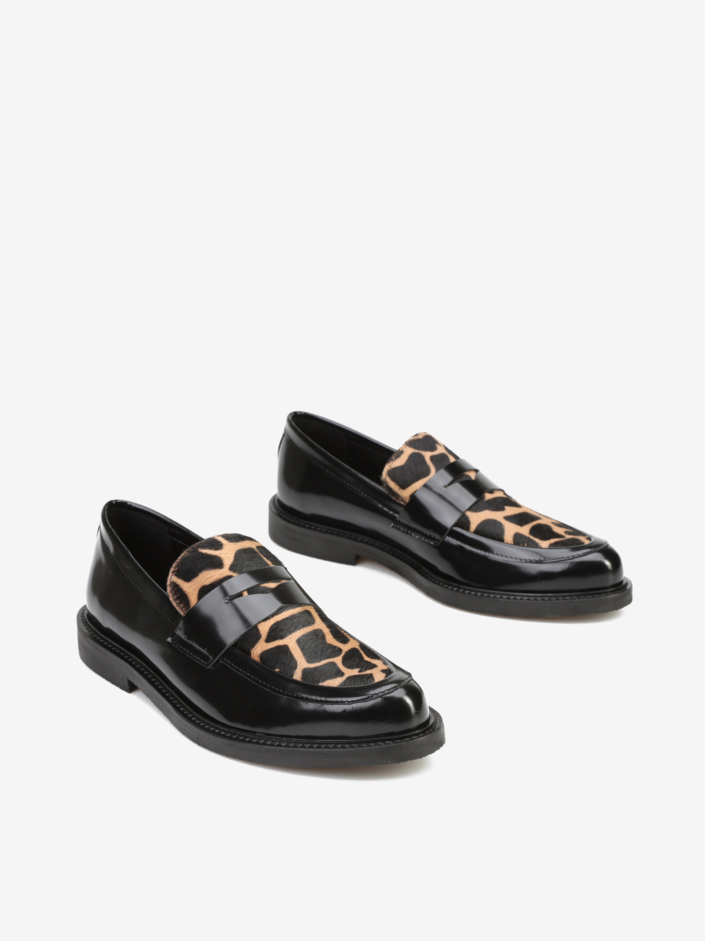 Mokasyny na płaskim obcasie to must have kobiecej garderoby. Wykonane są z włoskiej, naturalnej skóry.  Fason w stylu lordsy posiada wysoki język, charakterystyczny dla tego modelu. Cholewka w czarnym kolorze połączona została z modnym, zwierzęcym printem.