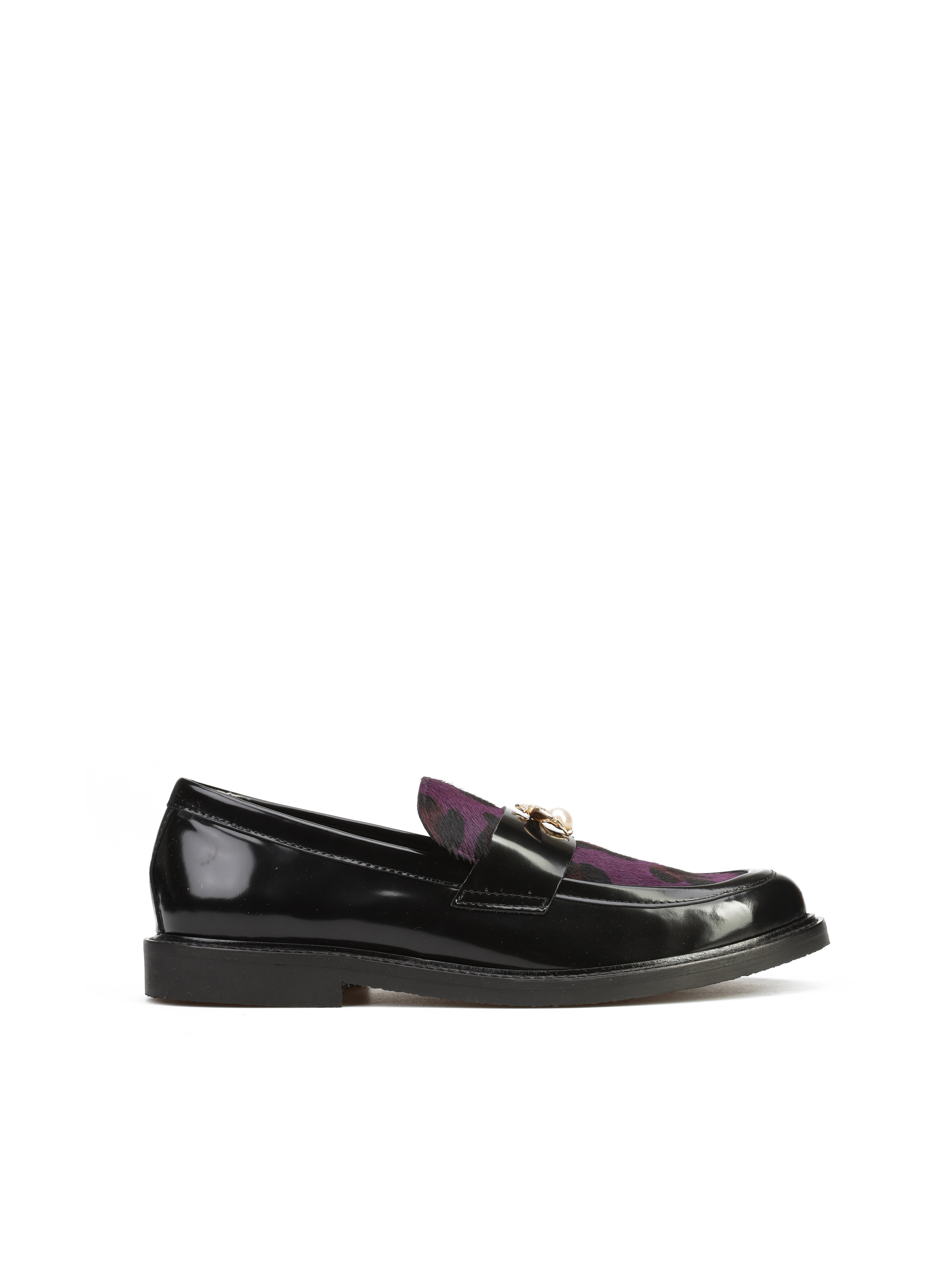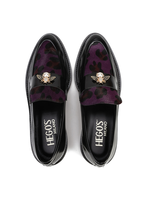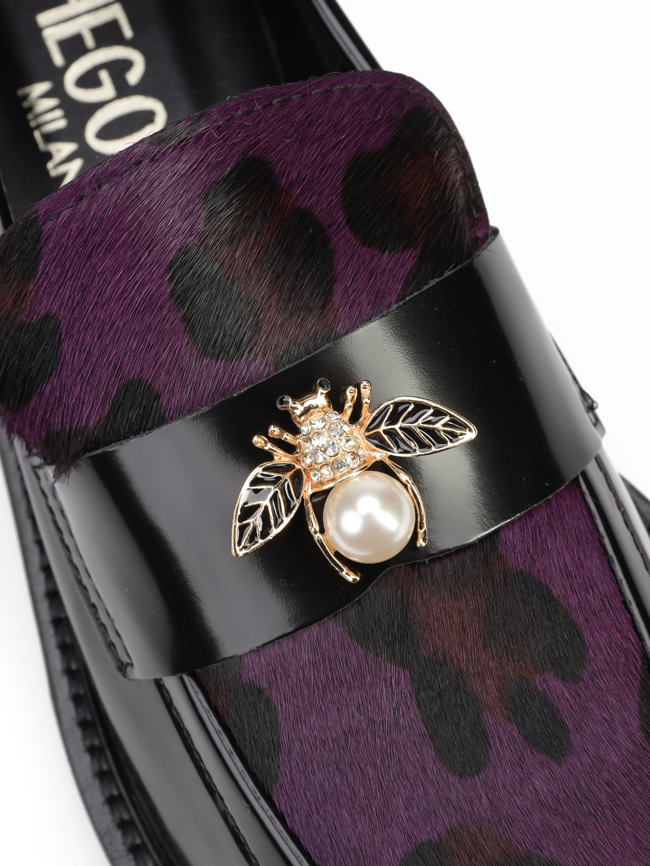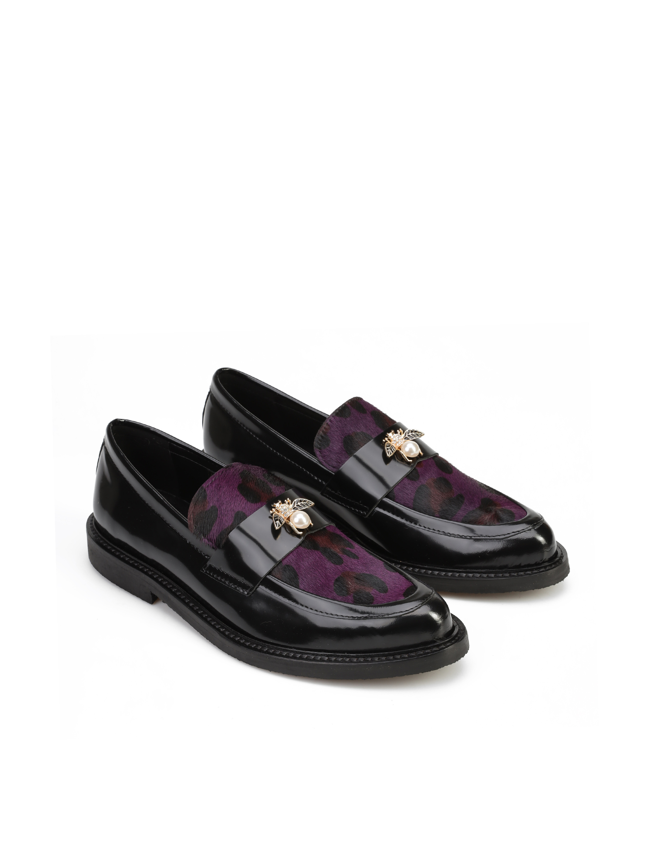 Mokasyny na płaskim obcasie to must have kobiecej garderoby. Wykonane są z włoskiej, naturalnej skóry. Fason w stylu lordsy posiada wysoki język, charakterystyczny dla tego modelu. Cholewka z modnym, zwierzęcym printem uzupełniona została autorską broszką z pszczółką.