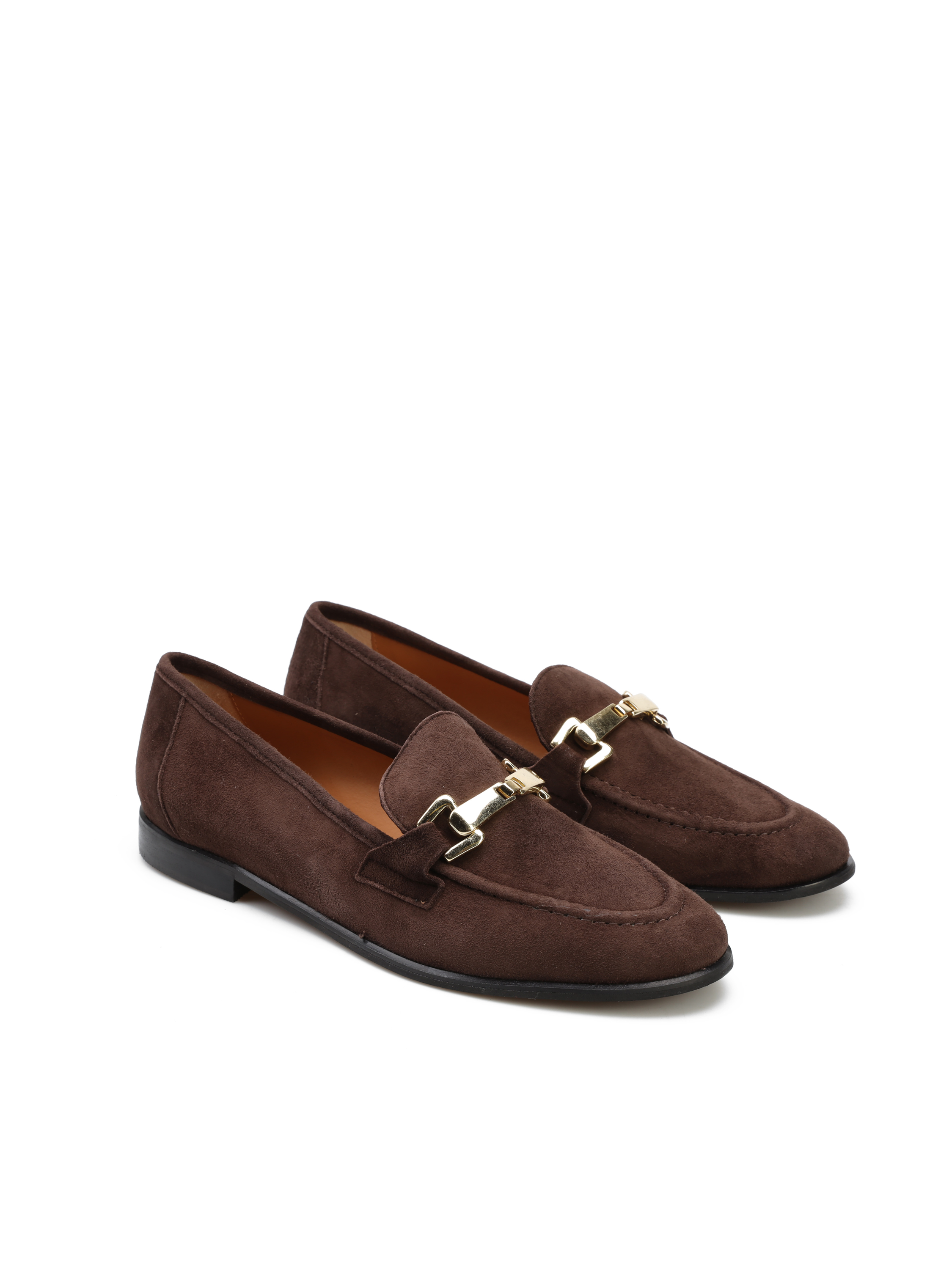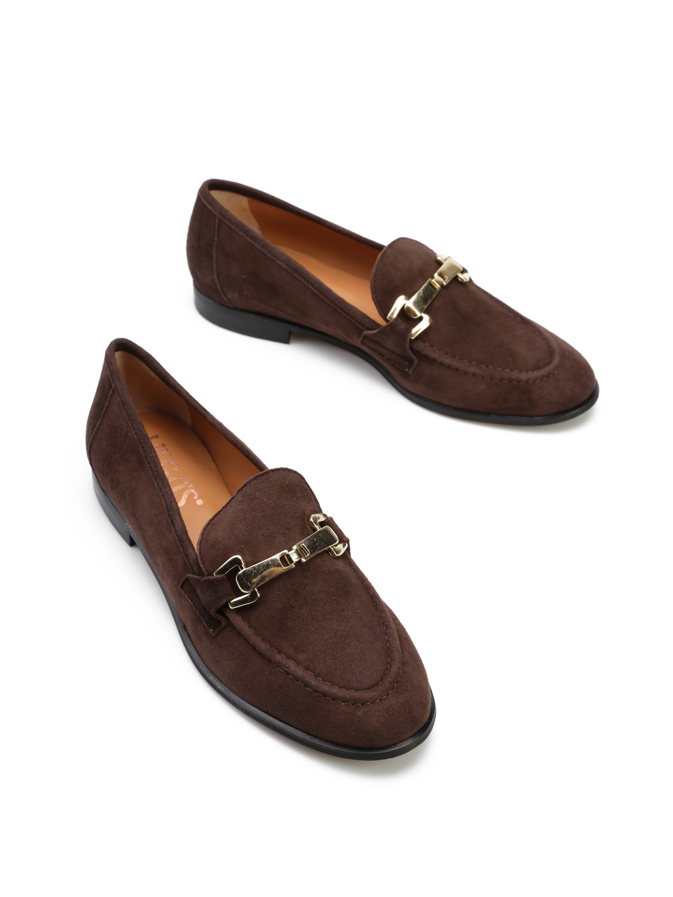 Mokasyny na płaskim obcasie to must have kobiecej garderoby. Wykonane są z naturalnej skóry zamszowej. Cholewka w brązowym kolorze ozdobiona została złotą klamrą. Model z wyższym językiem w stylu lordsy.