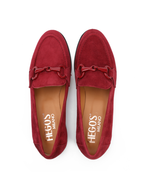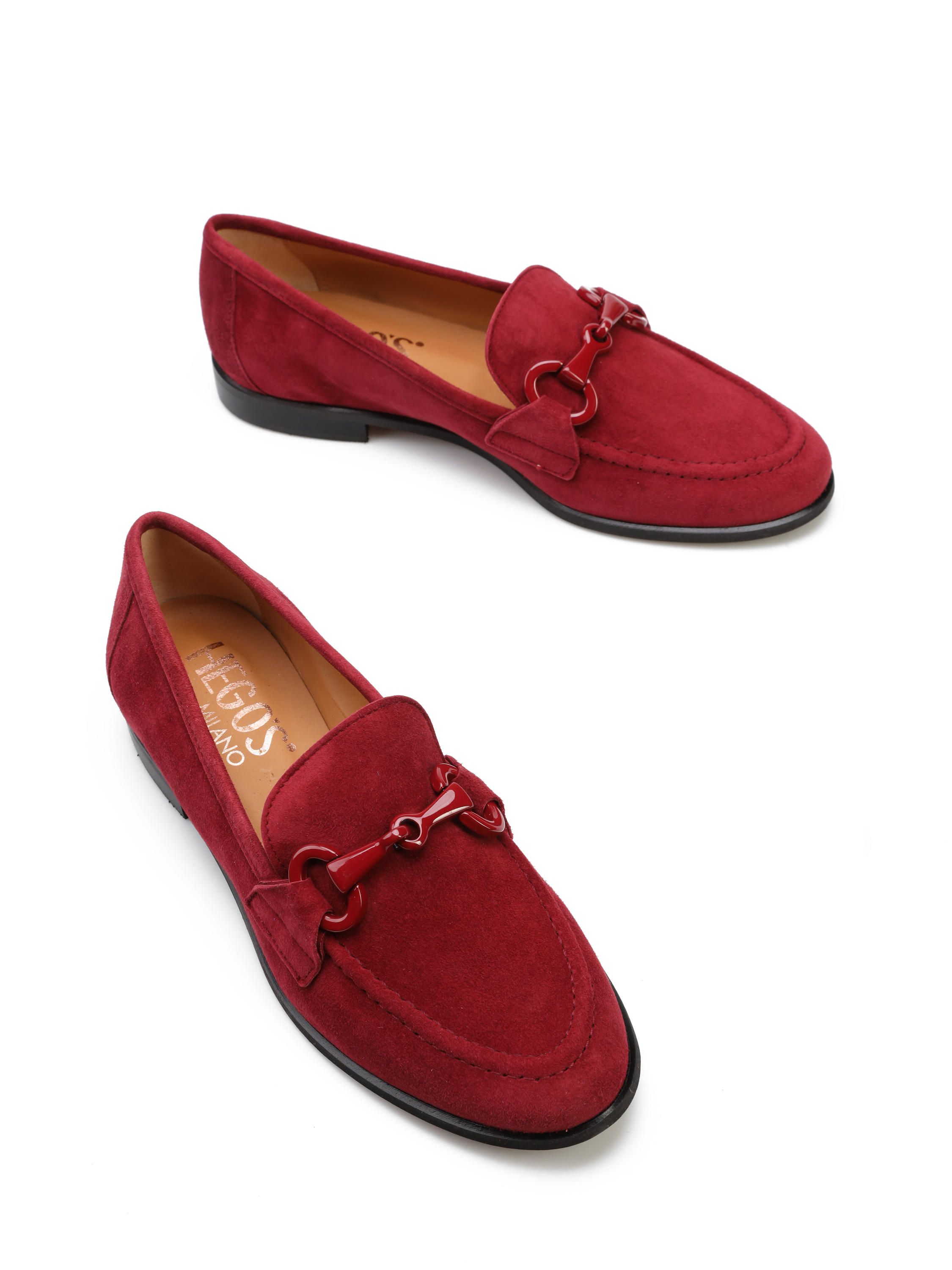 Mokasyny na płaskim obcasie to must have kobiecej garderoby. Wykonane są z naturalnej skóry zamszowej. Cholewka w bordowym kolorze ozdobiona została klamrą. Model z wyższym językiem w stylu lordsy.