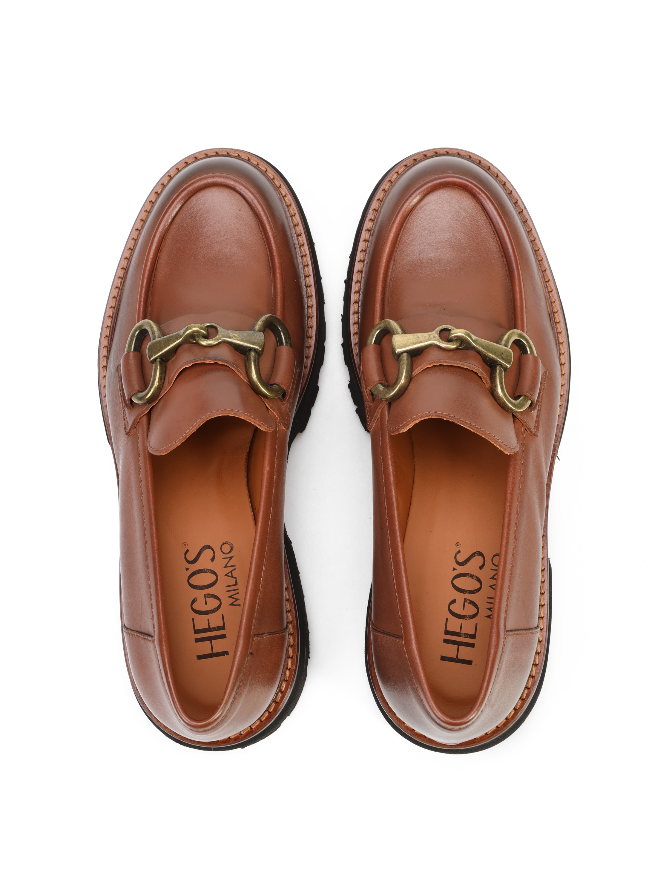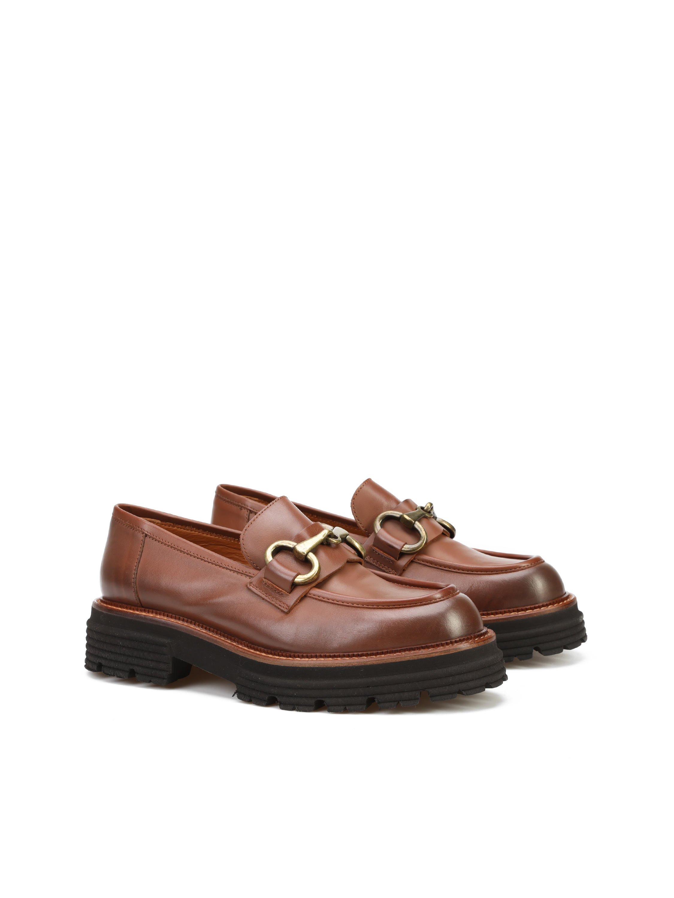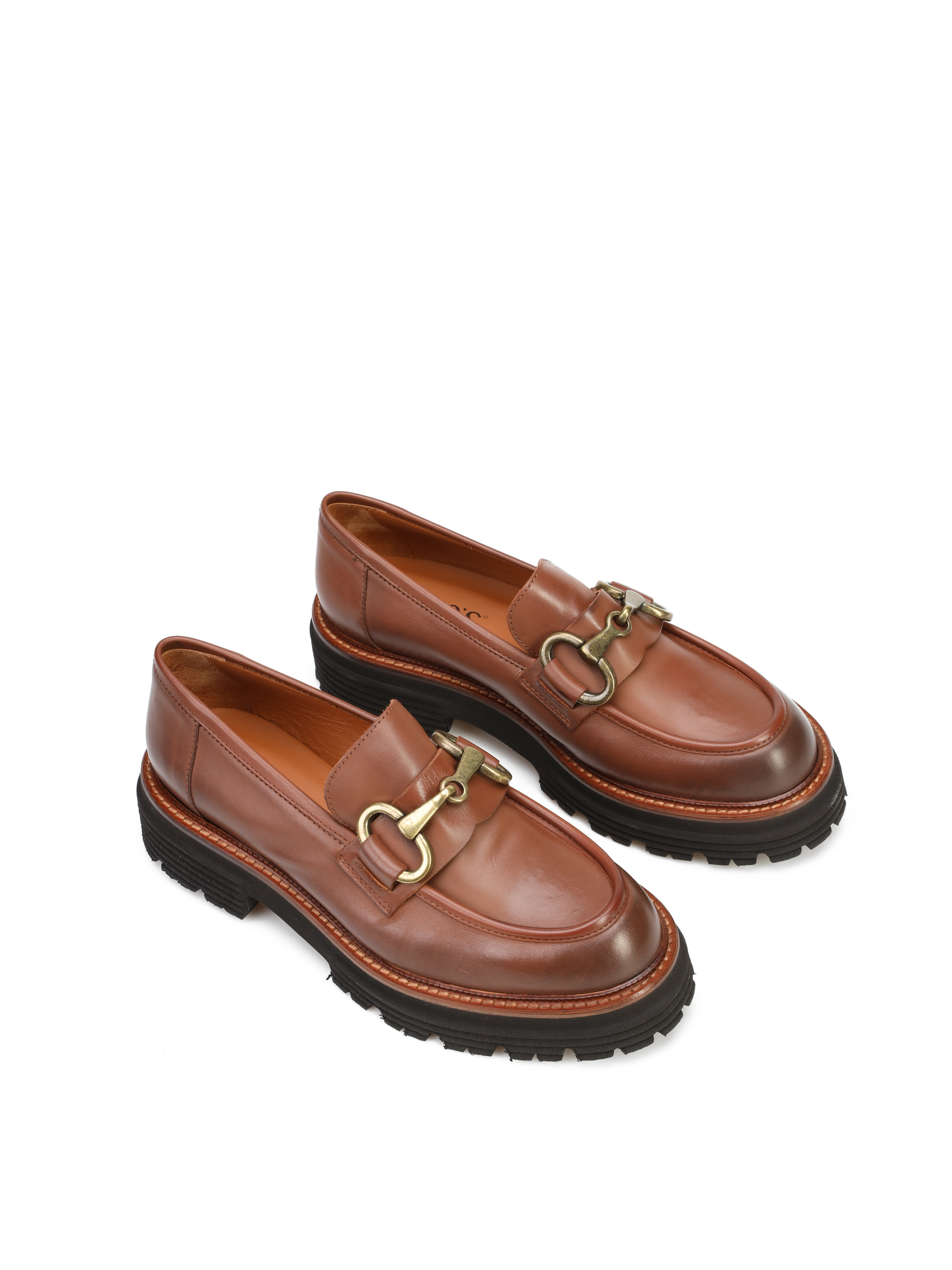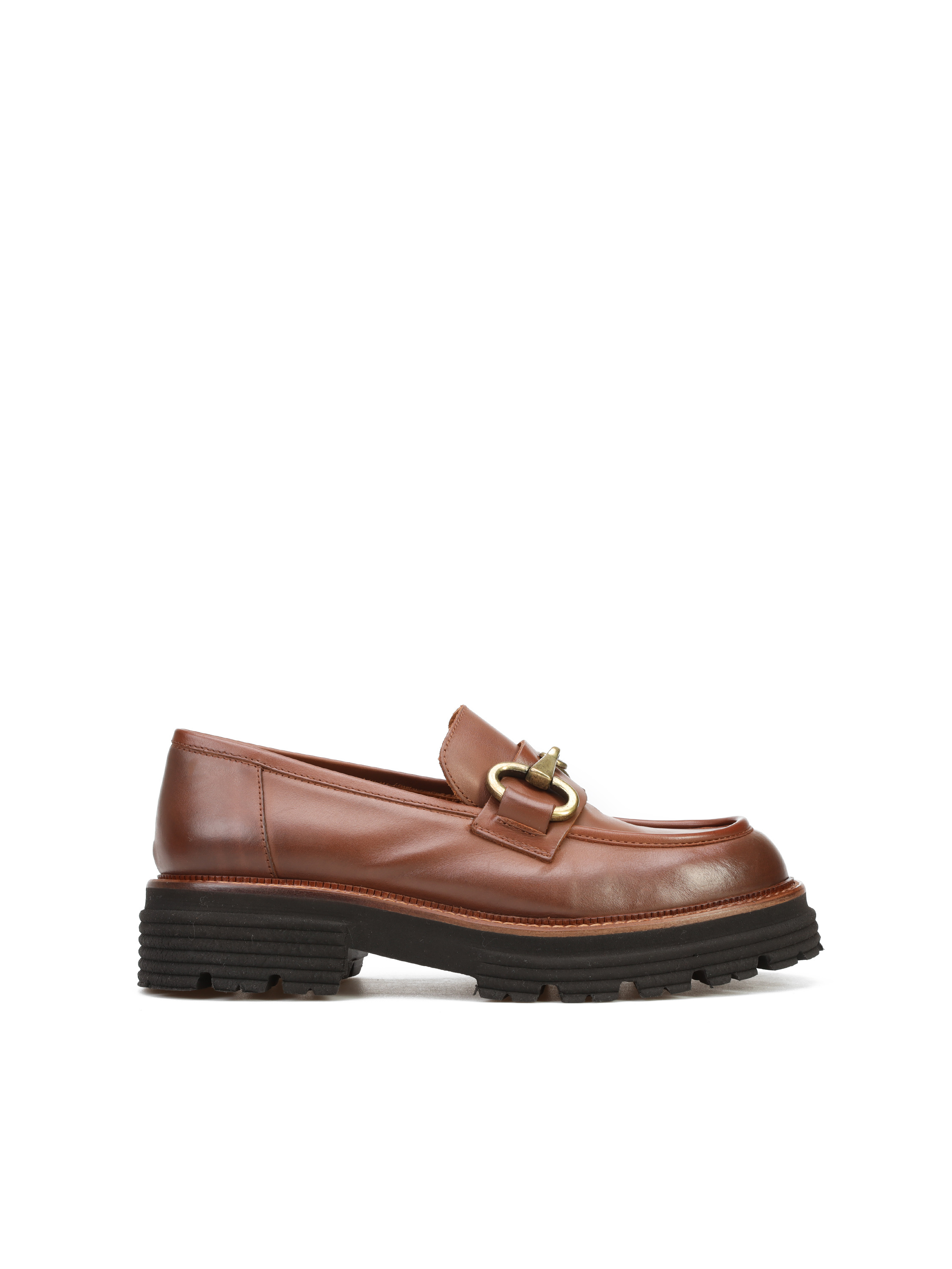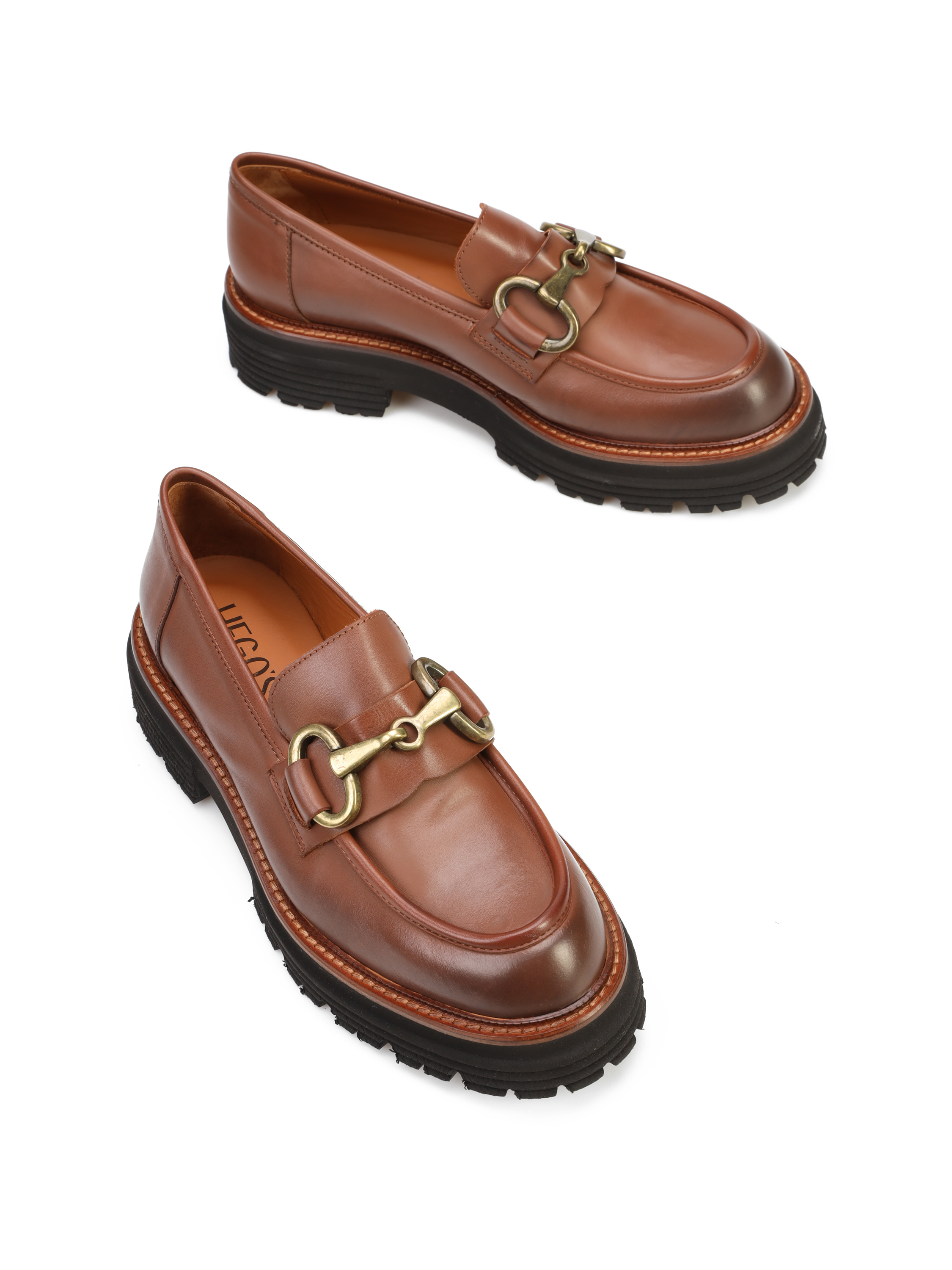 Mokasyny na grubej podeszwie to gorący Trend sezonu. Cholewka w rudym kolorze wykonana jest z naturalnej skóry. Ozdobiona została metalowym, złotym wędzidłem. Fason w stylu loafersy, posiada charakterystyczny wysoki język. Masywna, lecz bardzo lekka podeszwa zapewni komfort podczas użytkowania obuwia.