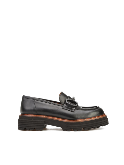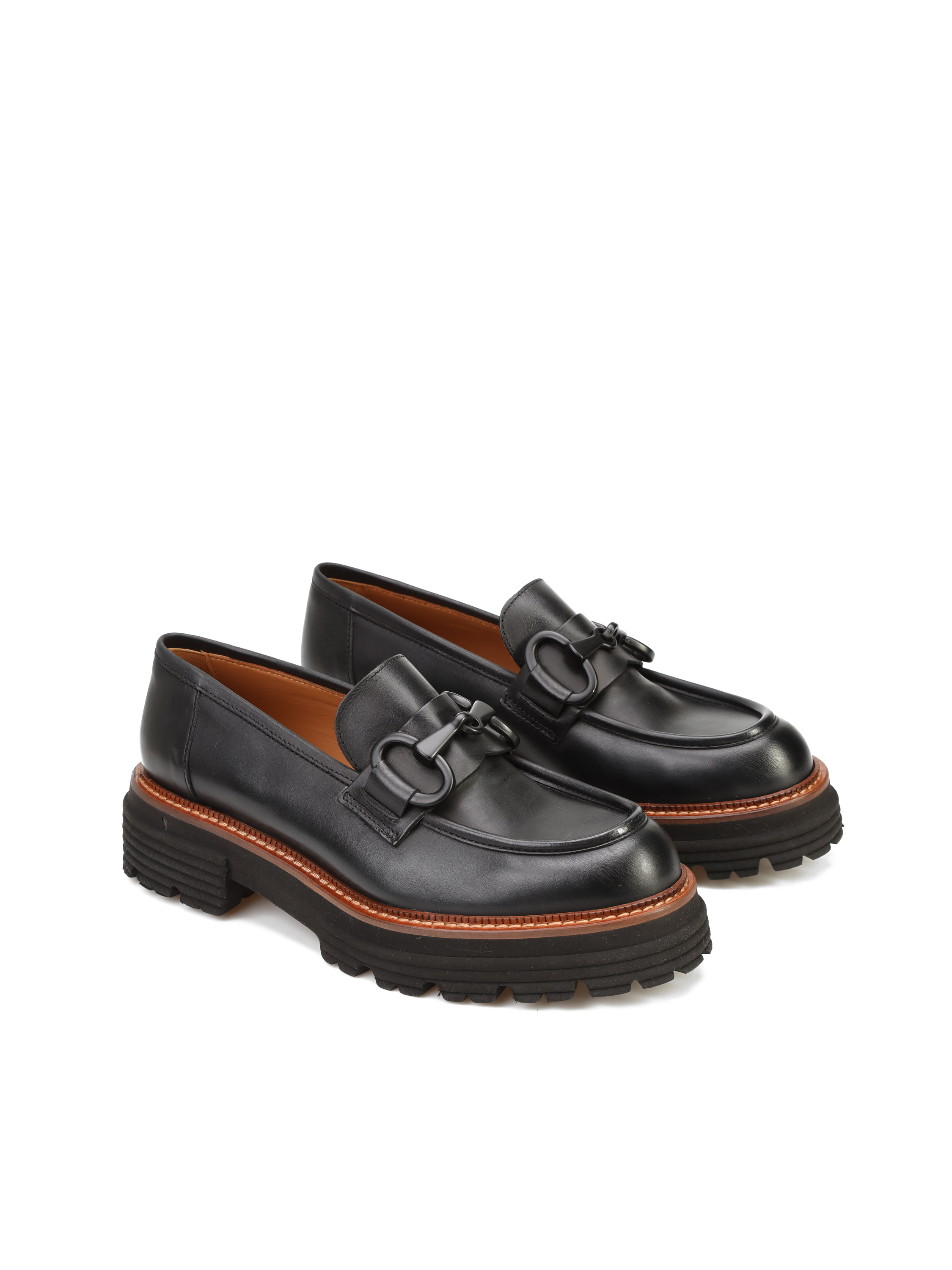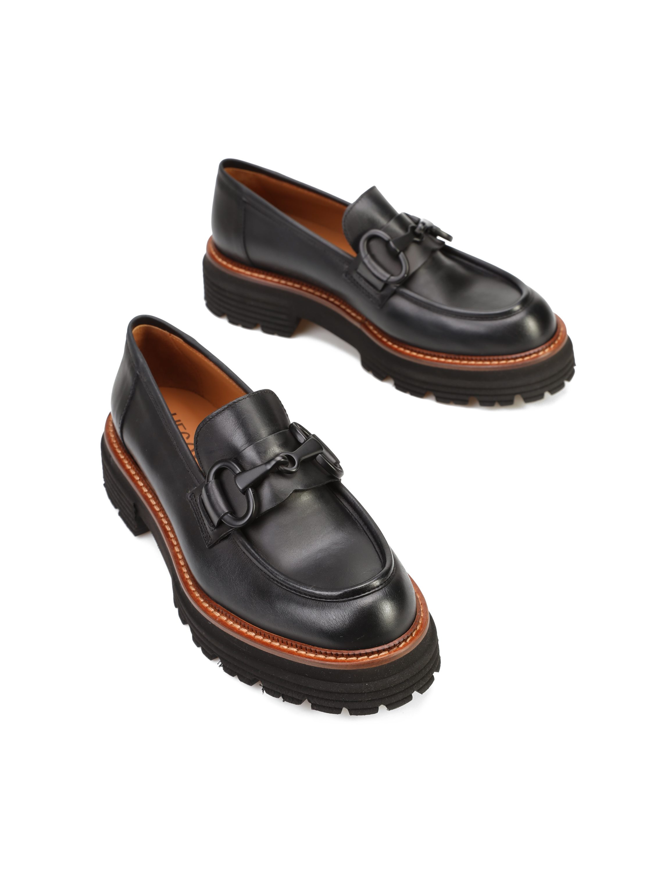 Mokasyny na grubej podeszwie to gorący Trend sezonu. Cholewka w czarnym kolorze wykonana jest z naturalnej skóry. Ozdobiona została metalowym wędzidłem. Fason w stylu loafersy, posiada charakterystyczny wysoki język. Lamówka w rudym kolorze to modny detal wyróżniający ten model. Pomimo masywnej podeszwy, buty są bardzo lekkie.