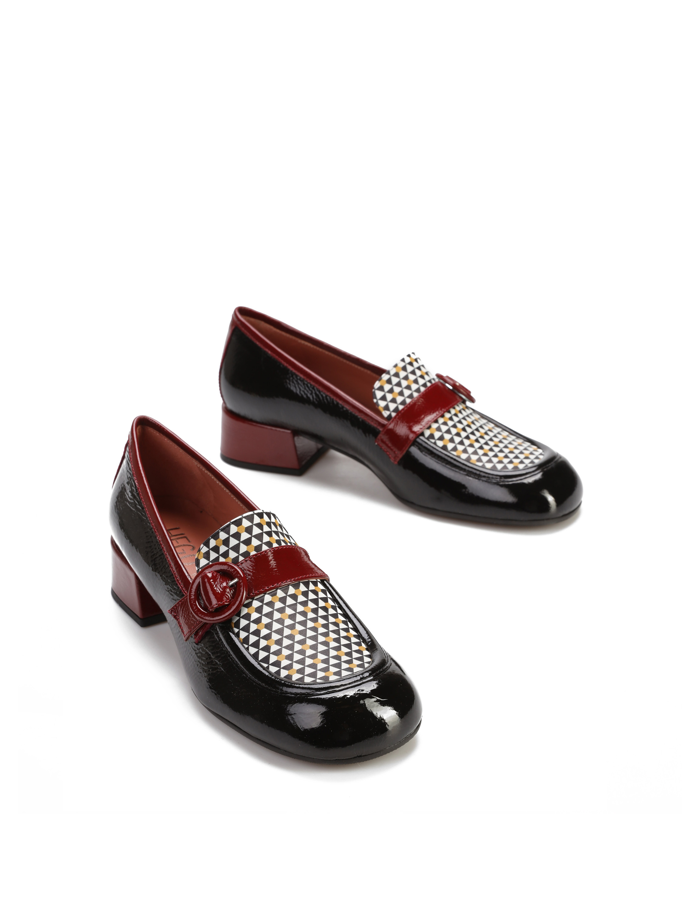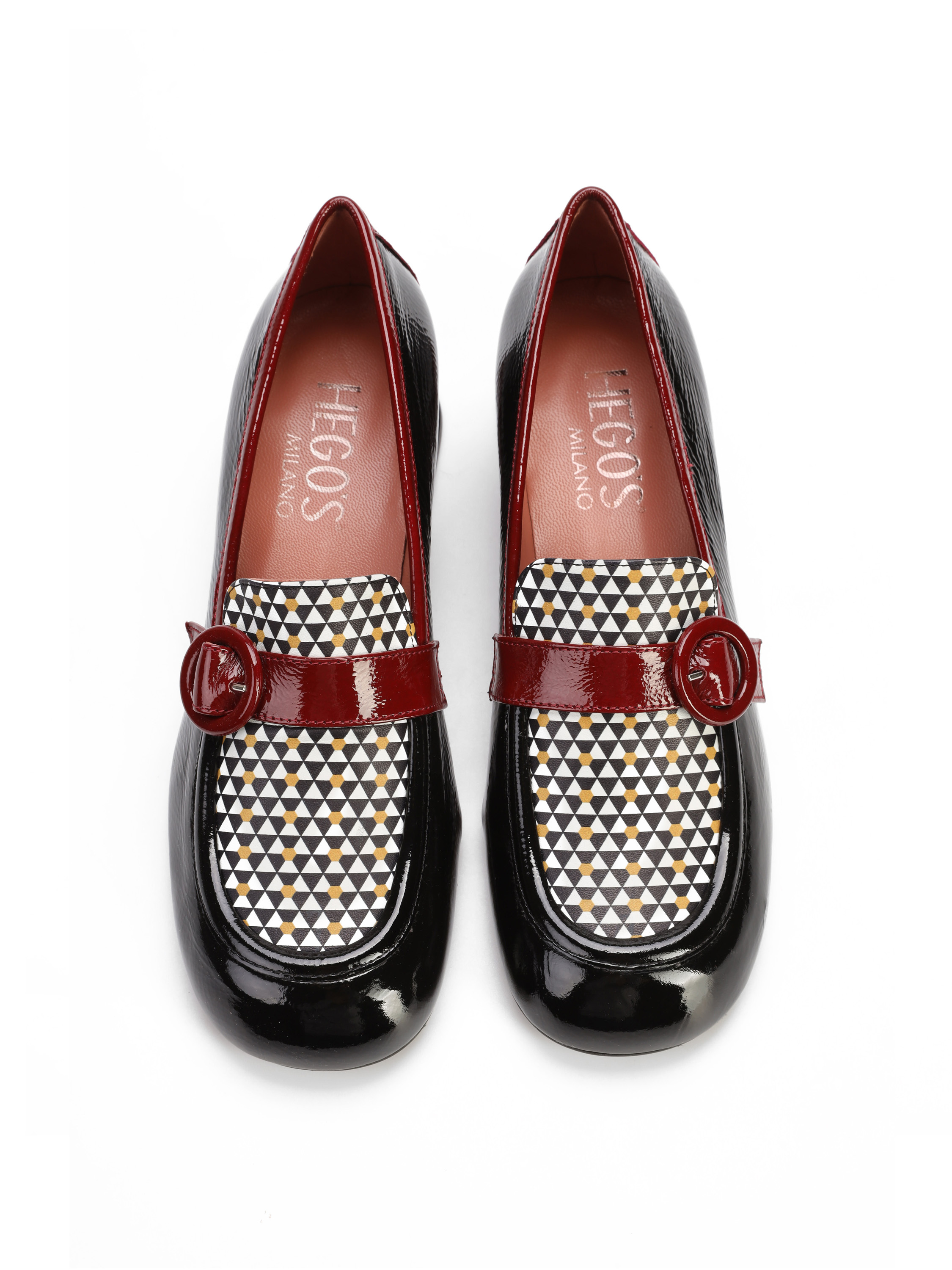 Mokasyny na niskim obcasie wykonane są z włoskiej skóry lakierowanej. Cholewka w modnym połączeniu kolorystycznym posiada wyższy język oraz regulowany pasek zapinany na sprzączkę.