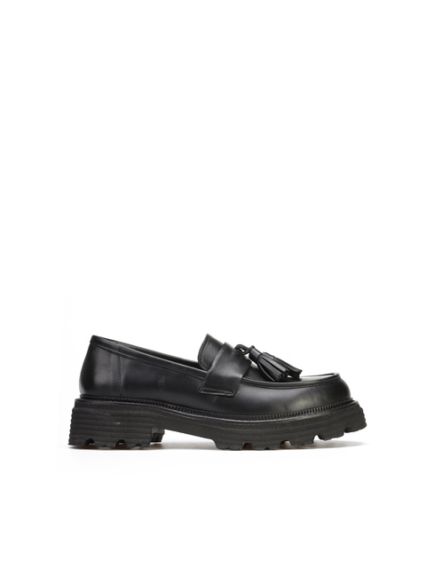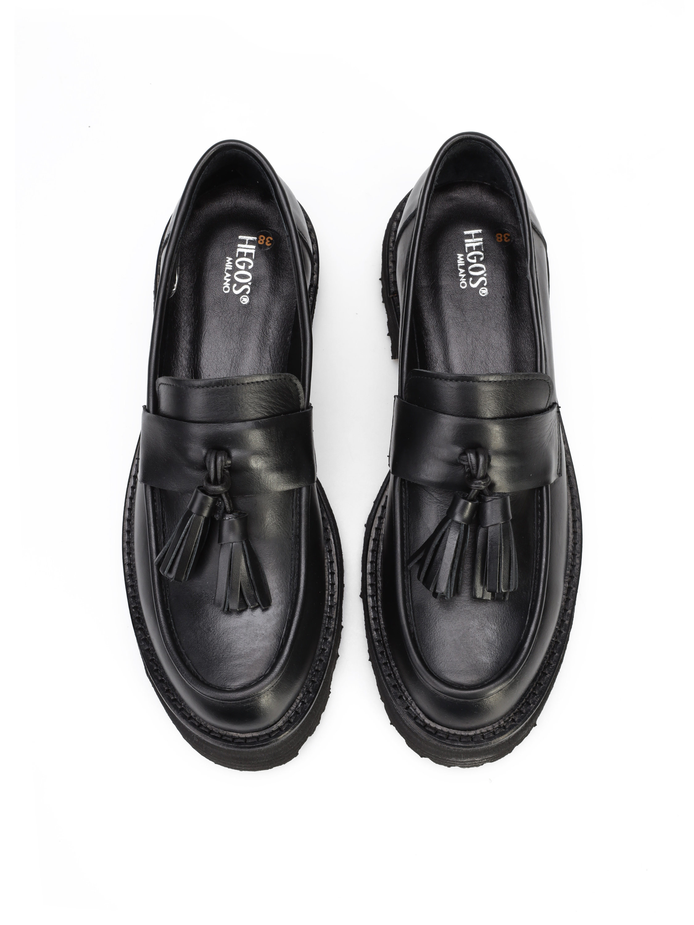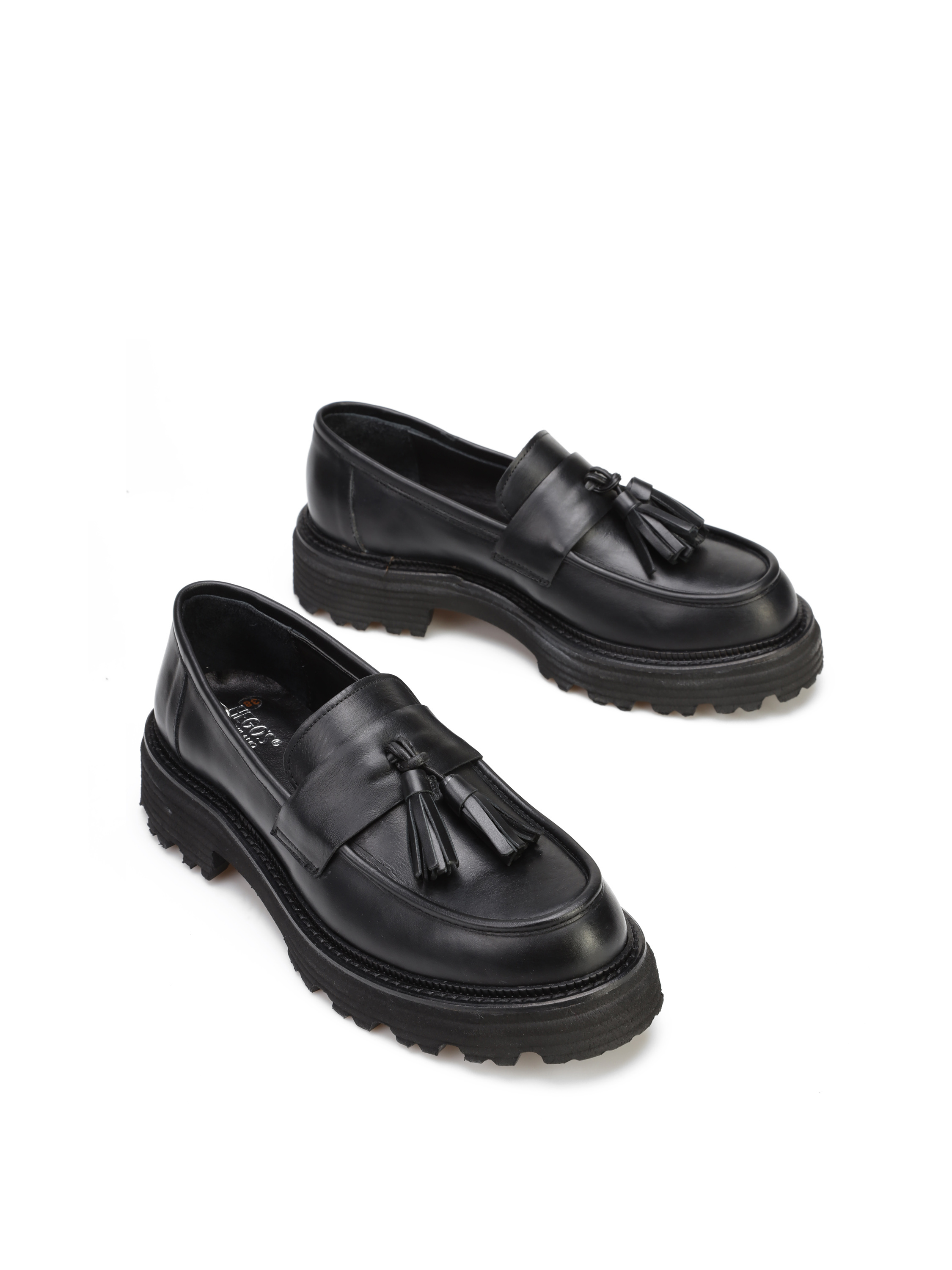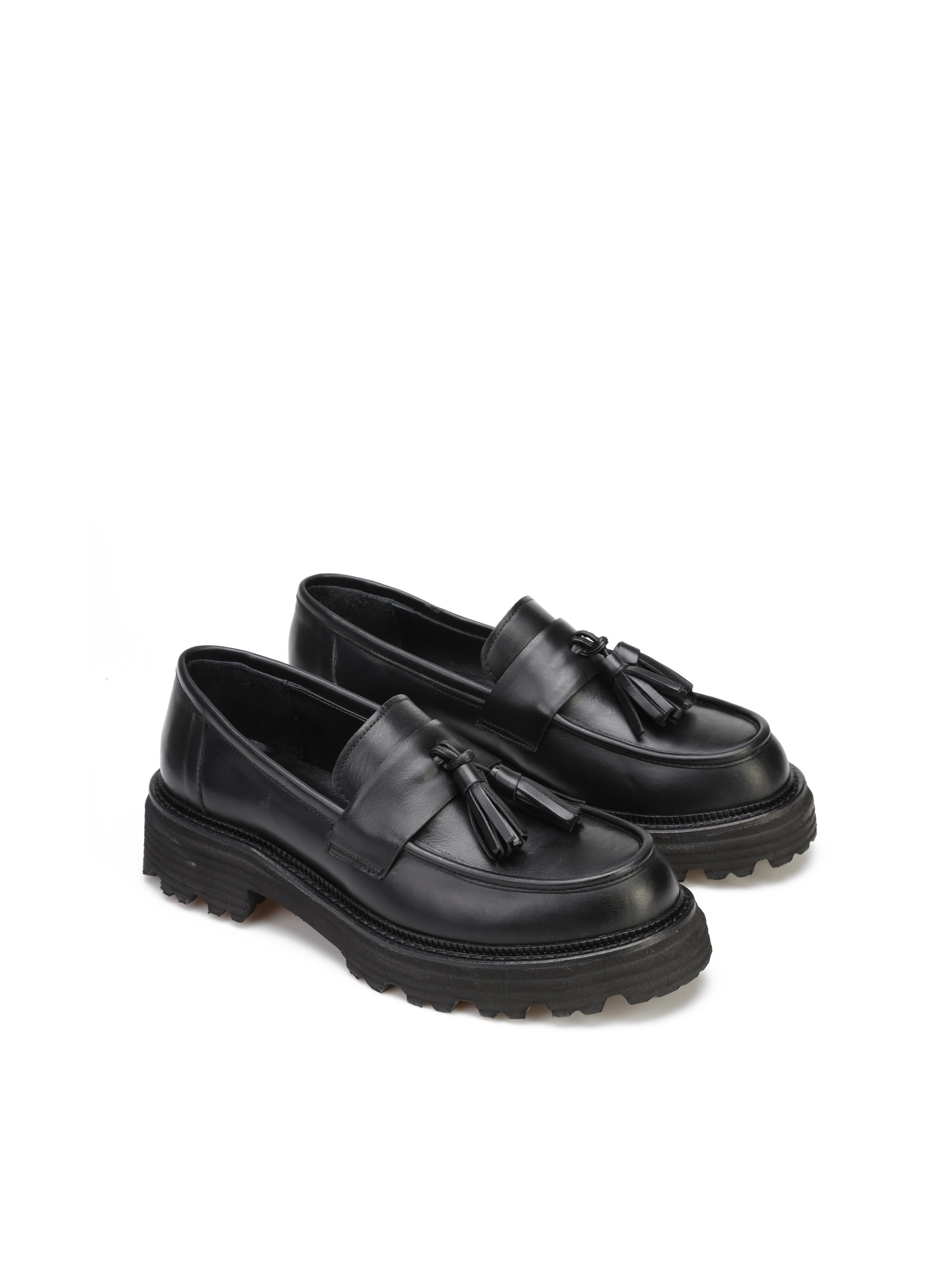 Mokasyny na grubej podeszwie to gorący Trend sezonu. Cholewka w czarnym kolorze wykonana jest z naturalnej skóry. Ozdobiona została modnymi frędzlami. Fason w stylu loafersy z charakterystycznym wysokim językiem.