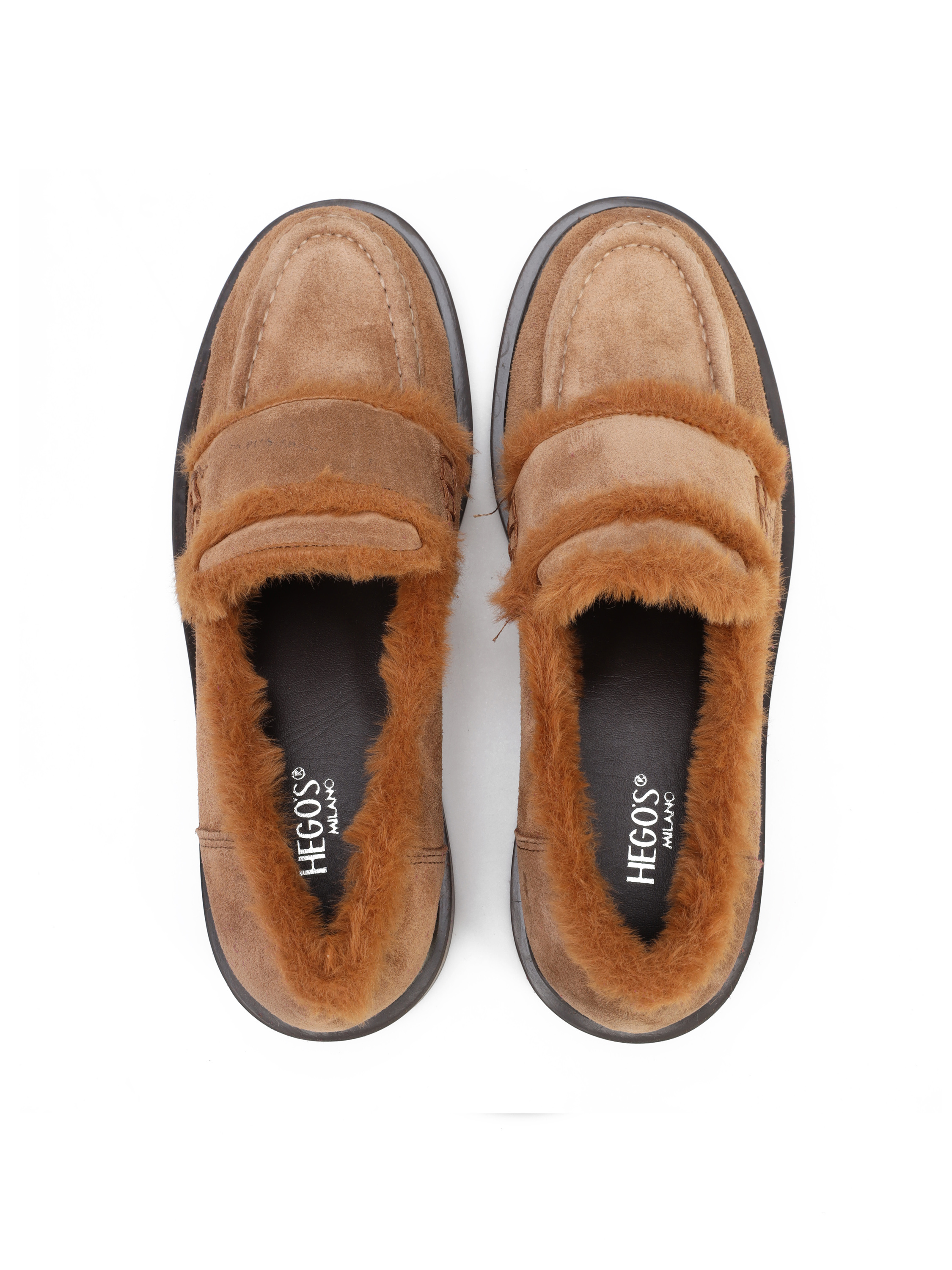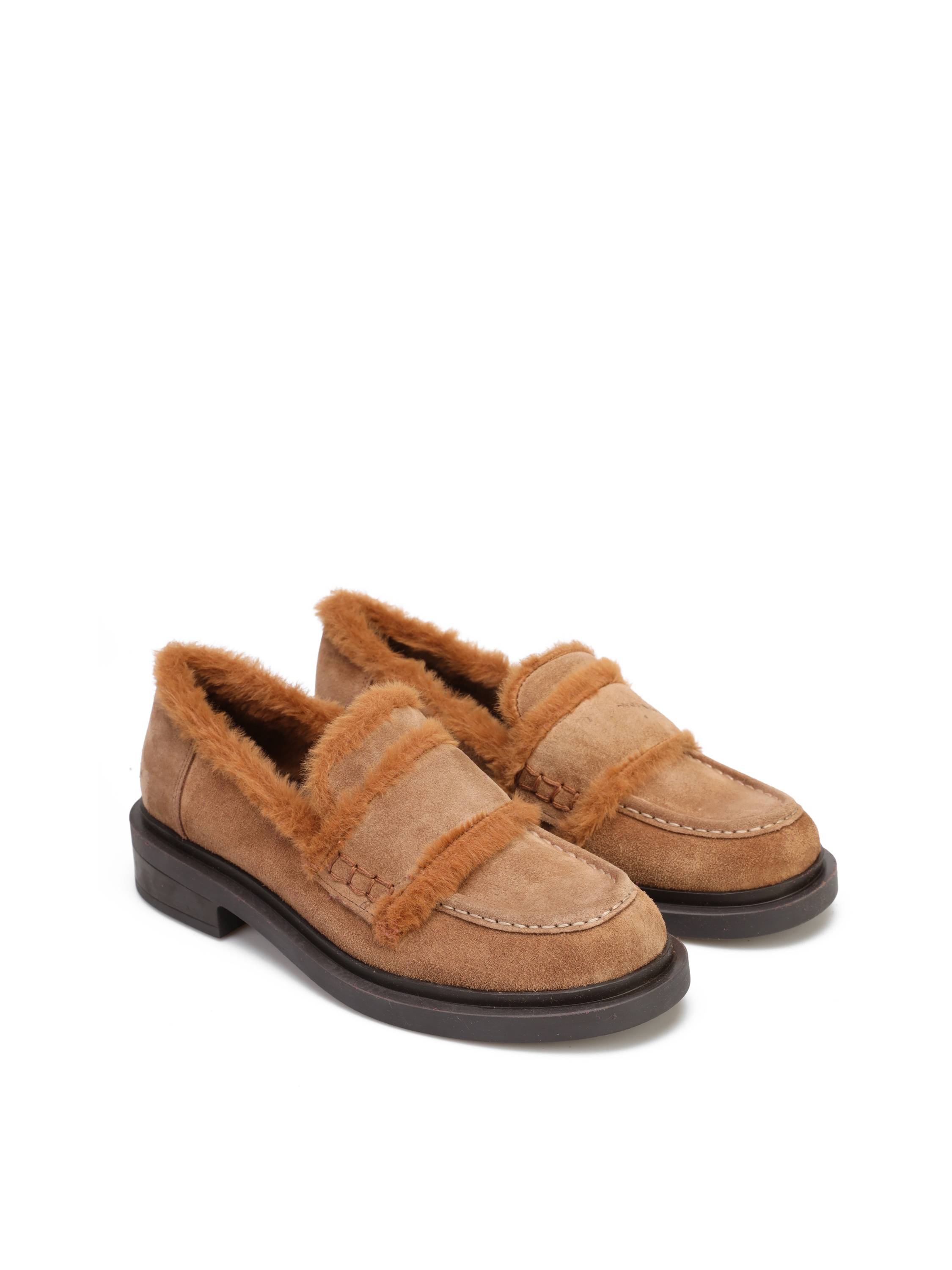 Mokasyny na płaskim obcasie wykonane są z zamszowej skóry. Cholewka w beżowym kolorze obszyta została modnym, syntetycznym futrem. Stylowe mokasyny będą uzupełnieniem modnej garderoby kobiety.