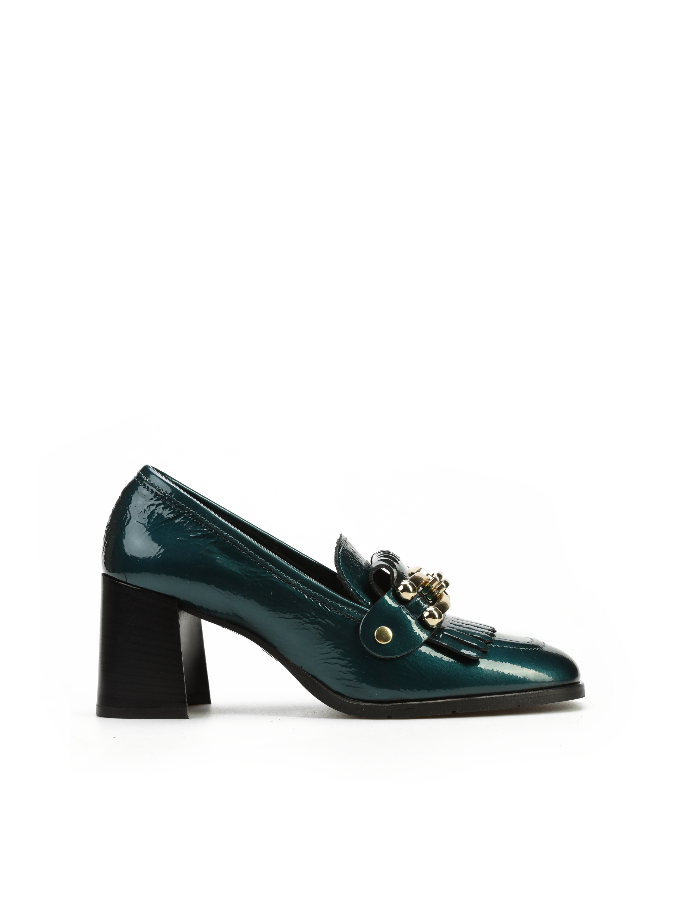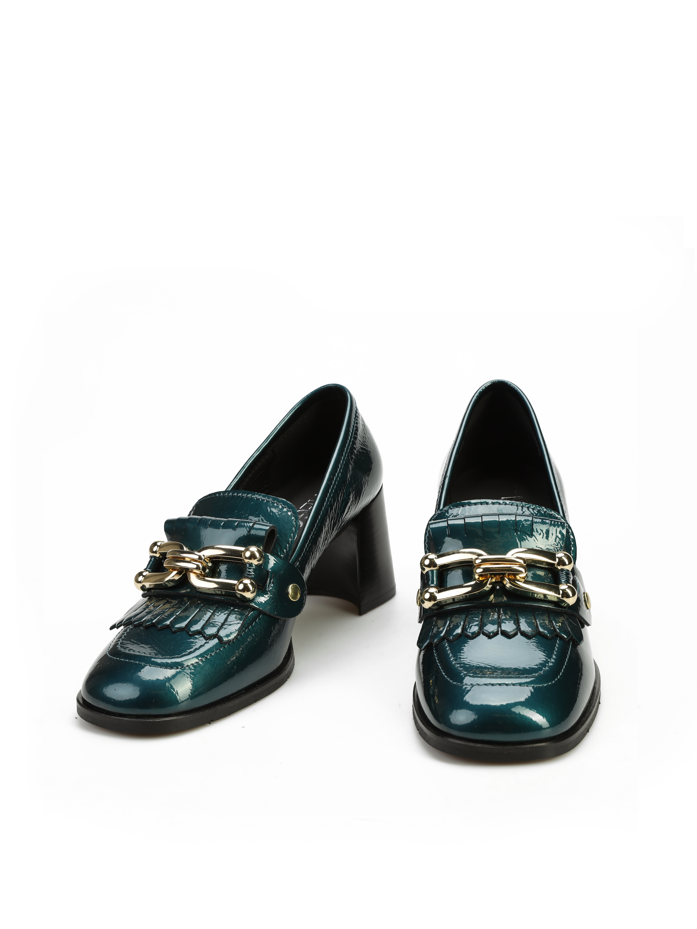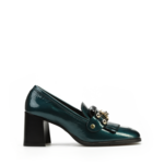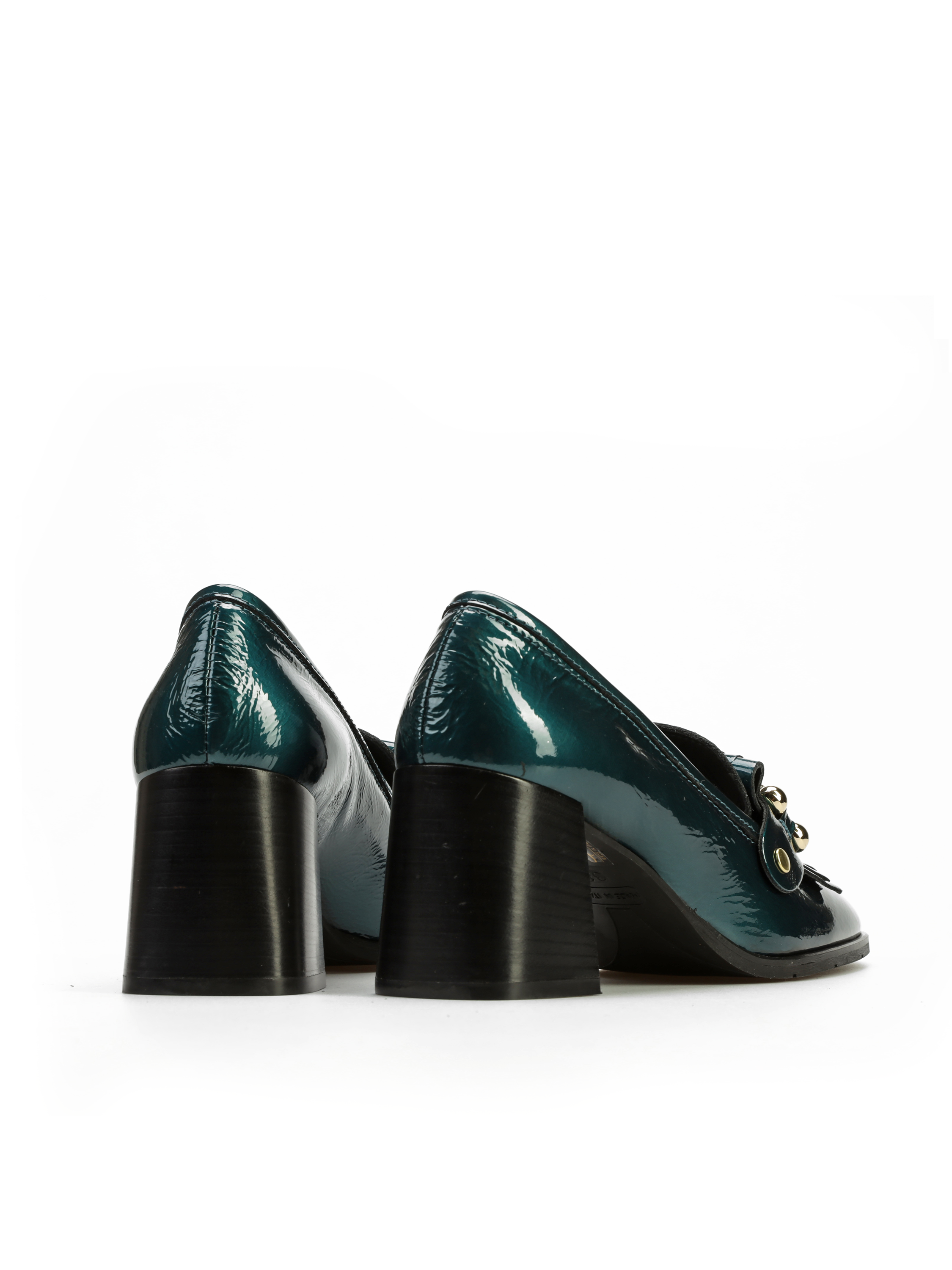 Mokasyny na słupku wykonane z włoskiej lakierowanej skóry. To model 3 w 1. Posiada odpinaną, złotą klamrę, którą można zamienić na gładki pasek i nosić według upodobań. Detal w postaci frędzli oraz modny turkusowy kolor to Trend sezonu.