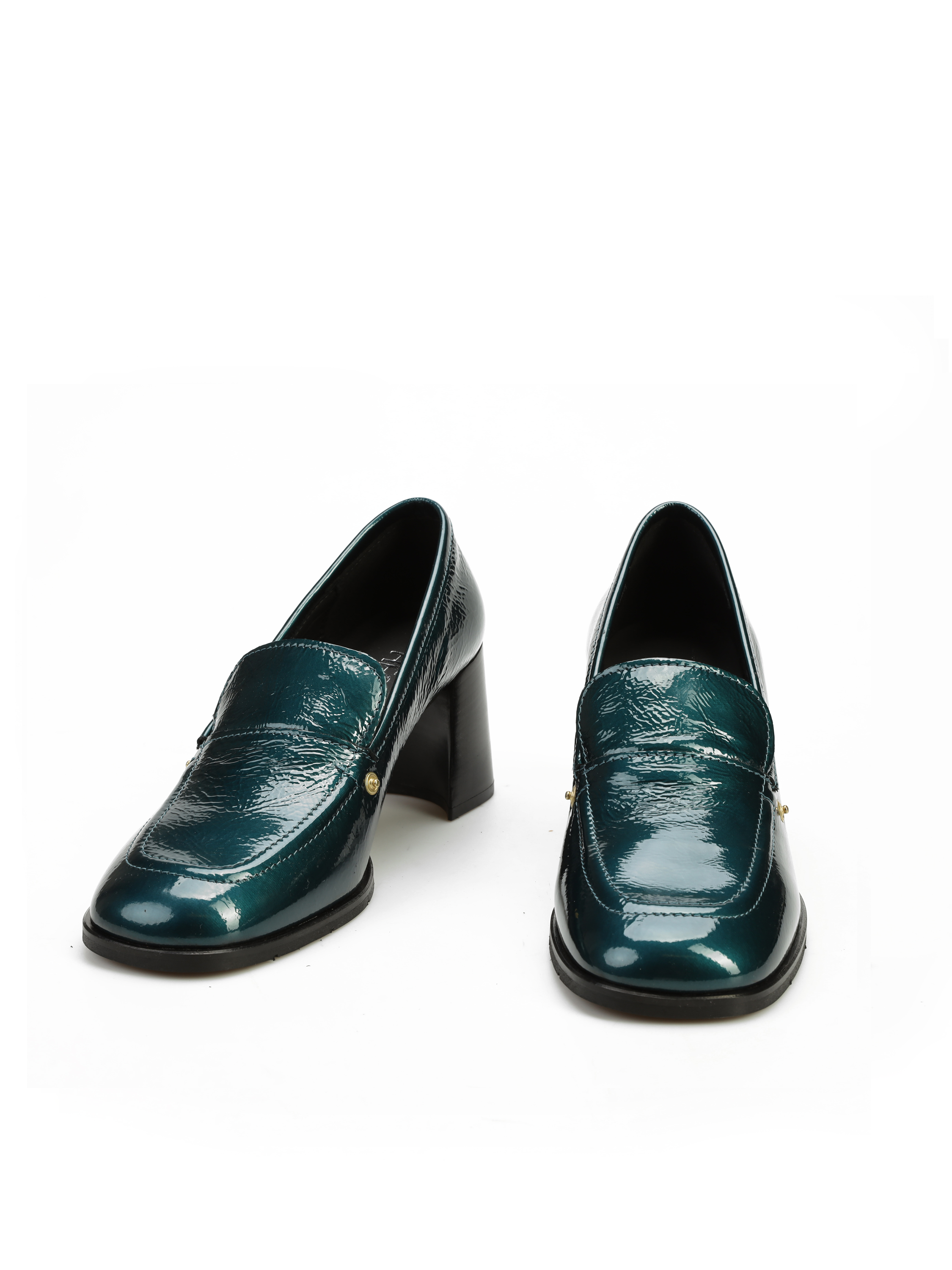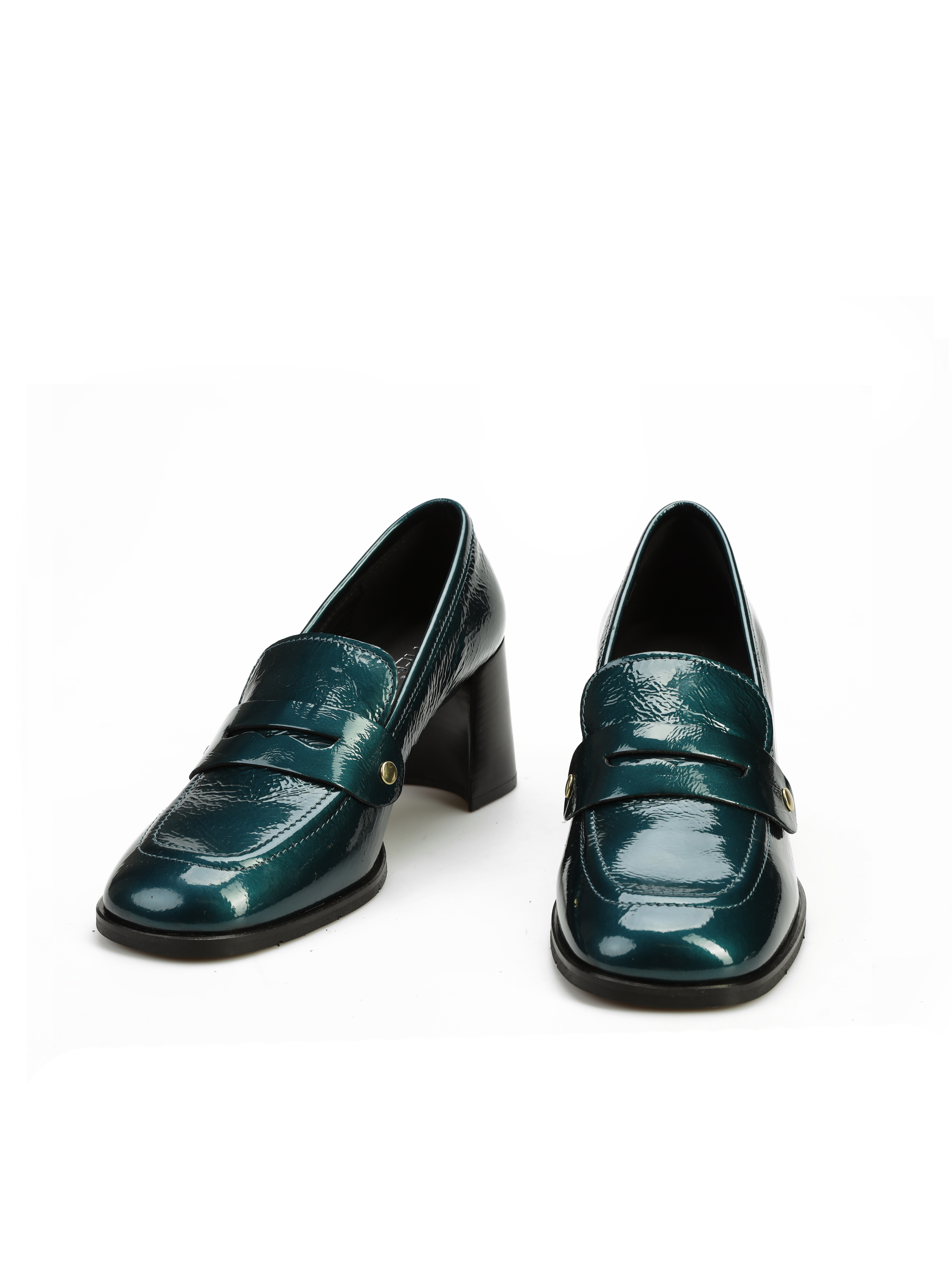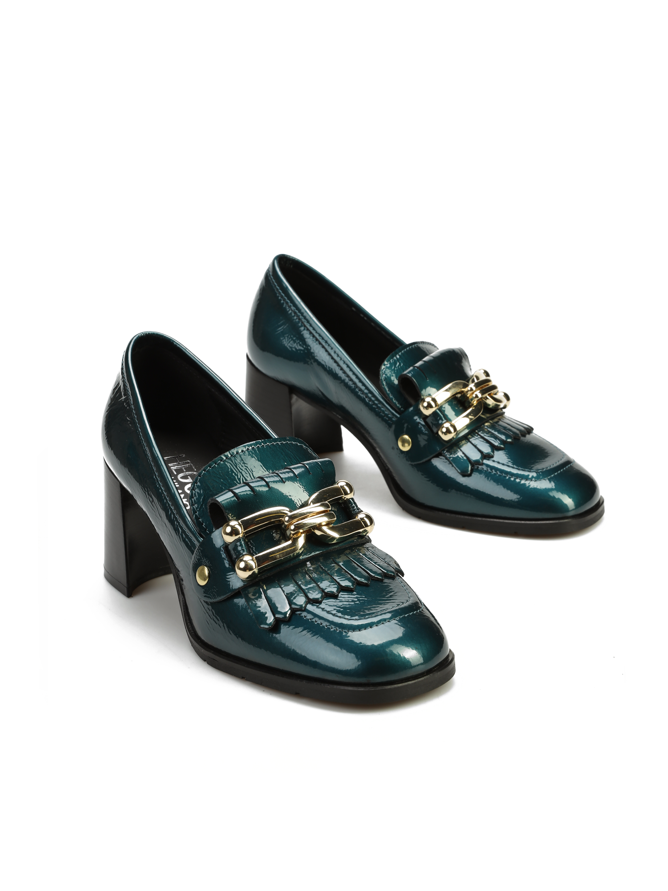Mokasyny na słupku wykonane z włoskiej lakierowanej skóry. To model 3 w 1. Posiada odpinaną, złotą klamrę, którą można zamienić na gładki pasek i nosić według upodobań. Detal w postaci frędzli oraz modny turkusowy kolor to Trend sezonu.