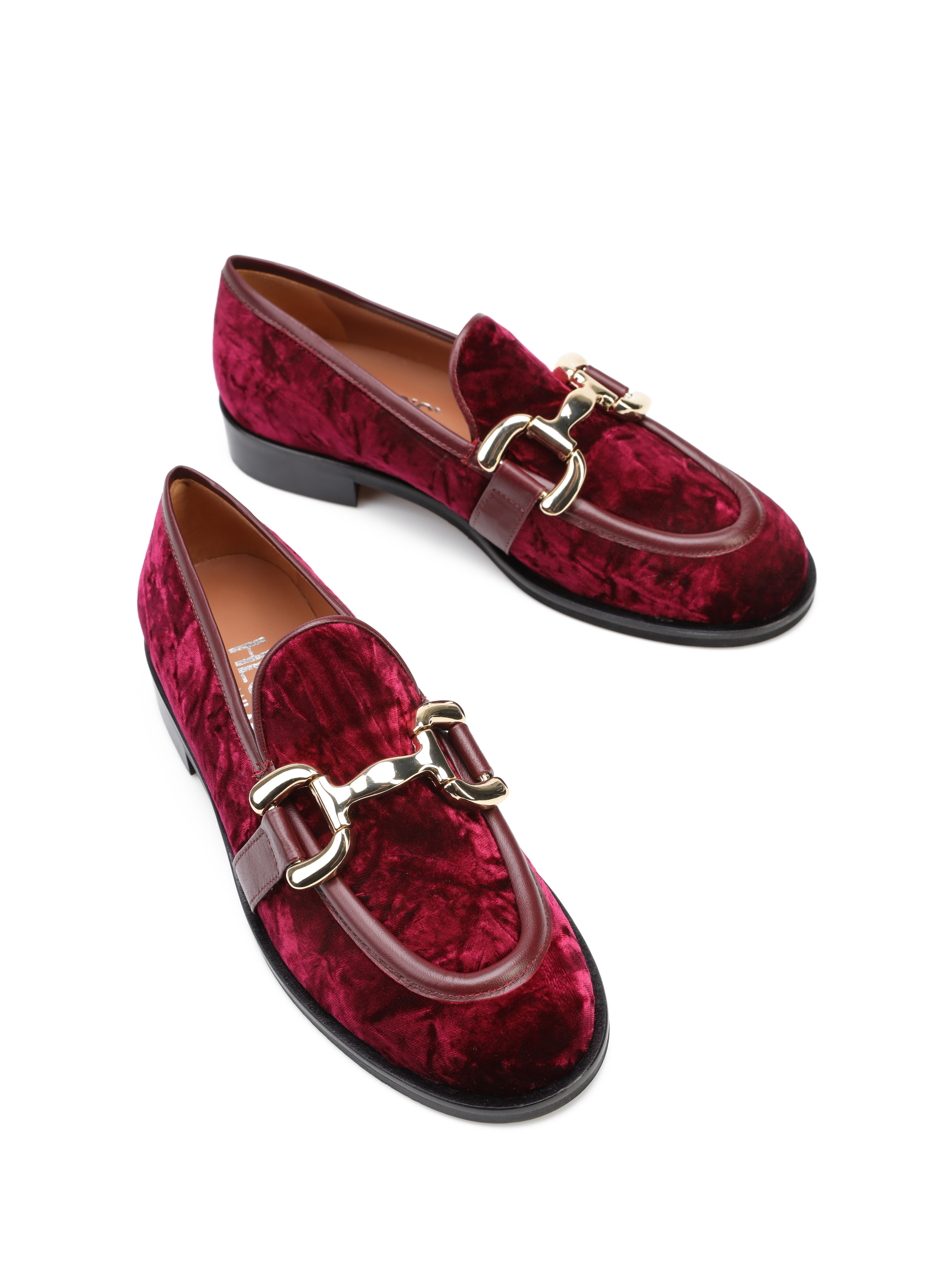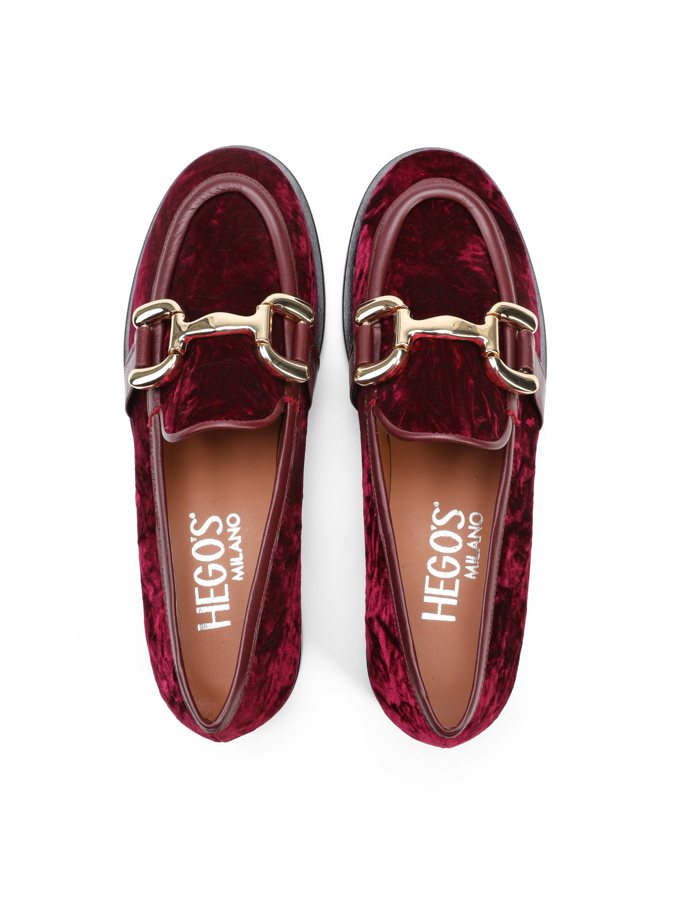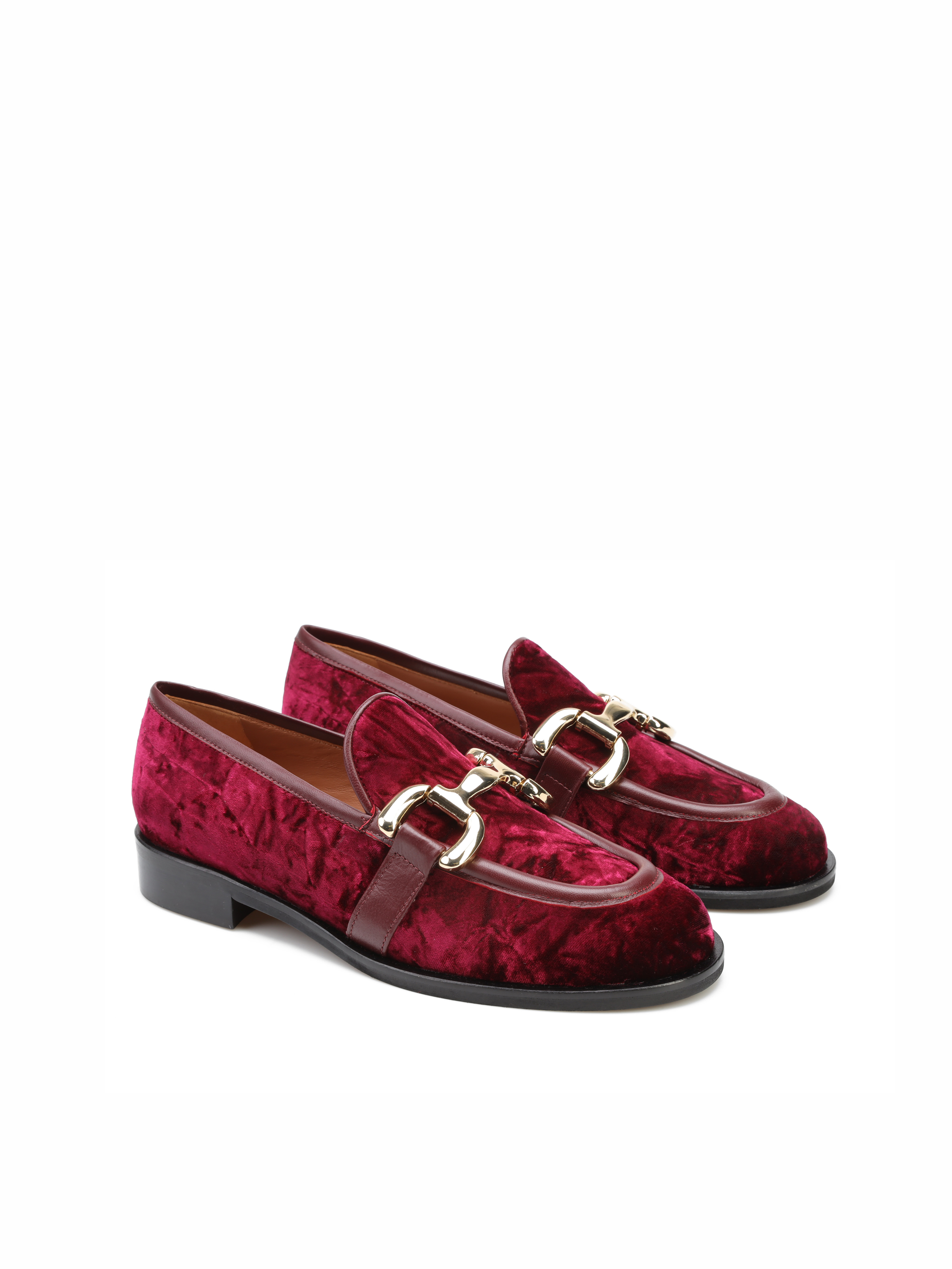 Welurowe mokasyny na płaskim obcasie to gorący Trend sezonu. Wnętrze buta wykonane jest z naturalnej skóry. Welurowa cholewka w bordowym kolorze posiada złotą klamrę oraz skórzaną lamówkę. Fason w stylu lordsy z wysokim, charakterystycznym językiem.