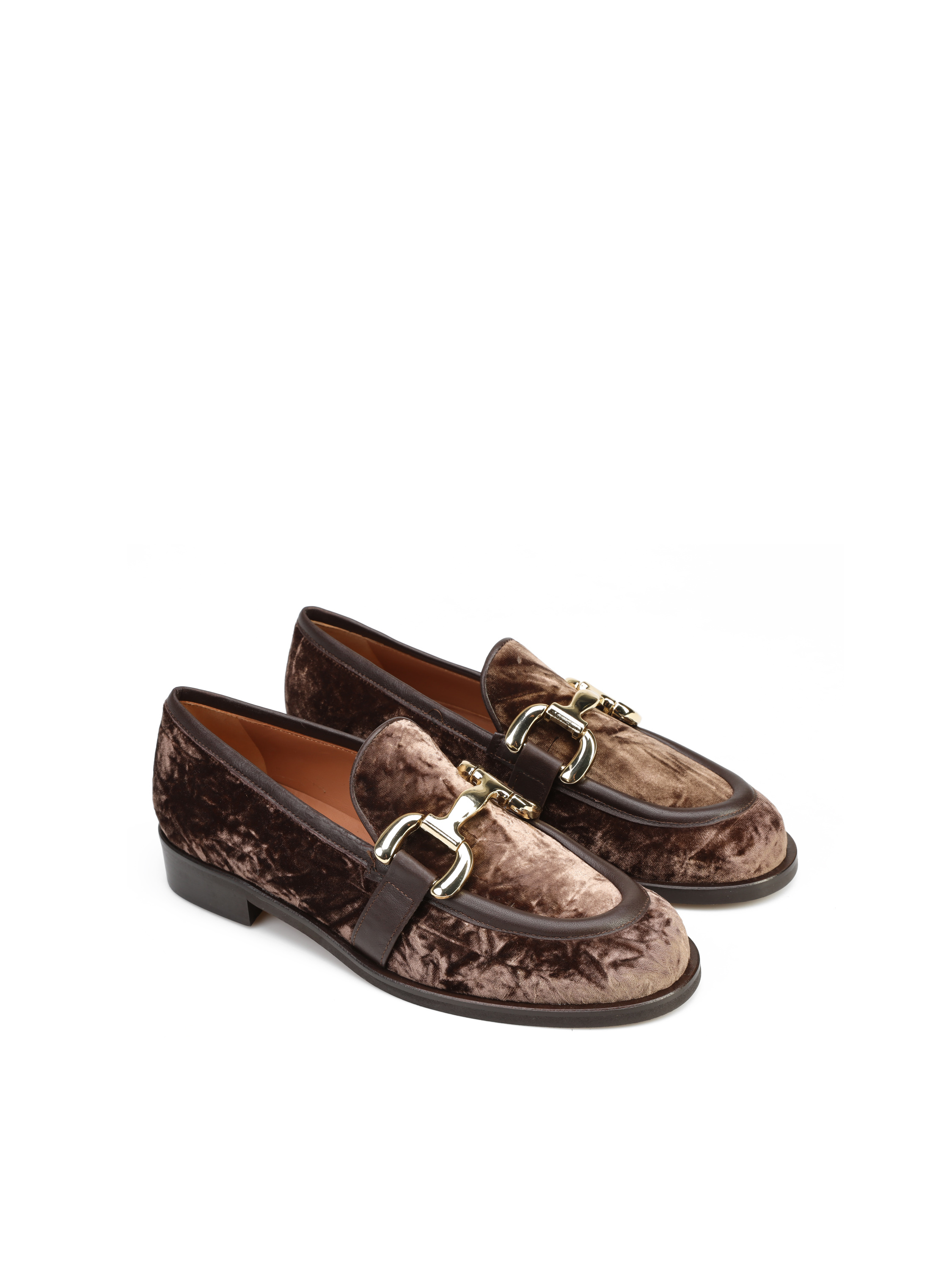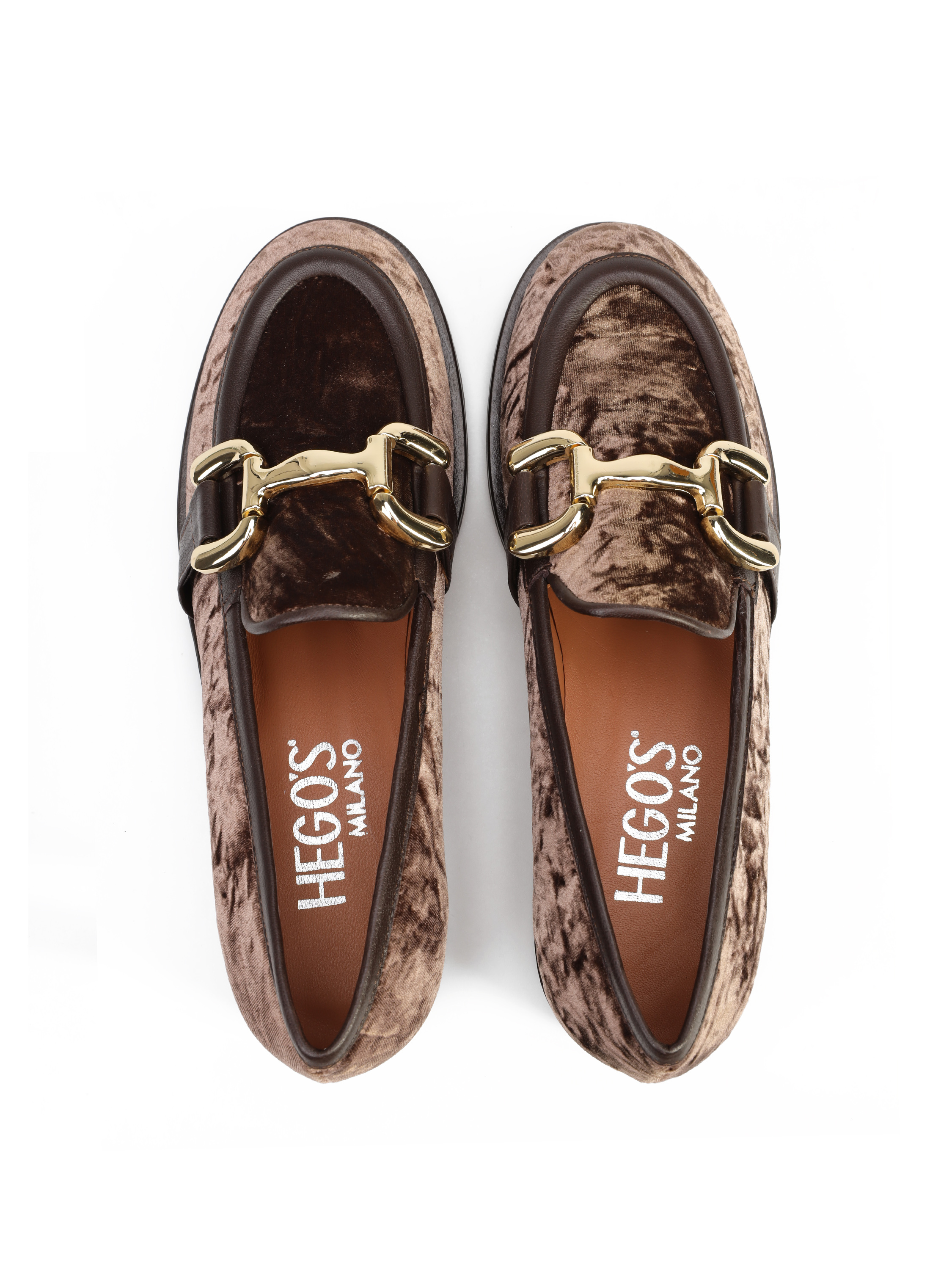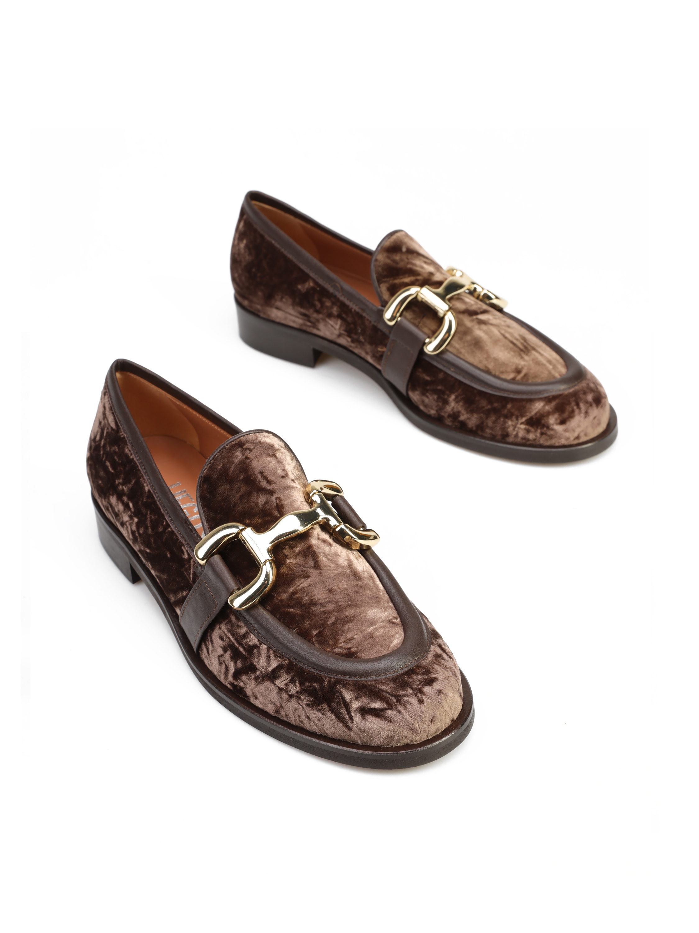 Welurowe mokasyny na płaskim obcasie to gorący Trend sezonu. Wnętrze buta wykonane jest z naturalnej skóry. Welurowa cholewka w brązowym kolorze posiada złotą klamrę oraz skórzaną lamówkę. Fason w stylu lordsy z wysokim, charakterystycznym językiem.