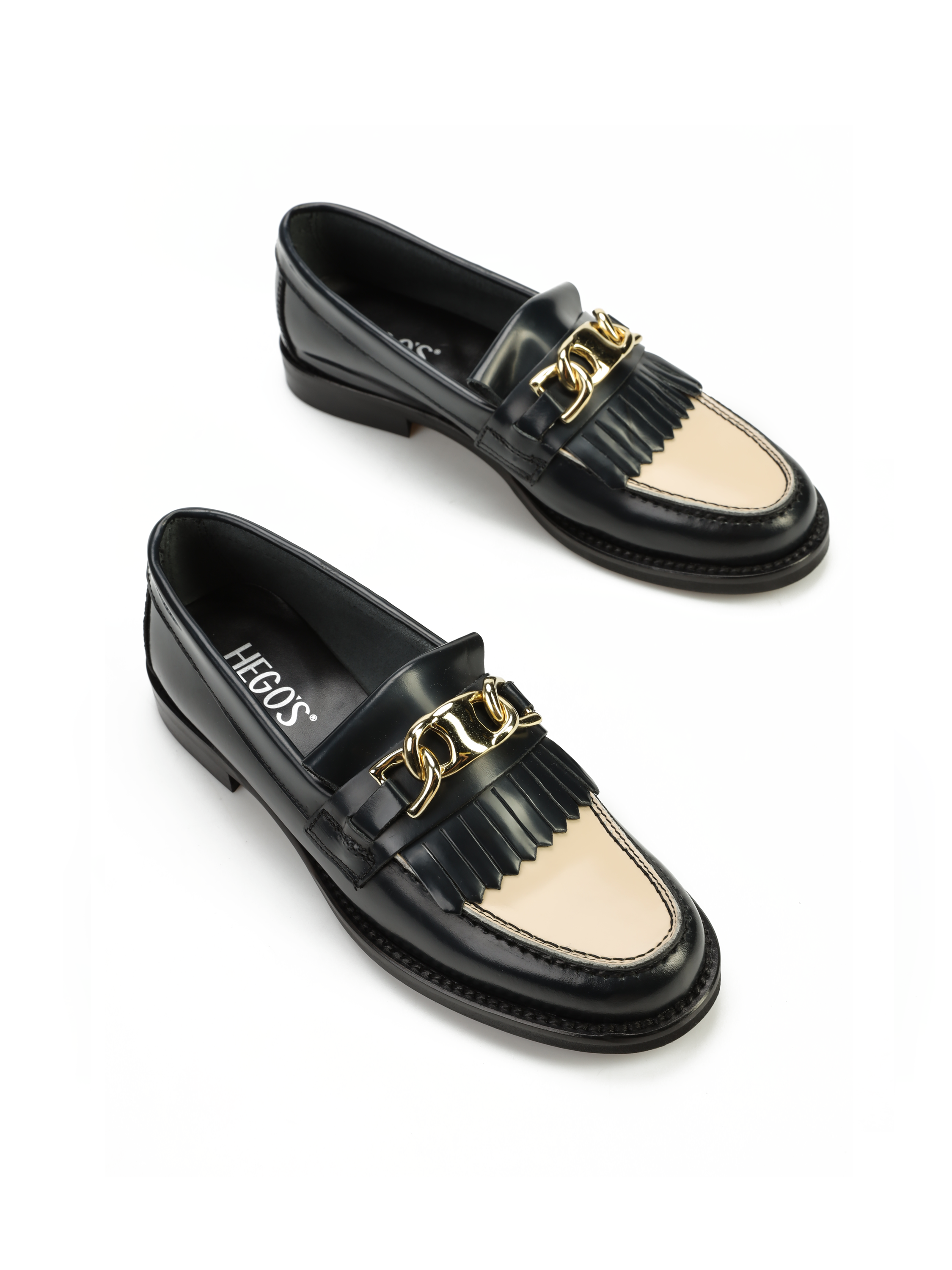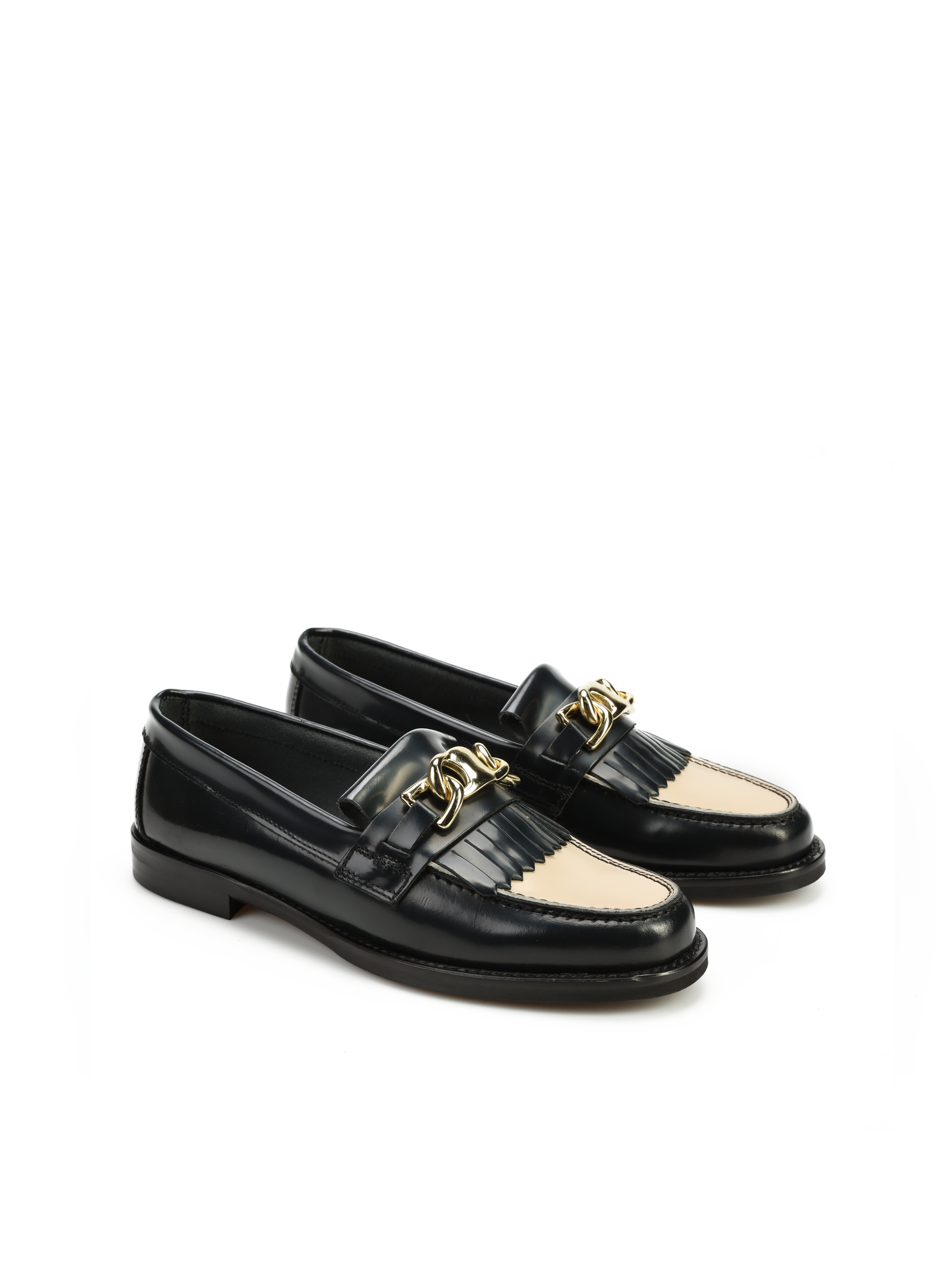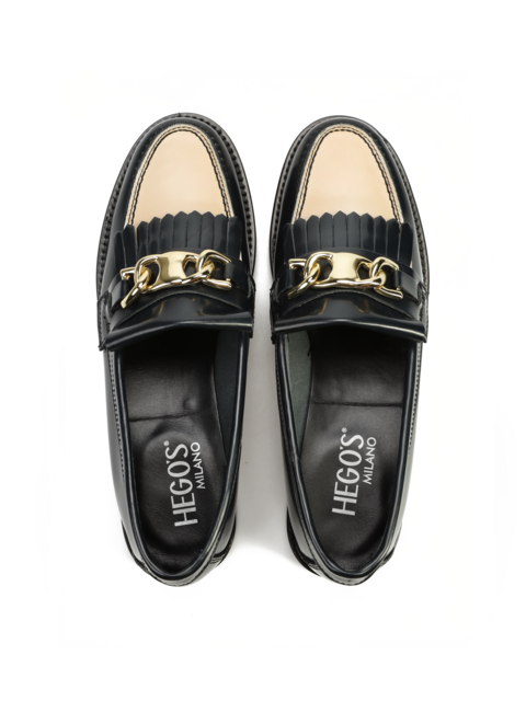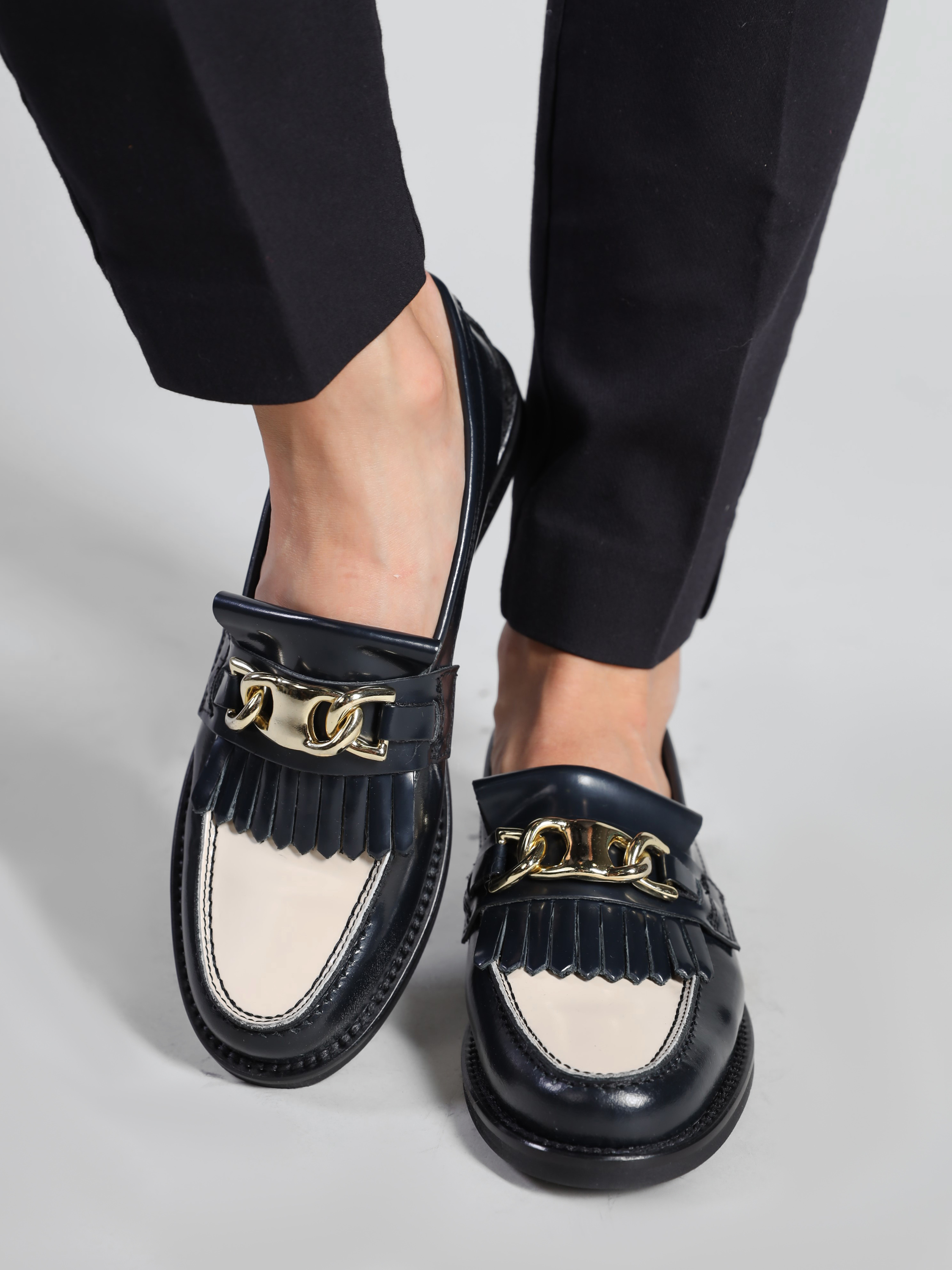 Mokasyny na płaskim obcasie to must have kobiecej garderoby. Wykonane są z włoskiej, wysokopolerowanej skóry naturalnej. Granatowy kolor w połączeniu ze złotą klamrą oraz frędzlami to detale wyróżniające ten model.