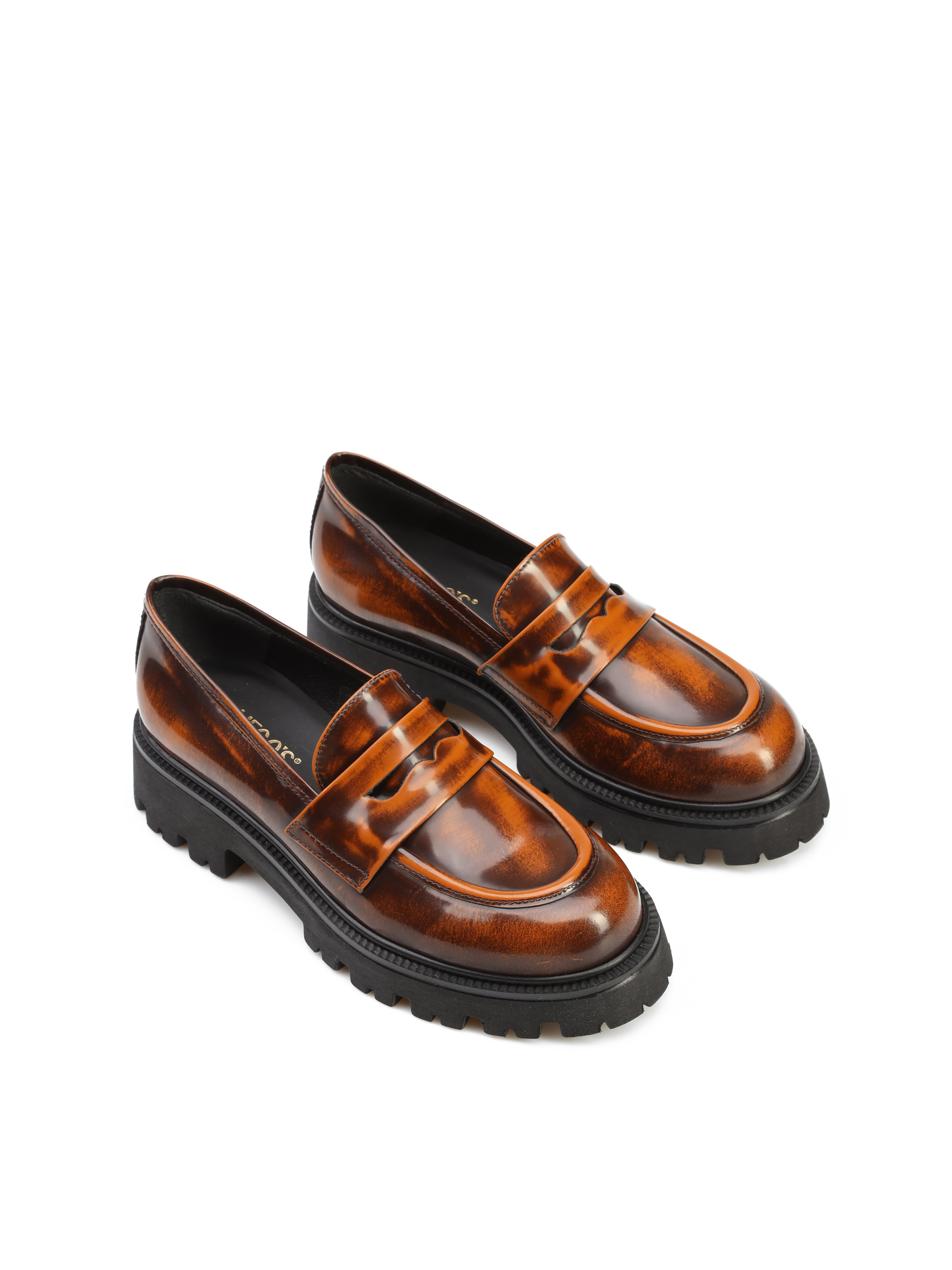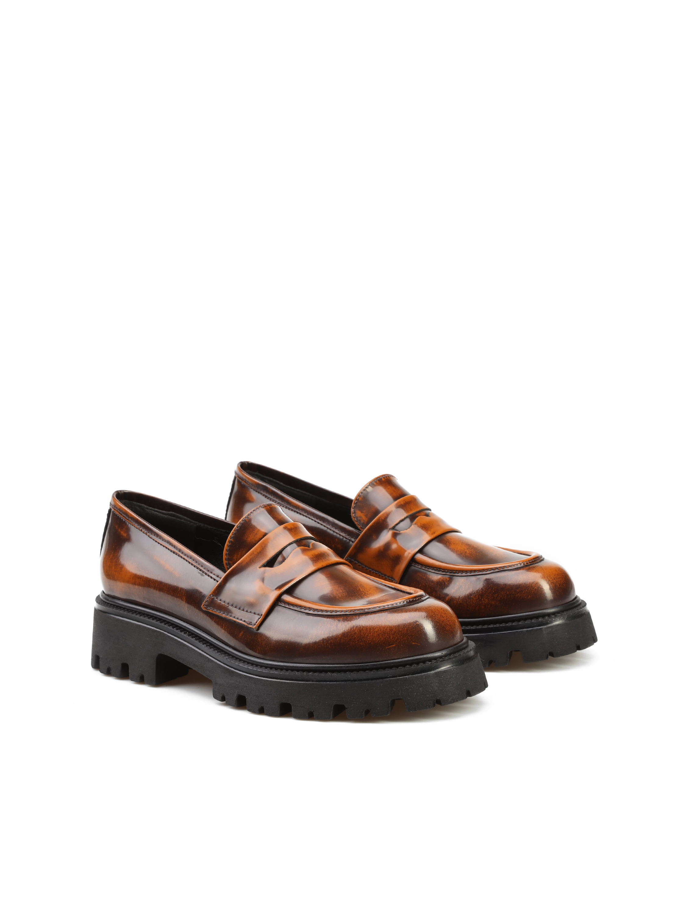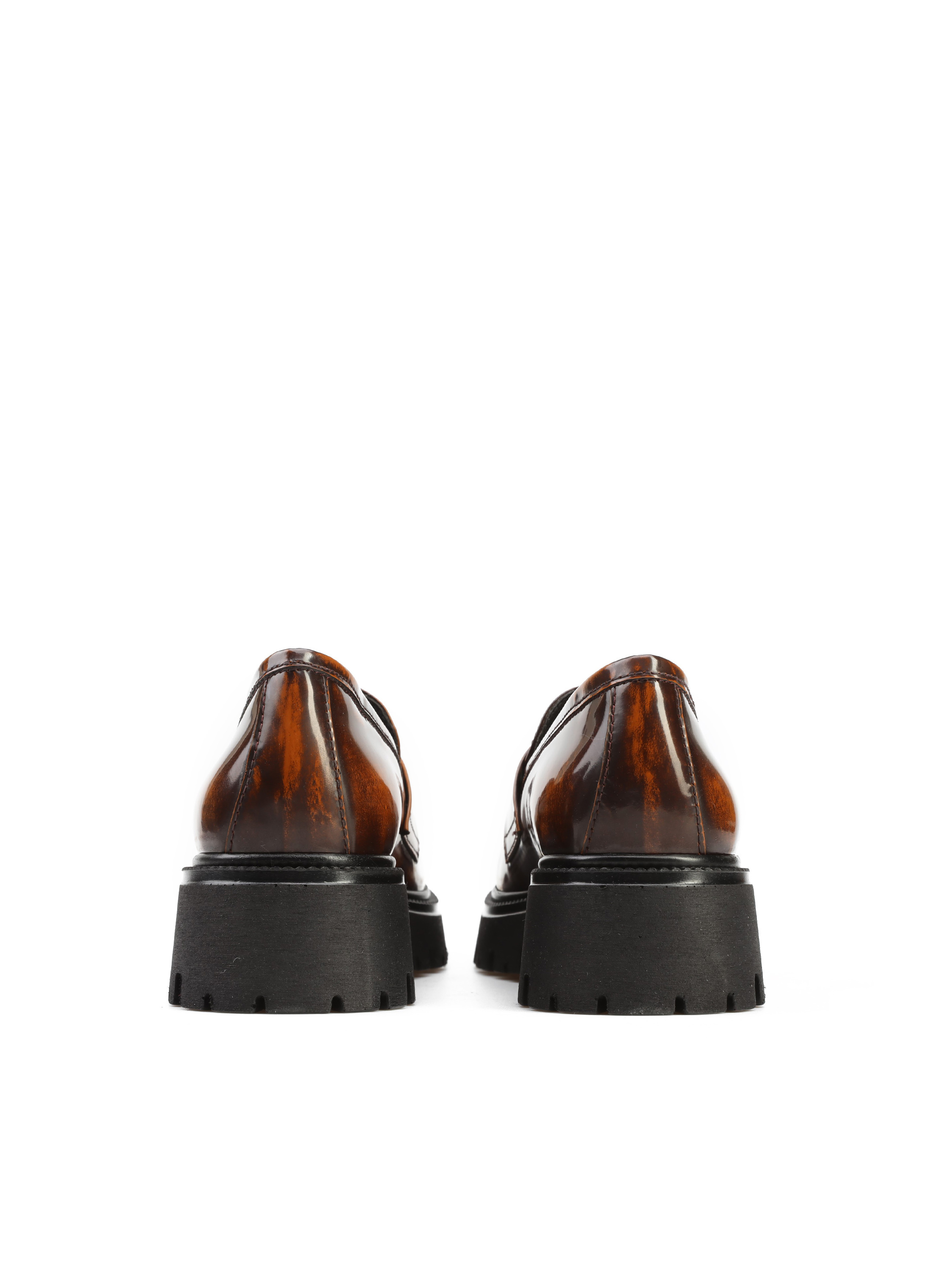 Mokasyny na grubej podeszwie to gorący Trend sezonu. Cholewka w rudym kolorze wykonana jest z naturalnej, wysokopolerowanej skóry. Fason w stylu loafersy z charakterystycznym wysokim językiem.