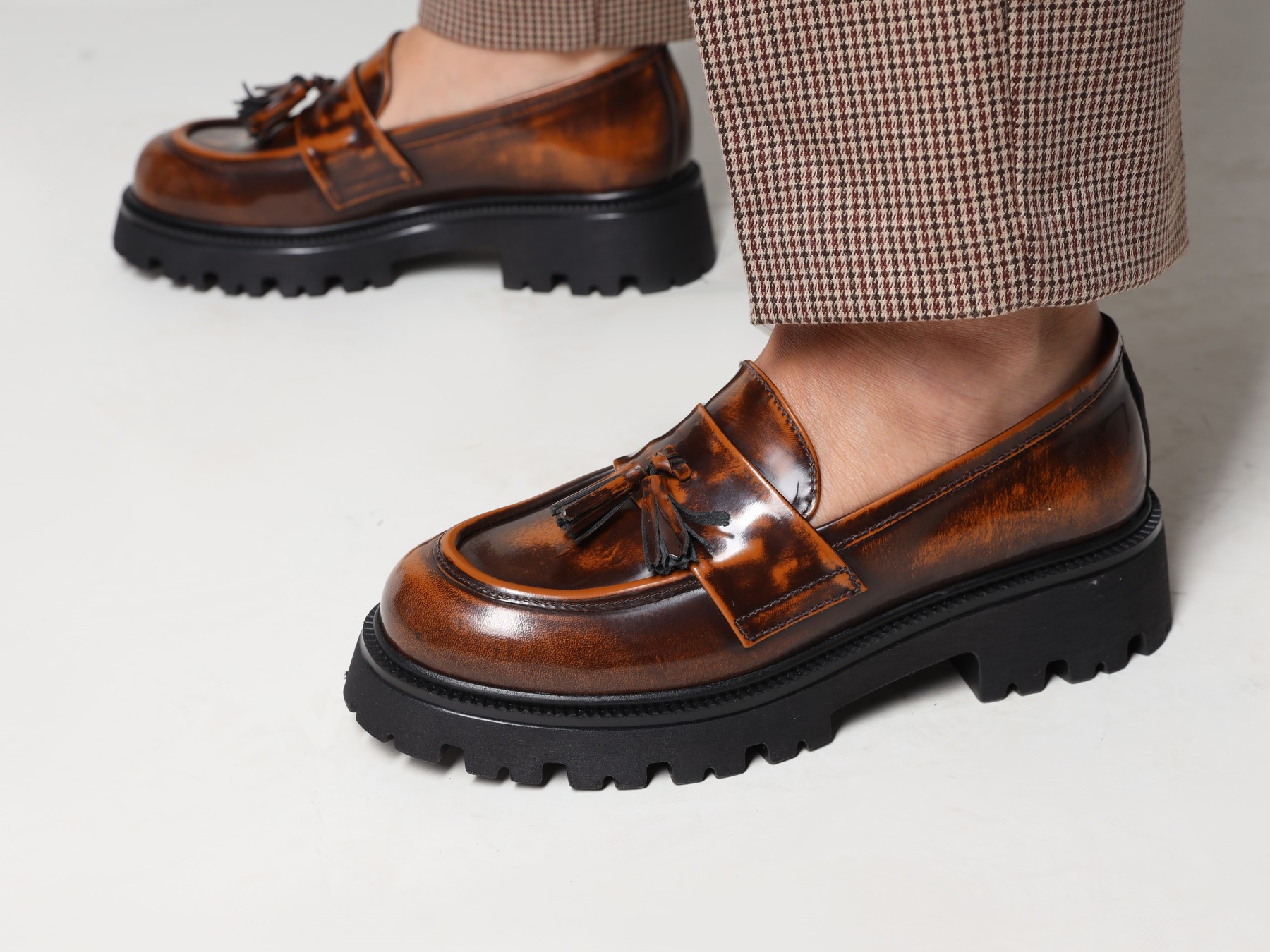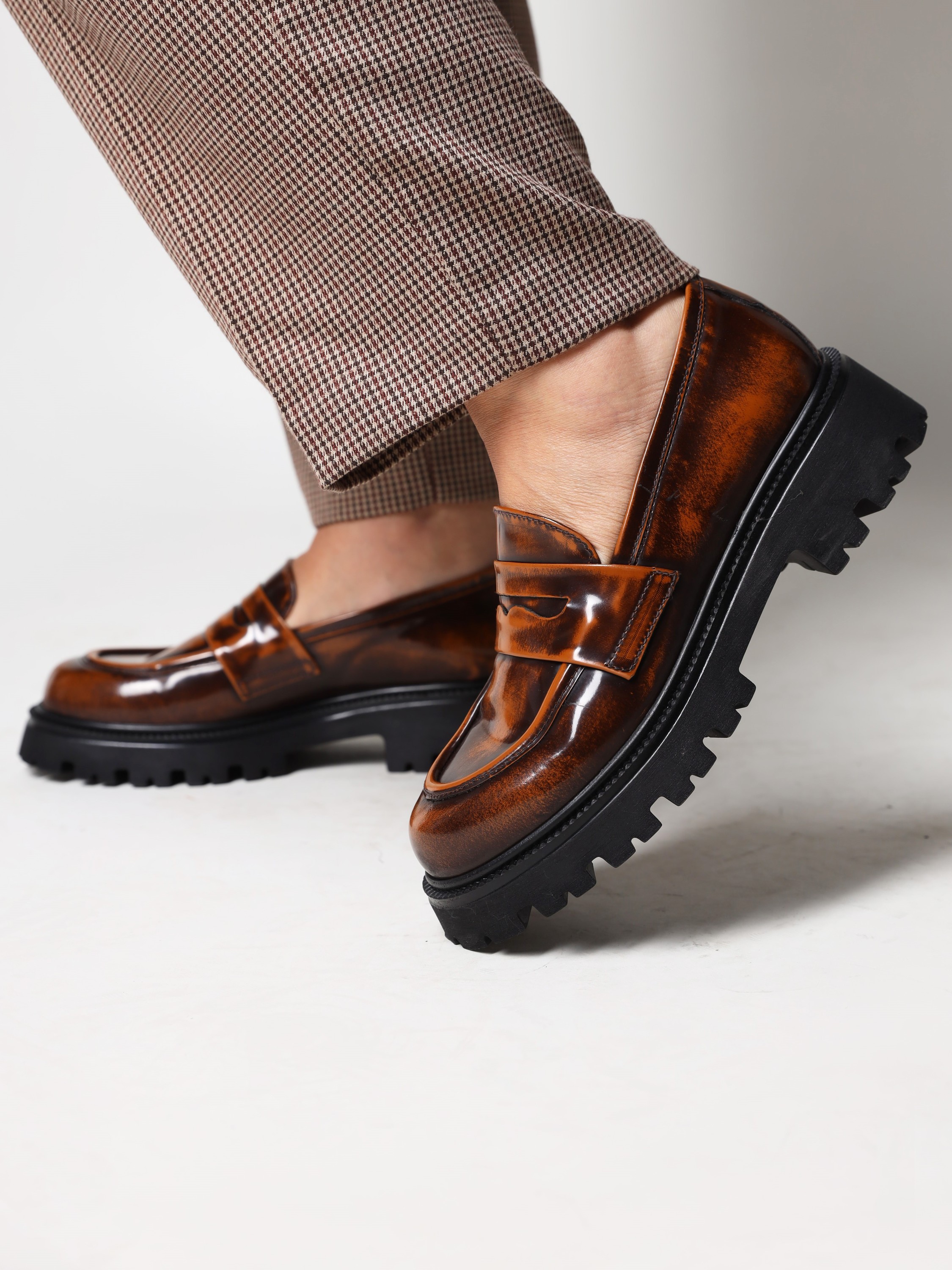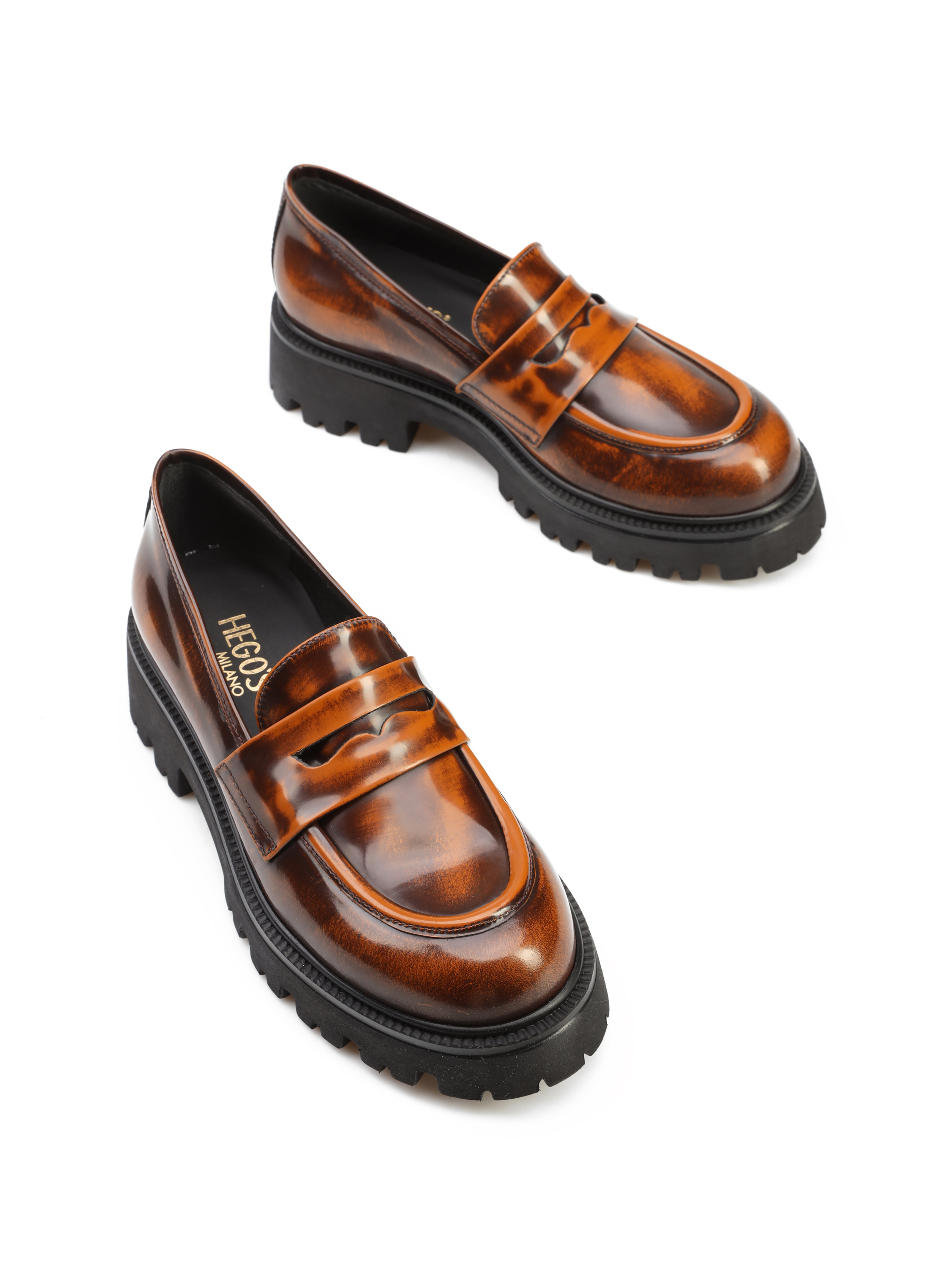 Mokasyny na grubej podeszwie to gorący Trend sezonu. Cholewka w rudym kolorze wykonana jest z naturalnej, wysokopolerowanej skóry. Fason w stylu loafersy z charakterystycznym wysokim językiem.