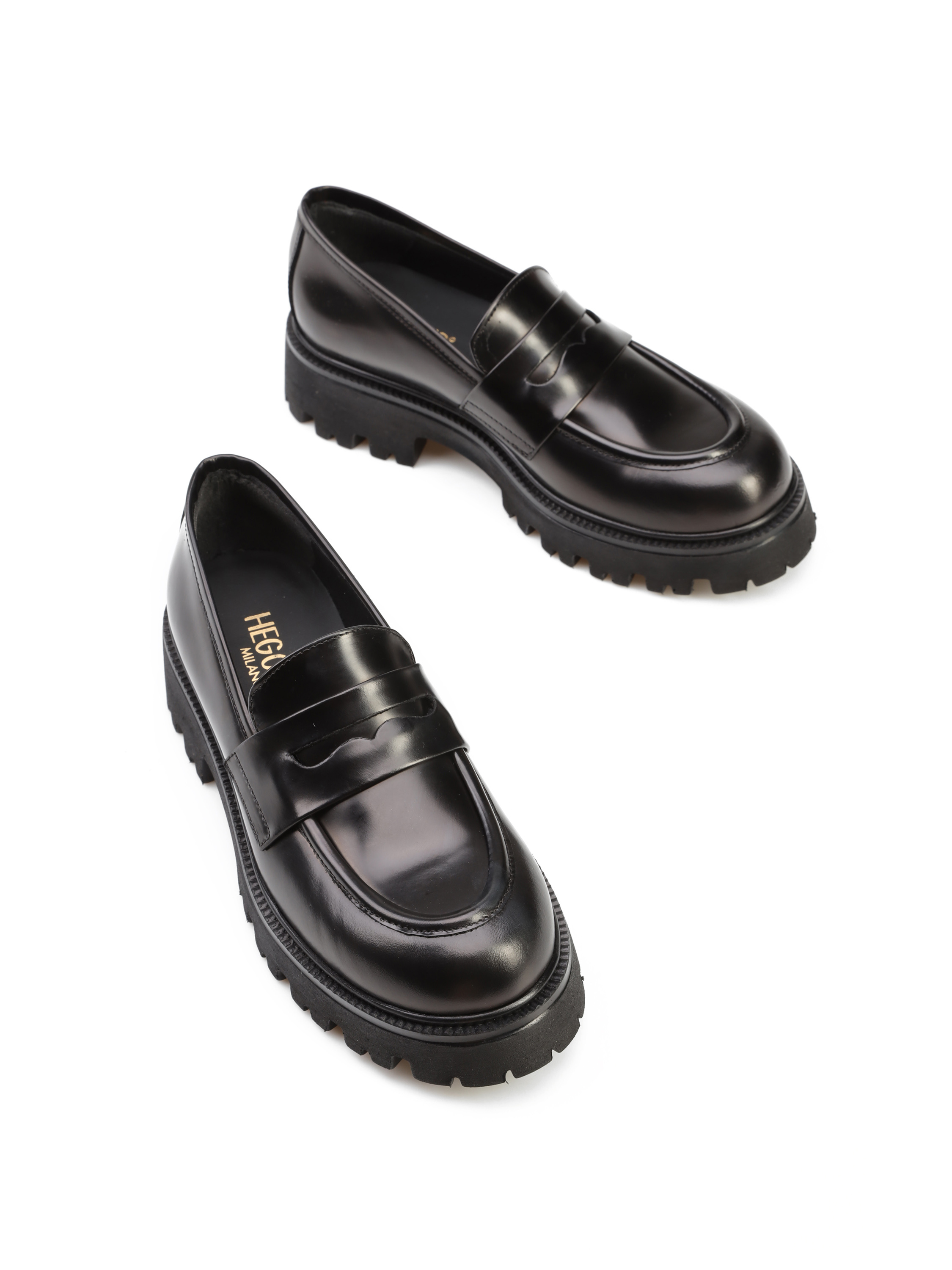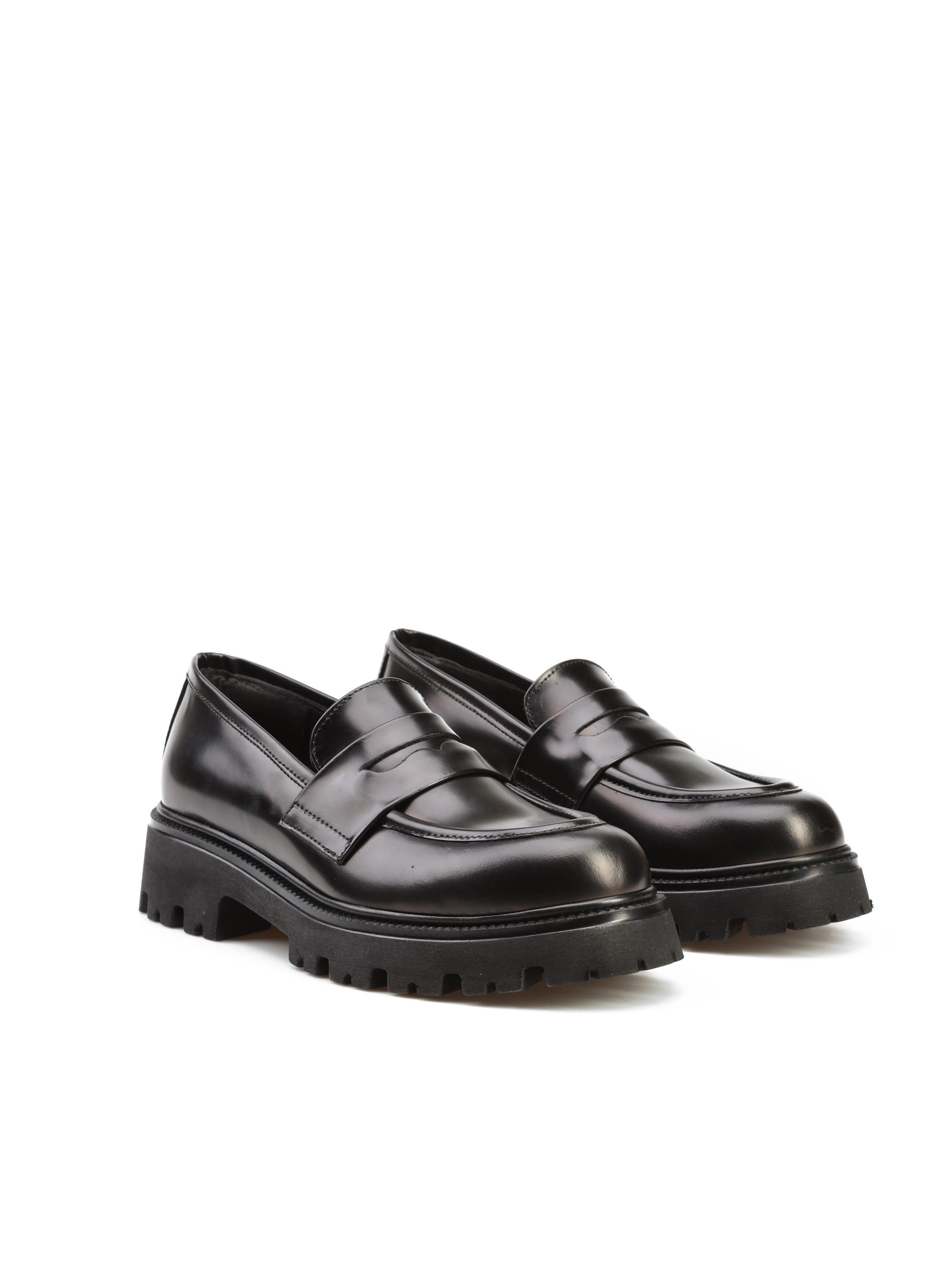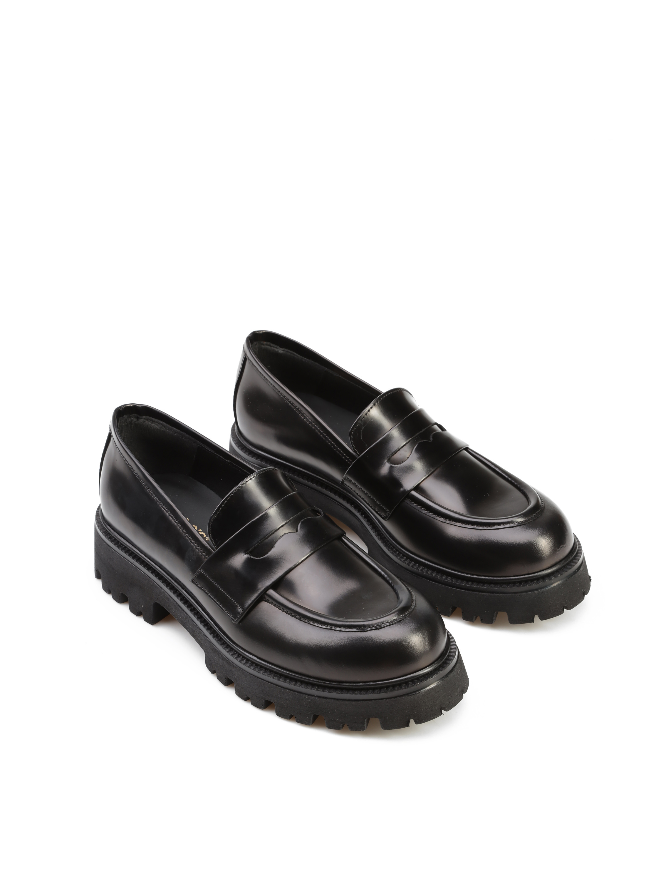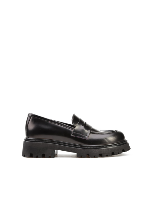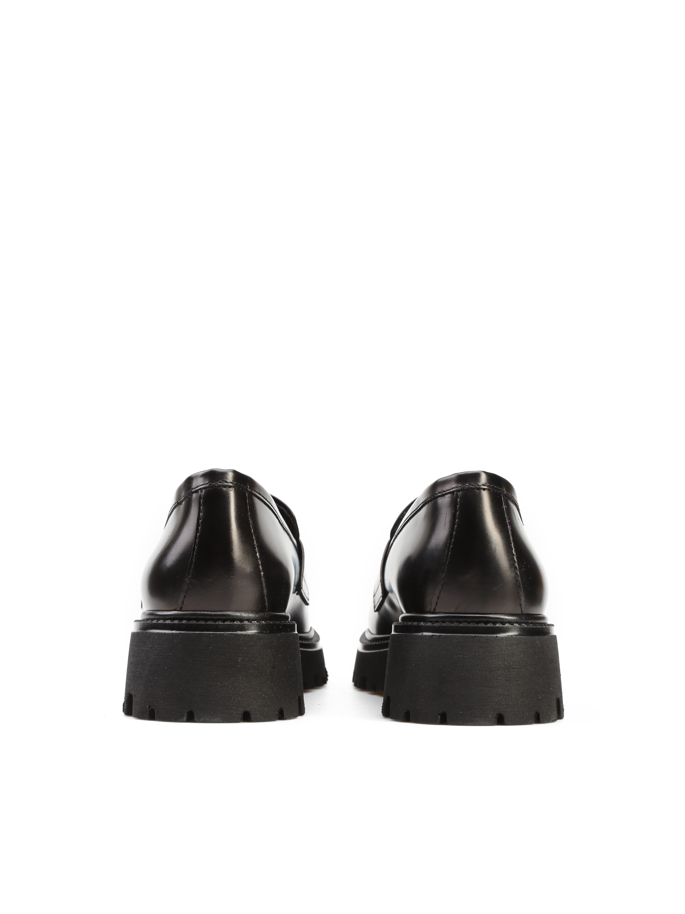 Mokasyny na grubej podeszwie to gorący Trend sezonu. Cholewka w czarnym kolorze wykonana jest z naturalnej, wysokopolerowanej skóry. Fason w stylu loafersy z charakterystycznym wysokim językiem.