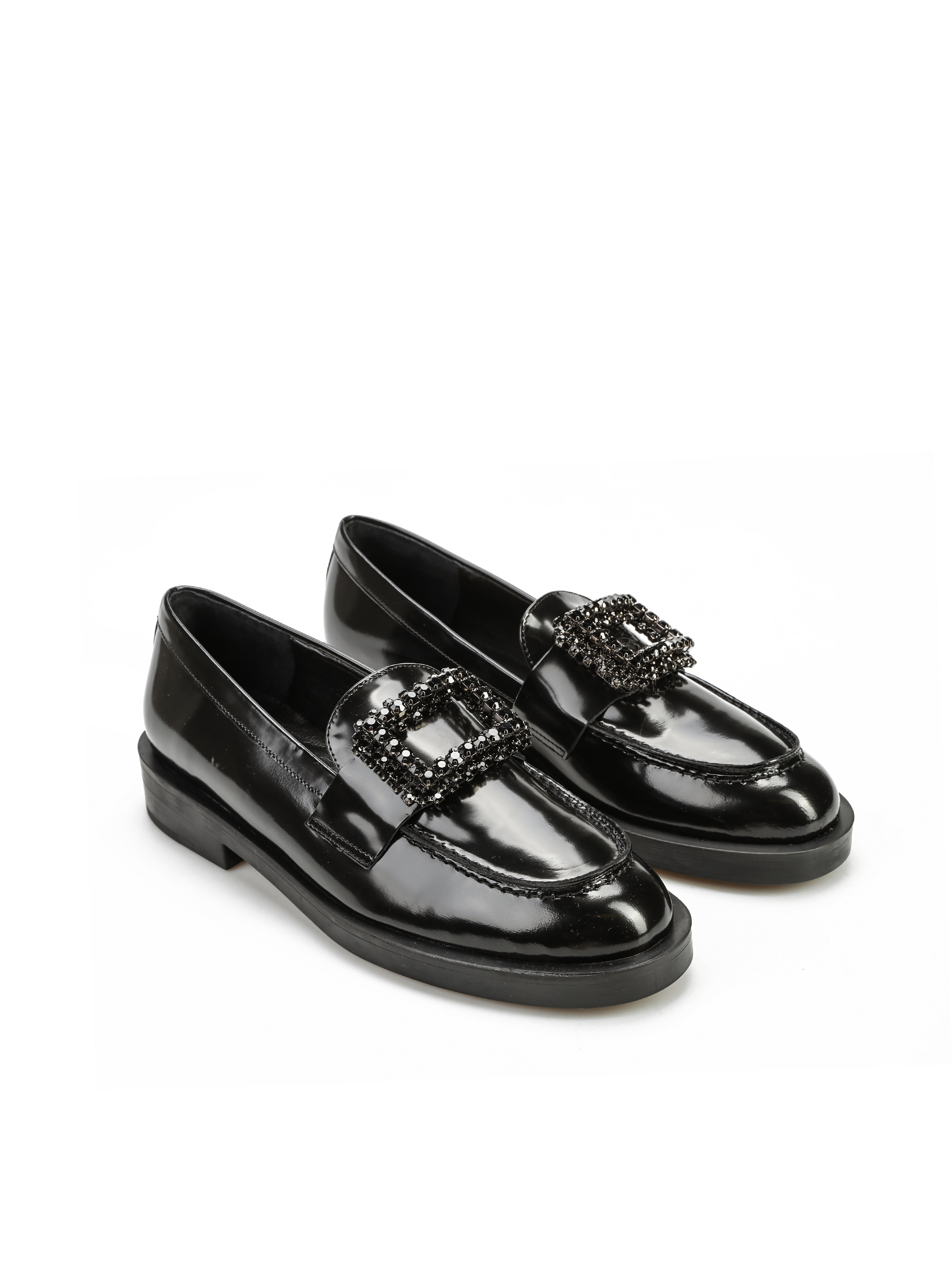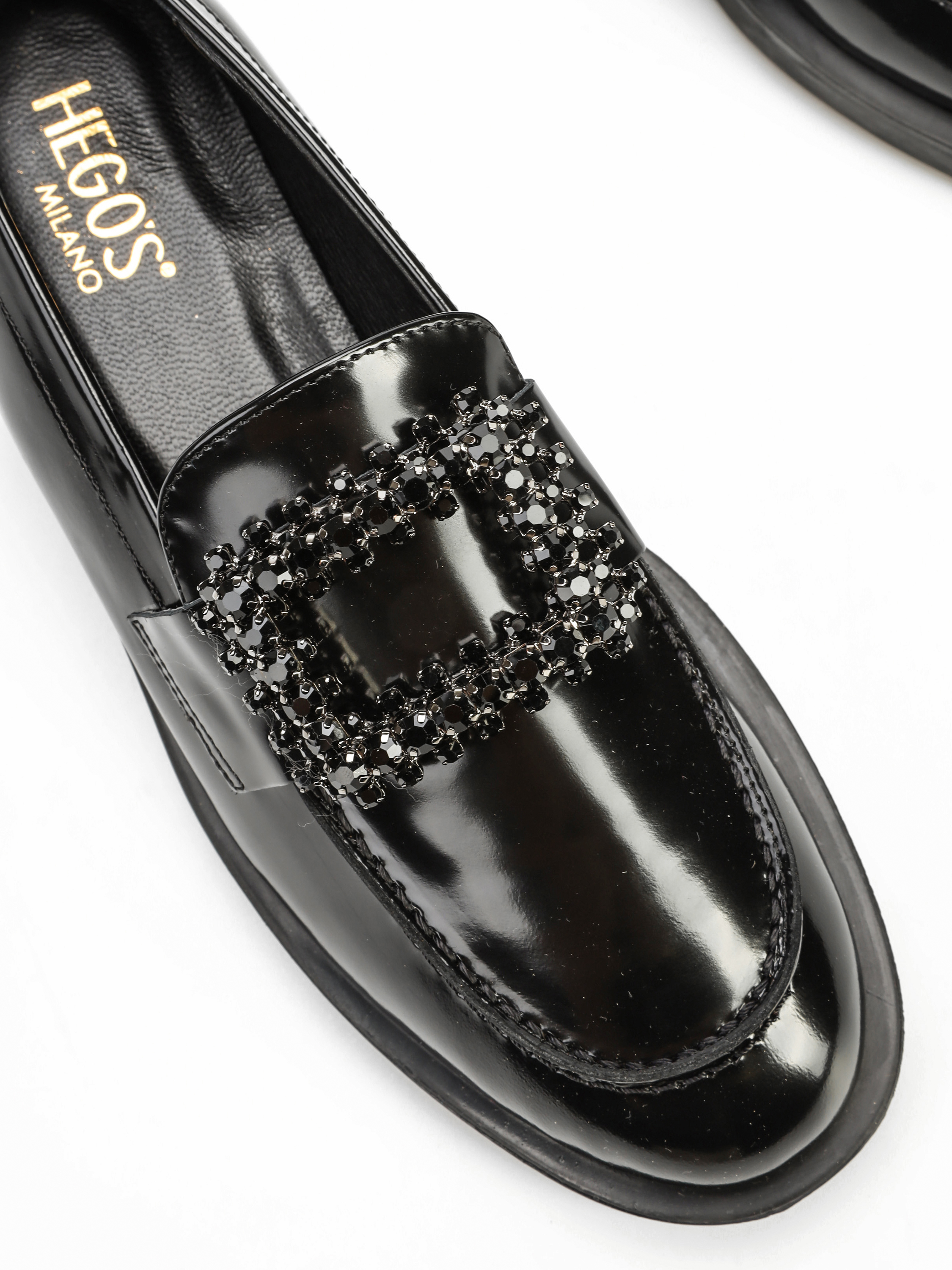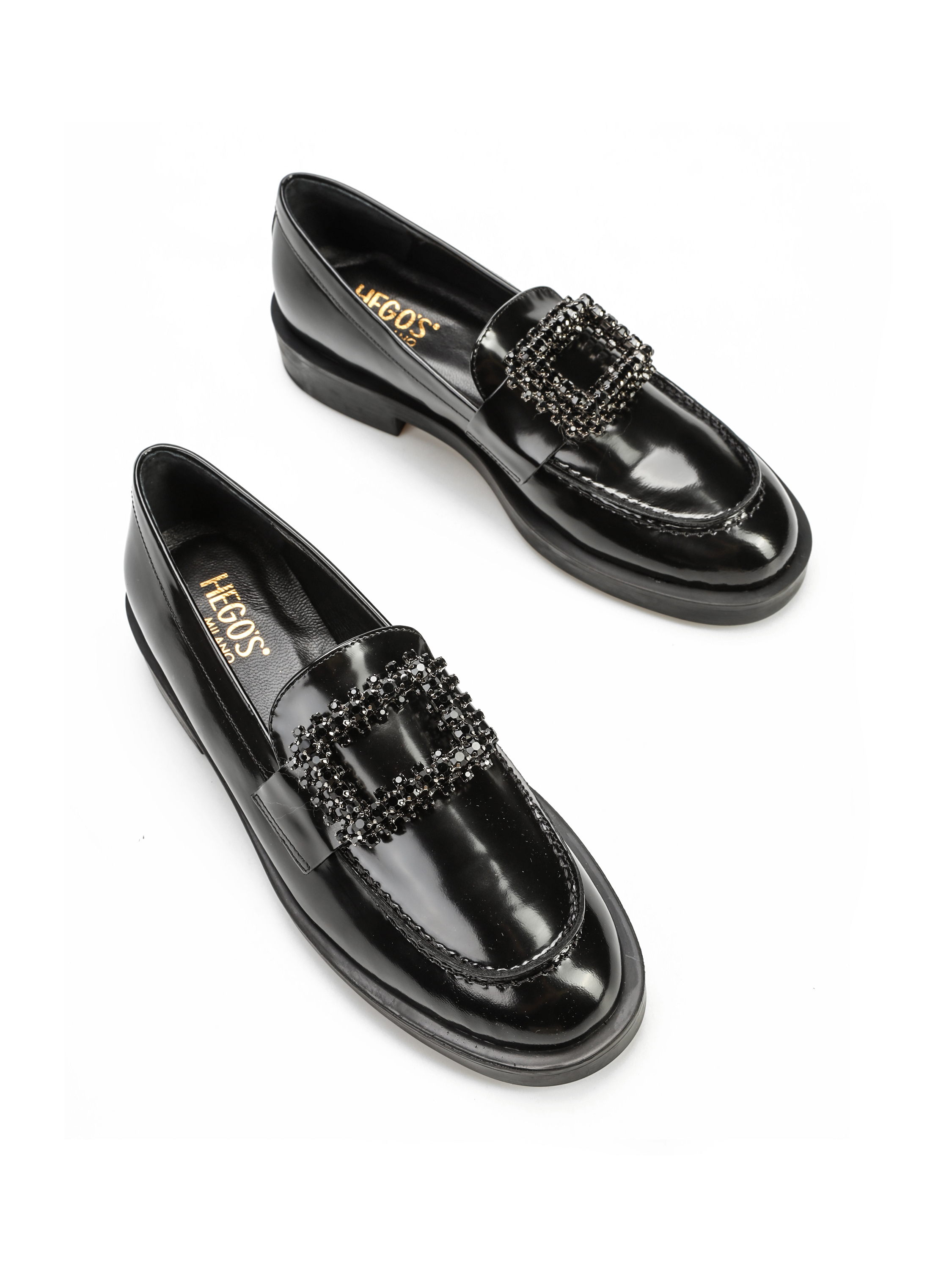 Mokasyny na płaskim obcasie to must have kobiecej garderoby. Wykonane są z włoskiej, lakierowanej skóry. Fason w stylu lordsy posiada wysoki język, charakterystyczny dla tego modelu. Czarna cholewka wzbogacona została o biżuteryjną broszkę z kamieni.
