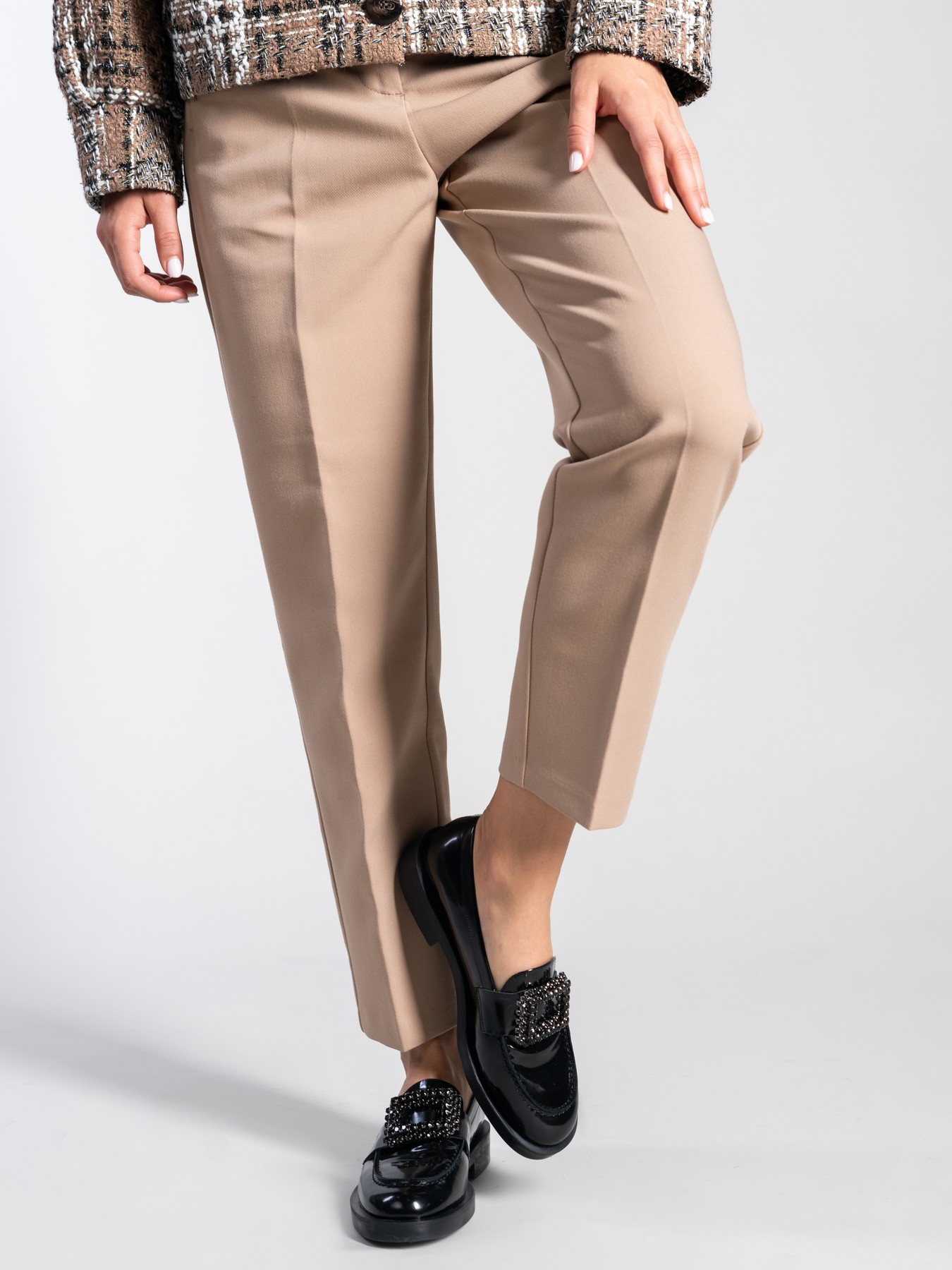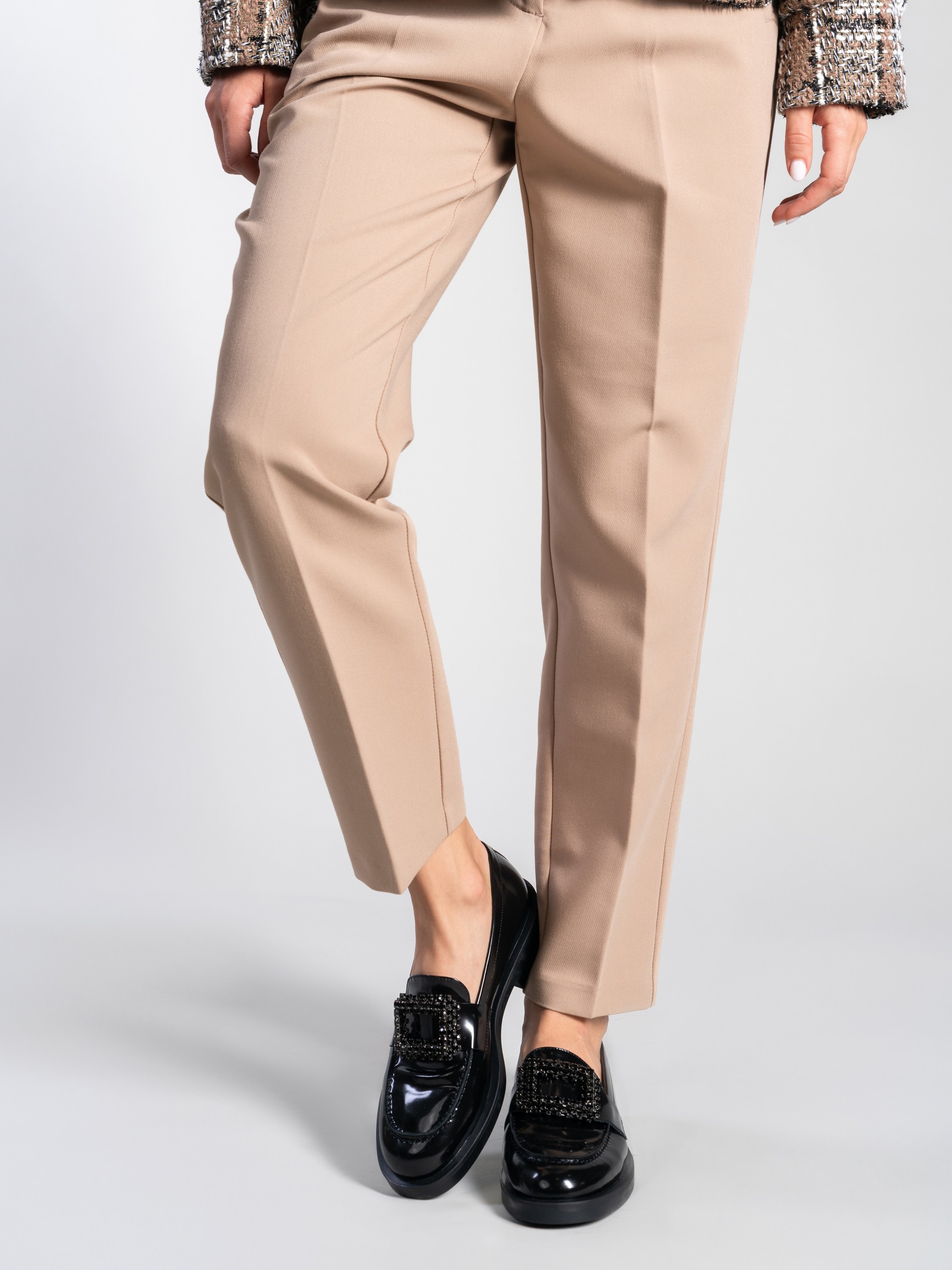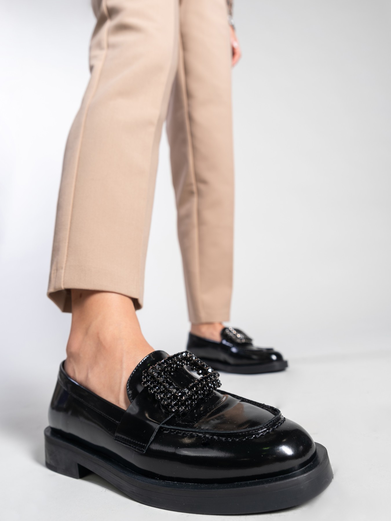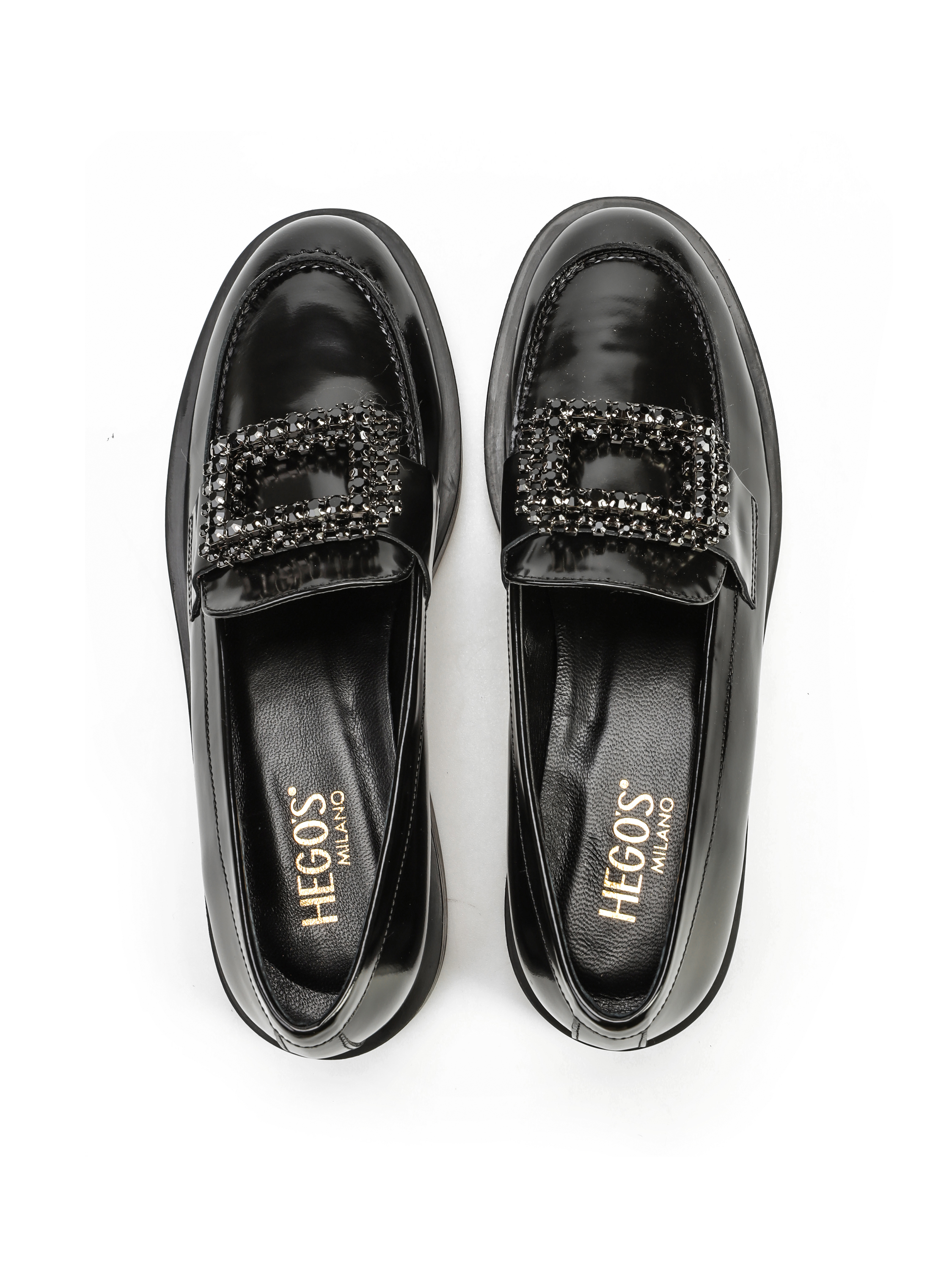 Mokasyny na płaskim obcasie to must have kobiecej garderoby. Wykonane są z włoskiej, lakierowanej skóry. Fason w stylu lordsy posiada wysoki język, charakterystyczny dla tego modelu. Czarna cholewka wzbogacona została o biżuteryjną broszkę z kamieni.