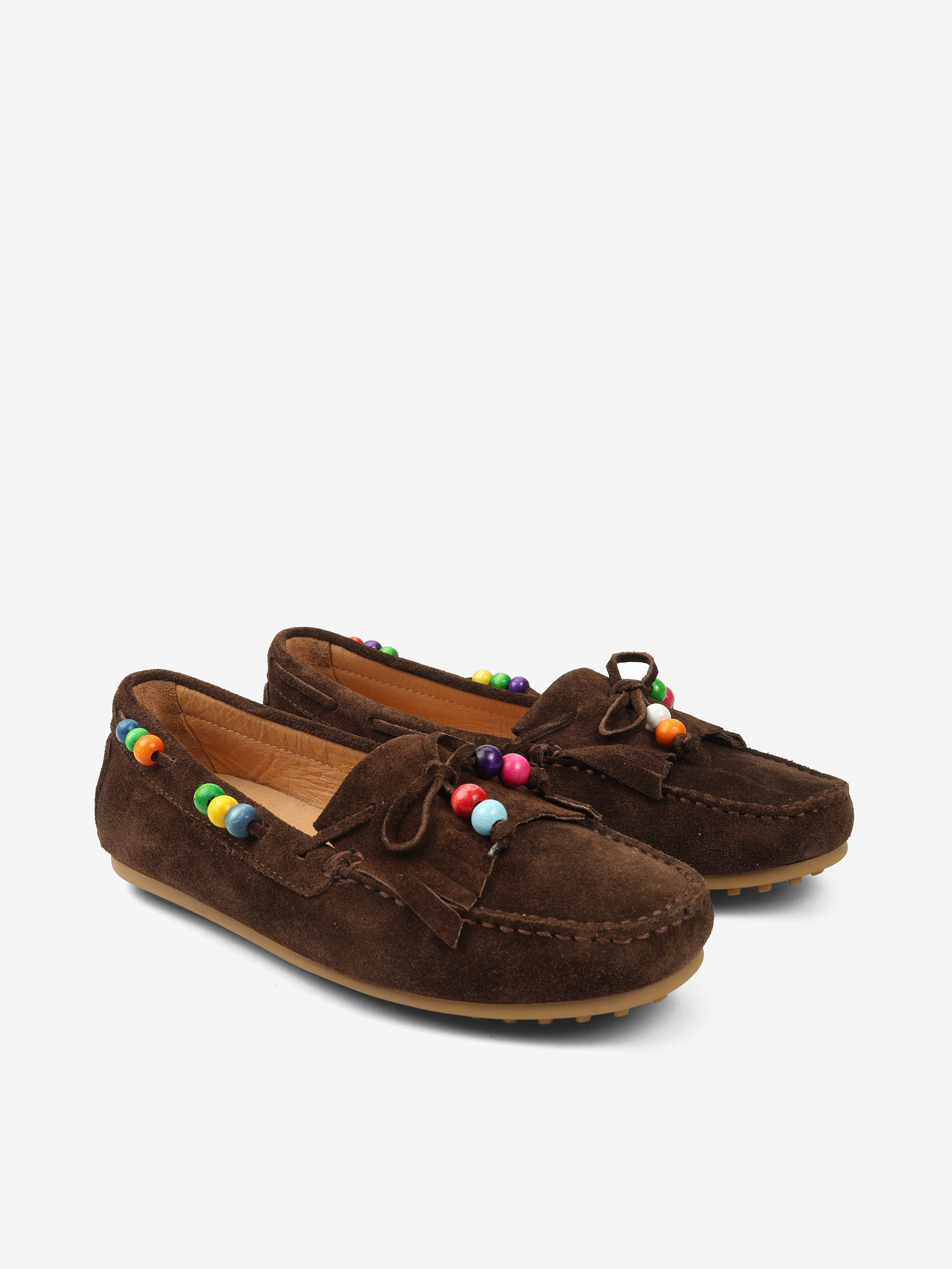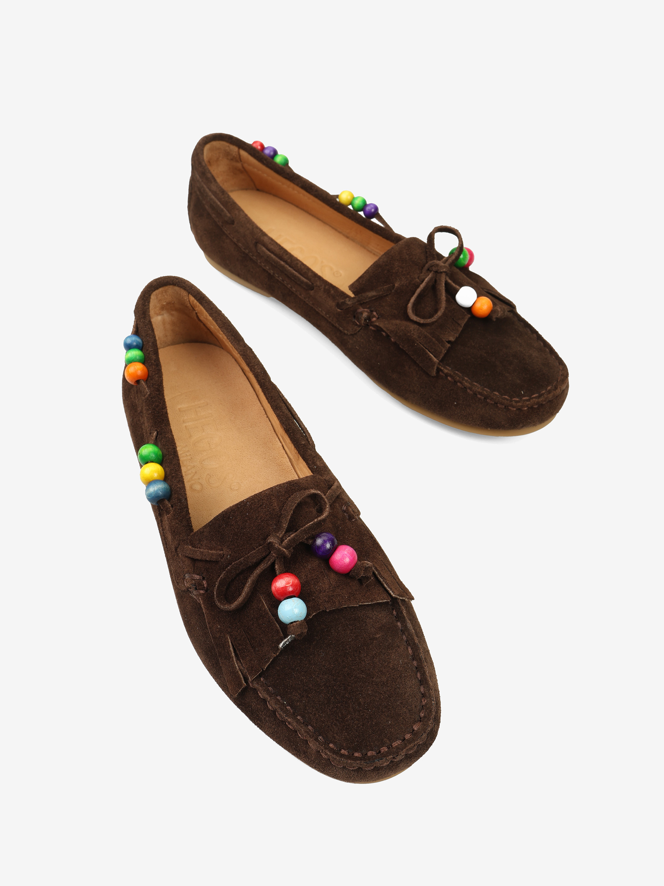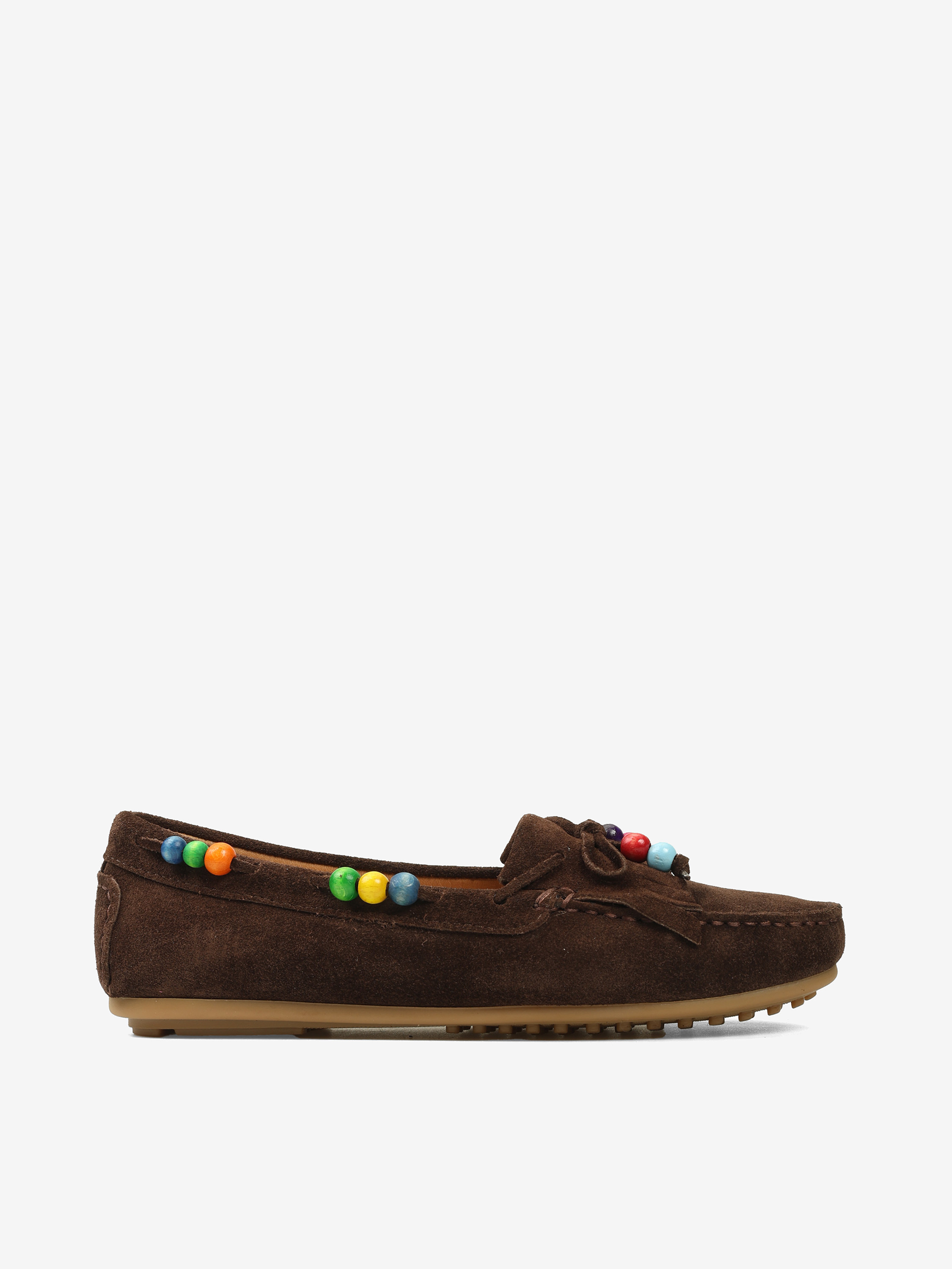 Zamszowe mokasyny z wiązaną kokardką, pozwalającą na idealne dopasowanie. Ozdobne, kolorowe koraliki.