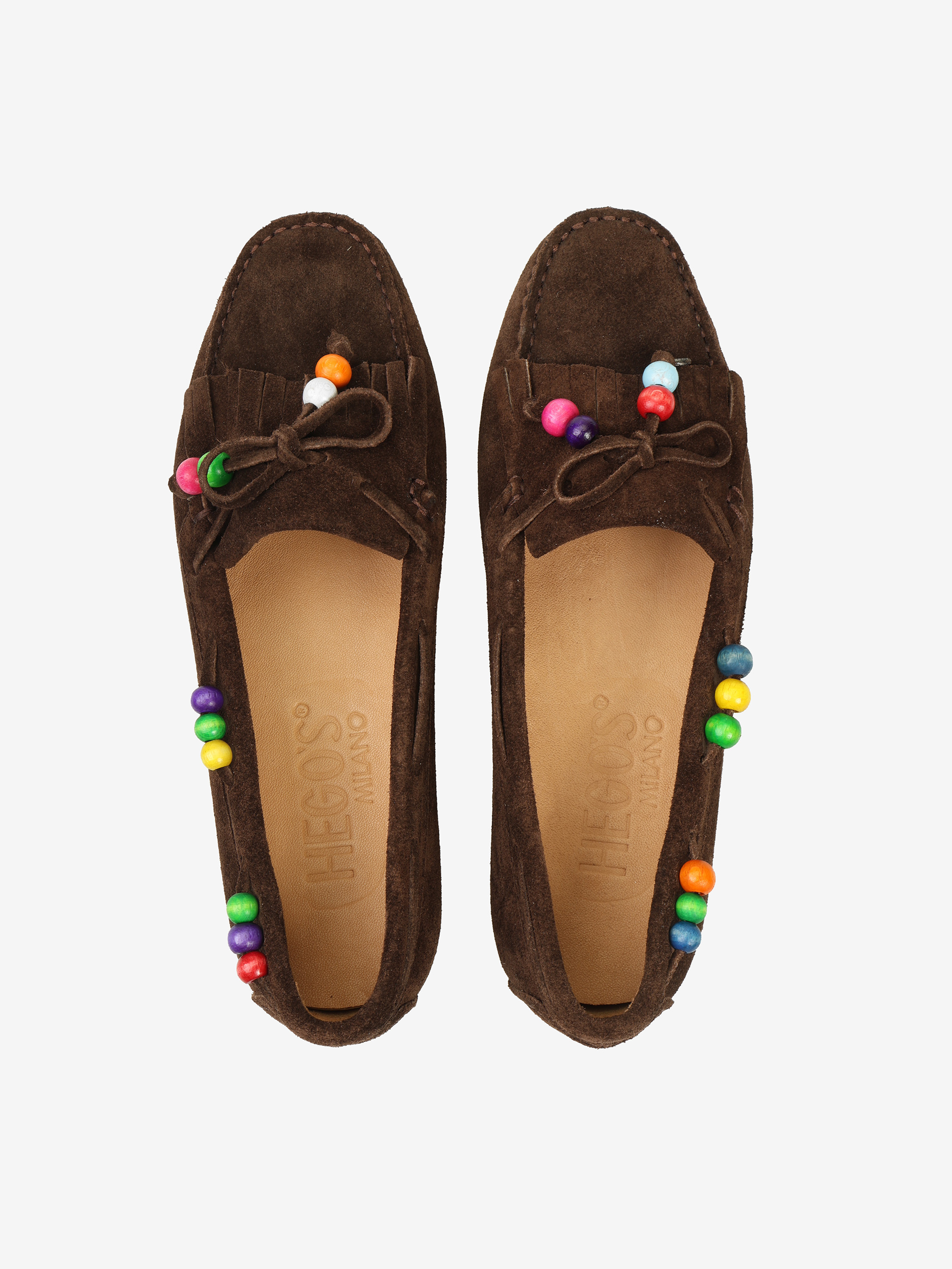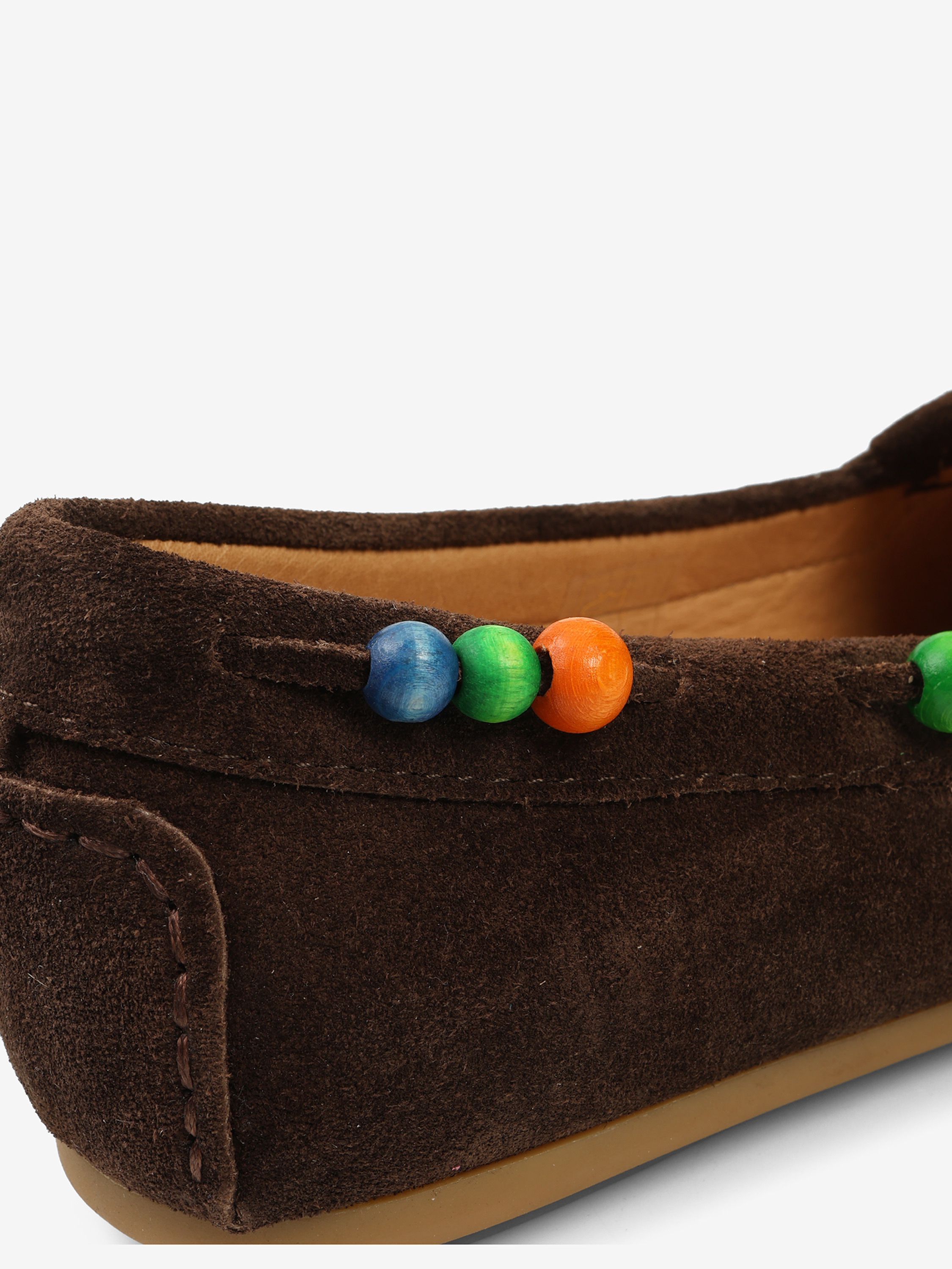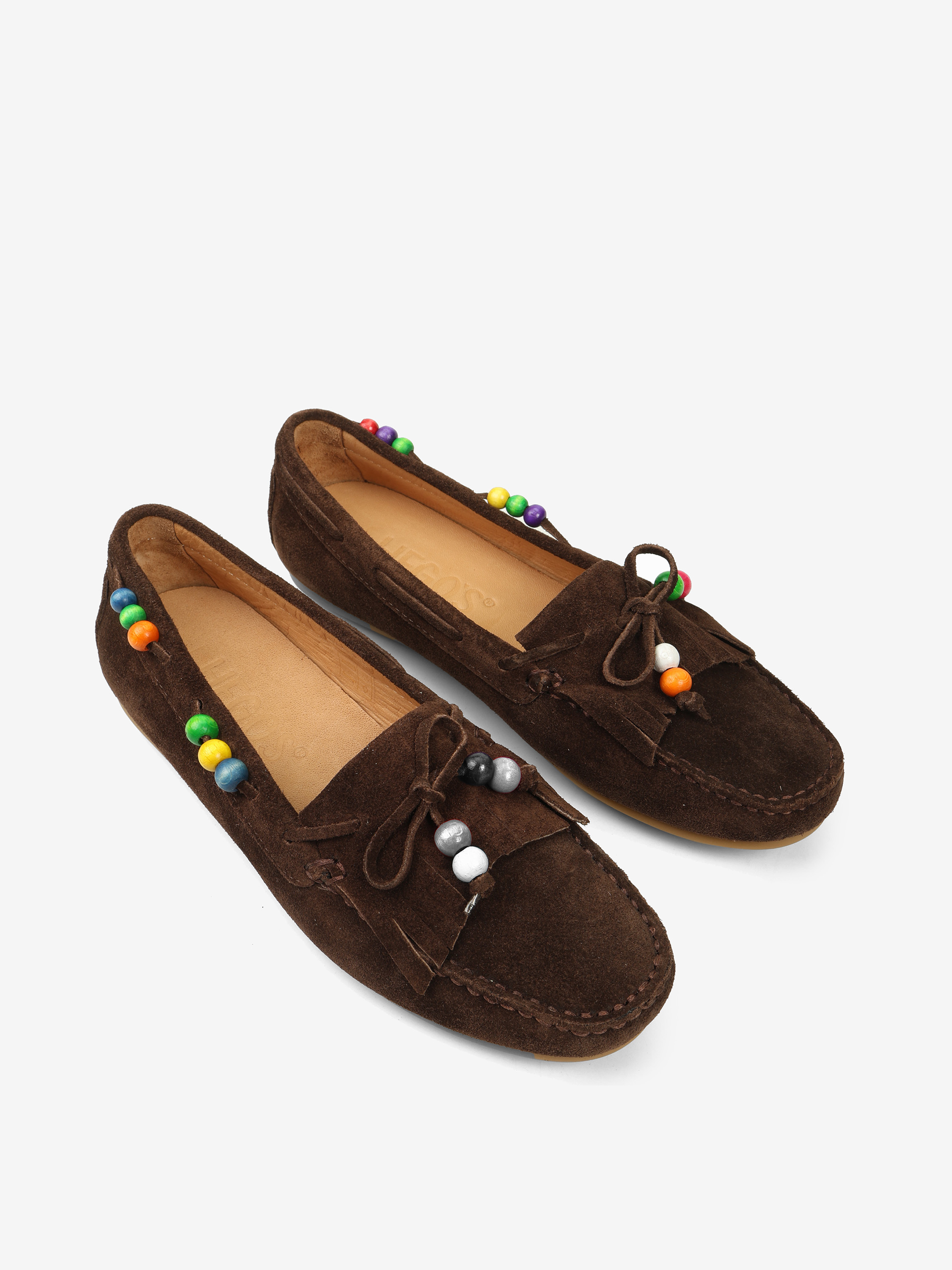 Zamszowe mokasyny z wiązaną kokardką, pozwalającą na idealne dopasowanie. Ozdobne, kolorowe koraliki.