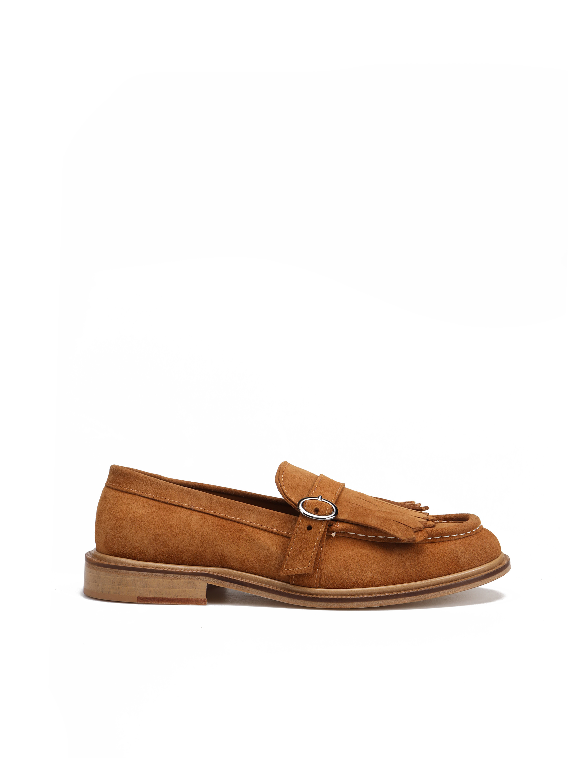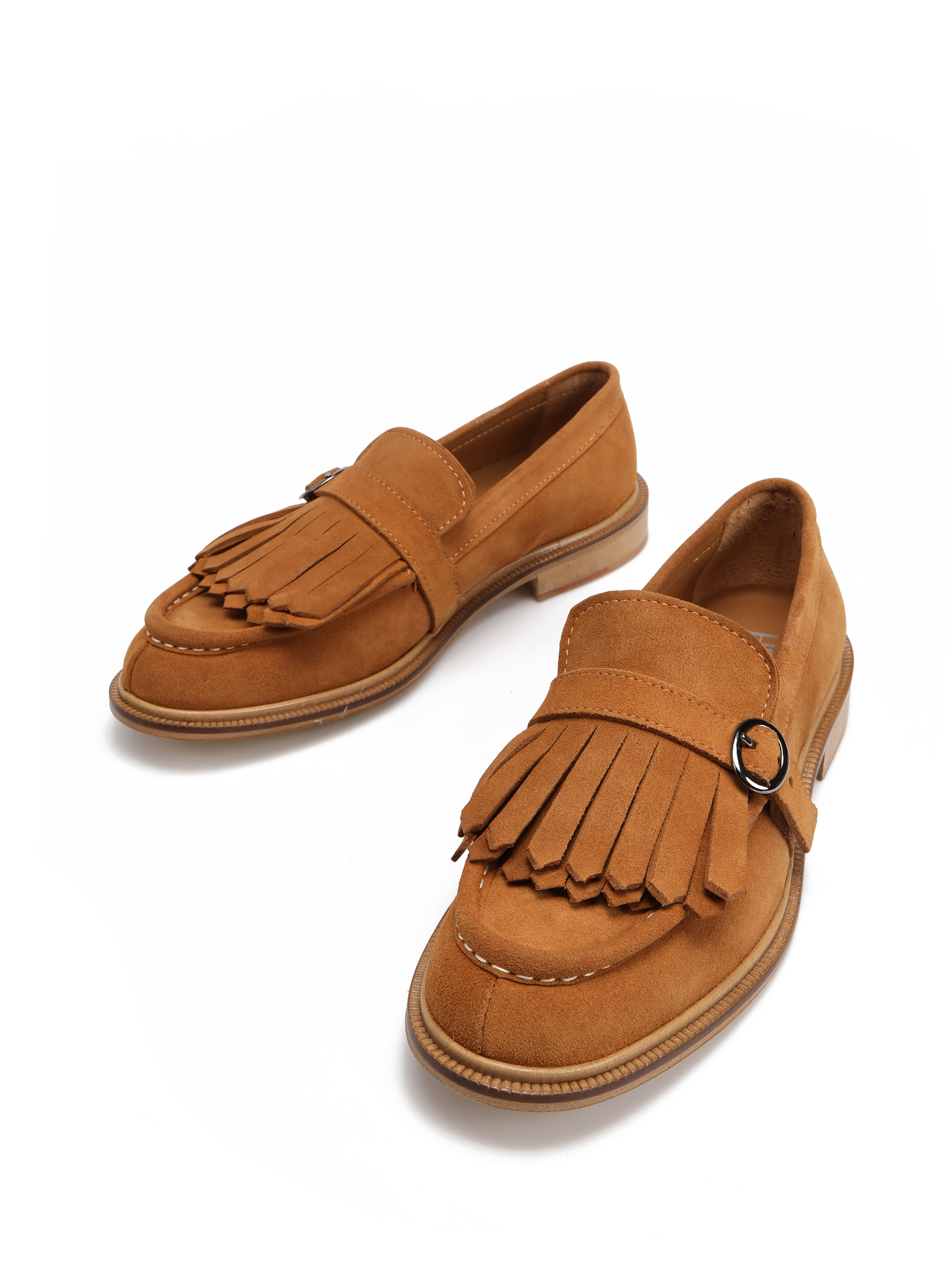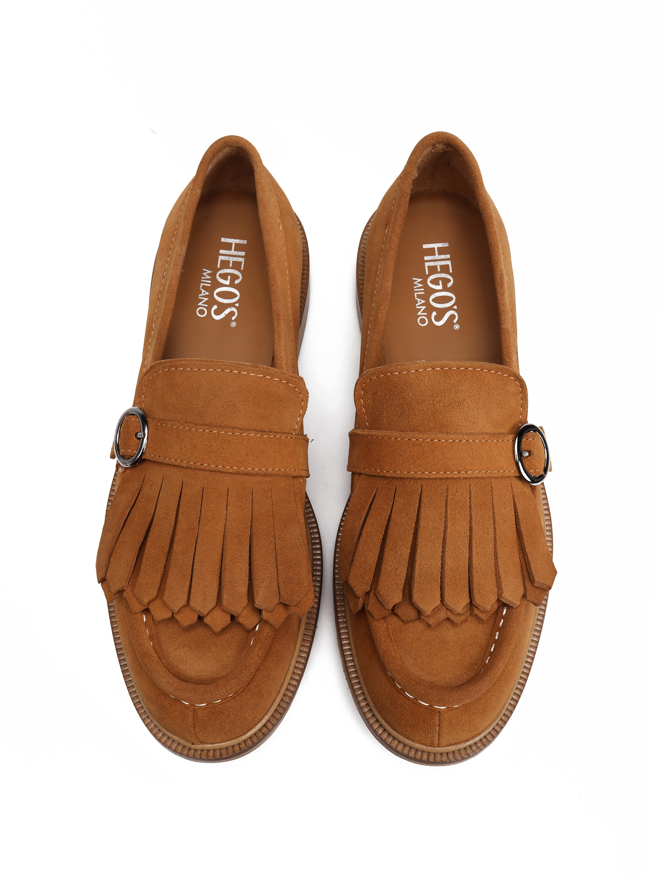Mokasyny na płaskim obcasie HEGO'S Milano wykonane są z zamszowej skóry. Posiadają wysoki język w stylu lordsy. Cholewka ozdobiona została frędzlami oraz regulowanym paskiem zapinanym na sprzączkę.