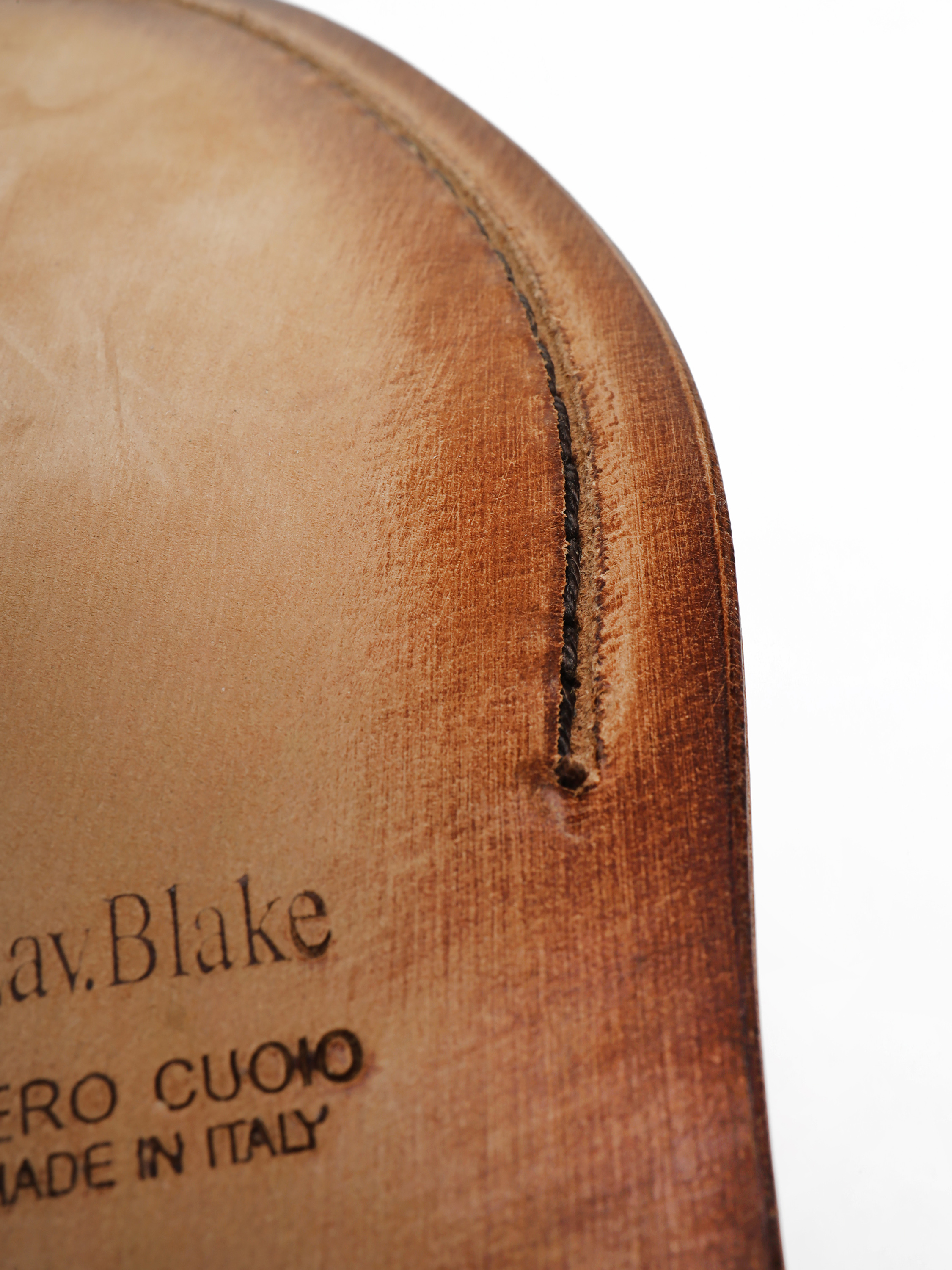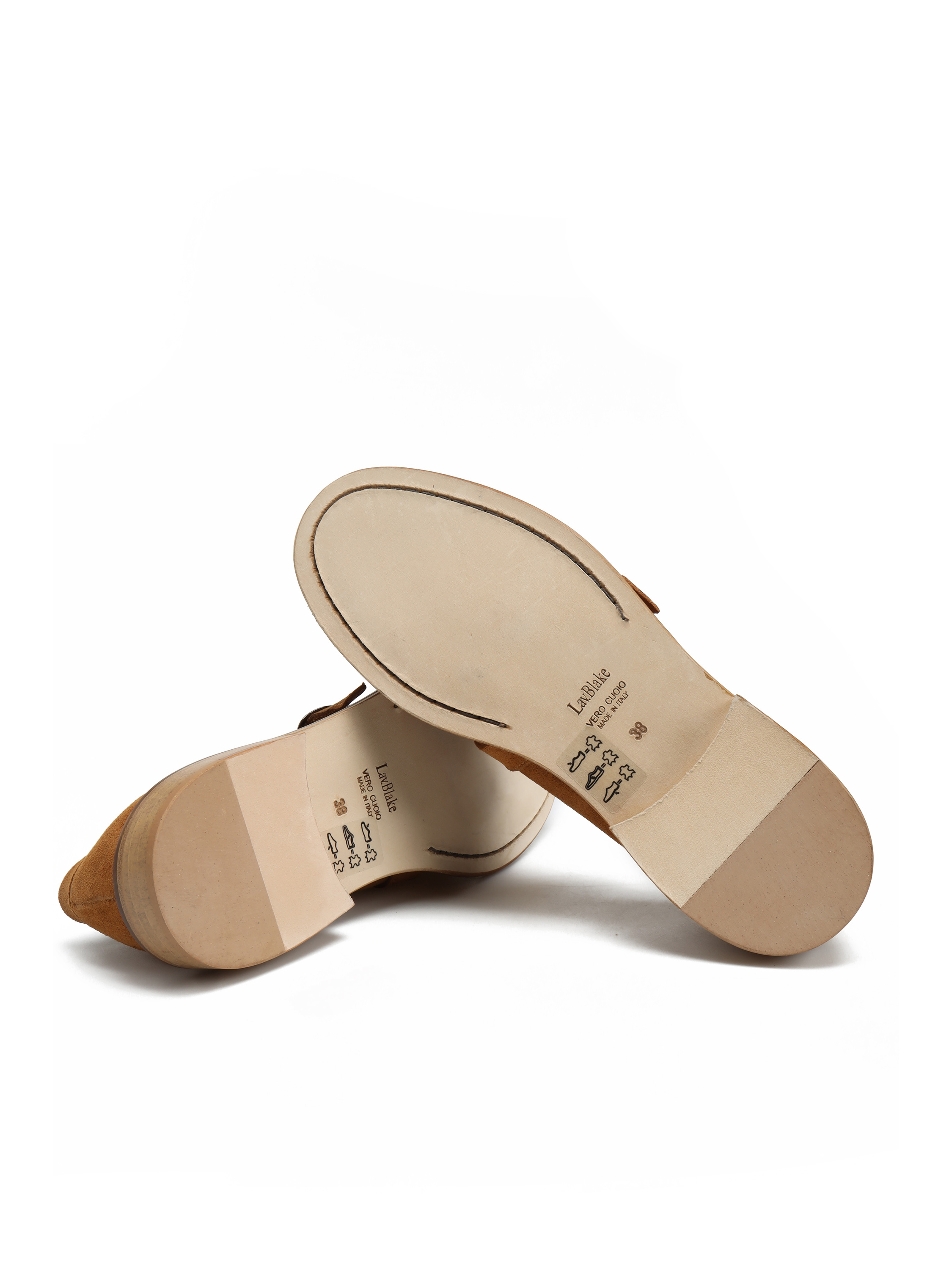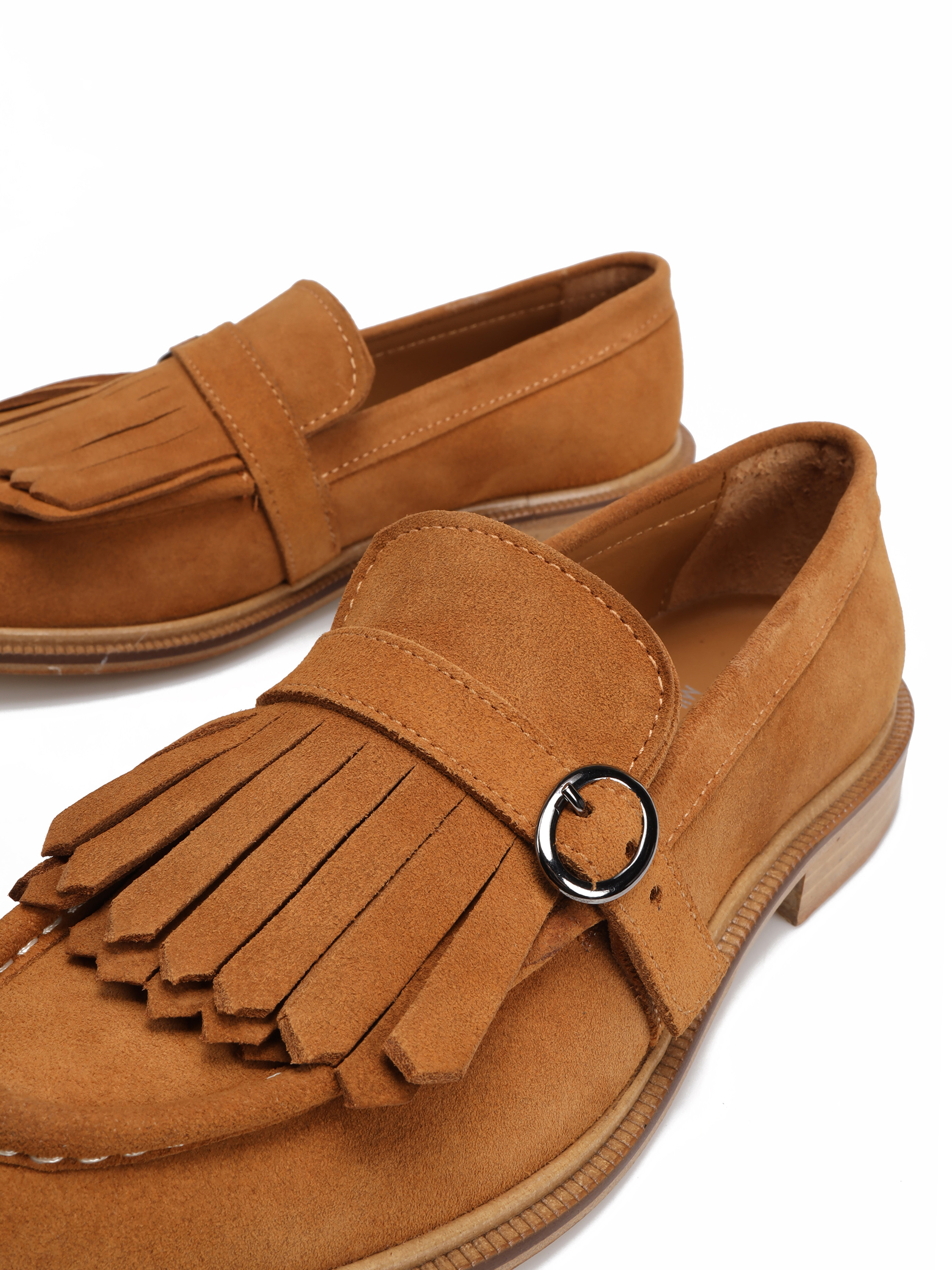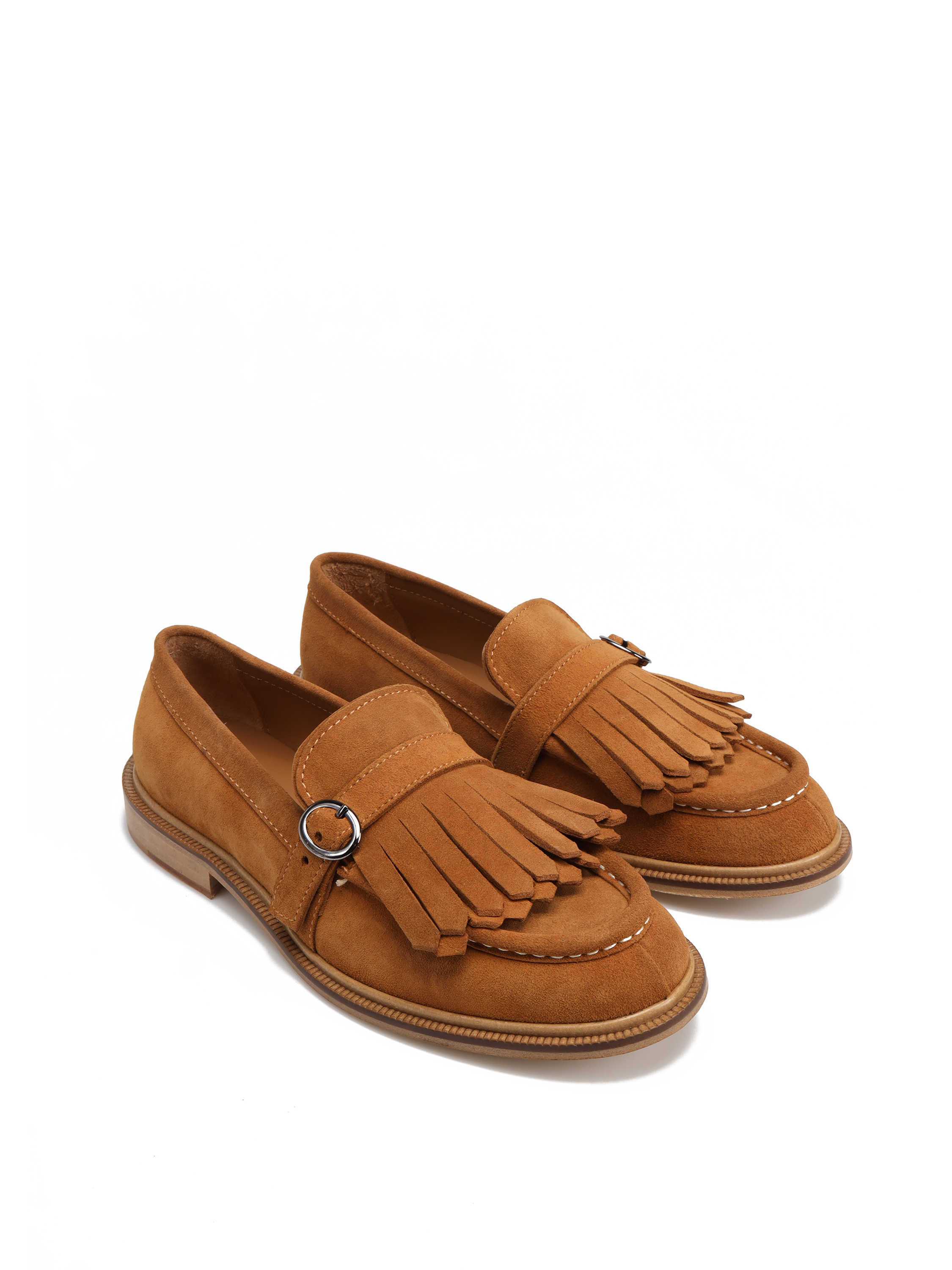Mokasyny na płaskim obcasie HEGO'S Milano wykonane są z zamszowej skóry. Posiadają wysoki język w stylu lordsy. Cholewka ozdobiona została frędzlami oraz regulowanym paskiem zapinanym na sprzączkę.